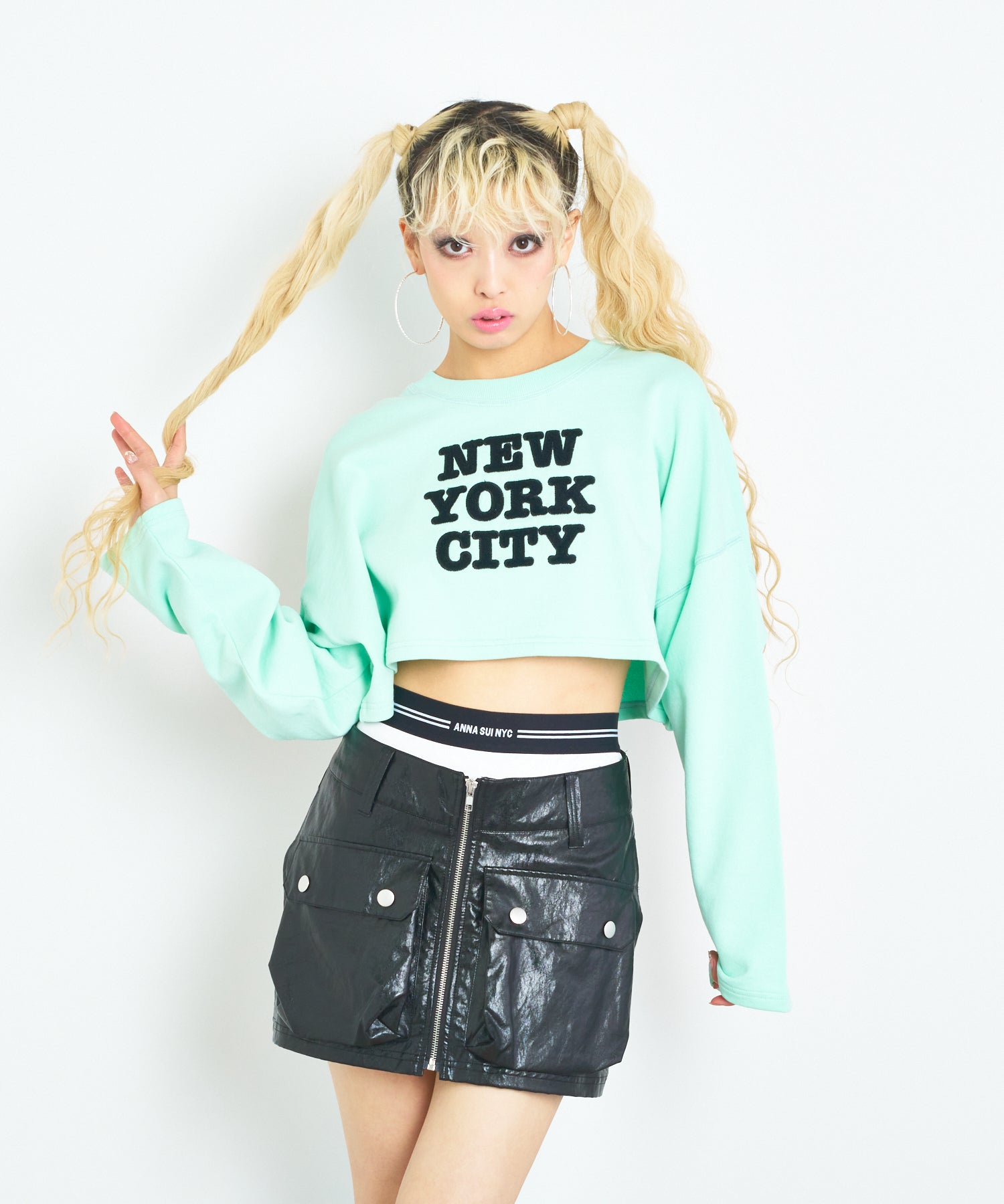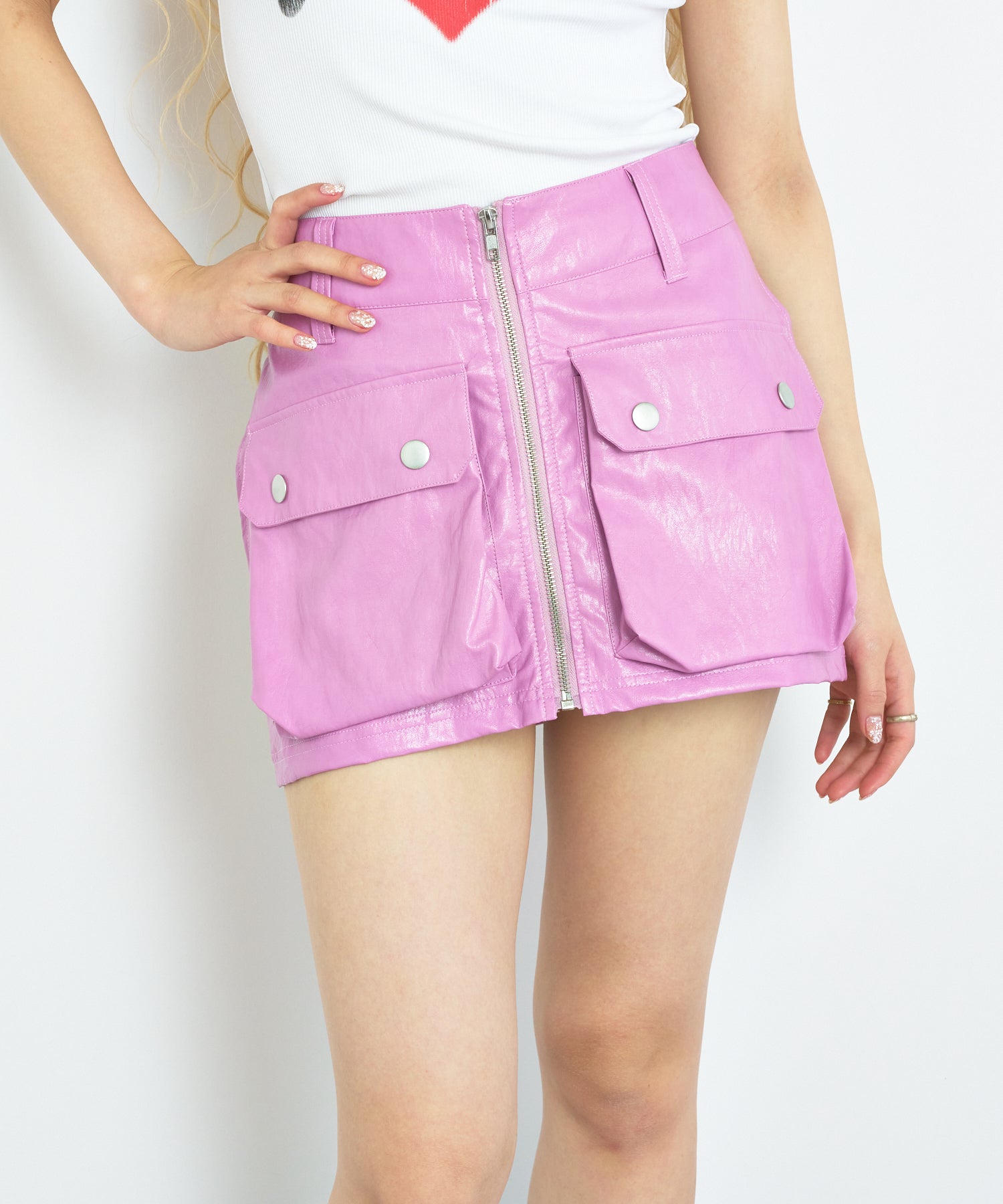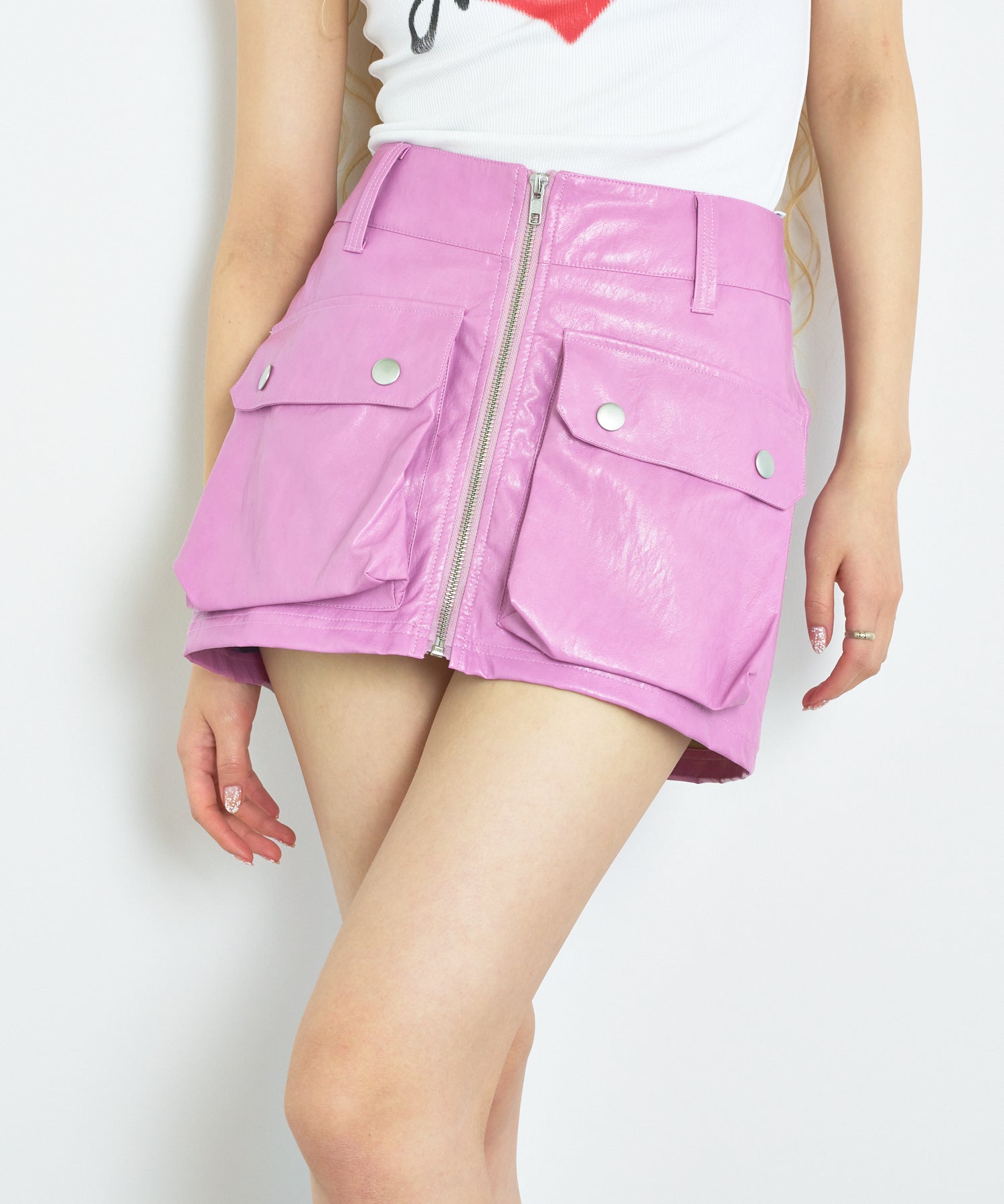 ハードなイメージのフェイクレザーのショートスカートをANNA SUI NYCらしい今っぽいPOPな印象に!こなれた雰囲気を出してくれる生地のシワ感や他にないカラーバリエーションでコーデの主役に◎