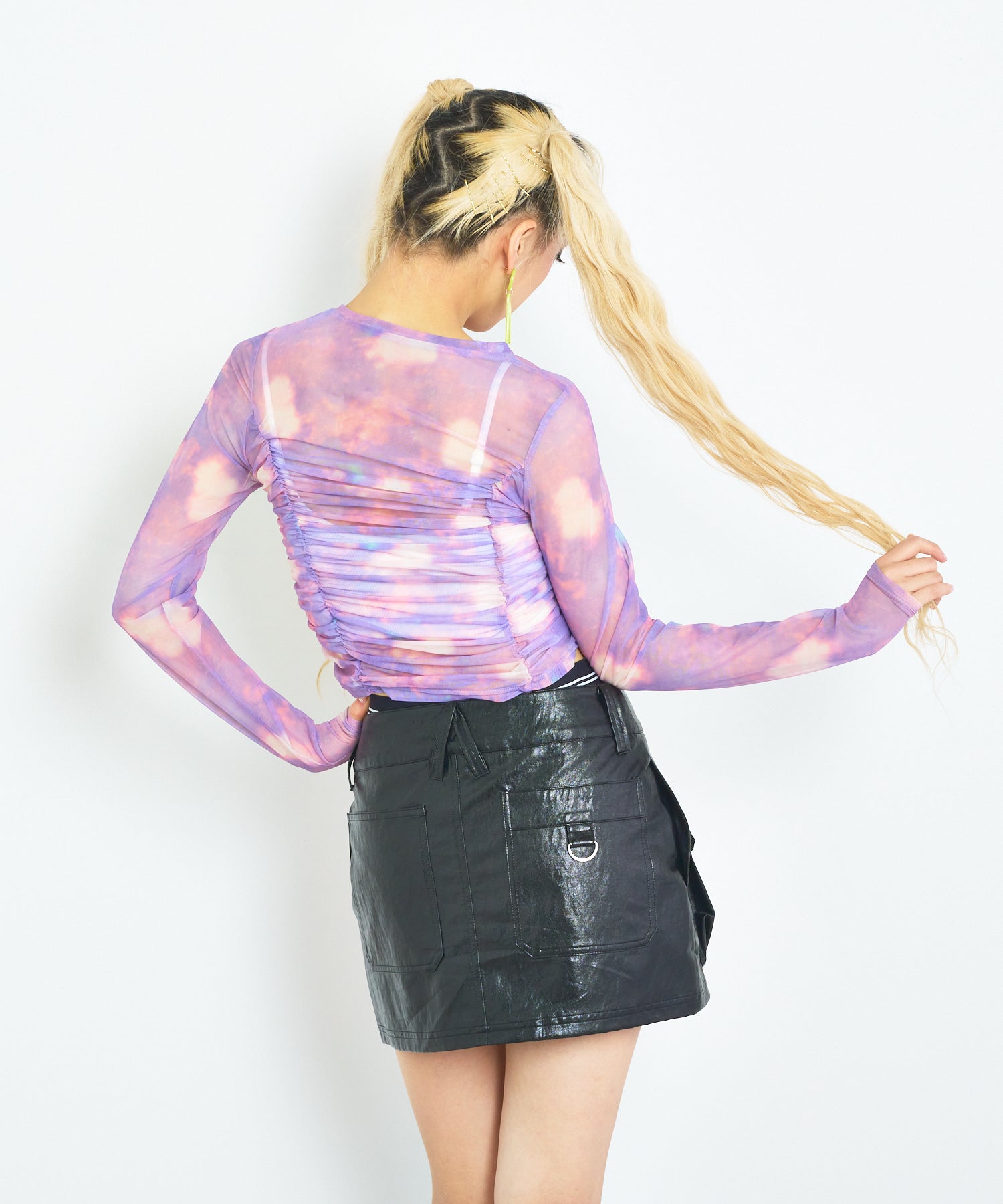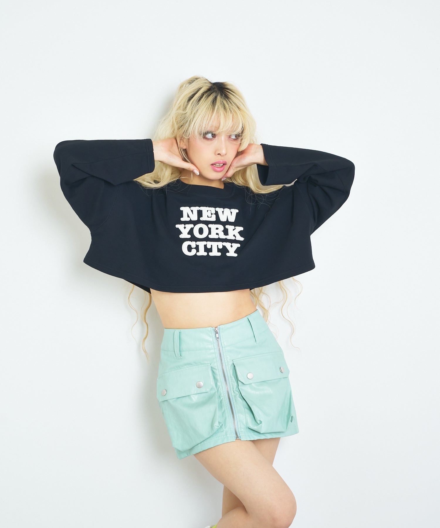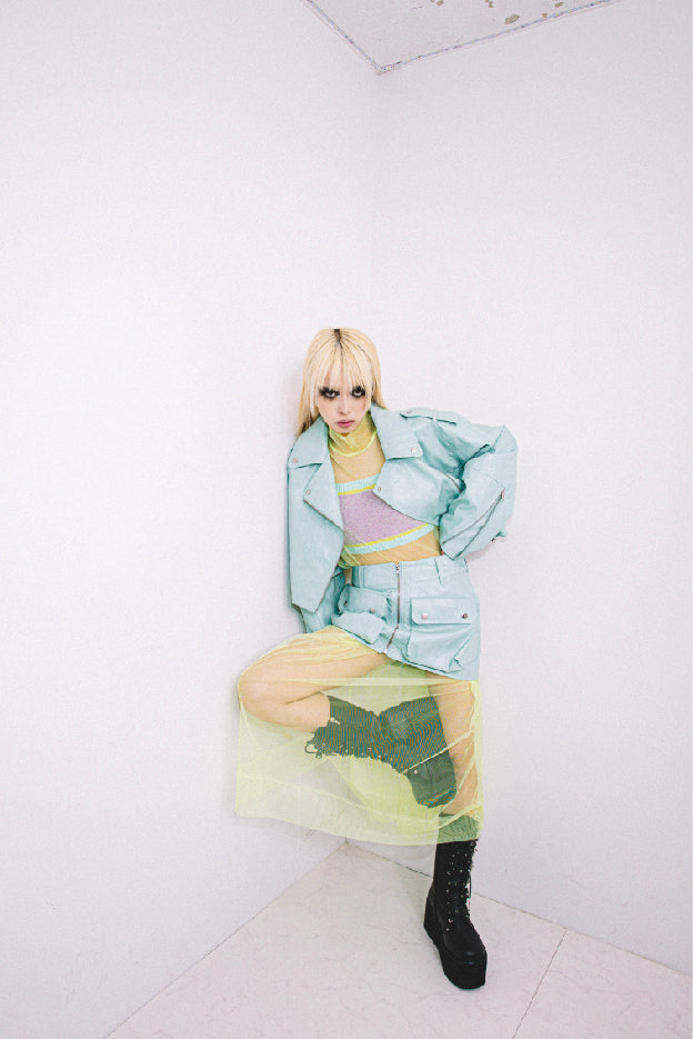 ハードなイメージのフェイクレザーのショートスカートをANNA SUI NYCらしい今っぽいPOPな印象に!こなれた雰囲気を出してくれる生地のシワ感や他にないカラーバリエーションでコーデの主役に◎