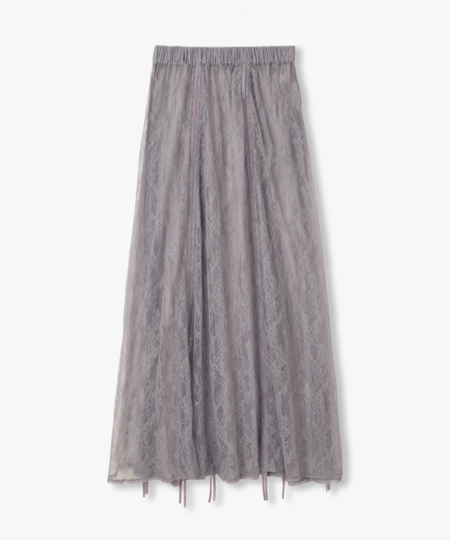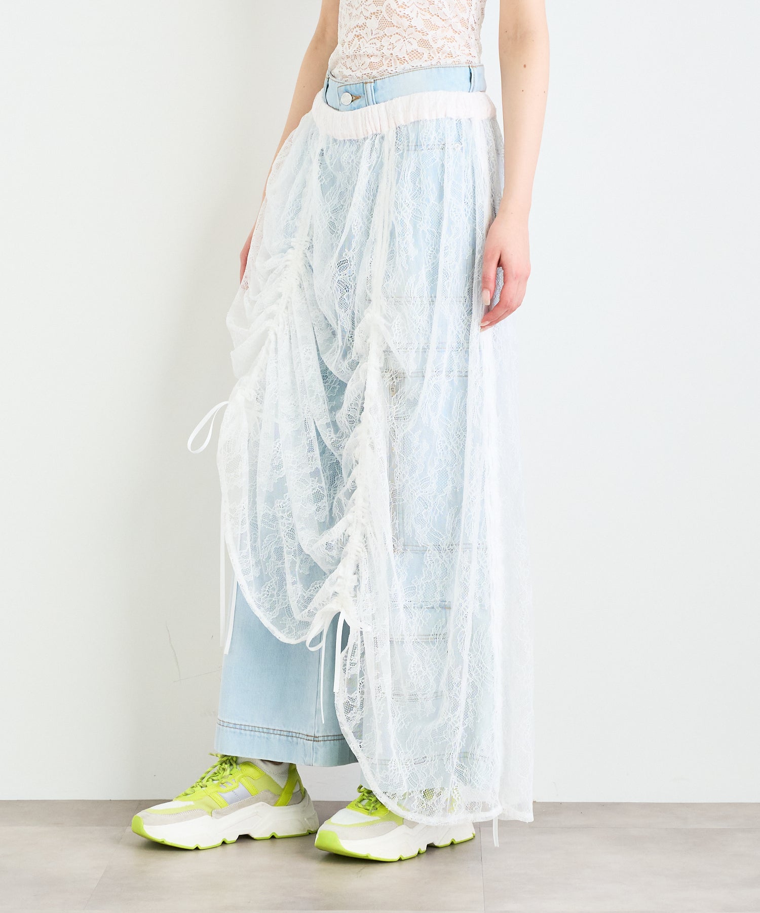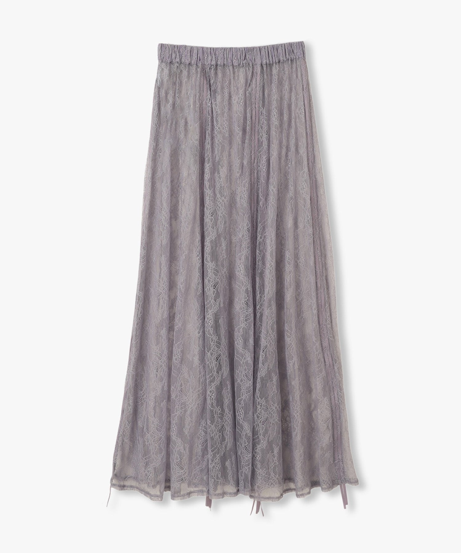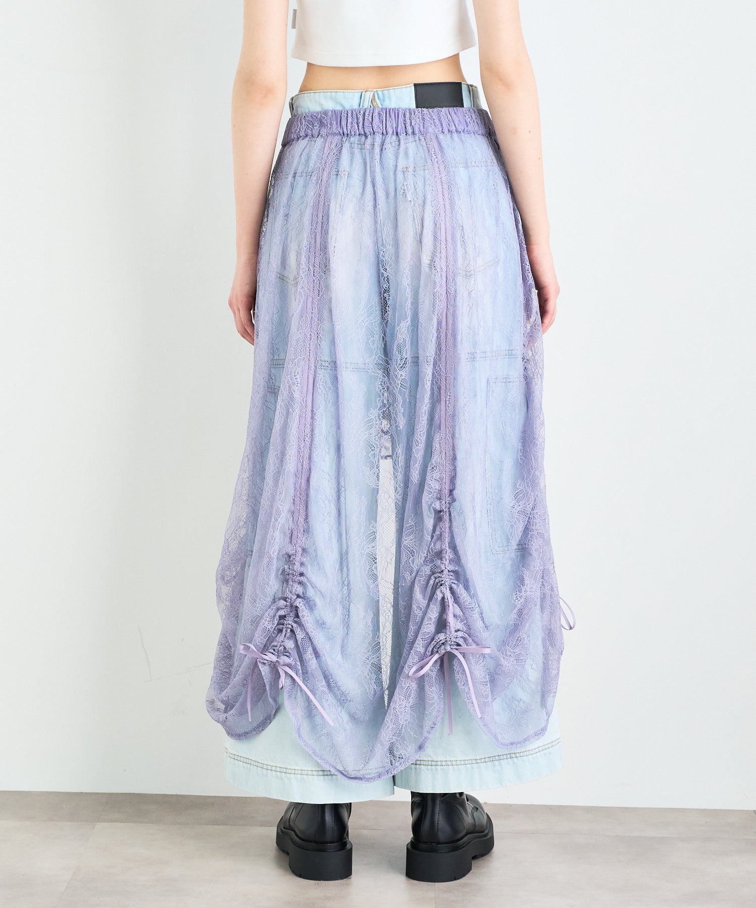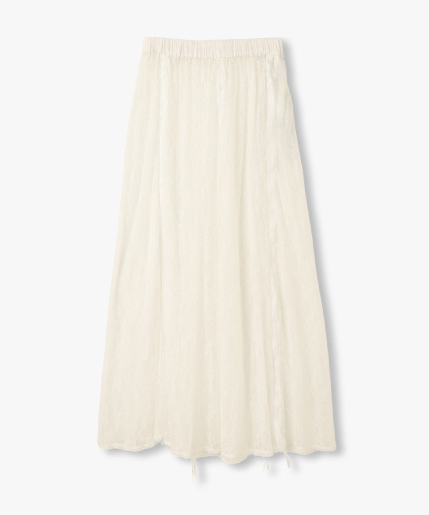 ボタニカル柄の繊細なレースを使用したロングスカート。前後左右6箇所にあしらわれたリボンを絞ることで、シルエットを自分好みにクリエイトすることができる360度どこから見ても可愛い1着です◎デニムやレギンスの上にレイヤードしたり、様々なスタイリングが楽しめるANNA SUI NYC一押しのアイテムです。