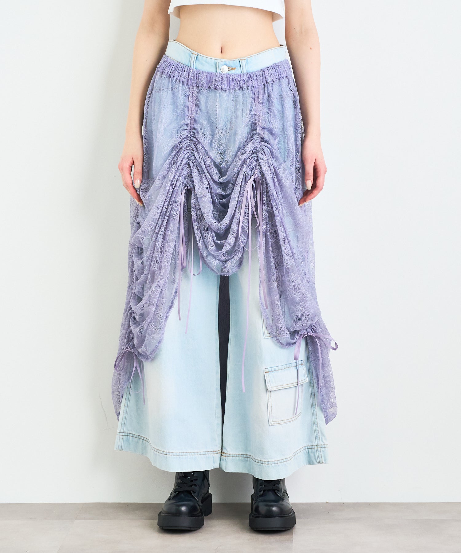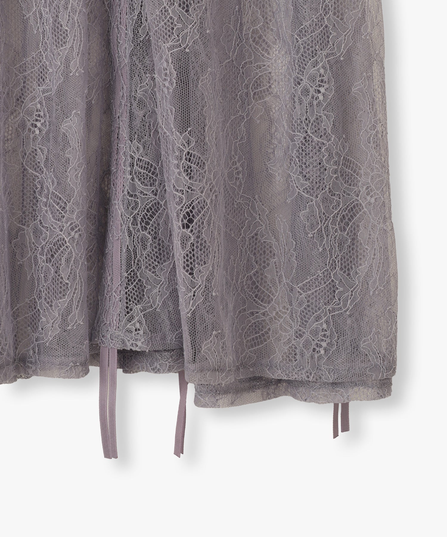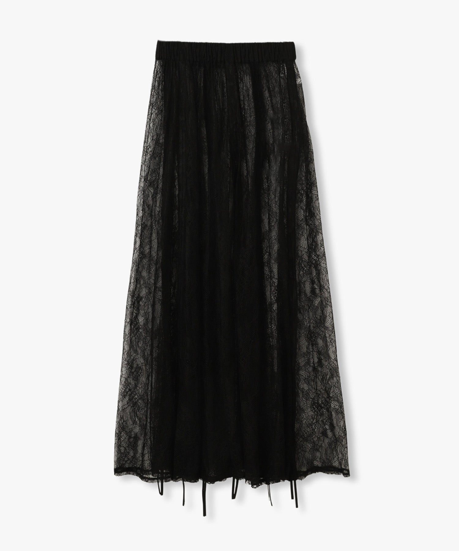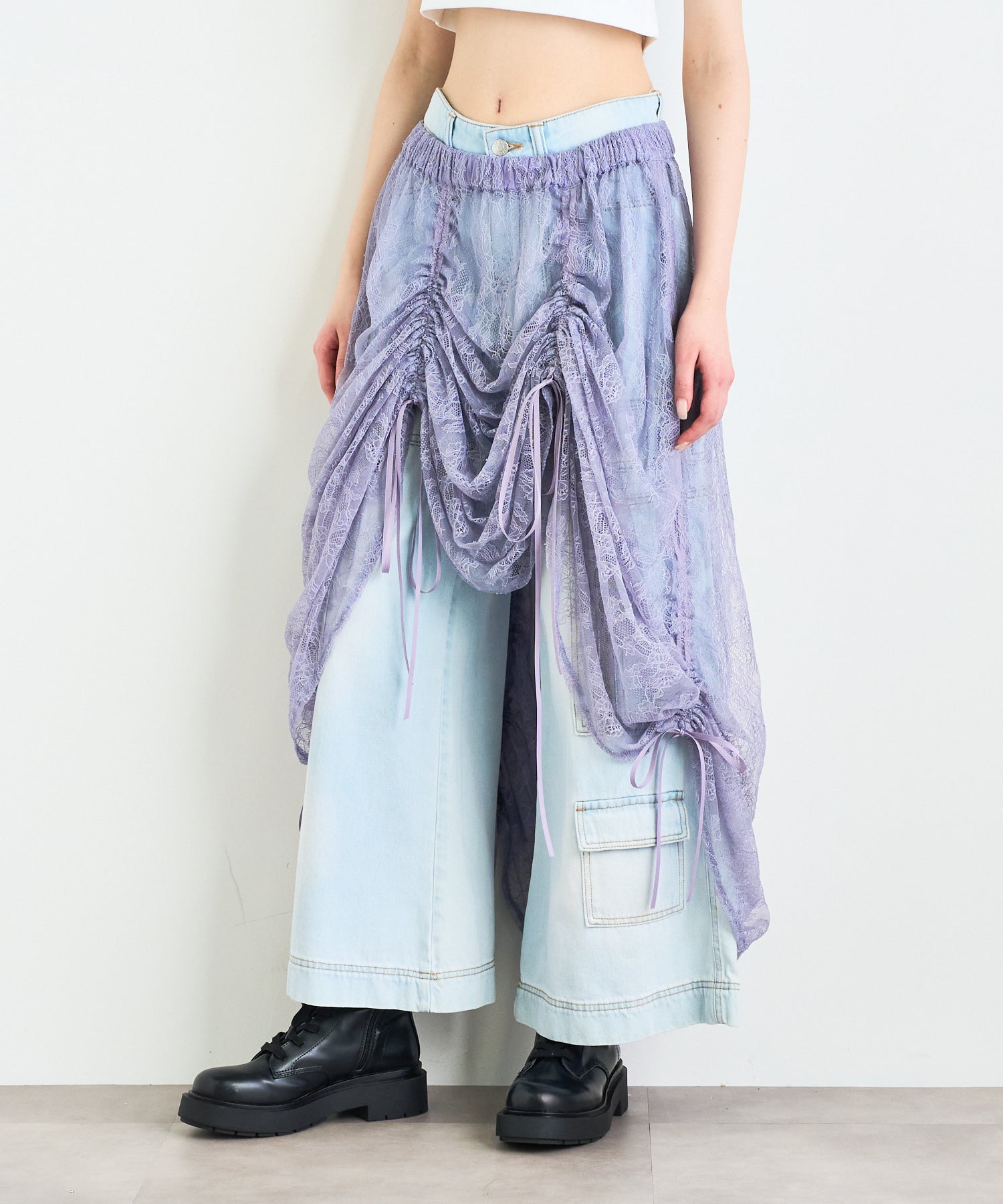 ボタニカル柄の繊細なレースを使用したロングスカート。前後左右6箇所にあしらわれたリボンを絞ることで、シルエットを自分好みにクリエイトすることができる360度どこから見ても可愛い1着です◎デニムやレギンスの上にレイヤードしたり、様々なスタイリングが楽しめるANNA SUI NYC一押しのアイテムです。