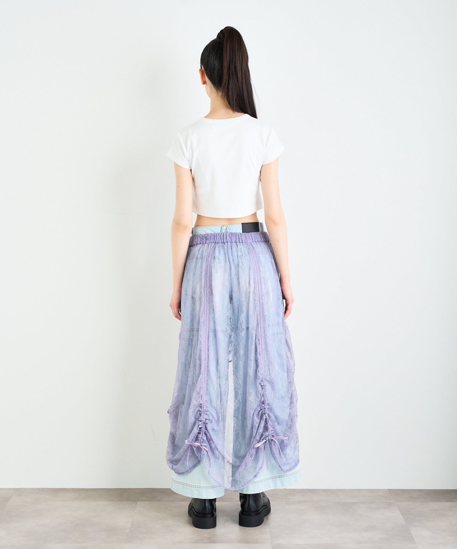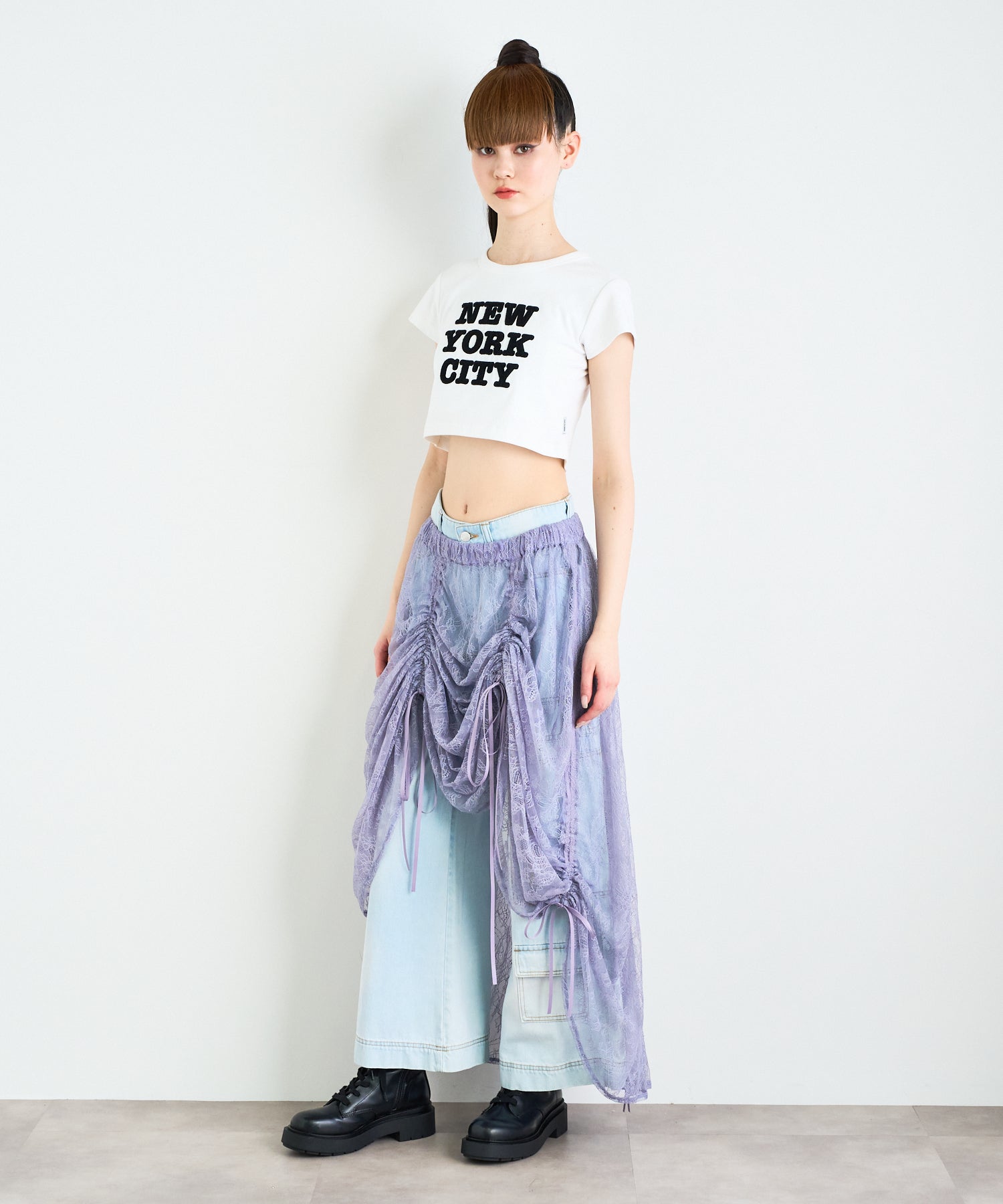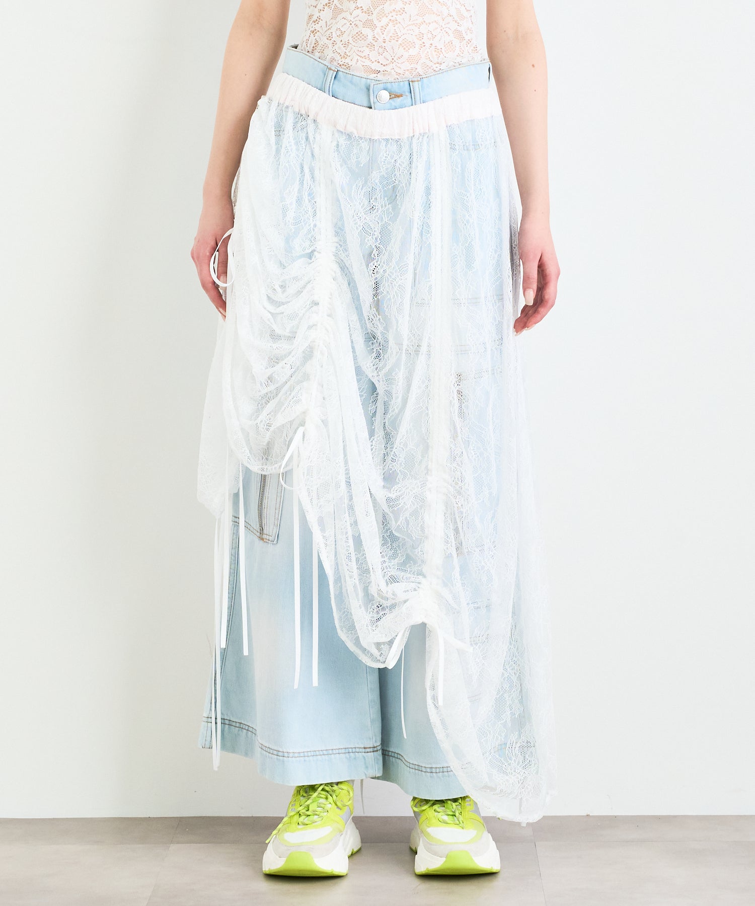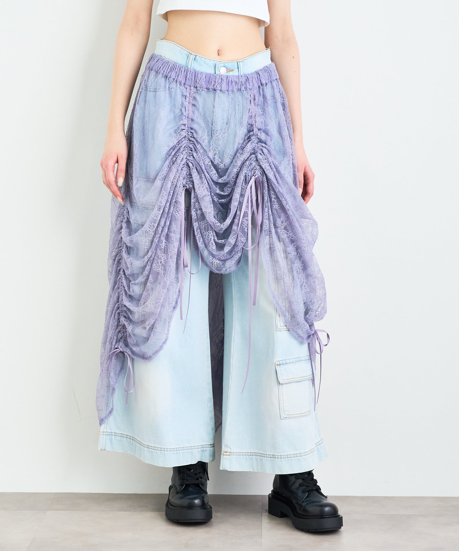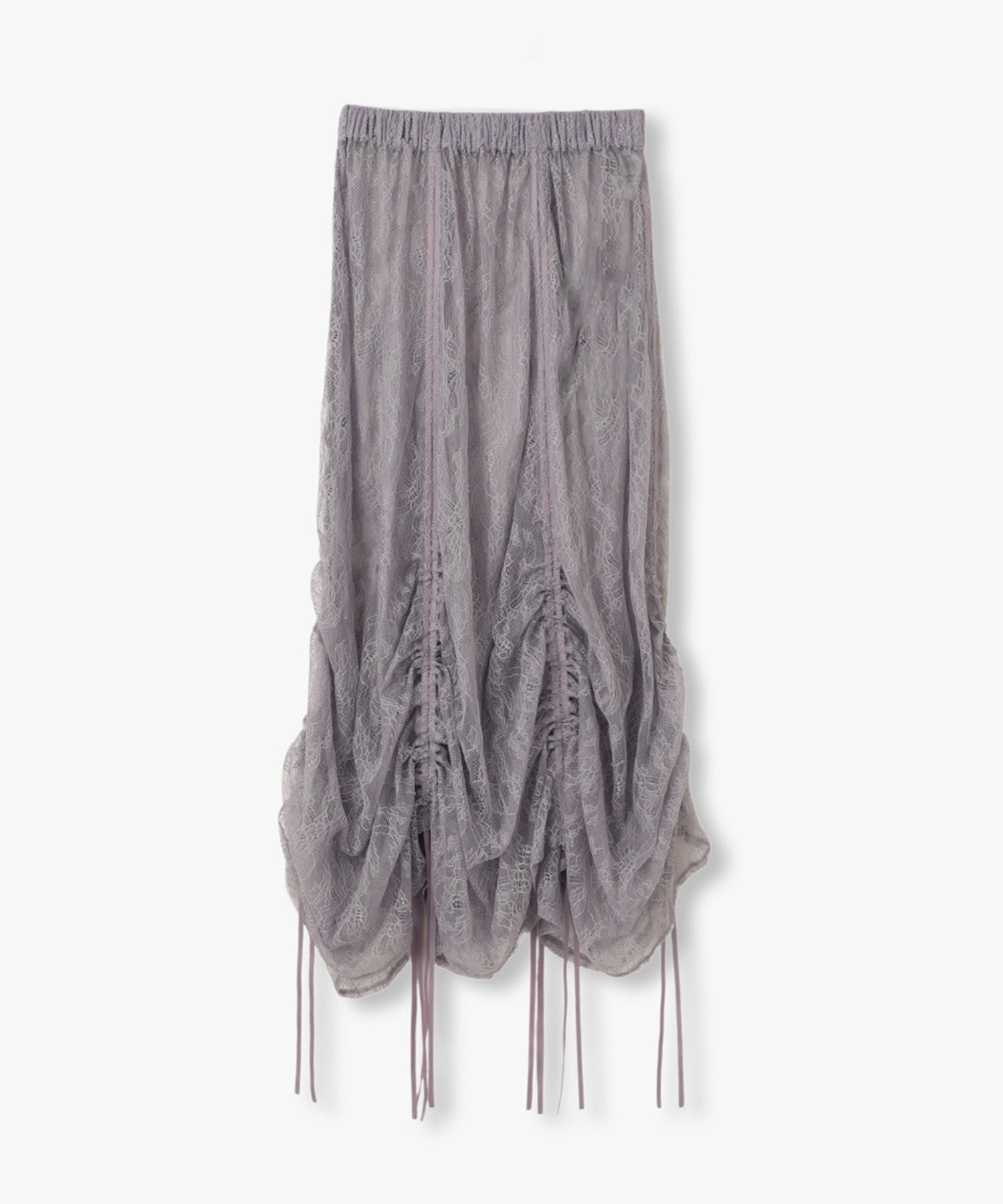 ボタニカル柄の繊細なレースを使用したロングスカート。前後左右6箇所にあしらわれたリボンを絞ることで、シルエットを自分好みにクリエイトすることができる360度どこから見ても可愛い1着です◎デニムやレギンスの上にレイヤードしたり、様々なスタイリングが楽しめるANNA SUI NYC一押しのアイテムです。