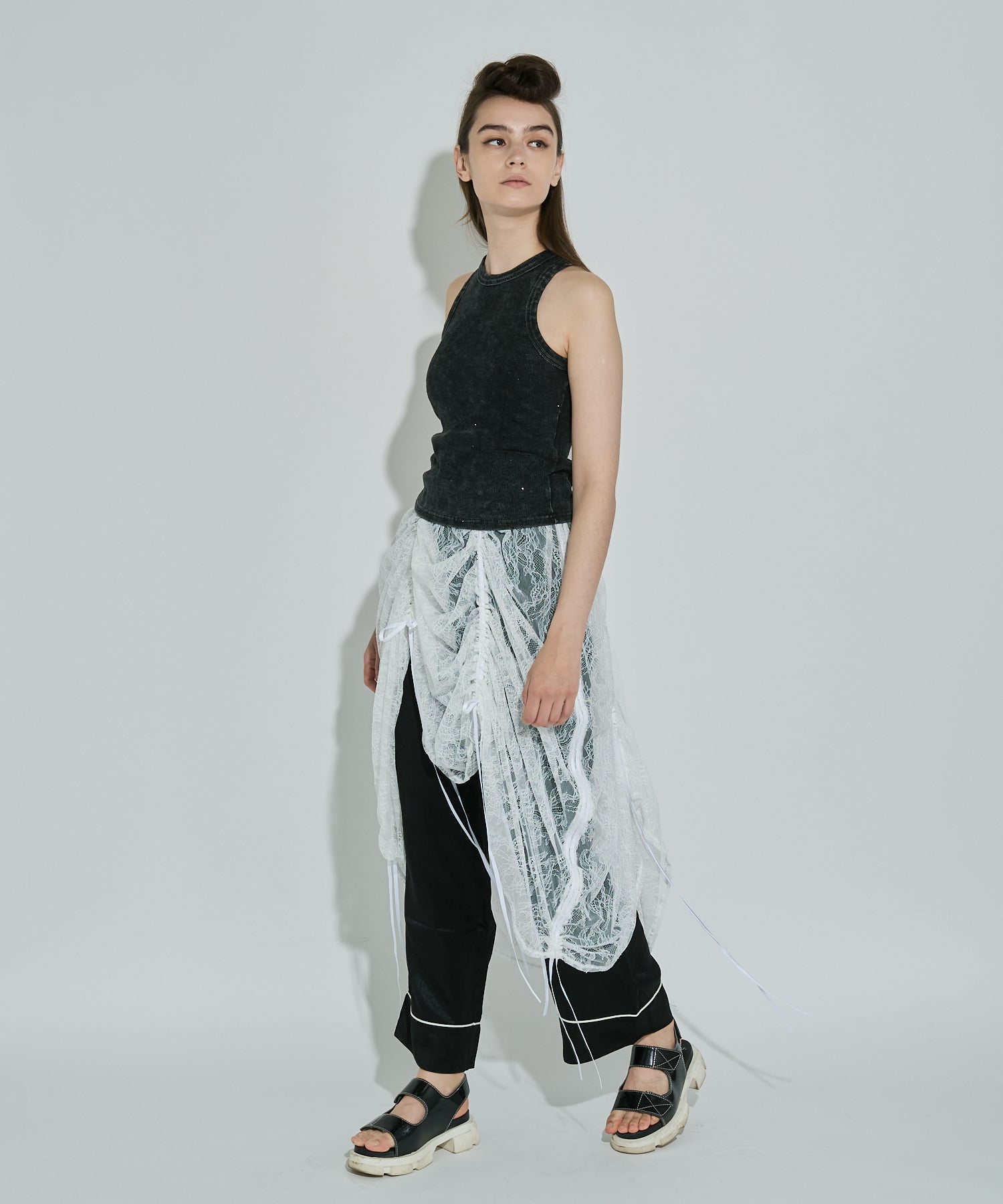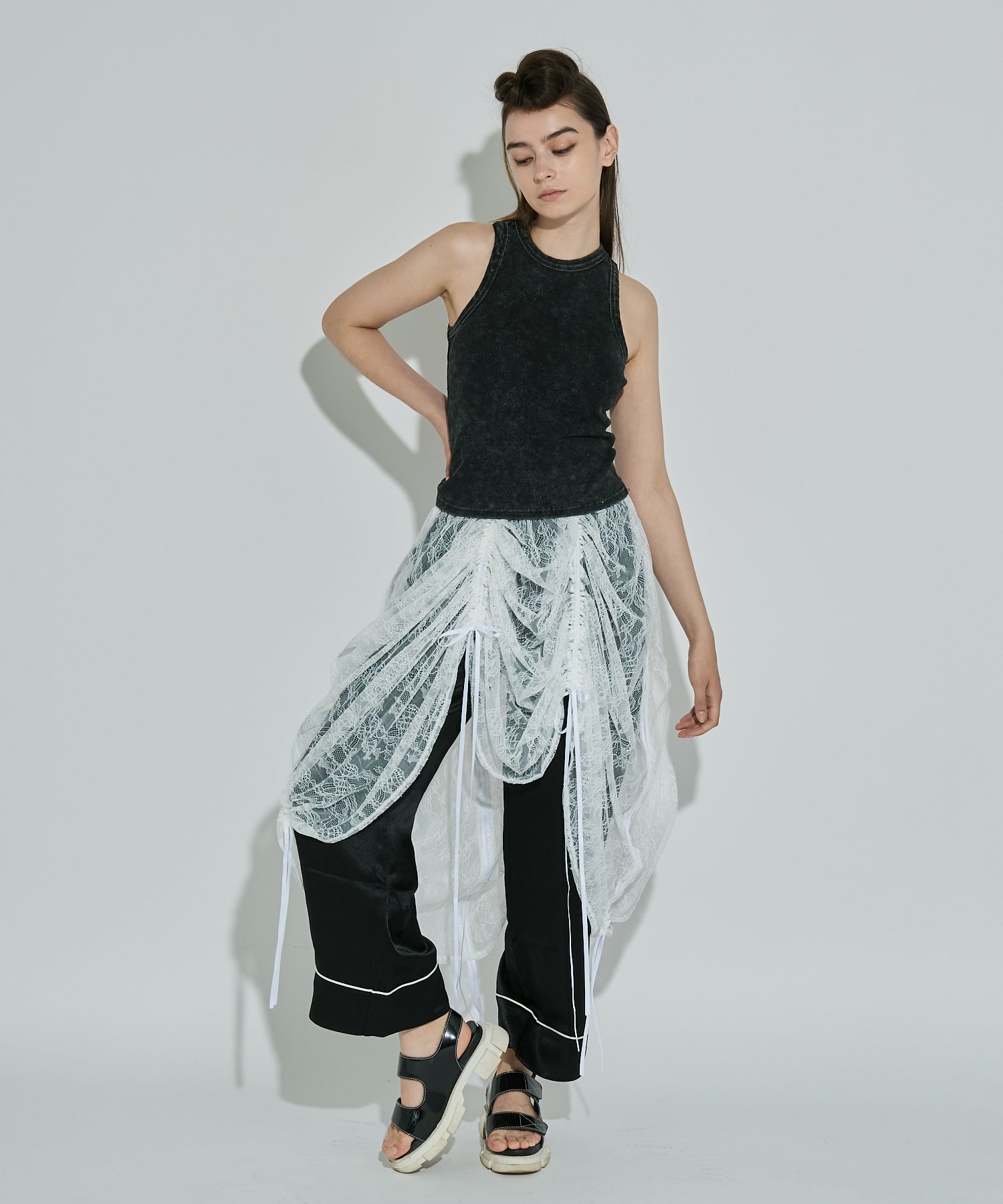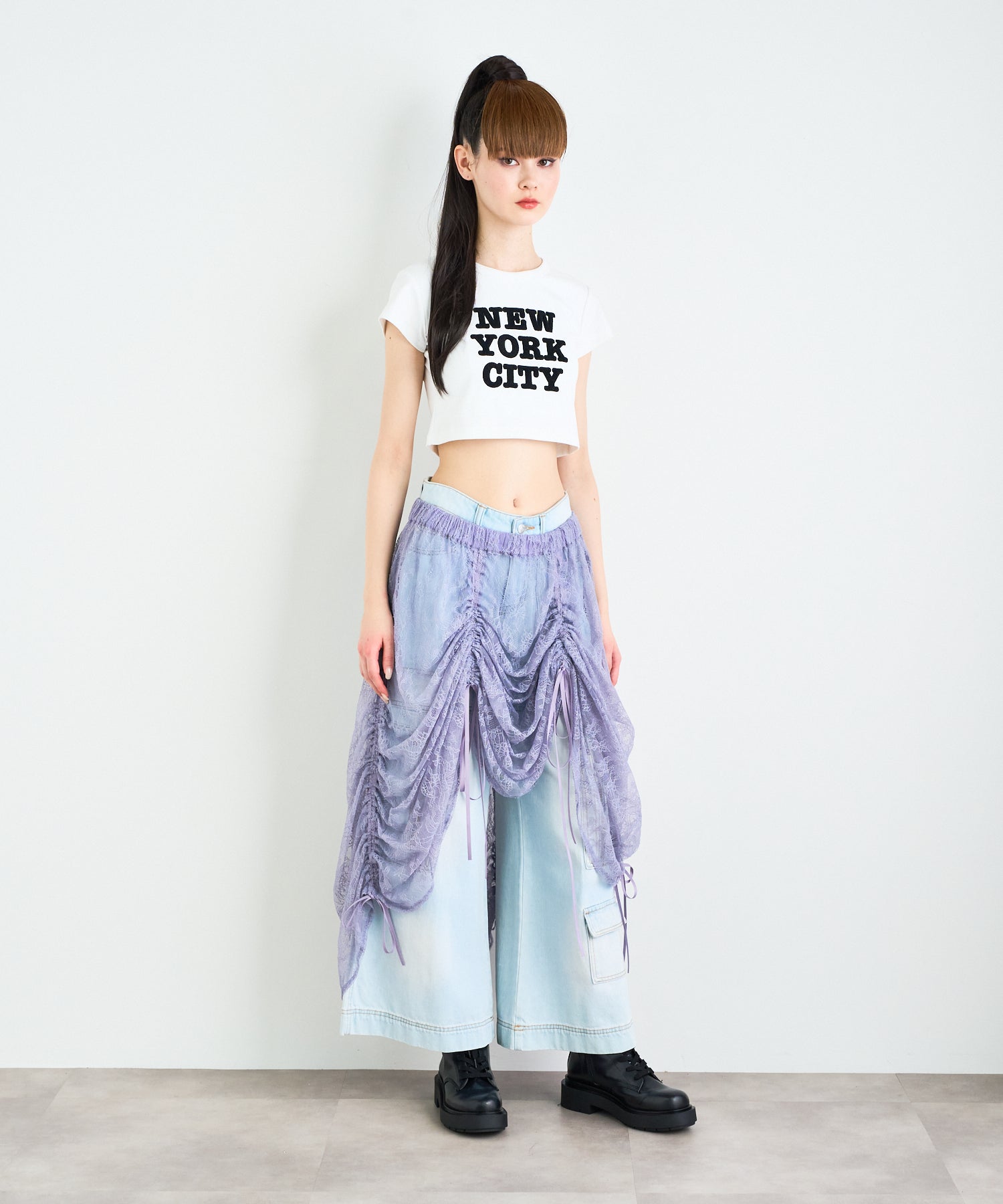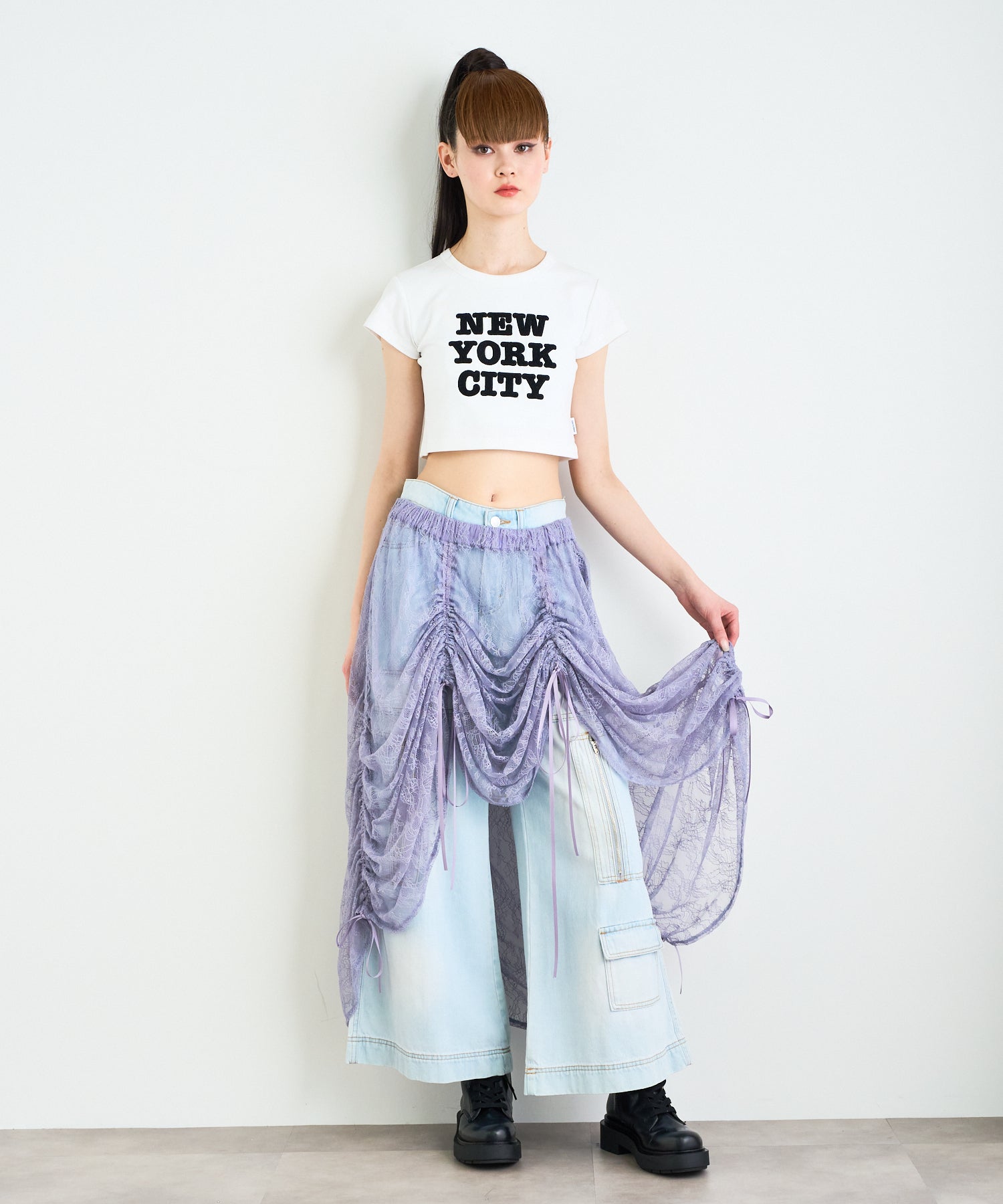 ボタニカル柄の繊細なレースを使用したロングスカート。前後左右6箇所にあしらわれたリボンを絞ることで、シルエットを自分好みにクリエイトすることができる360度どこから見ても可愛い1着です◎デニムやレギンスの上にレイヤードしたり、様々なスタイリングが楽しめるANNA SUI NYC一押しのアイテムです。