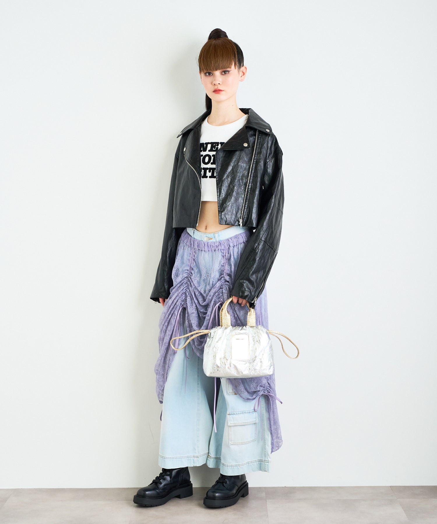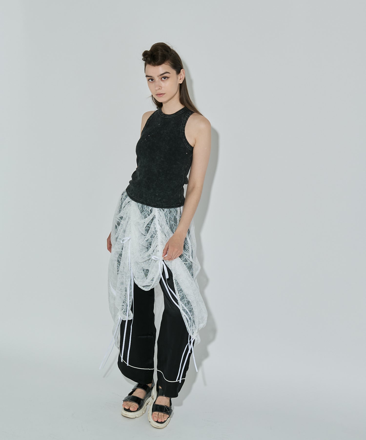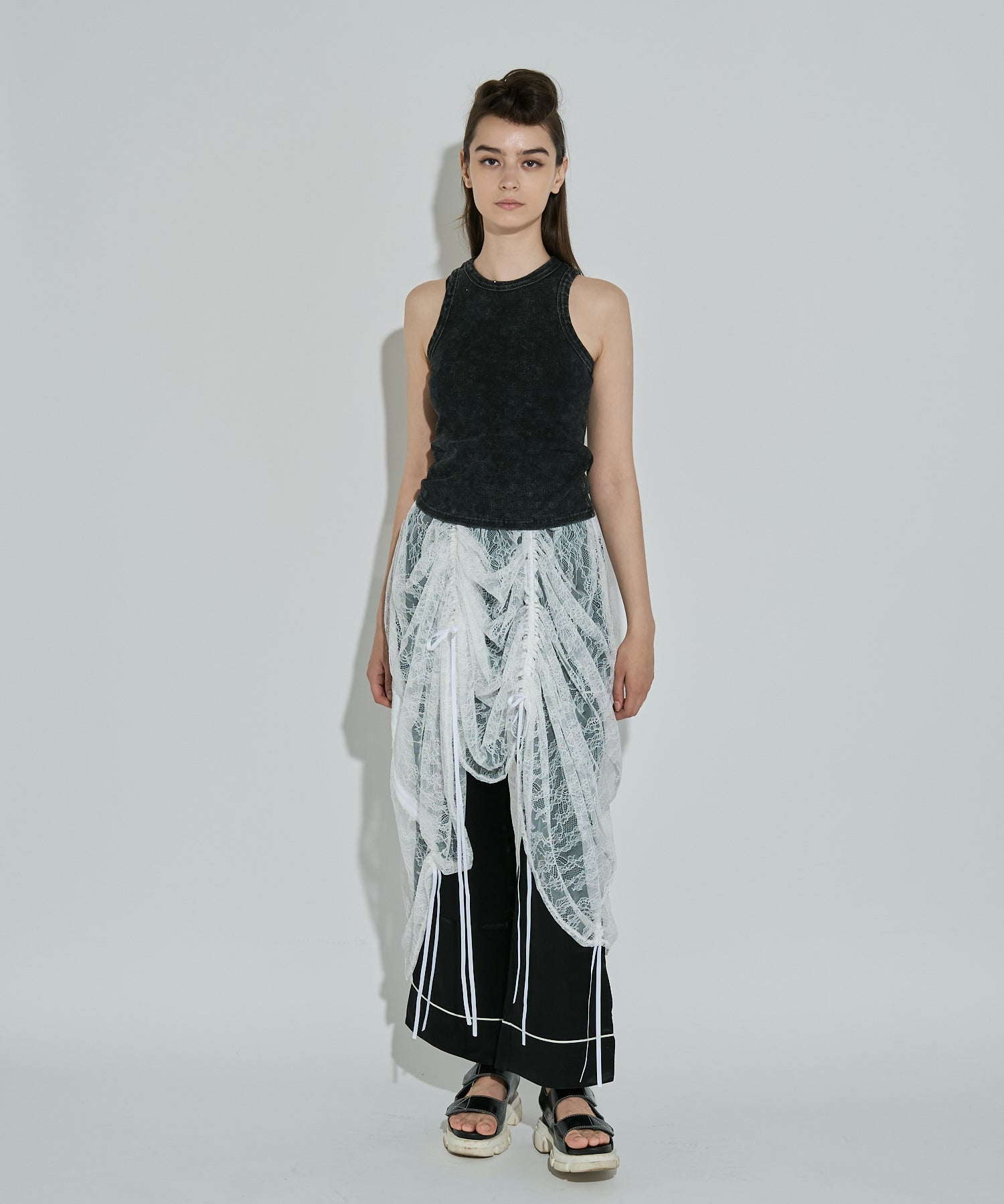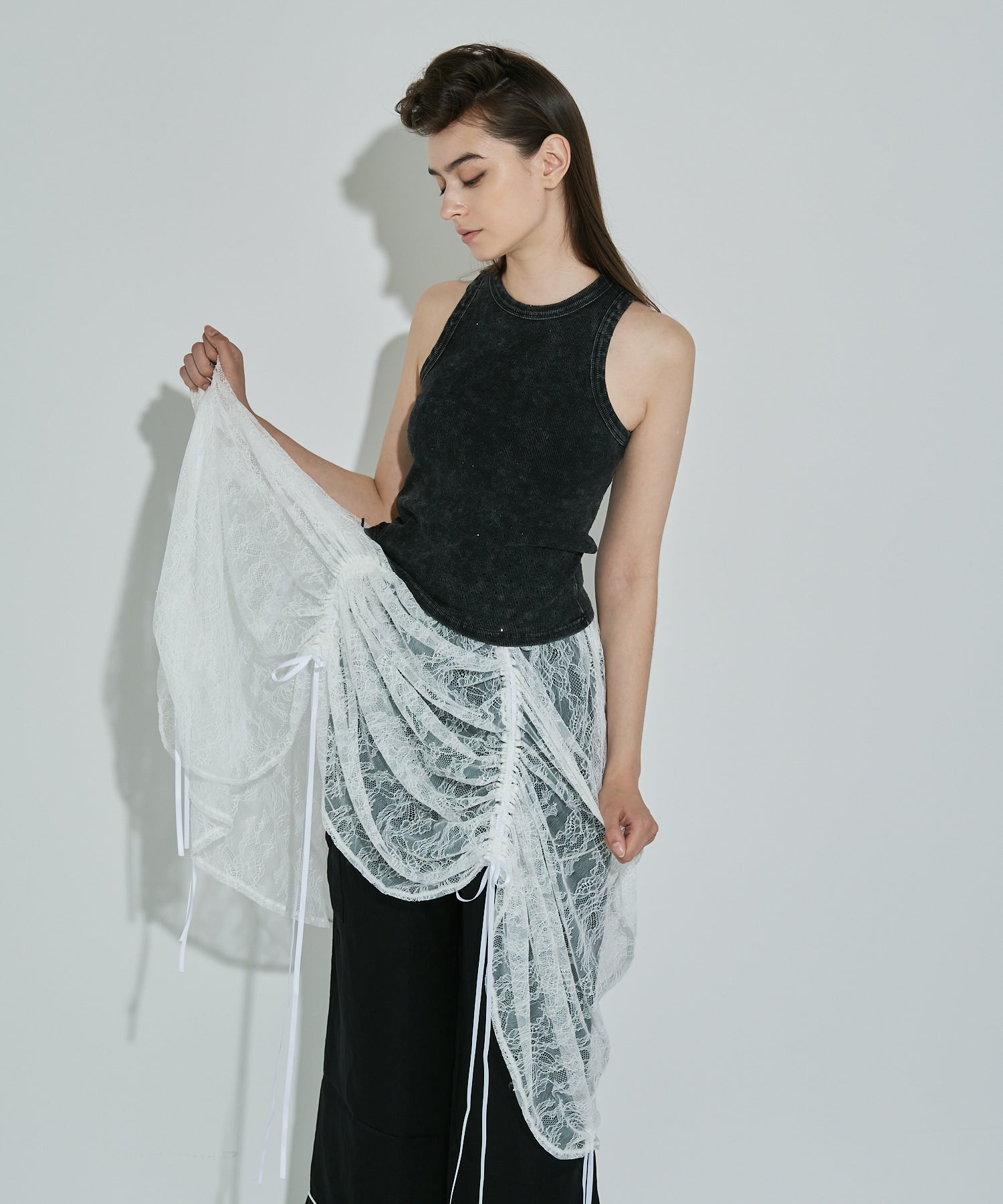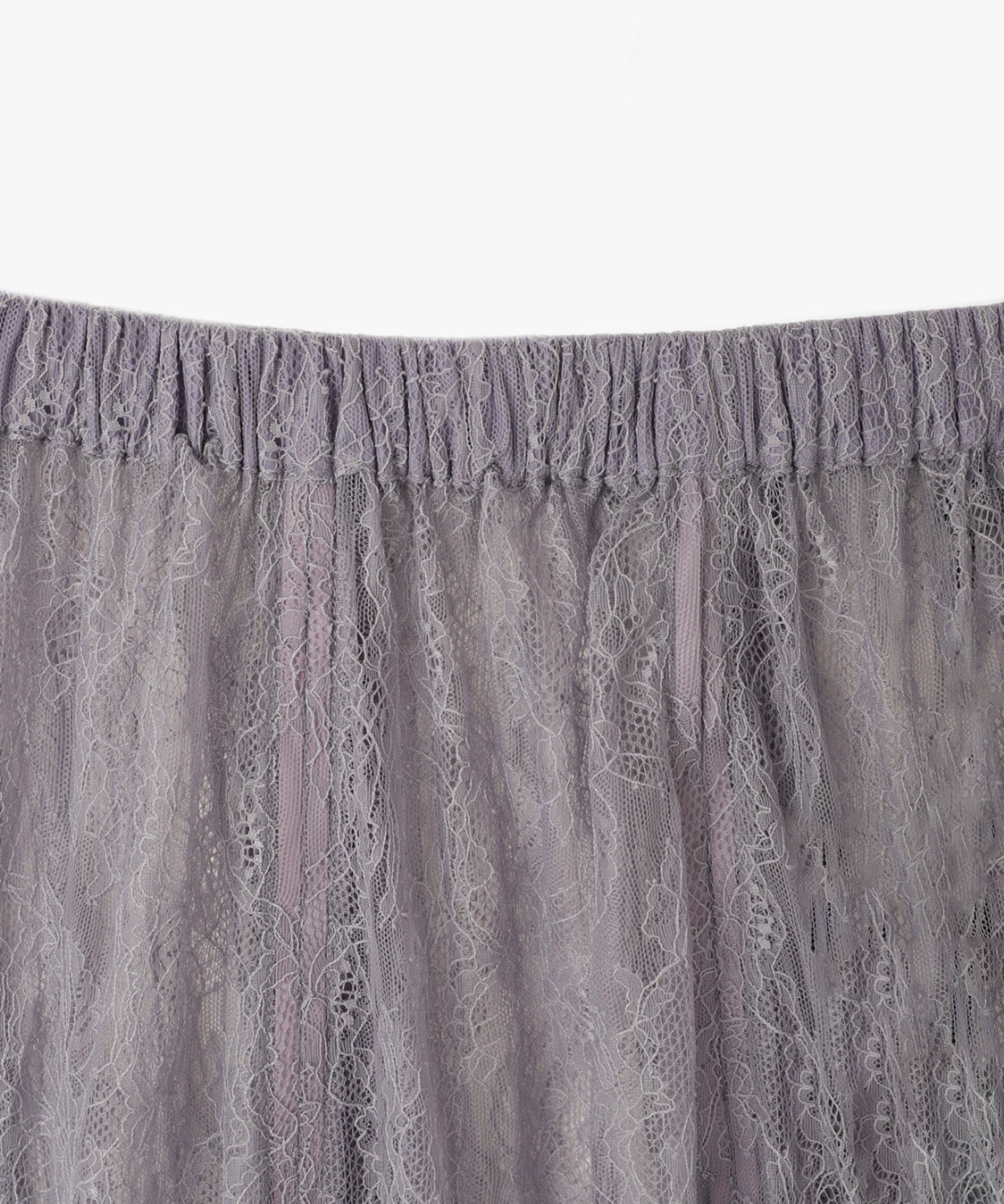ボタニカル柄の繊細なレースを使用したロングスカート。前後左右6箇所にあしらわれたリボンを絞ることで、シルエットを自分好みにクリエイトすることができる360度どこから見ても可愛い1着です◎デニムやレギンスの上にレイヤードしたり、様々なスタイリングが楽しめるANNA SUI NYC一押しのアイテムです。