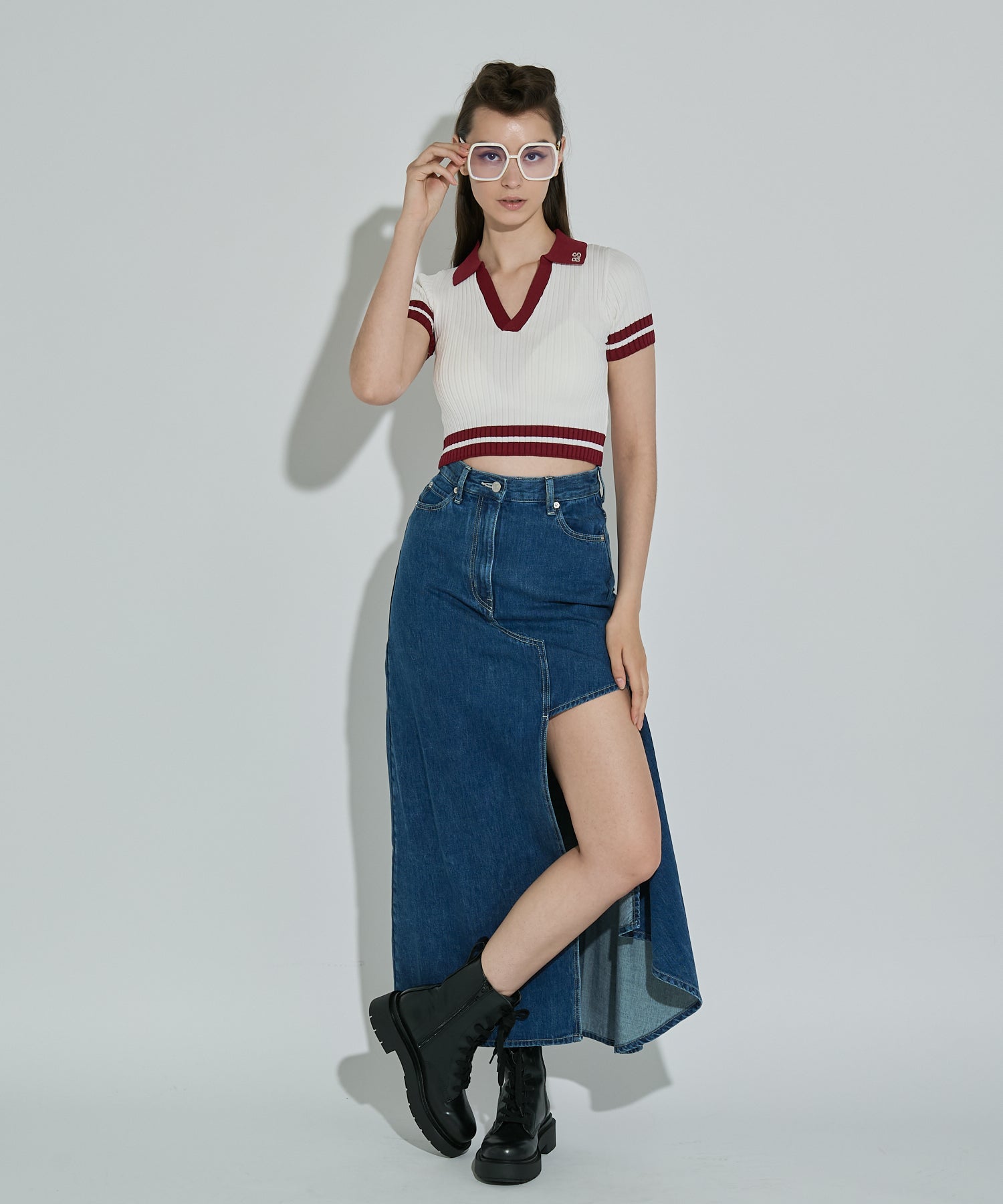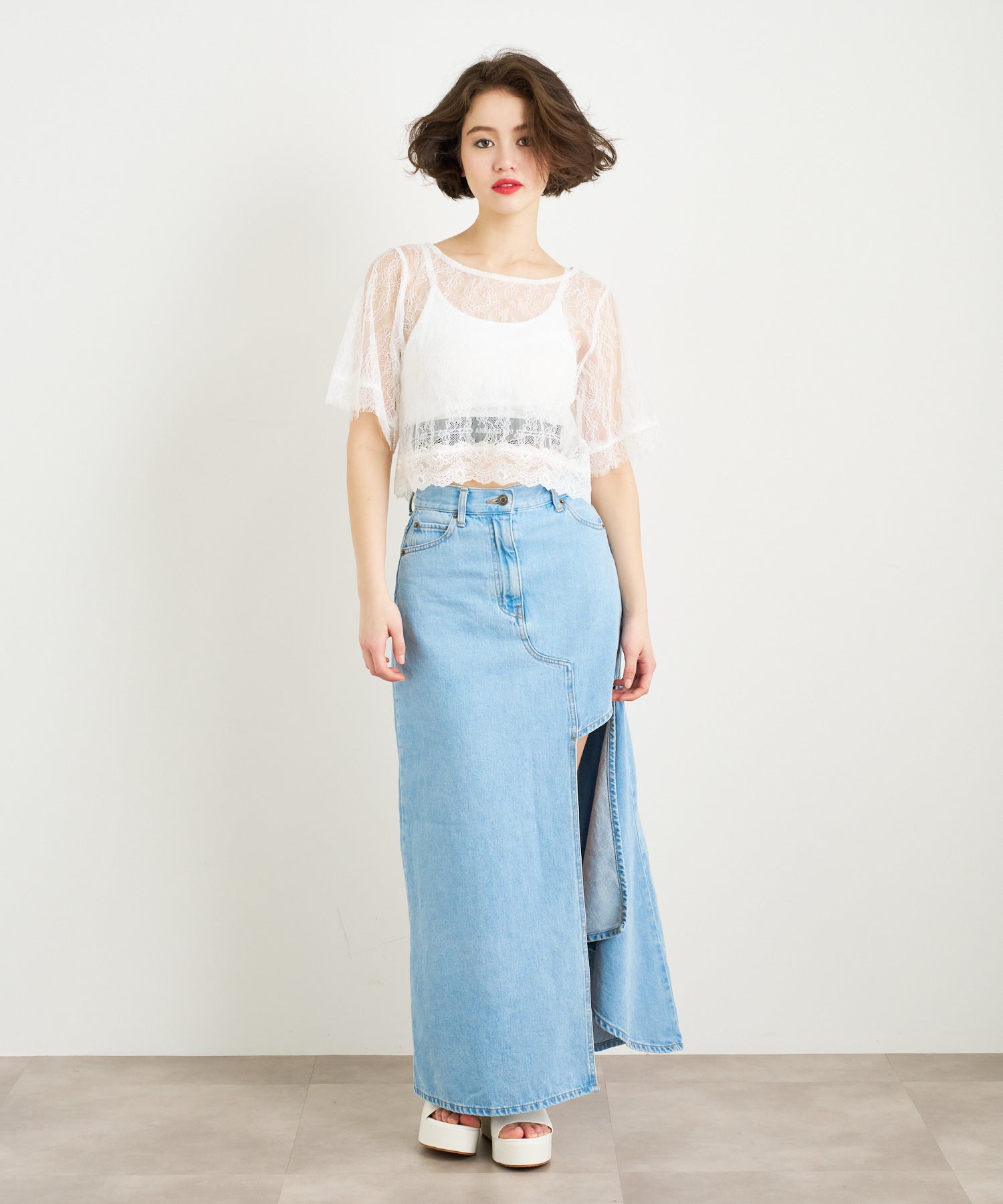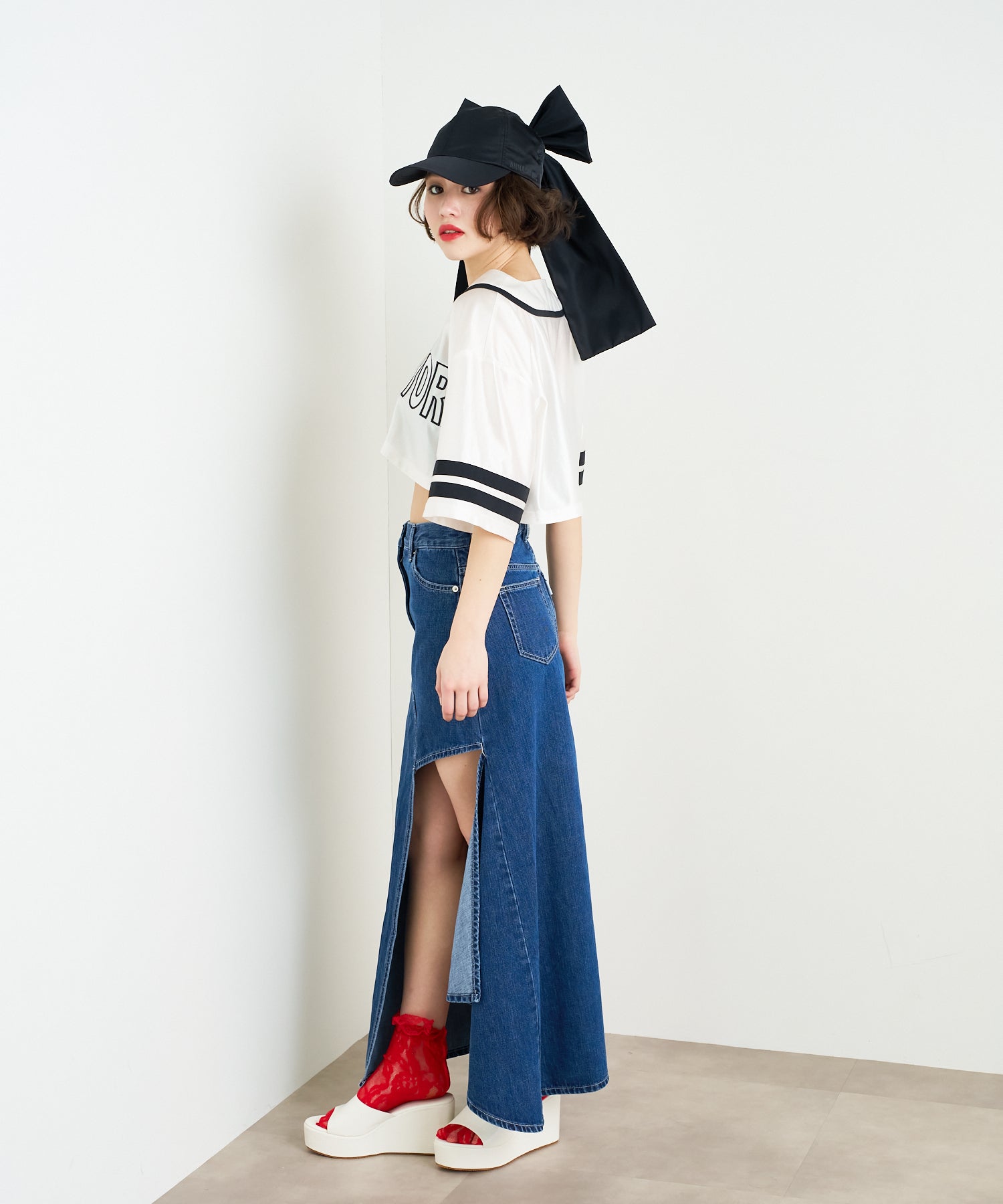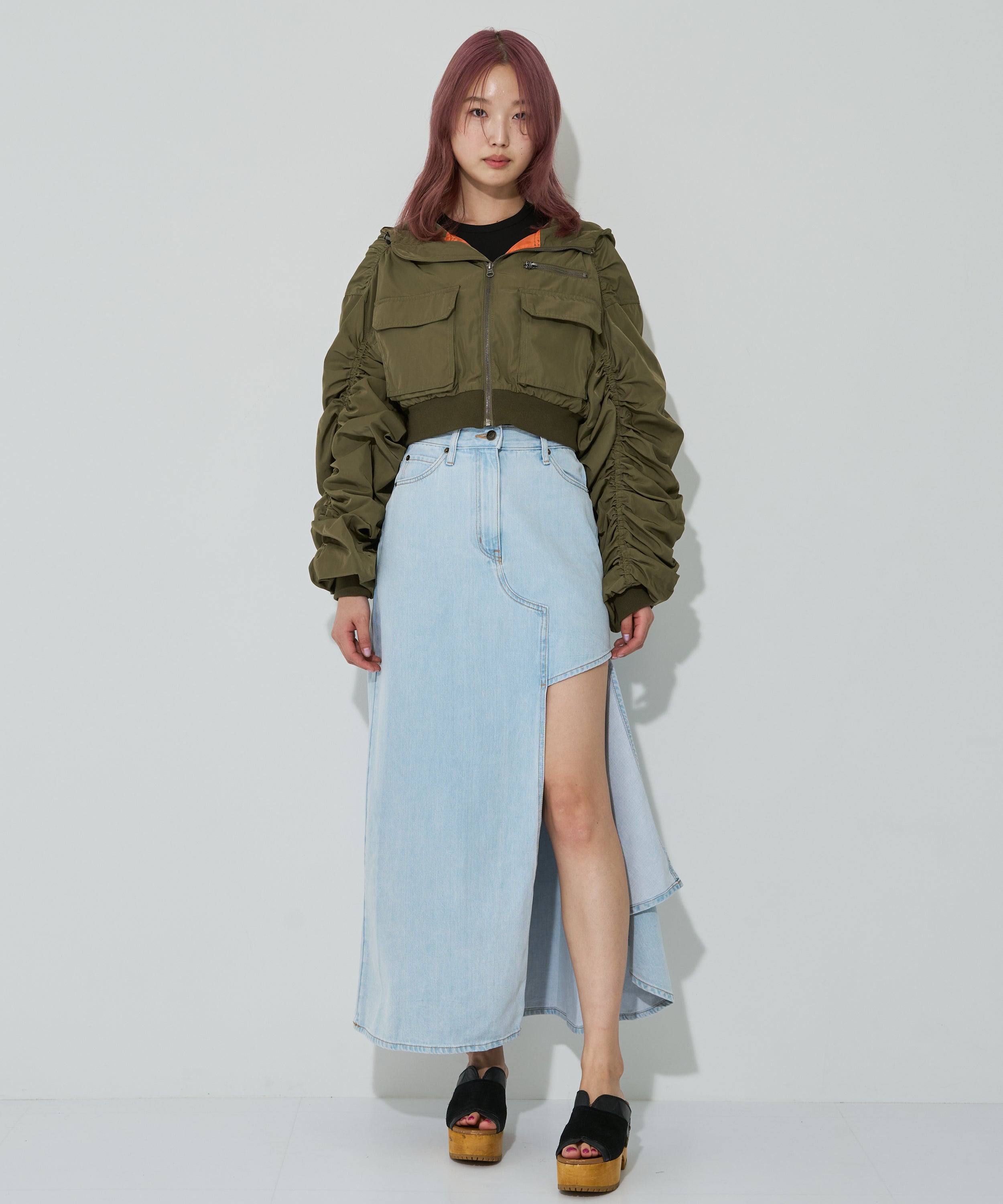 アシンメトリーカッティングヘムデニムロングスカート