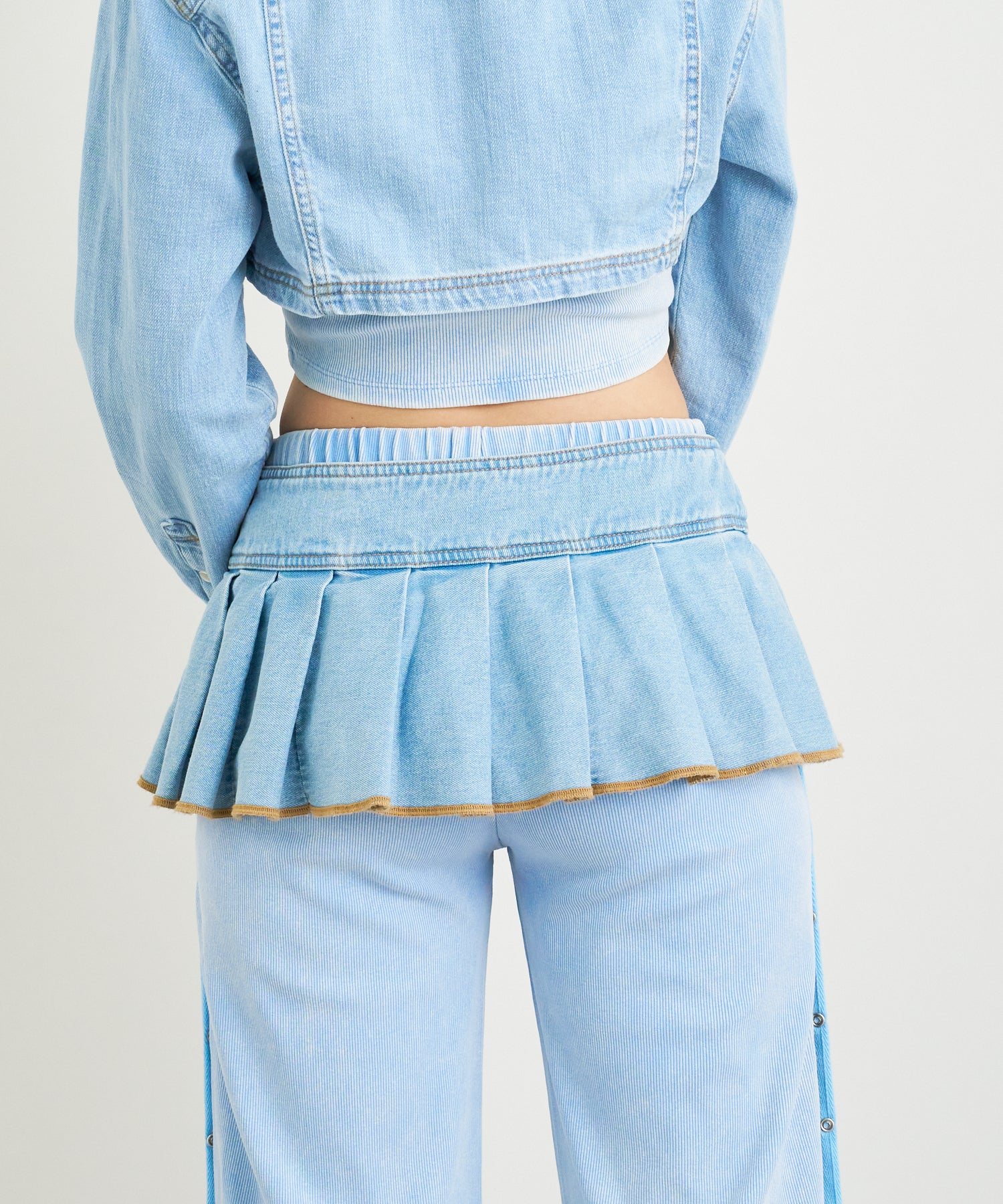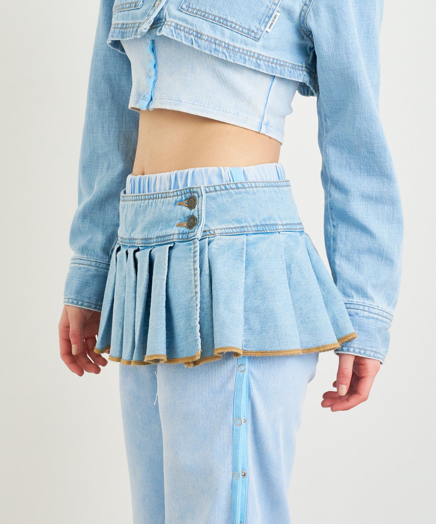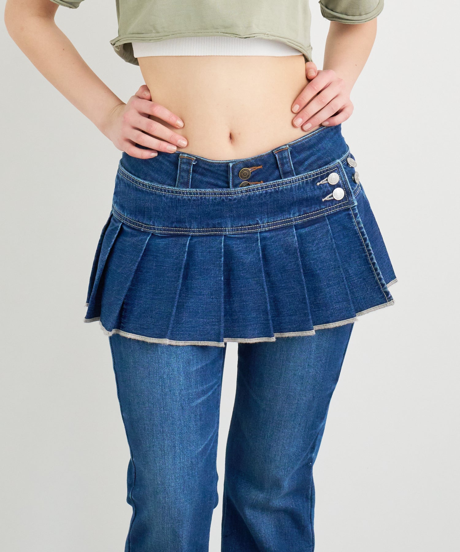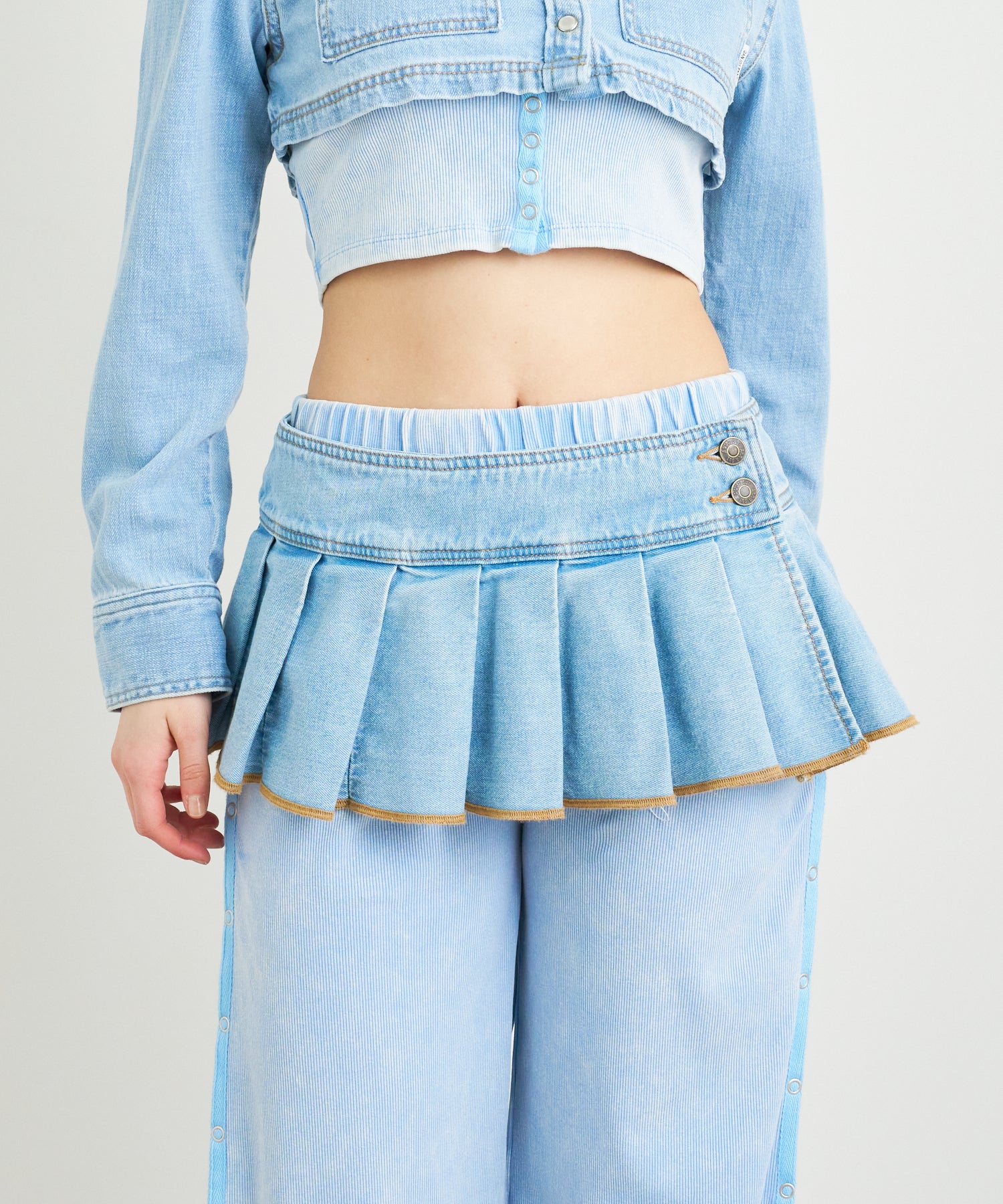 厚みがしっかりしたデニム素材のレイヤードスカート。裾のステッチの色味がデザインポイントになってかわいいアイテムです。ウエストの大きさを調整できるようにボタンが2列付いています。ローライズの位置で履き、ロングパンツなどお好みのボトムスに合わせてスタイリングを楽しめるとっておきのアイテムです!