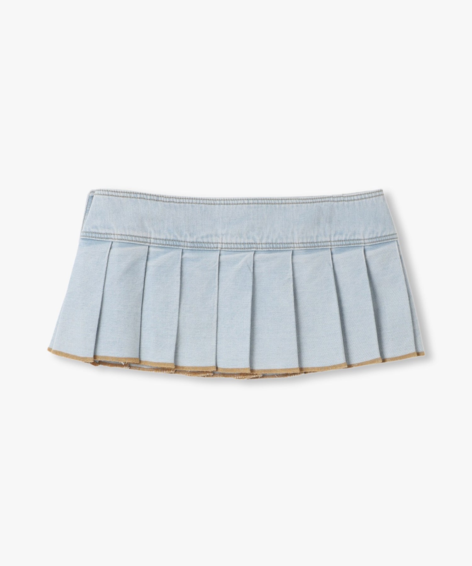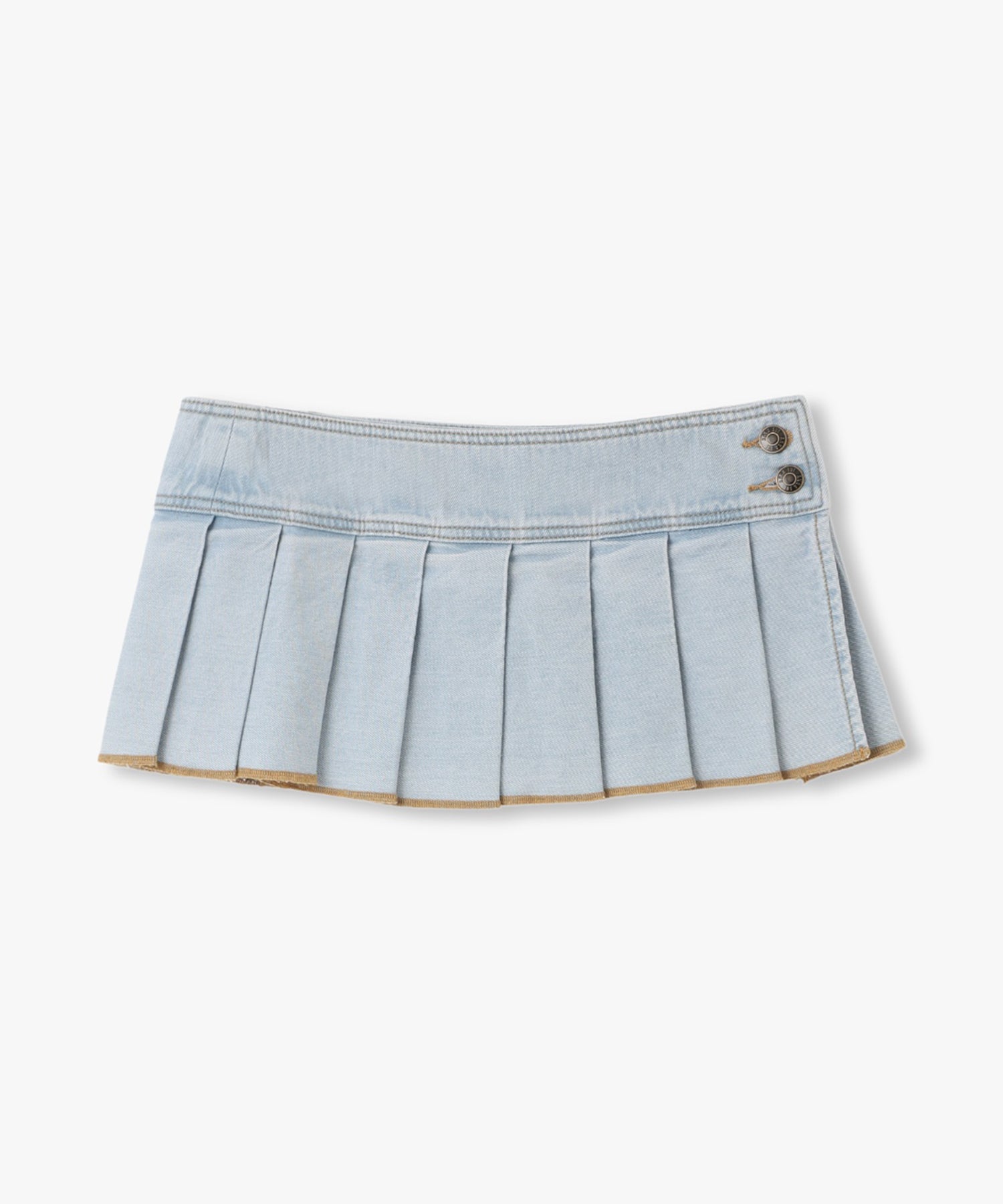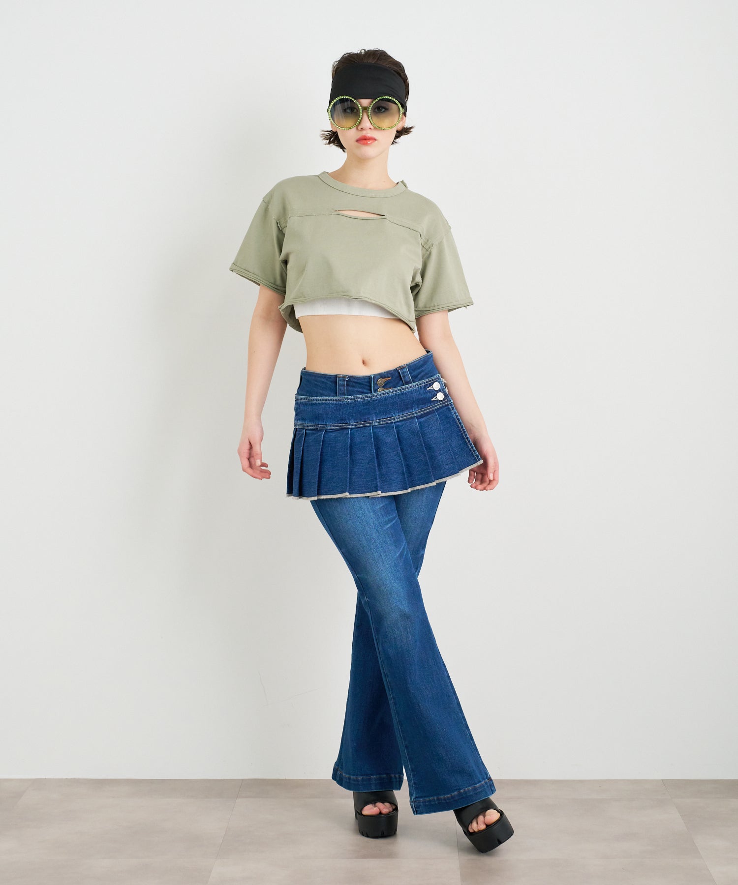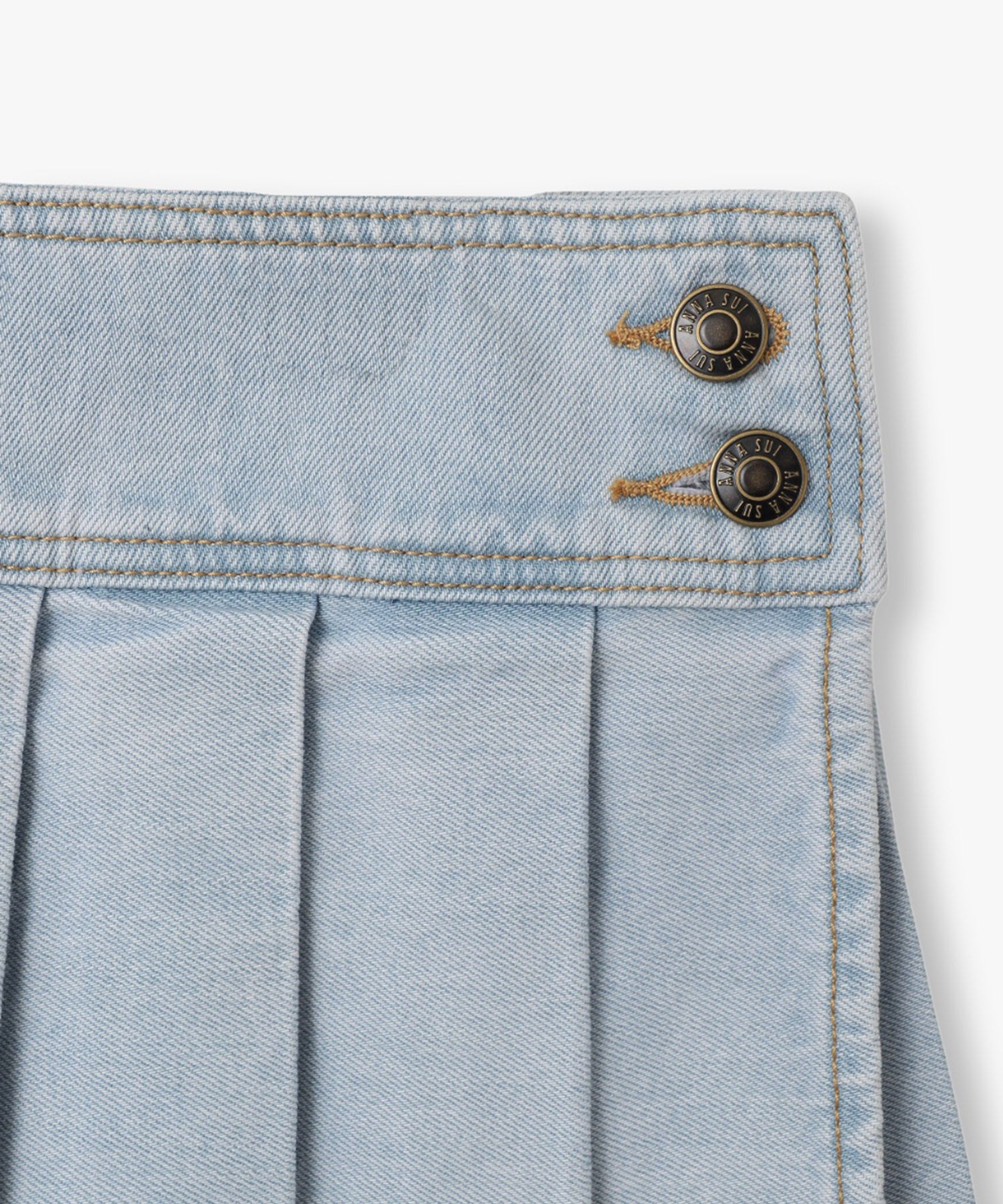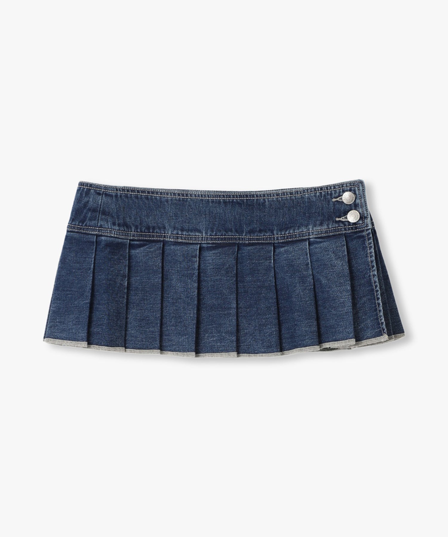 厚みがしっかりしたデニム素材のレイヤードスカート。裾のステッチの色味がデザインポイントになってかわいいアイテムです。ウエストの大きさを調整できるようにボタンが2列付いています。ローライズの位置で履き、ロングパンツなどお好みのボトムスに合わせてスタイリングを楽しめるとっておきのアイテムです!