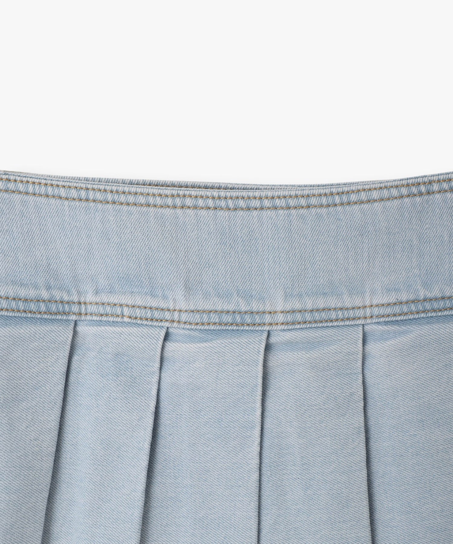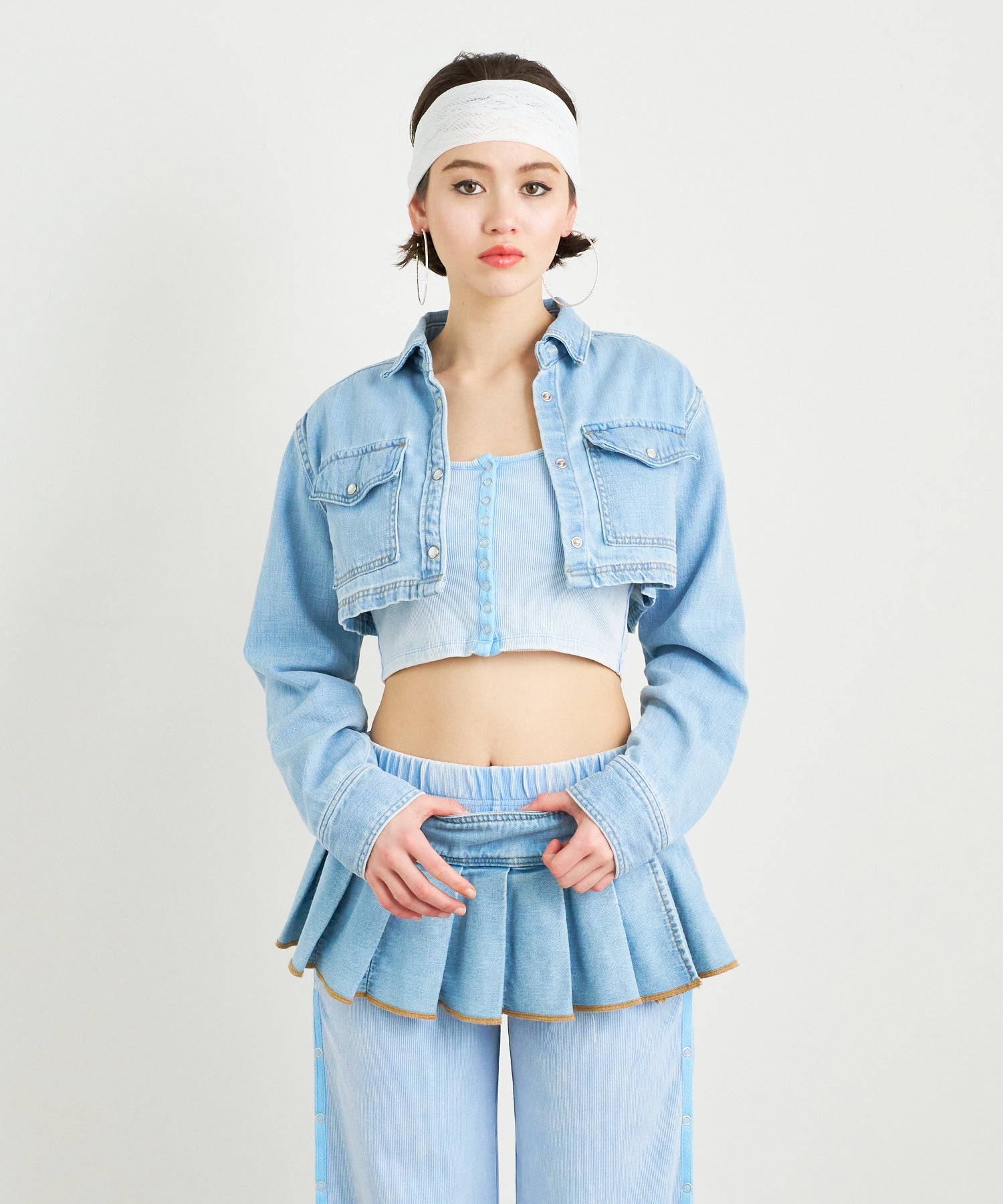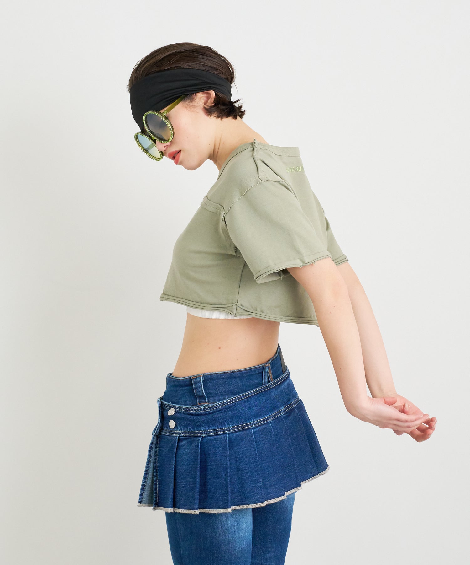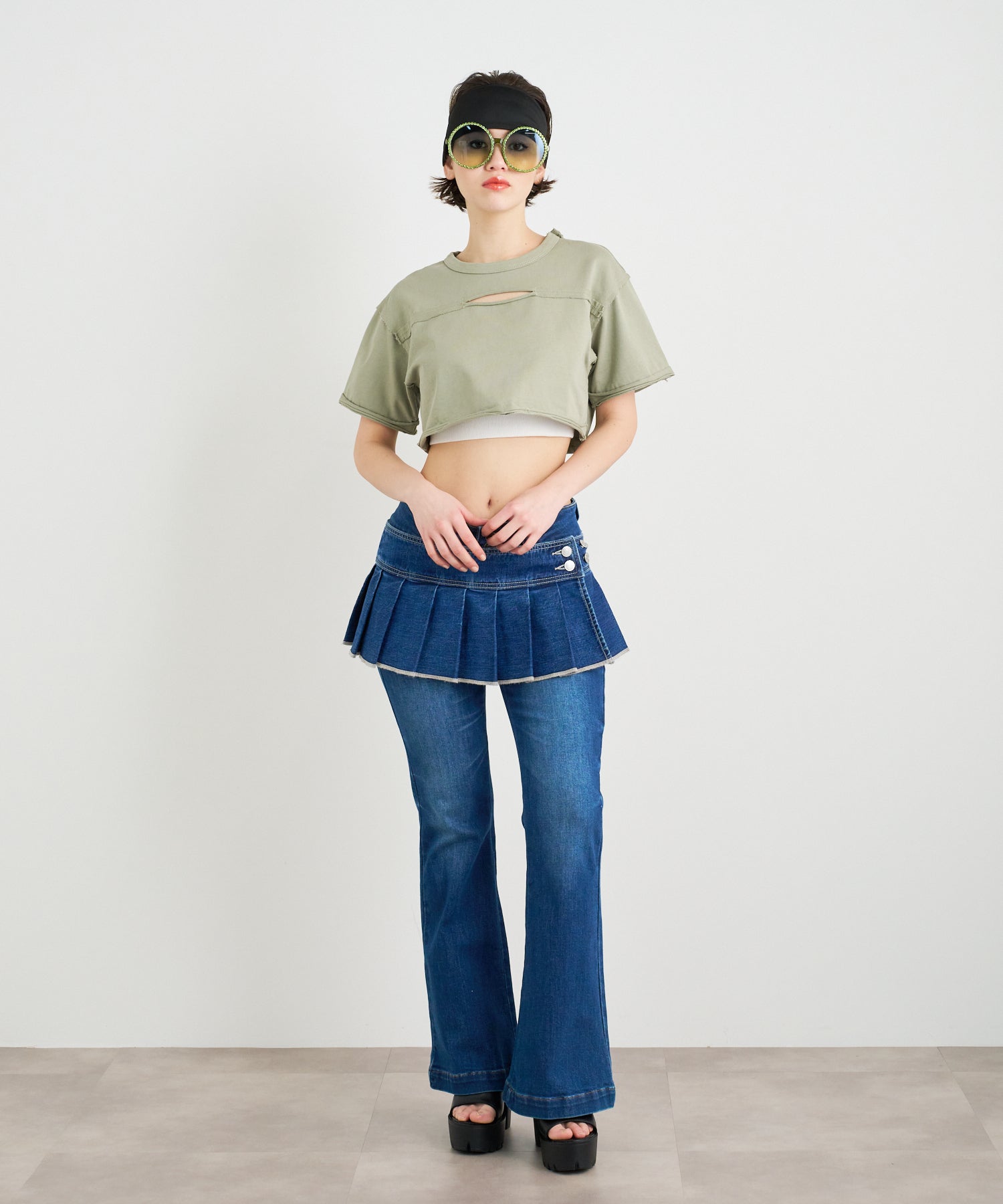 厚みがしっかりしたデニム素材のレイヤードスカート。裾のステッチの色味がデザインポイントになってかわいいアイテムです。ウエストの大きさを調整できるようにボタンが2列付いています。ローライズの位置で履き、ロングパンツなどお好みのボトムスに合わせてスタイリングを楽しめるとっておきのアイテムです!