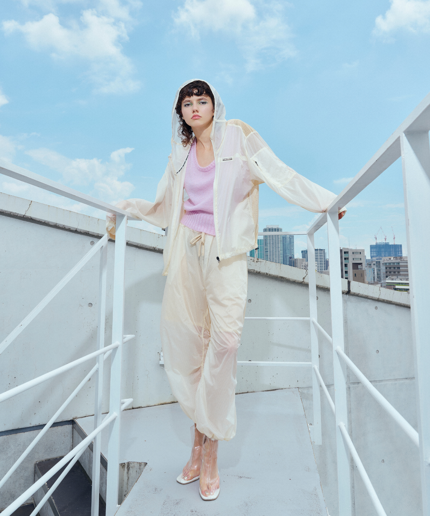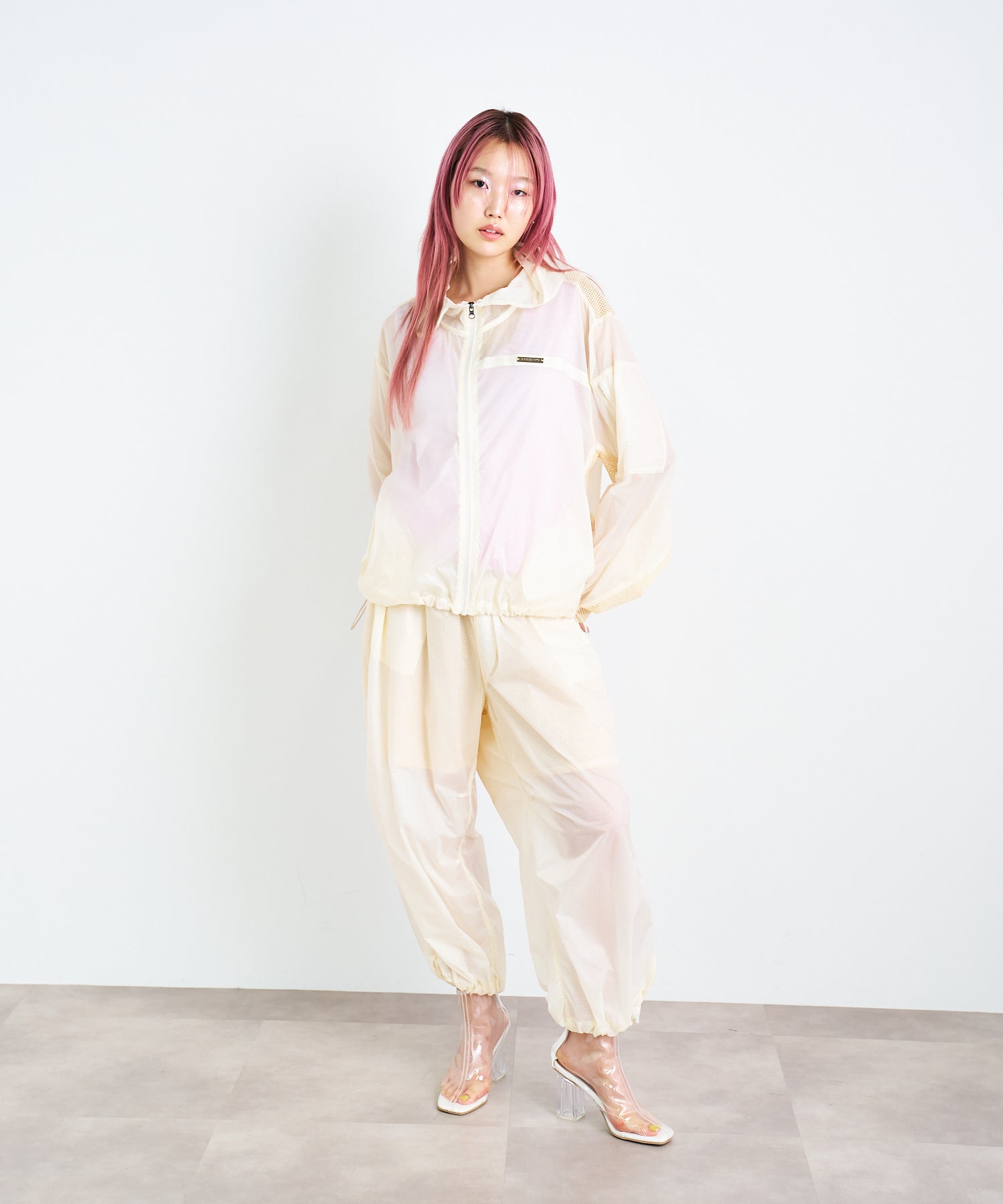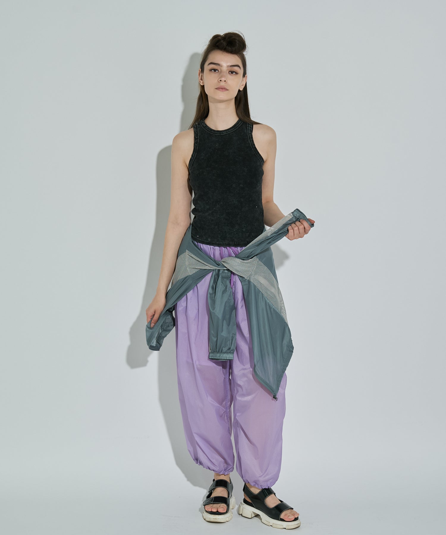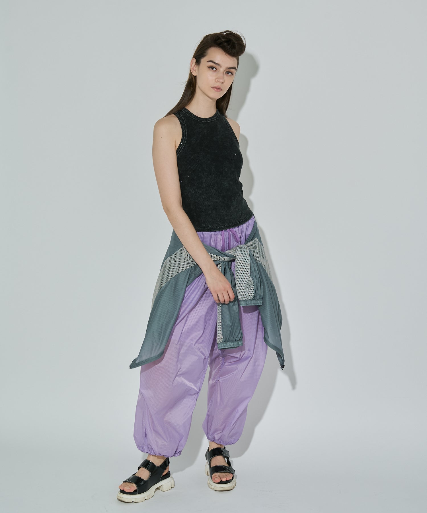 軽量で適度なハリ感と柔らかさを兼ね揃えたシアーリップストップ素材に、裏地は通気性の高いメッシュを採用。淡色は少し透けますが、ワイドなシルエットのおかげで中にぺチパンツなどを仕込む余裕も。アクティブな素材感ながら、シアーならではのエアリーな表情が、ヘルシーで女性らしいバランスを演出します。