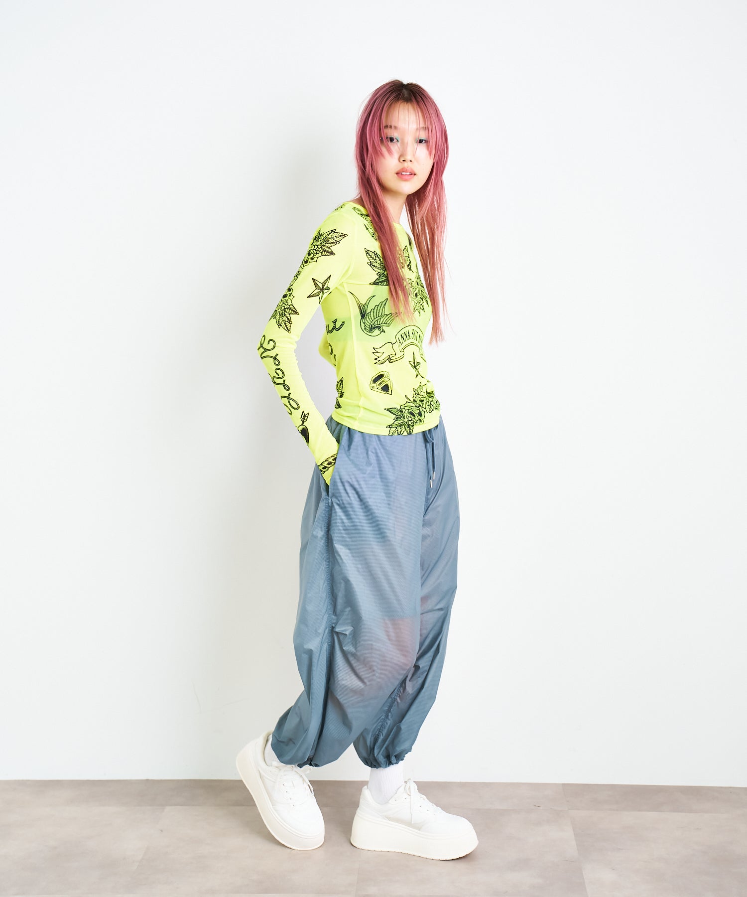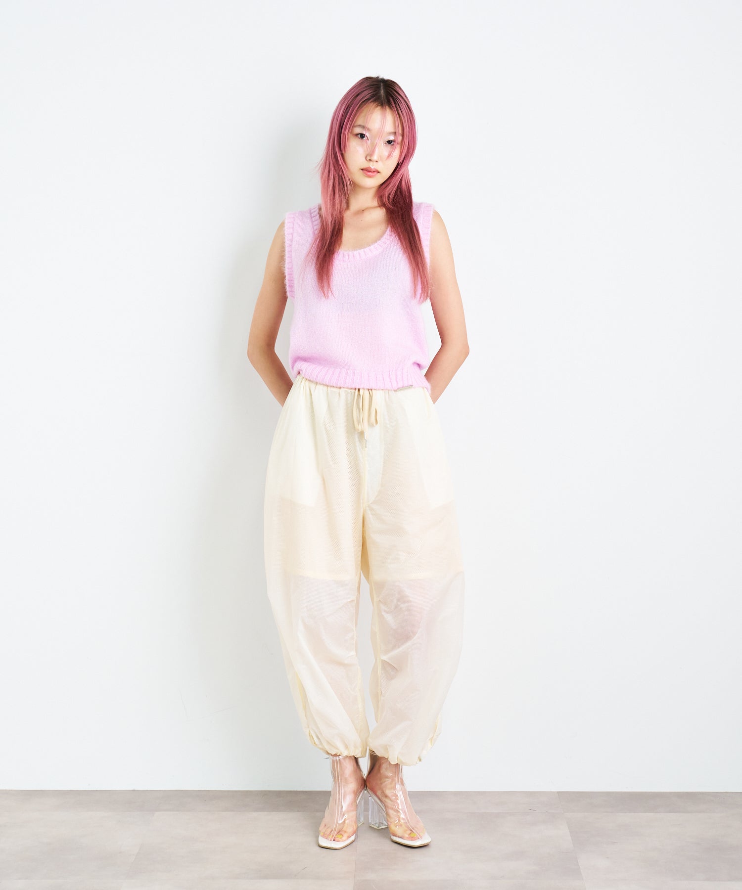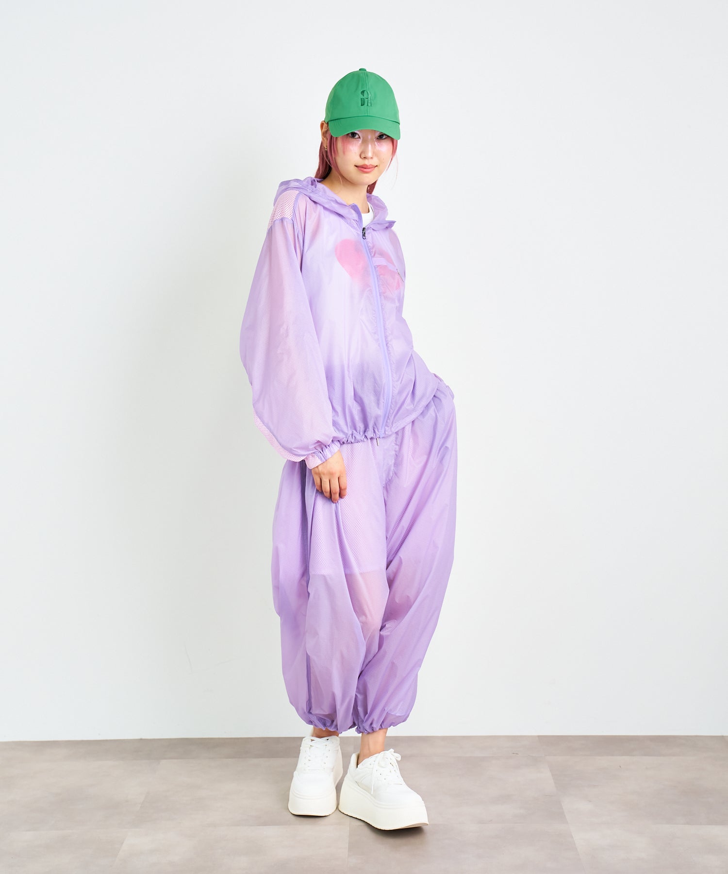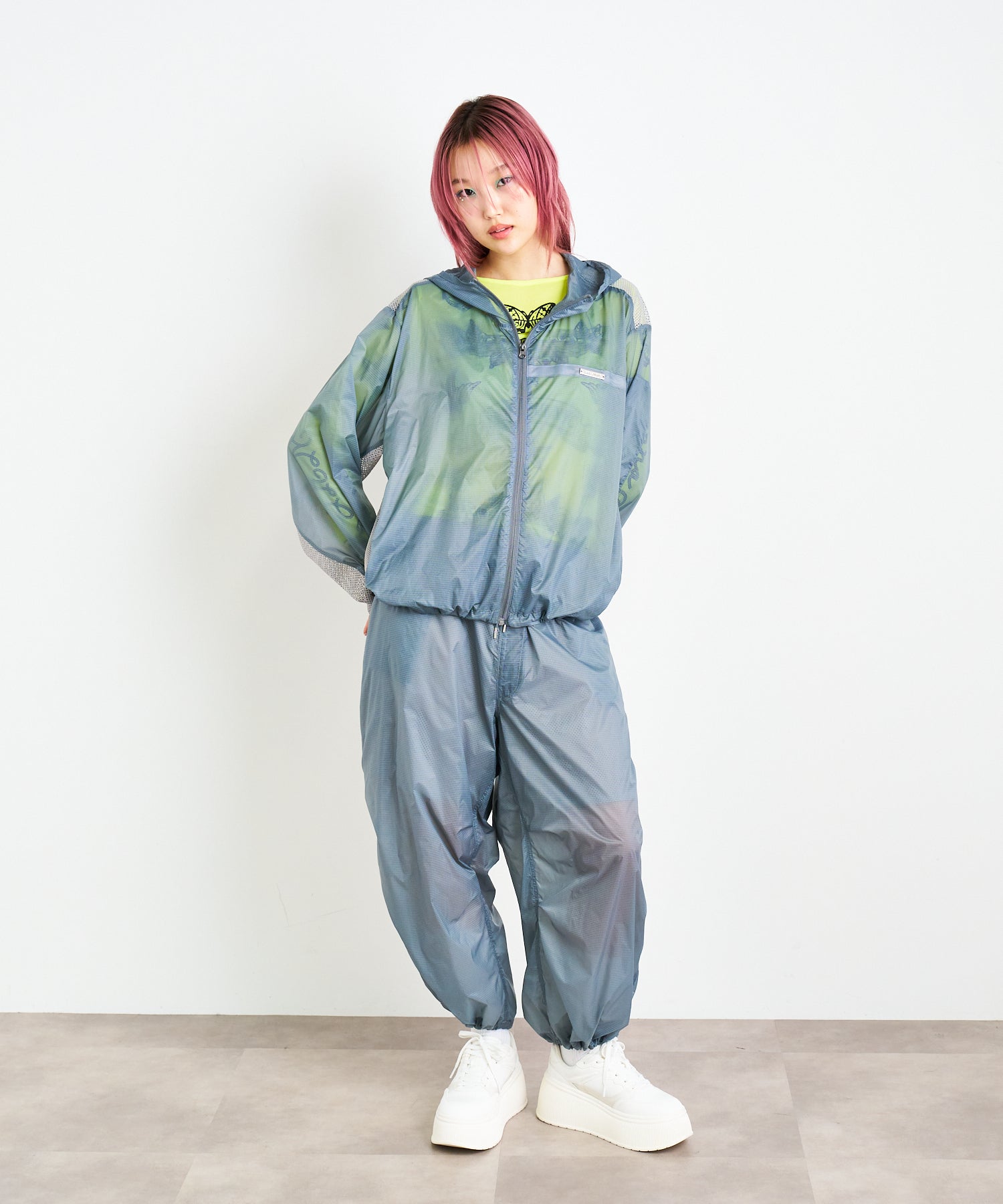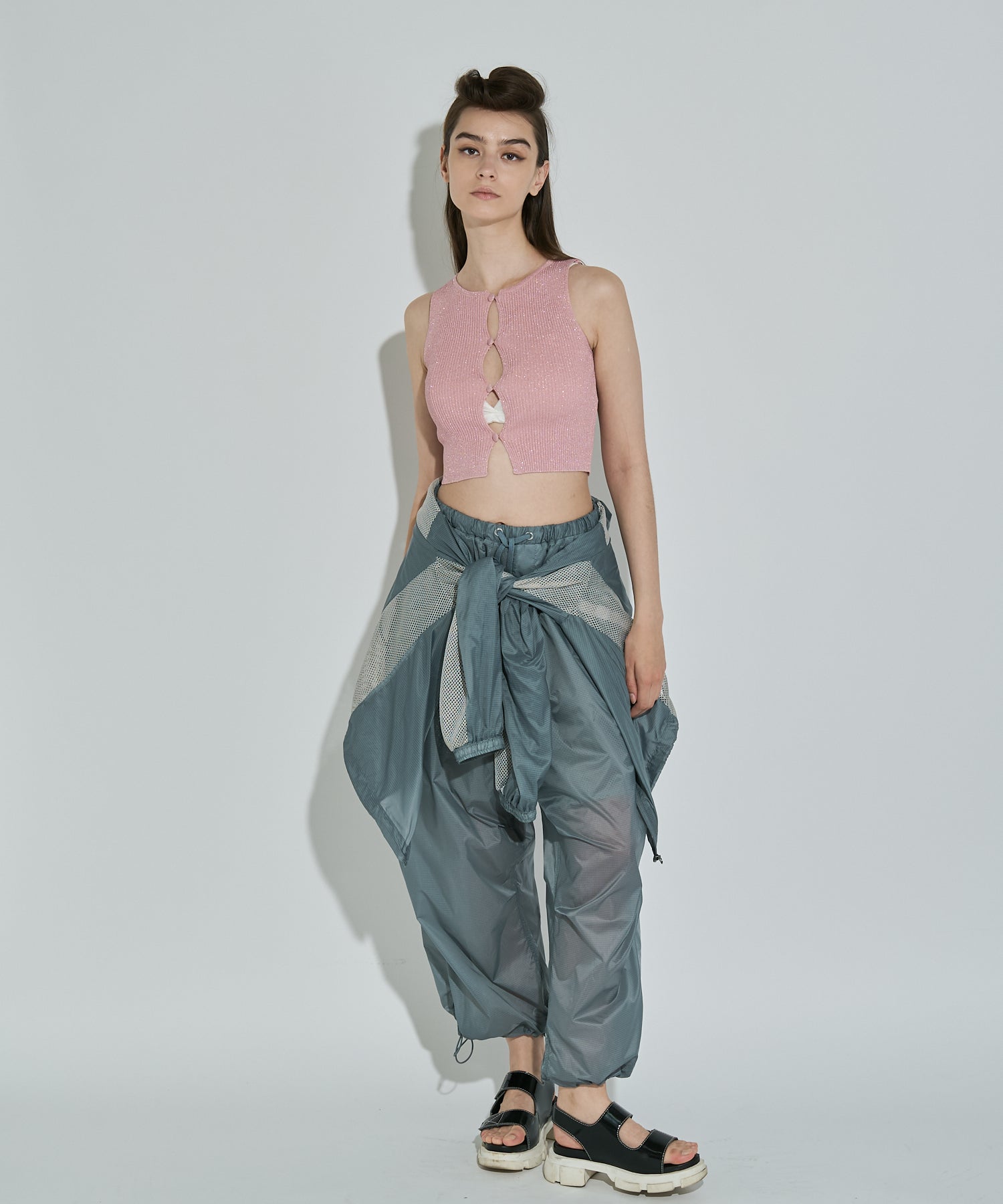 軽量で適度なハリ感と柔らかさを兼ね揃えたシアーリップストップ素材に、裏地は通気性の高いメッシュを採用。淡色は少し透けますが、ワイドなシルエットのおかげで中にぺチパンツなどを仕込む余裕も。アクティブな素材感ながら、シアーならではのエアリーな表情が、ヘルシーで女性らしいバランスを演出します。