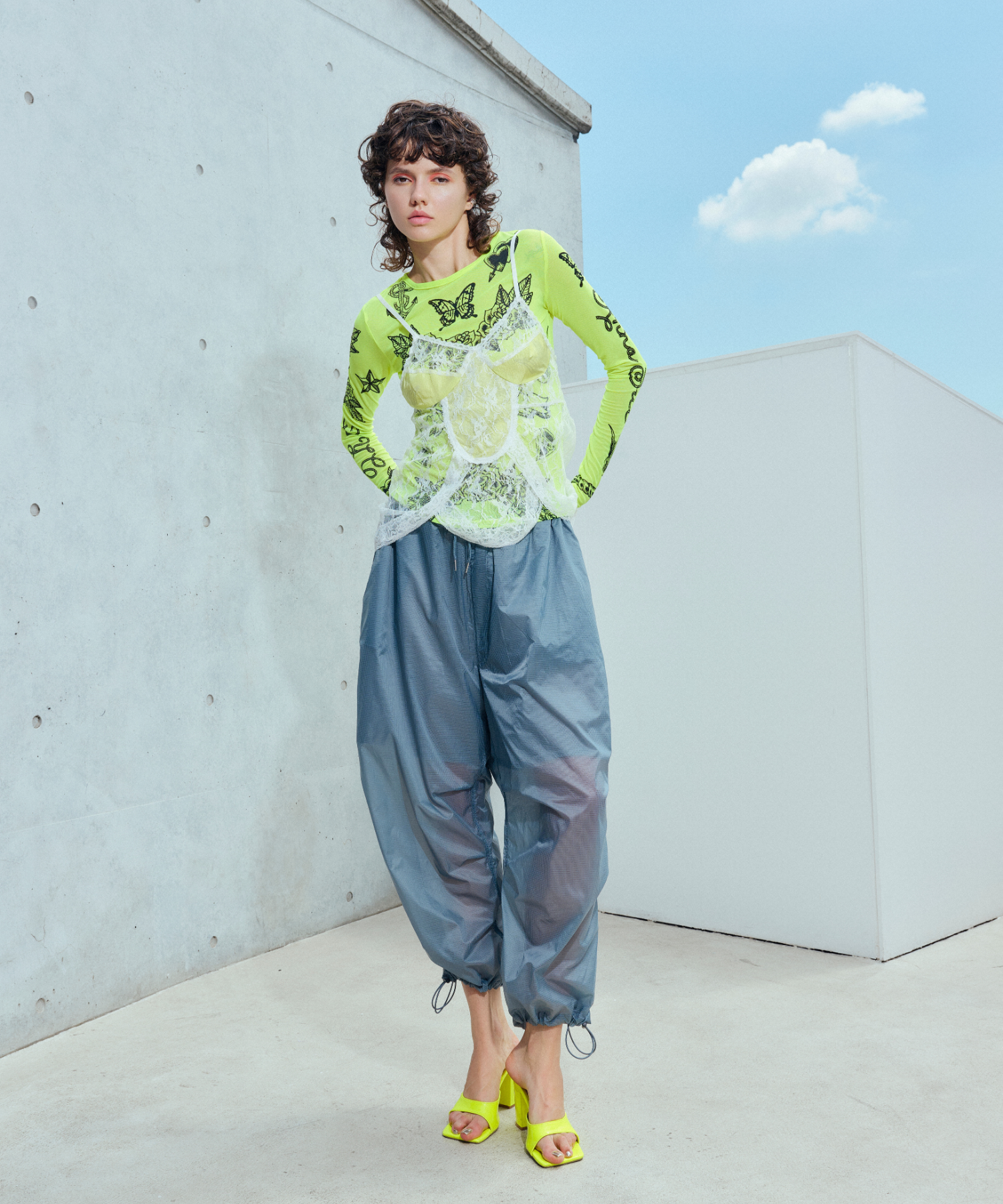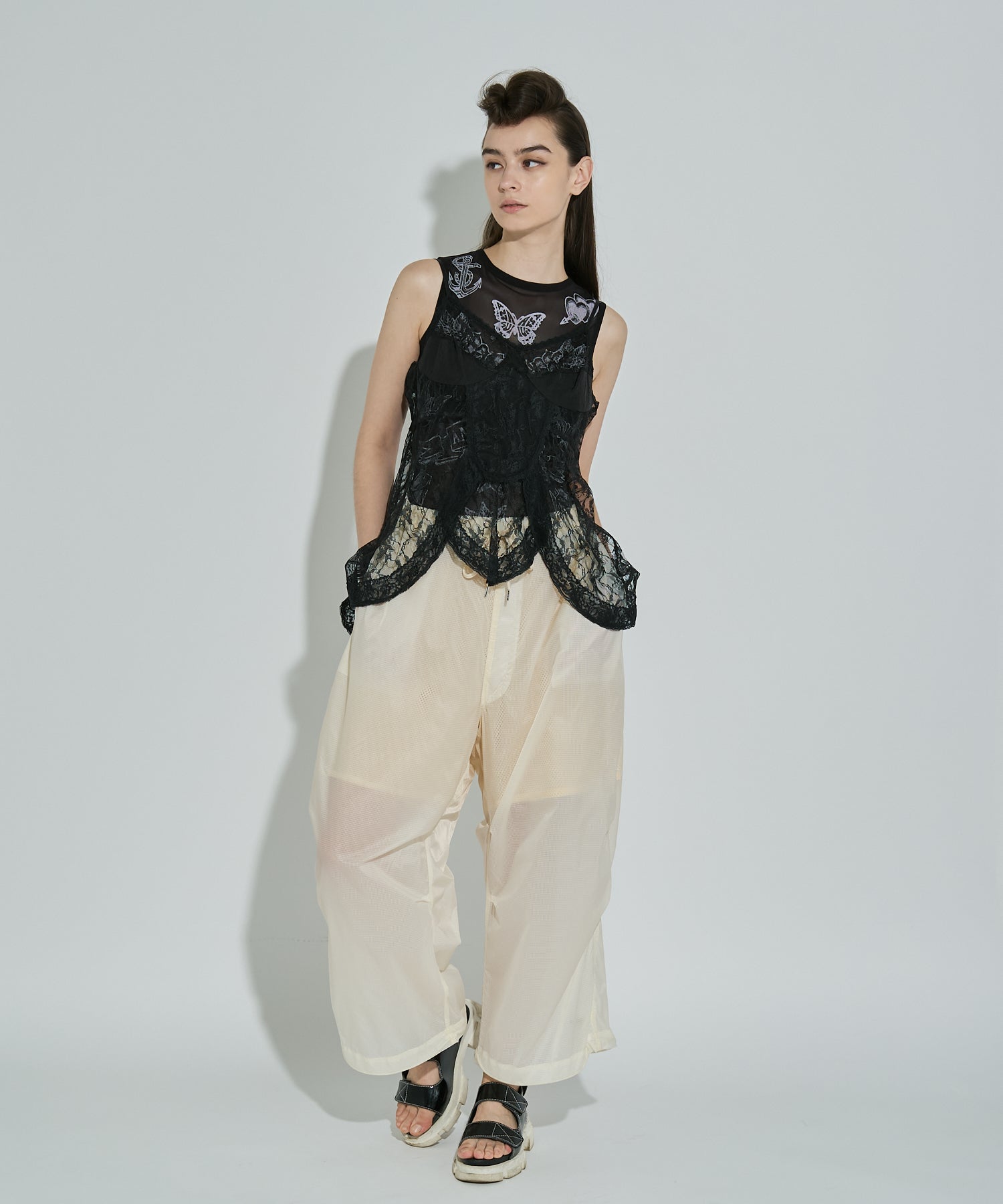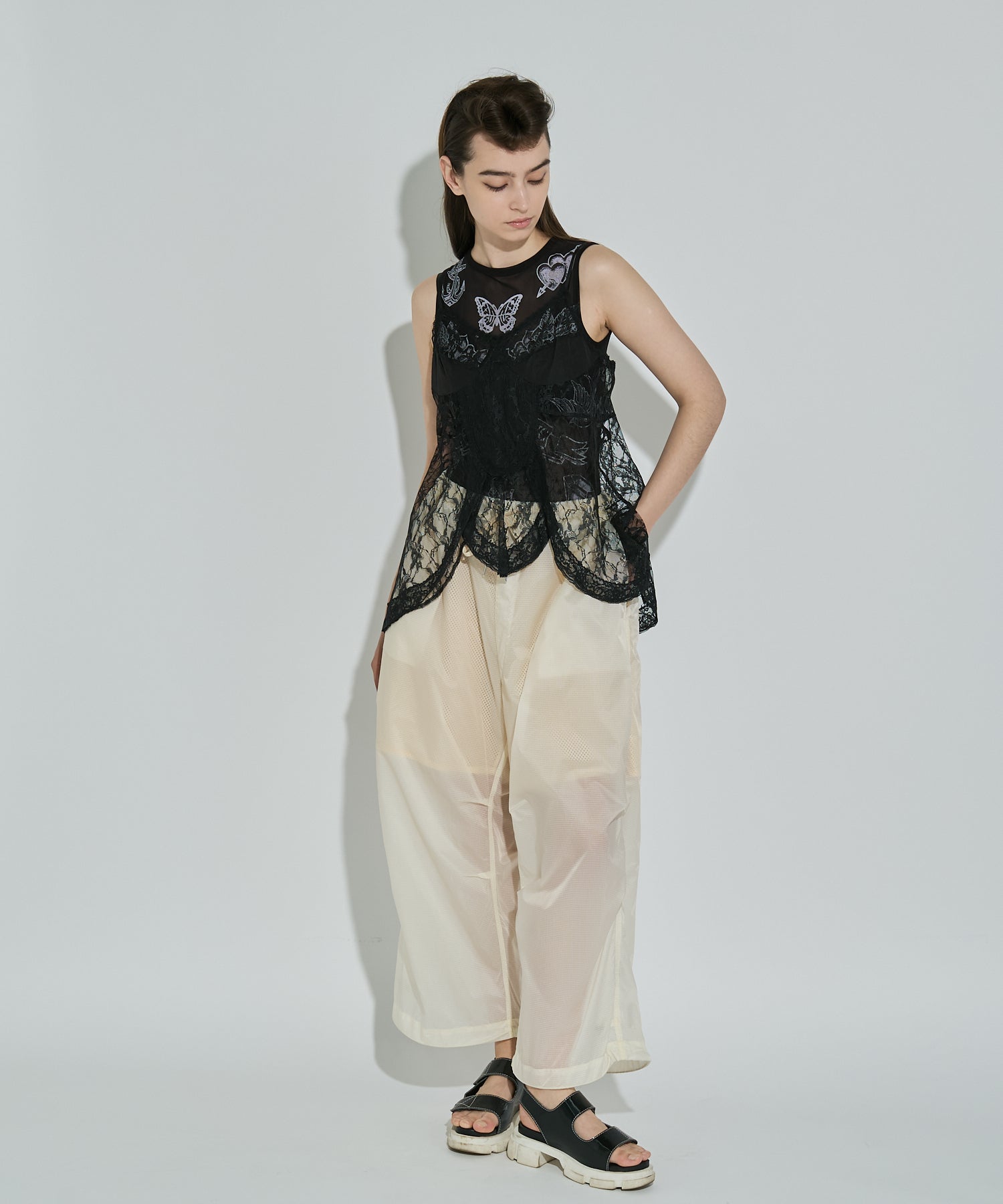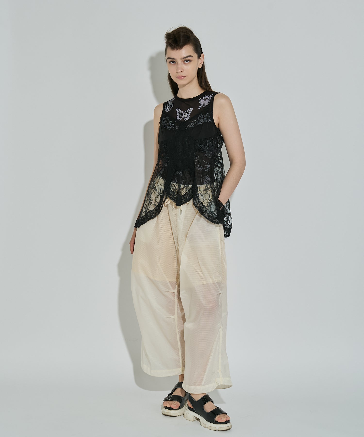 軽量で適度なハリ感と柔らかさを兼ね揃えたシアーリップストップ素材に、裏地は通気性の高いメッシュを採用。淡色は少し透けますが、ワイドなシルエットのおかげで中にぺチパンツなどを仕込む余裕も。アクティブな素材感ながら、シアーならではのエアリーな表情が、ヘルシーで女性らしいバランスを演出します。