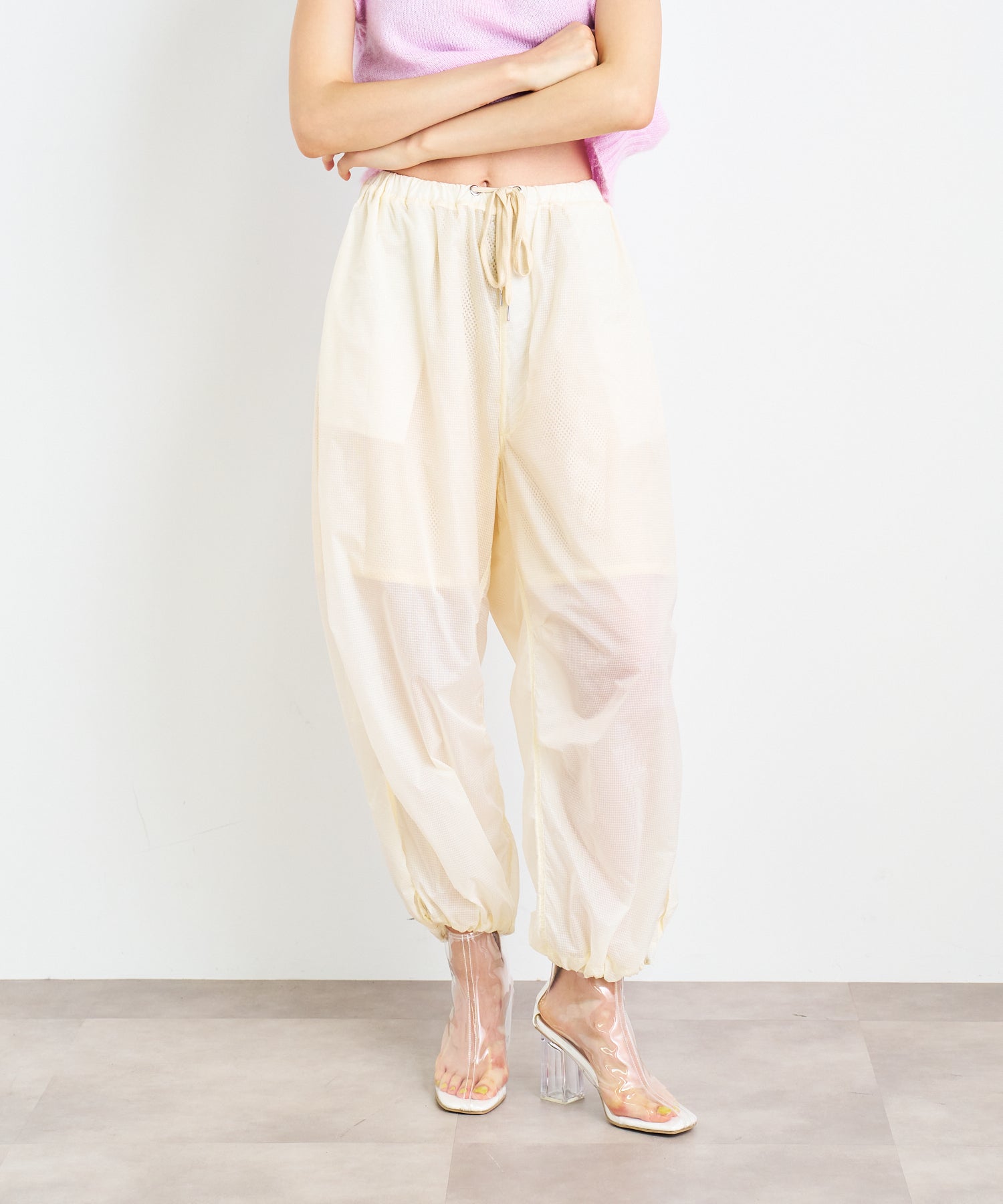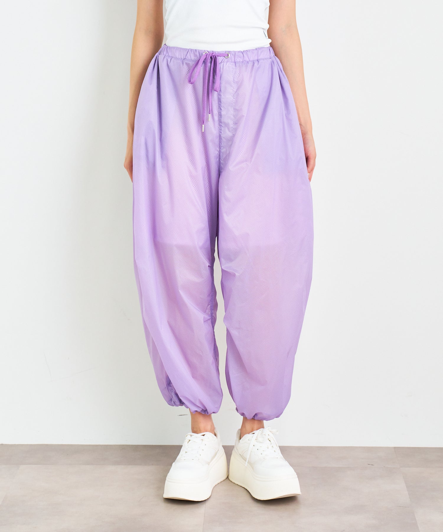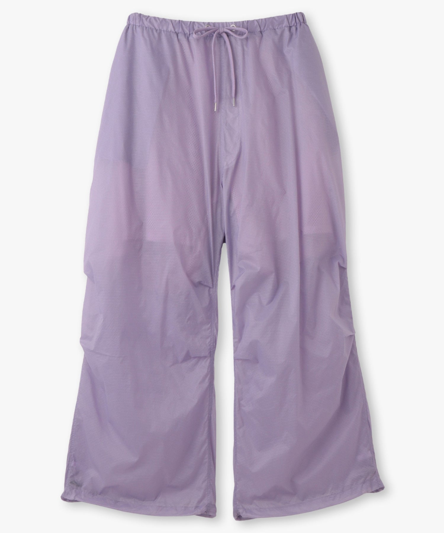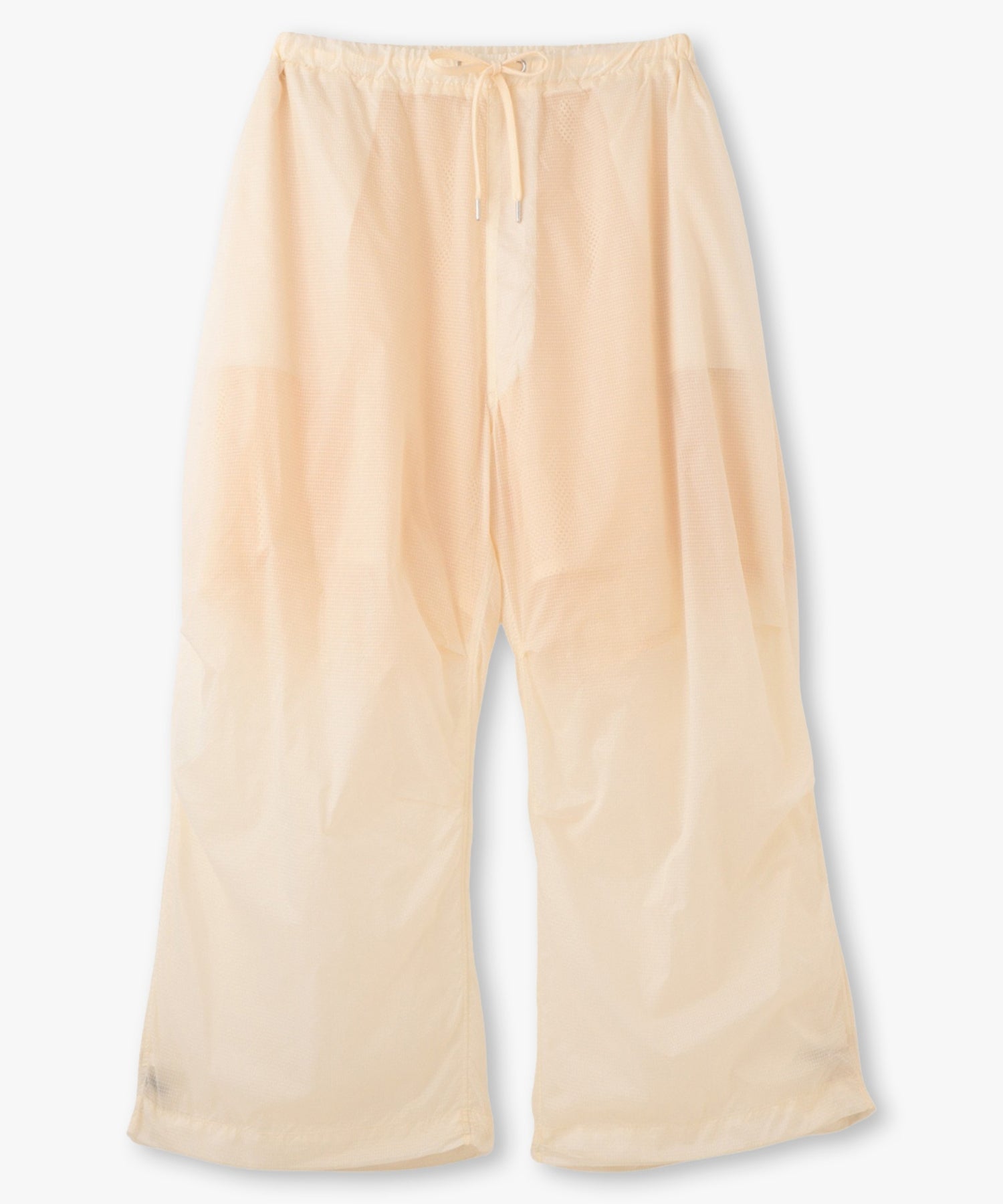 軽やかな透け感のあるリップストップ素材を採用したアクティブパンツ。空気を含んだような柔らかなボリューム感とほどよく透けて見える裏地のメッシュ素材が、スタイリングに軽やかな抜け感をプラス。ワイドなシルエットに対して、裾はドローストリング仕様で、ギャザーを寄せるとシルエットの表情が一変。気分に合わせてフォルムをアレンジできるのもポイントです。気温の高い季節でも涼しげに履ける、シーズンムードたっぷりなアイテムです。