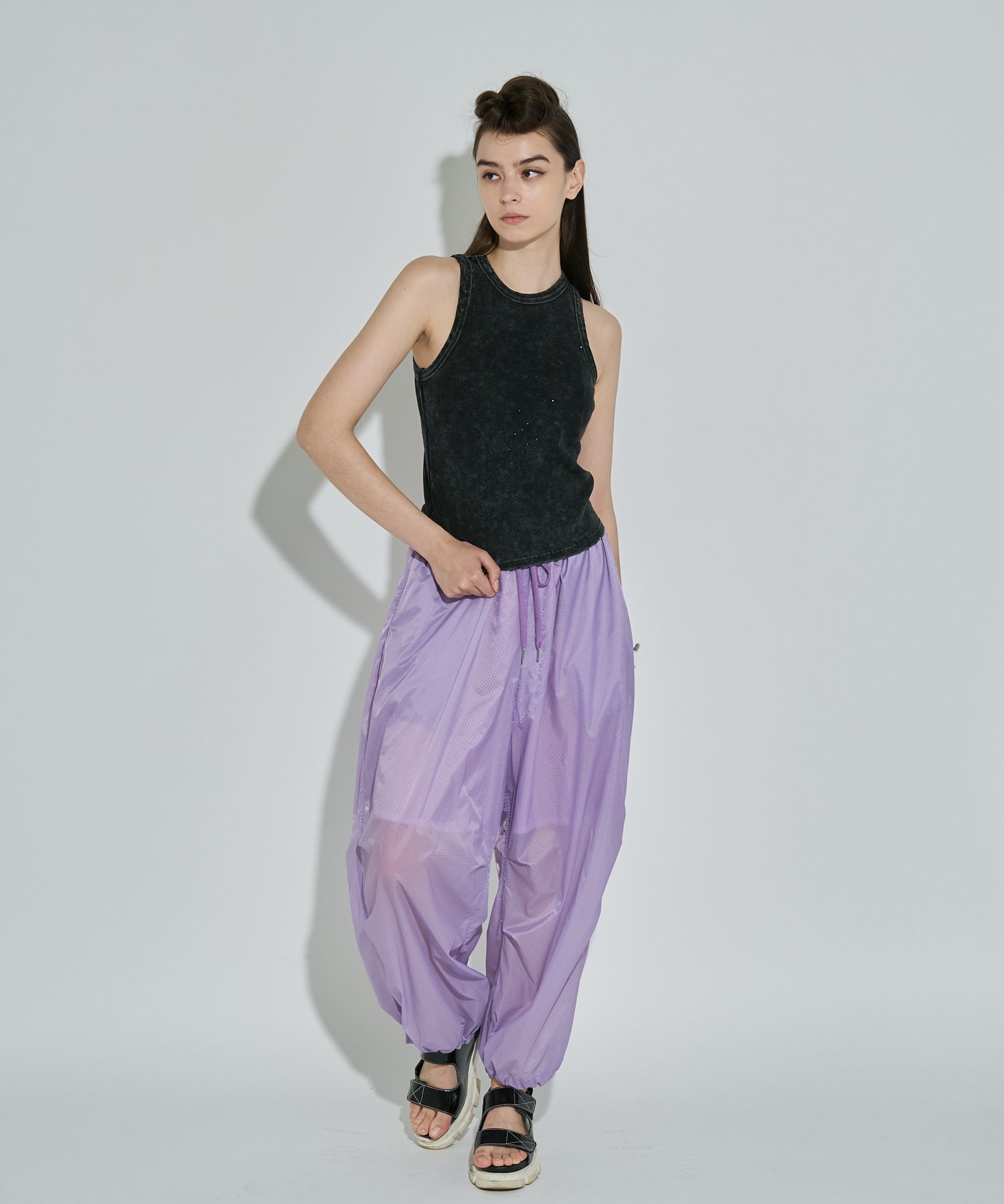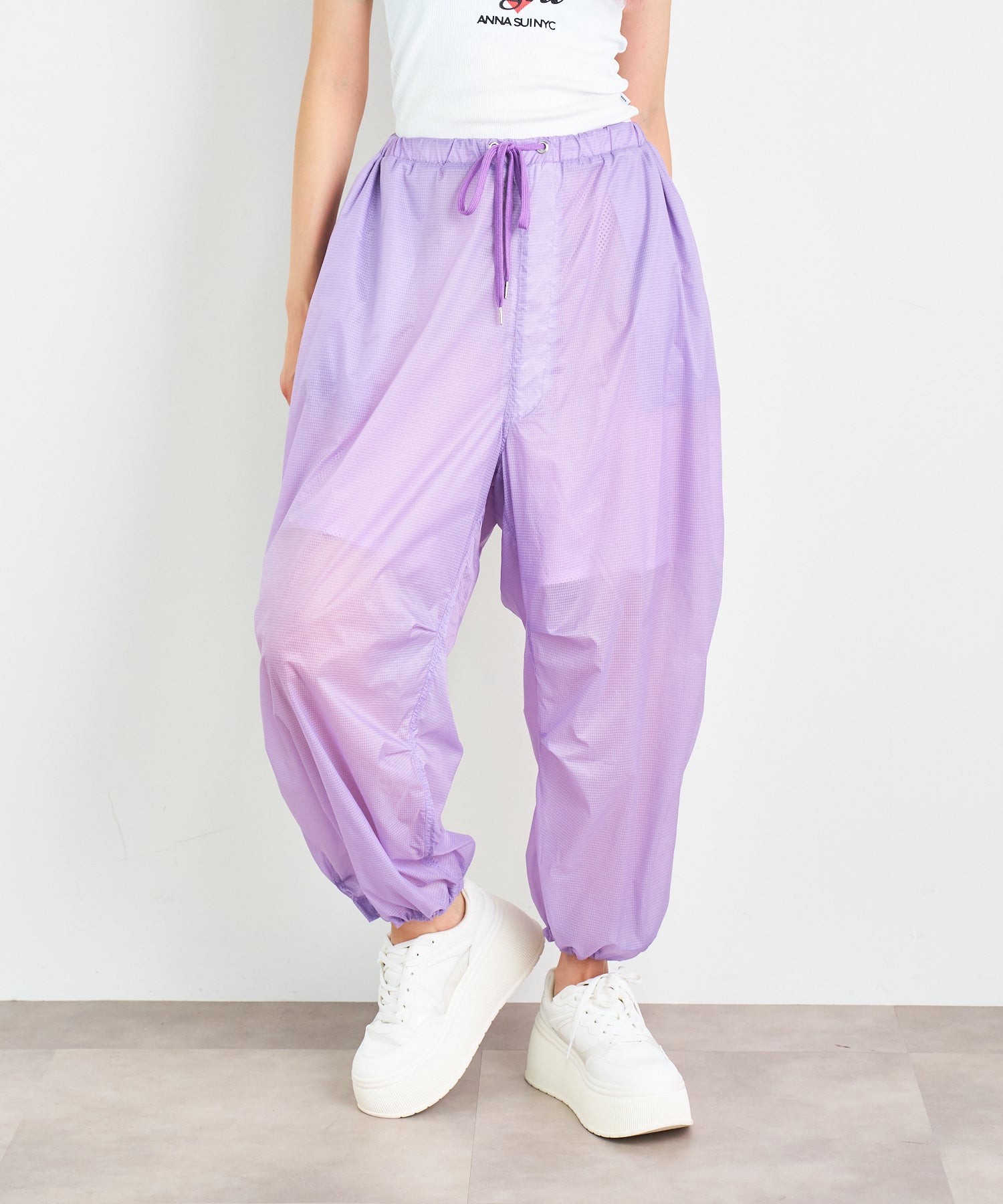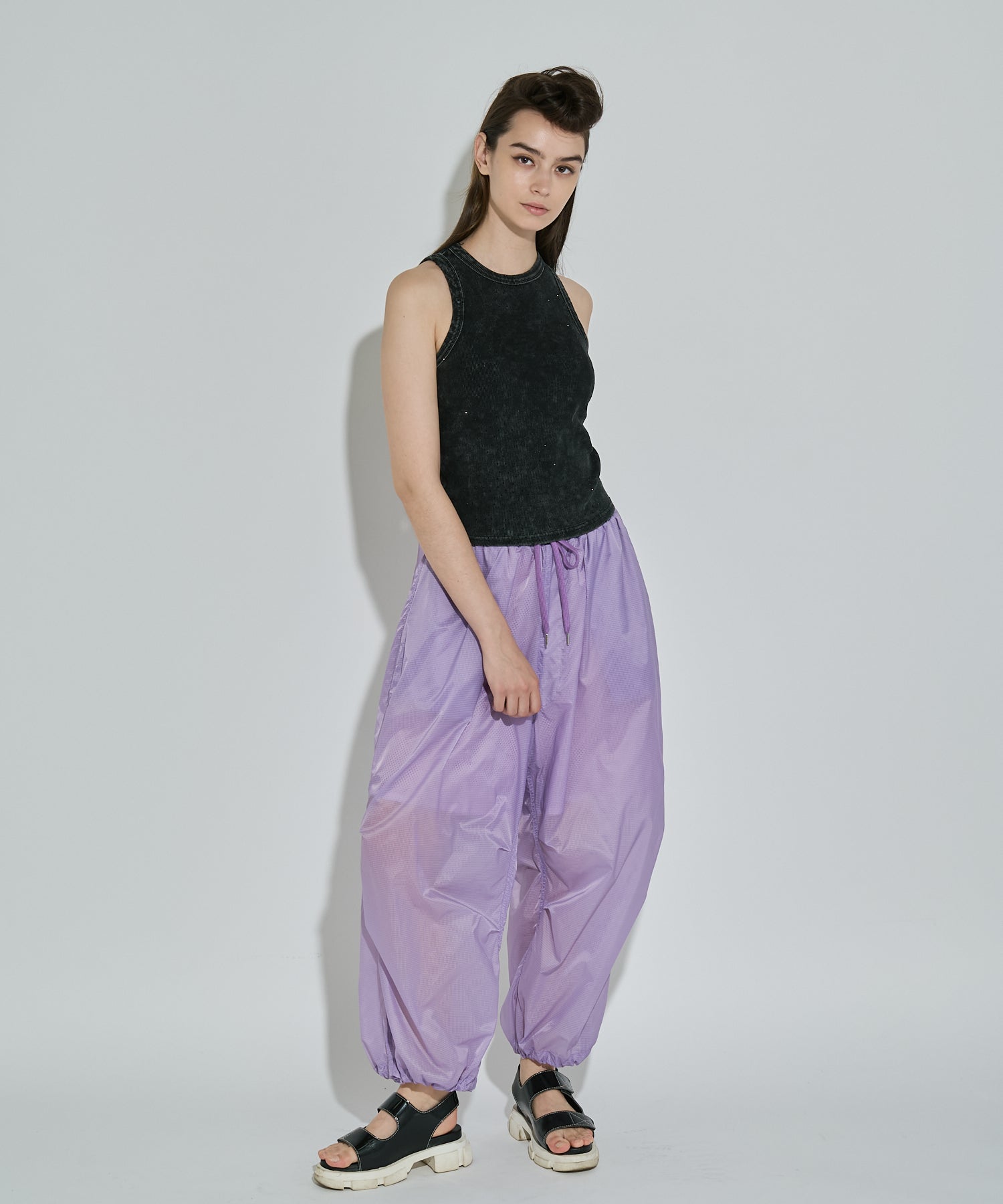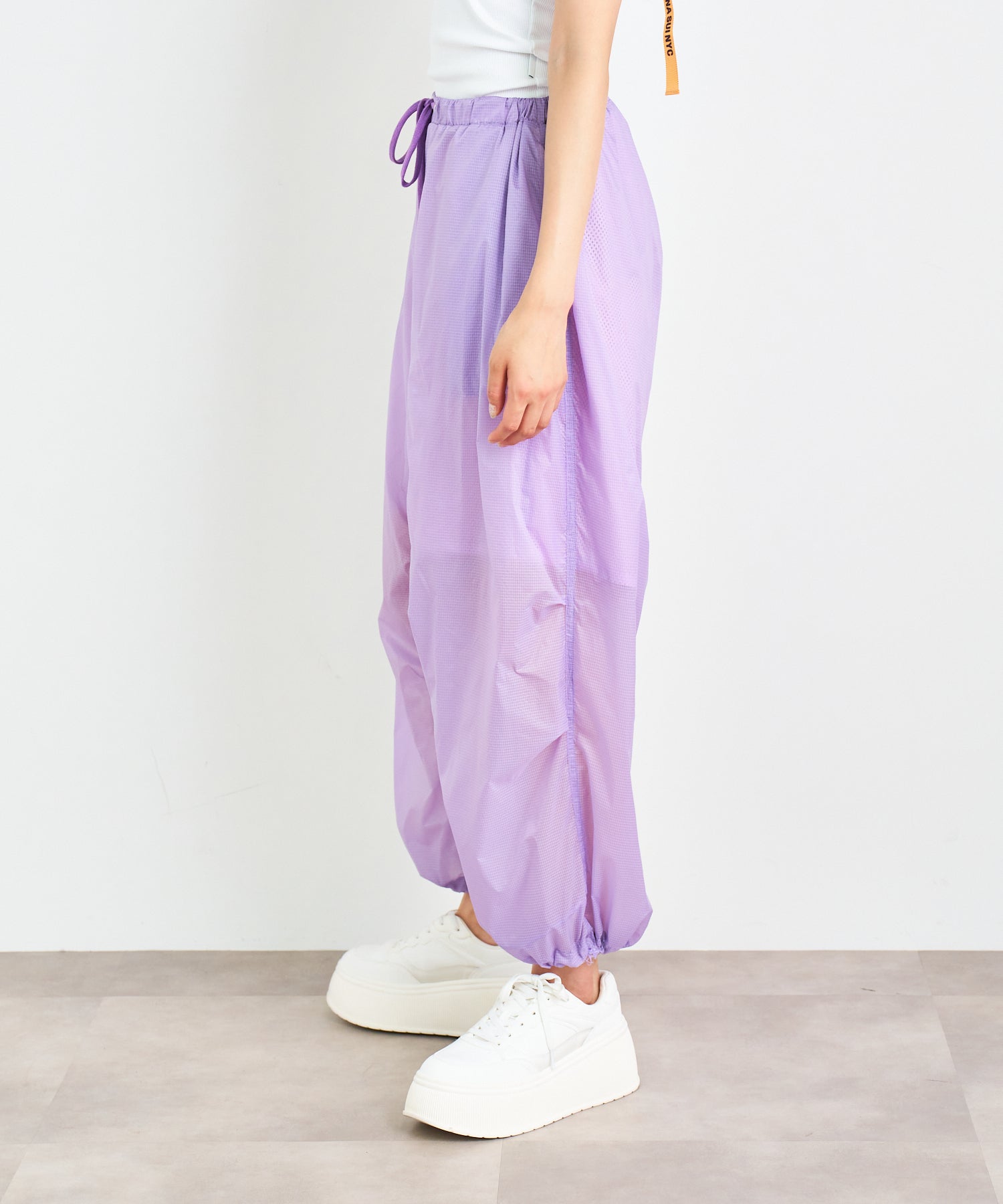 軽やかな透け感のあるリップストップ素材を採用したアクティブパンツ。空気を含んだような柔らかなボリューム感とほどよく透けて見える裏地のメッシュ素材が、スタイリングに軽やかな抜け感をプラス。ワイドなシルエットに対して、裾はドローストリング仕様で、ギャザーを寄せるとシルエットの表情が一変。気分に合わせてフォルムをアレンジできるのもポイントです。気温の高い季節でも涼しげに履ける、シーズンムードたっぷりなアイテムです。