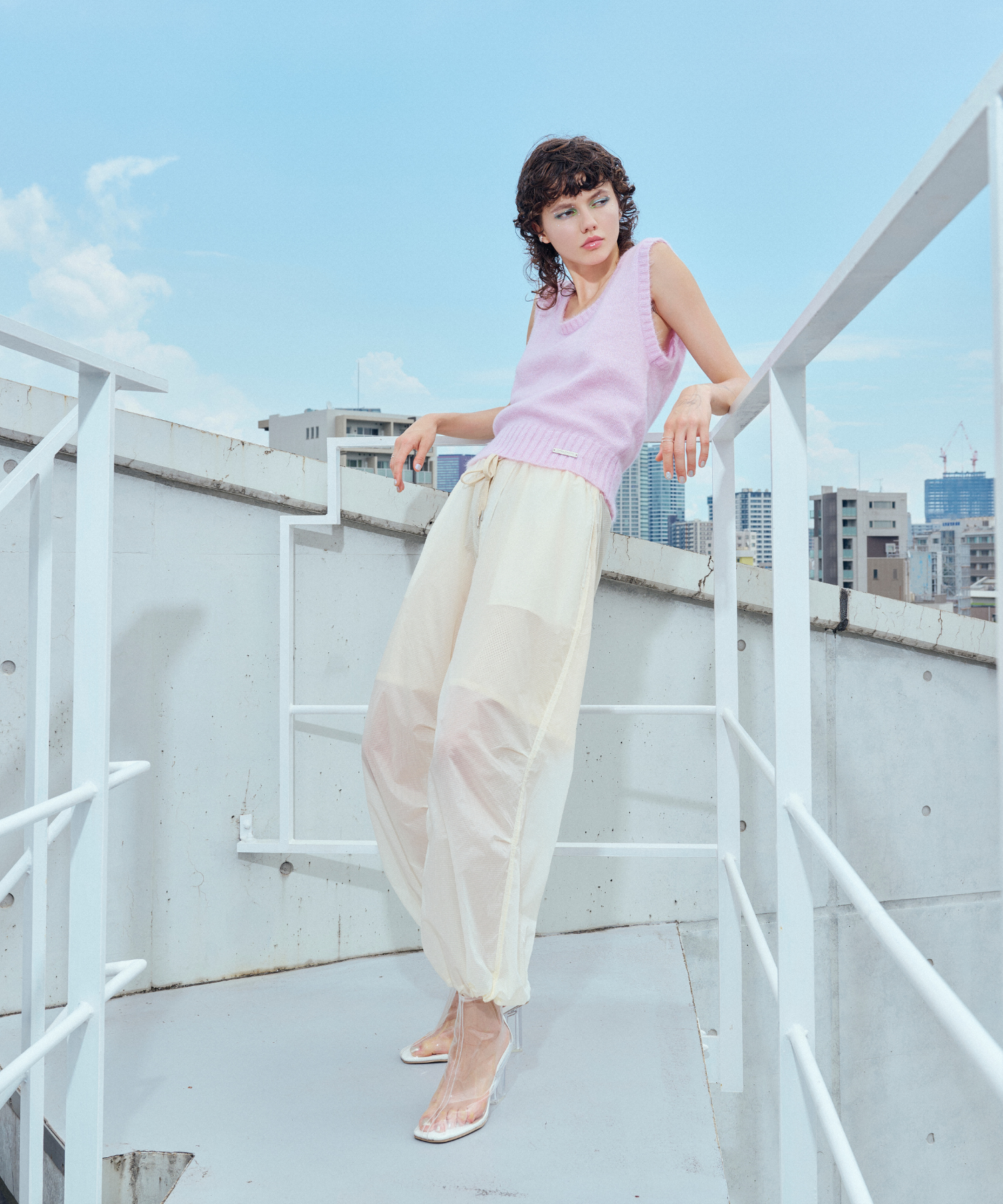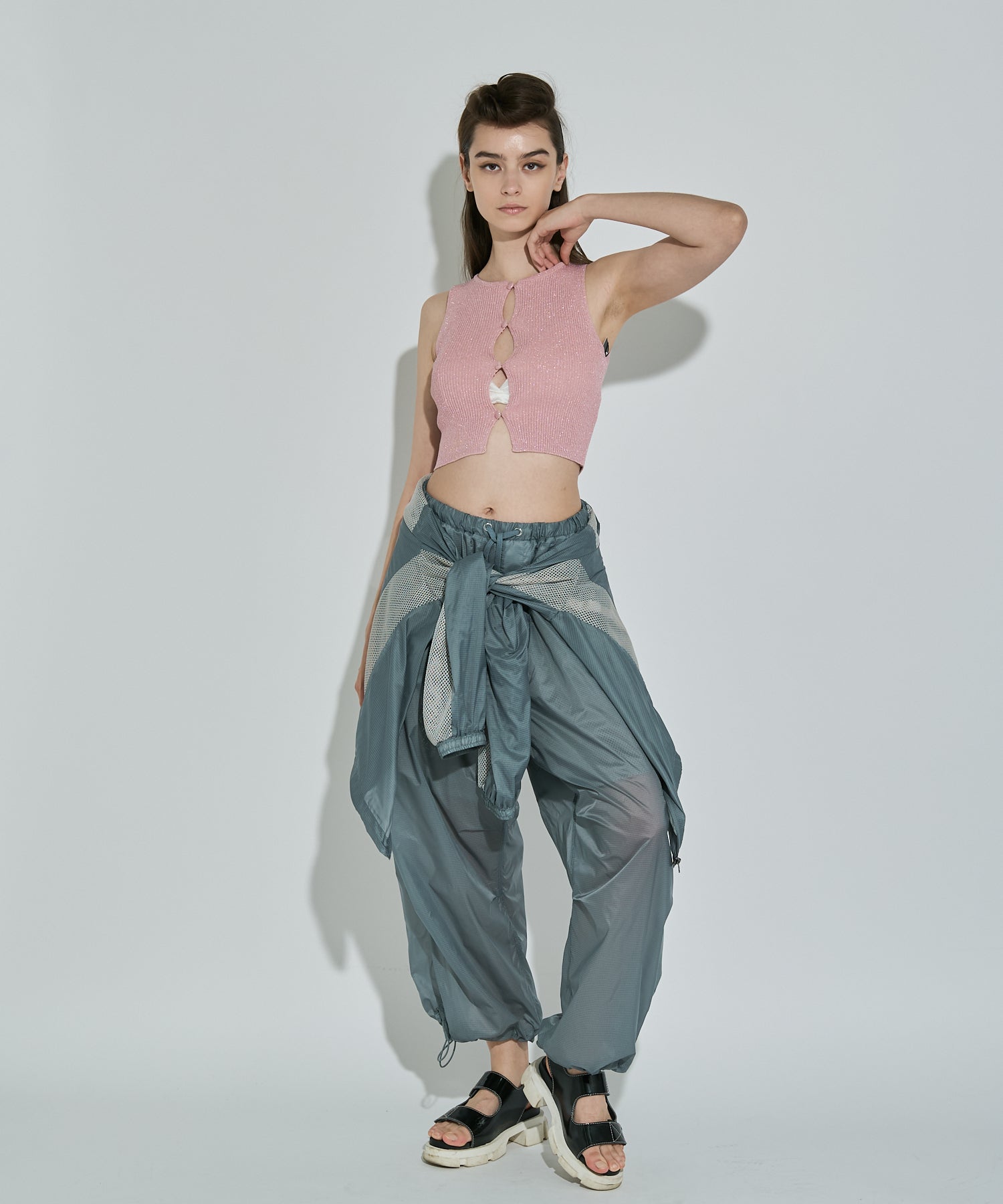 ボリュームのあるシルエットなので、コンパクトなTシャツやタンクトップと合わせたシンプルなスタイリングが最適。意外にもテイストは選ばないアイテムなので、フェミニンなビスチェ合わせや、ジャケットと合わせたテイストミックスな着こなしも楽しめます。同素材の“シアーリップアクティブジャケット”とのセットアップでの着用もおすすめ◎。