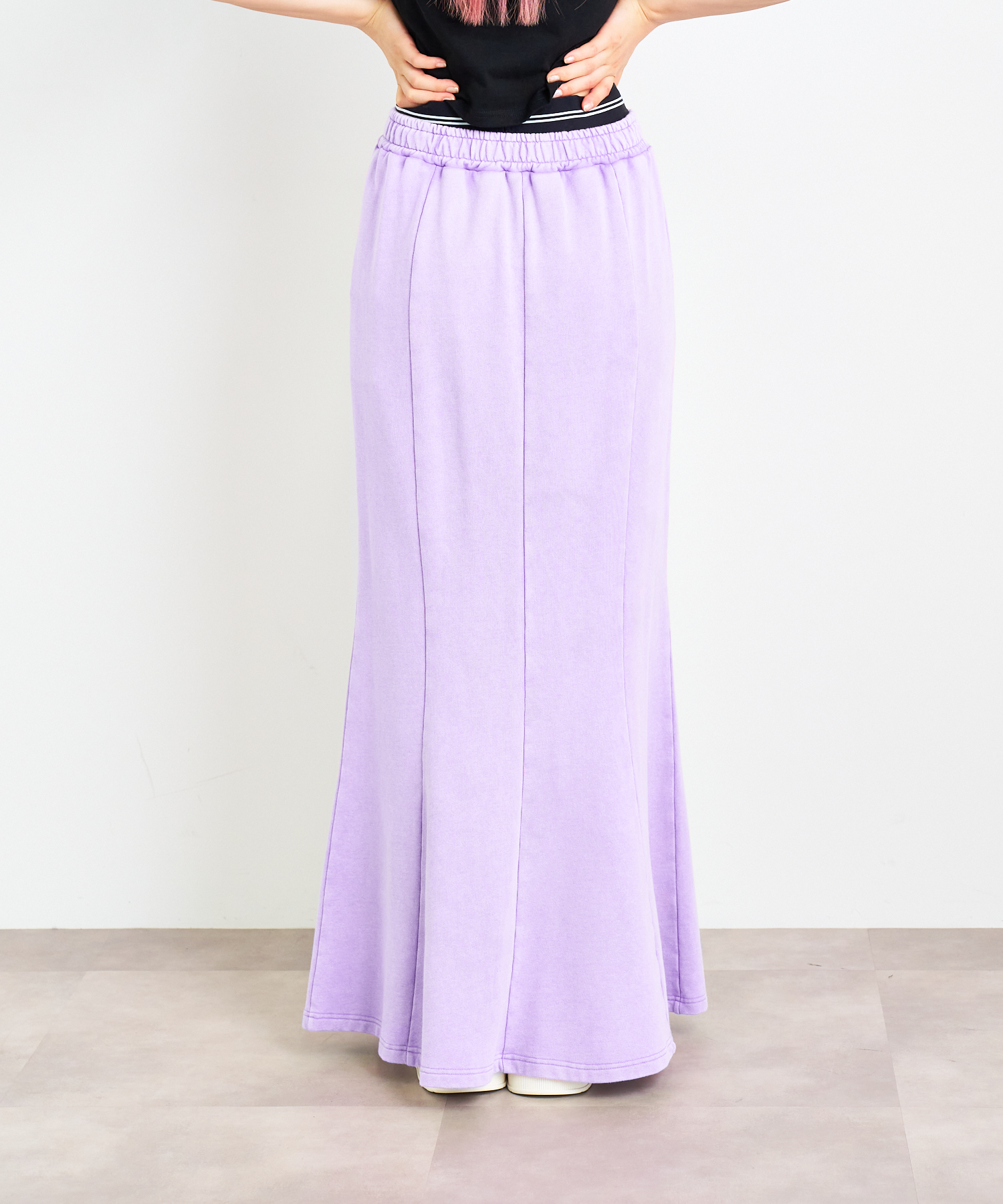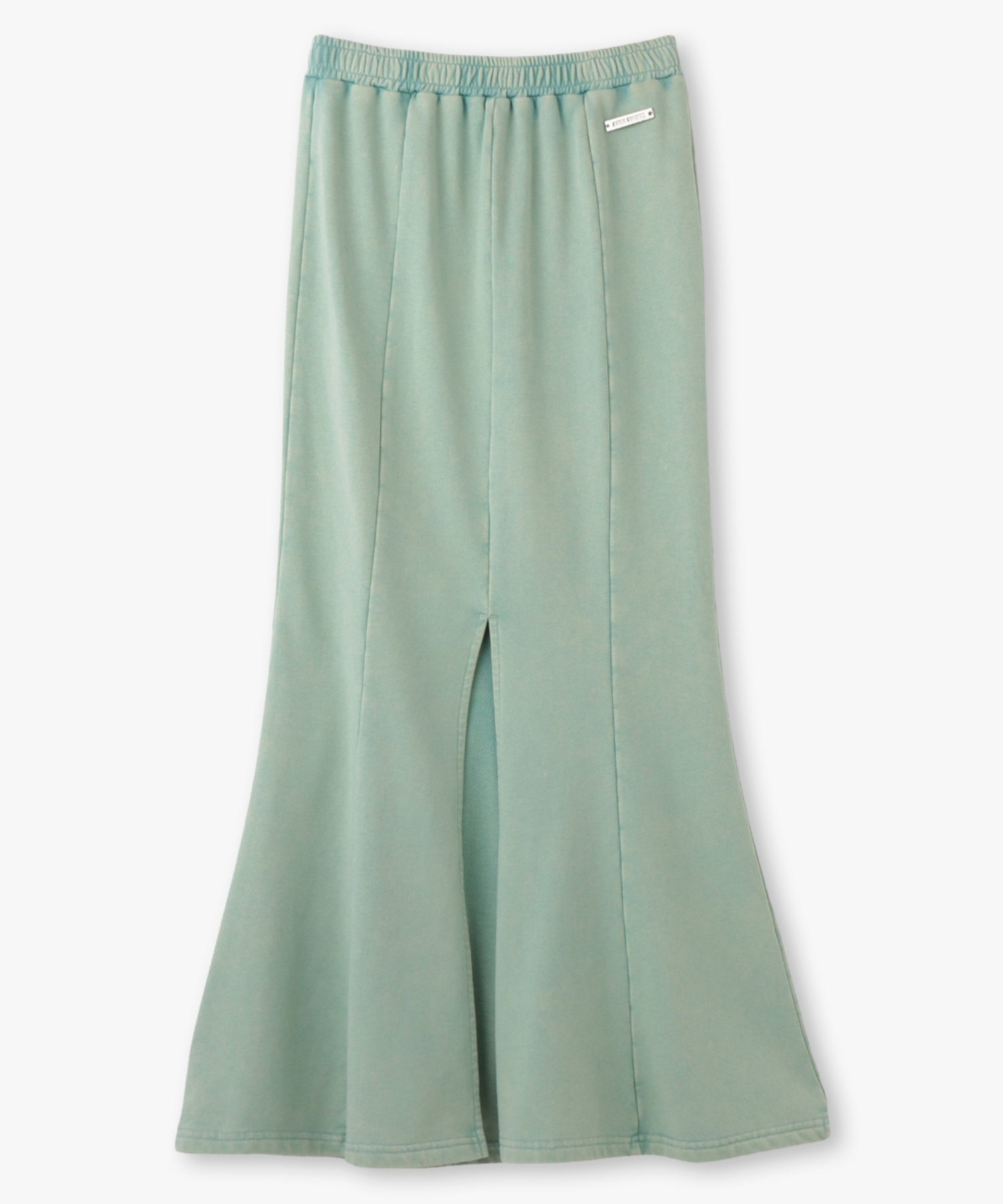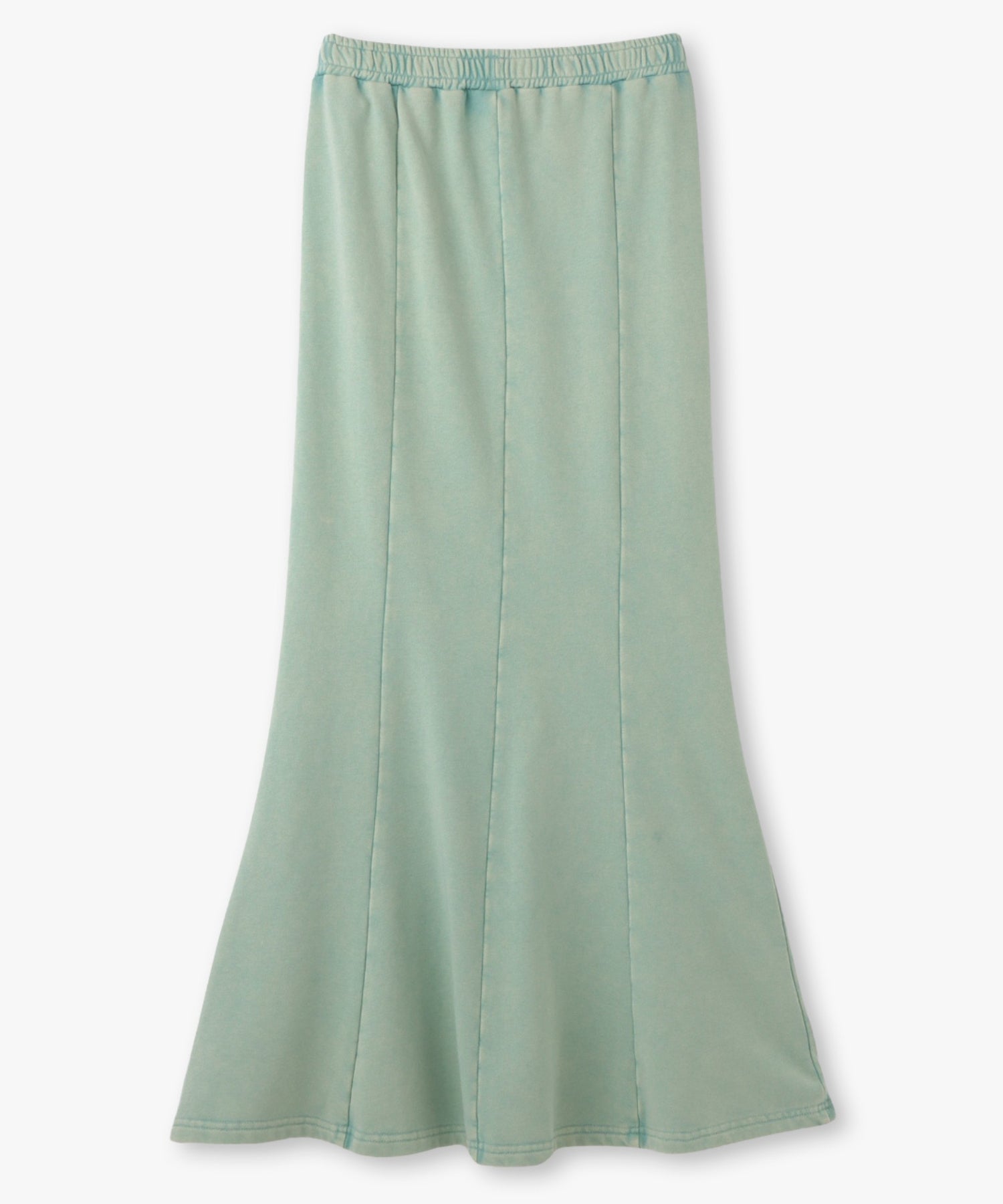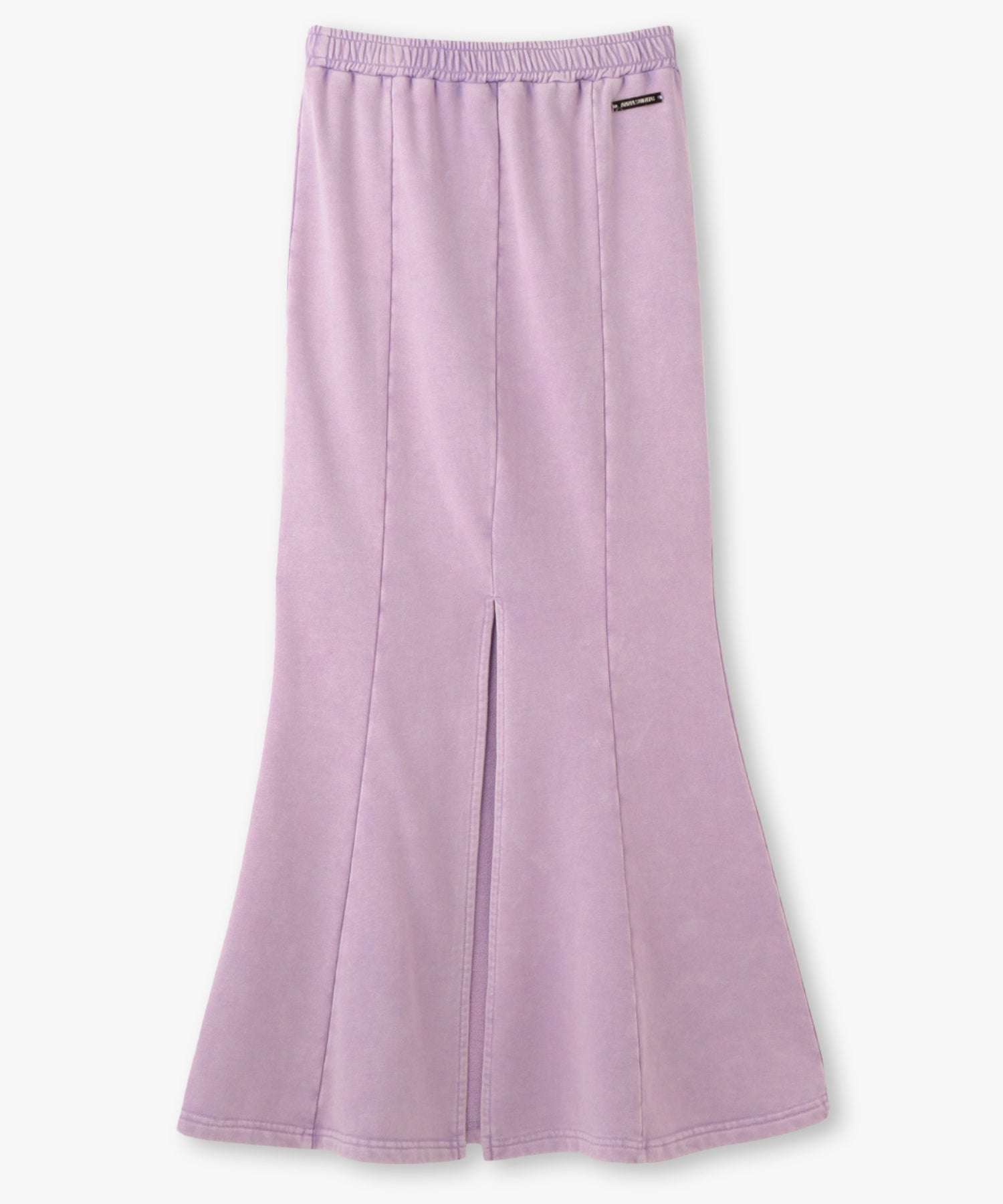 リラックスした雰囲気の中にも女性らしさが引き立つスウェット素材のマーメイドスカート。着古したような細かい色落ちや、加工ならではのアタリ感が表現できるパウダーブリーチ加工を採用し、トレンドのヴィンテージライクに仕上げました。フロントのスリットと切り替えのパネルラインがスタイルアップを叶えてくれます。