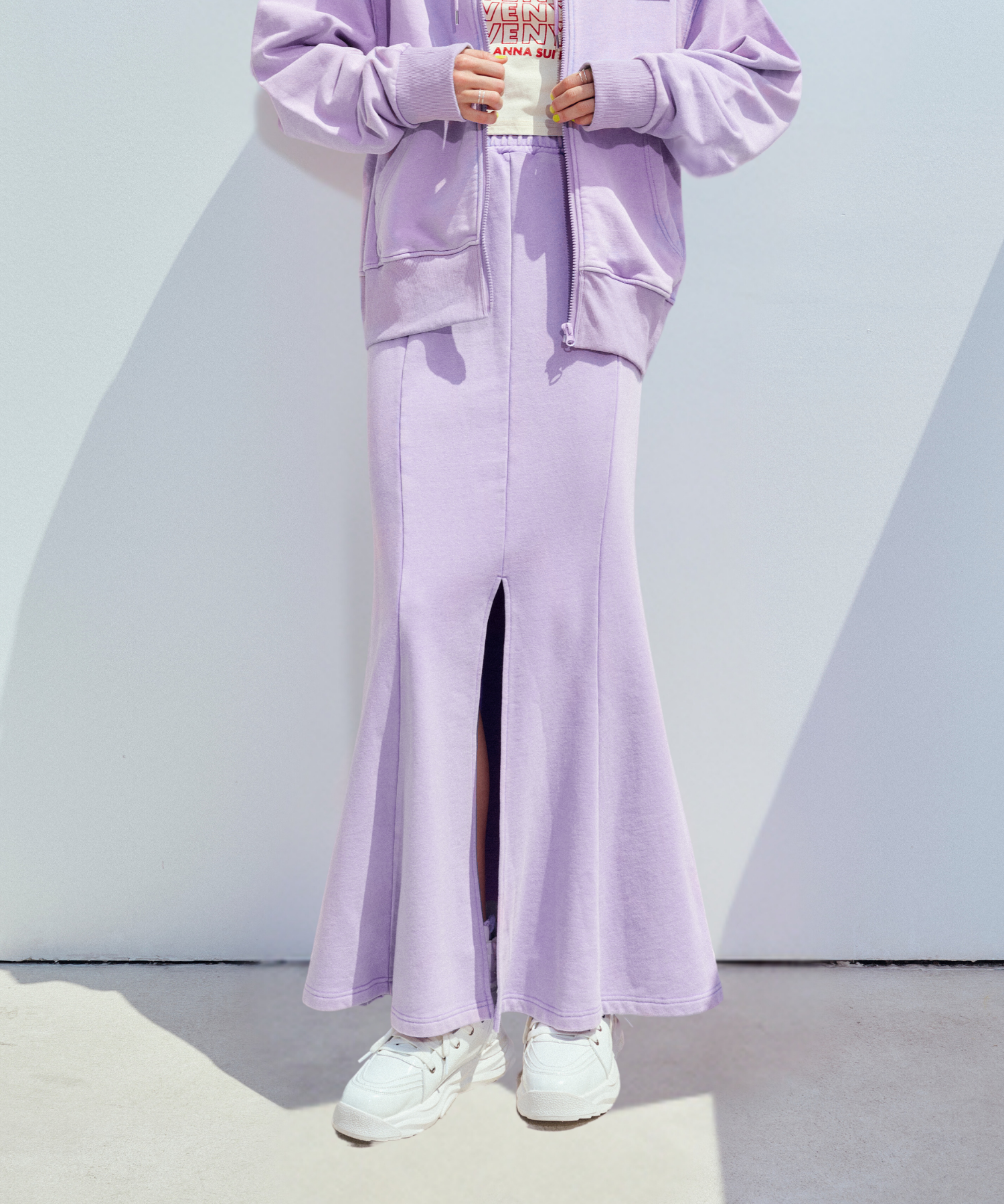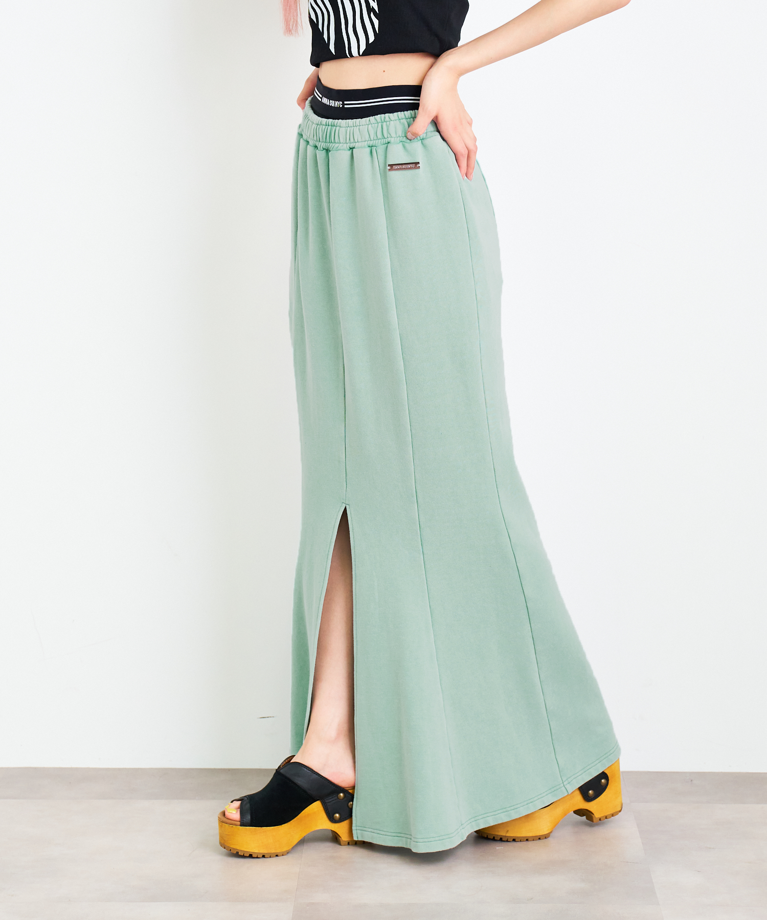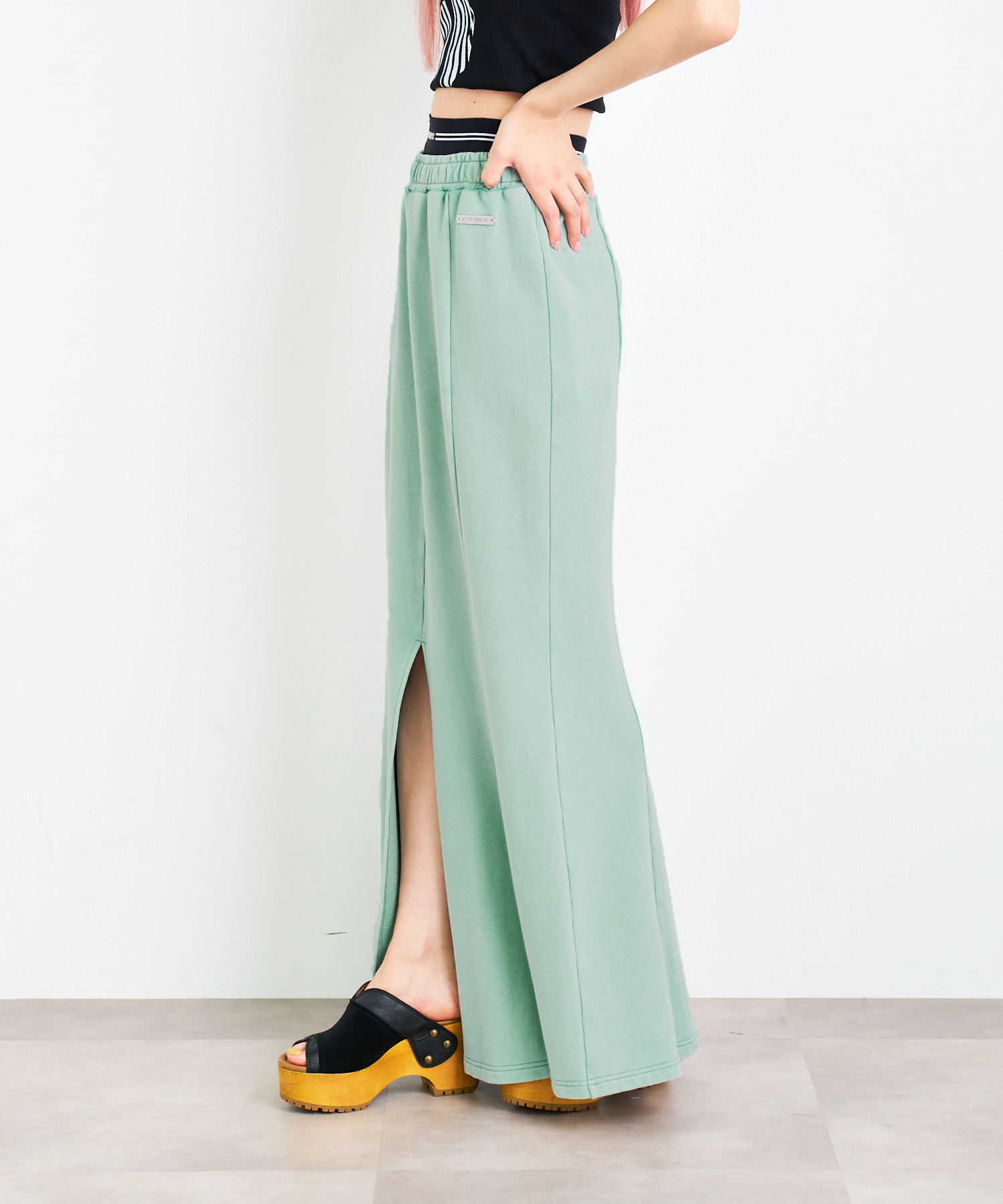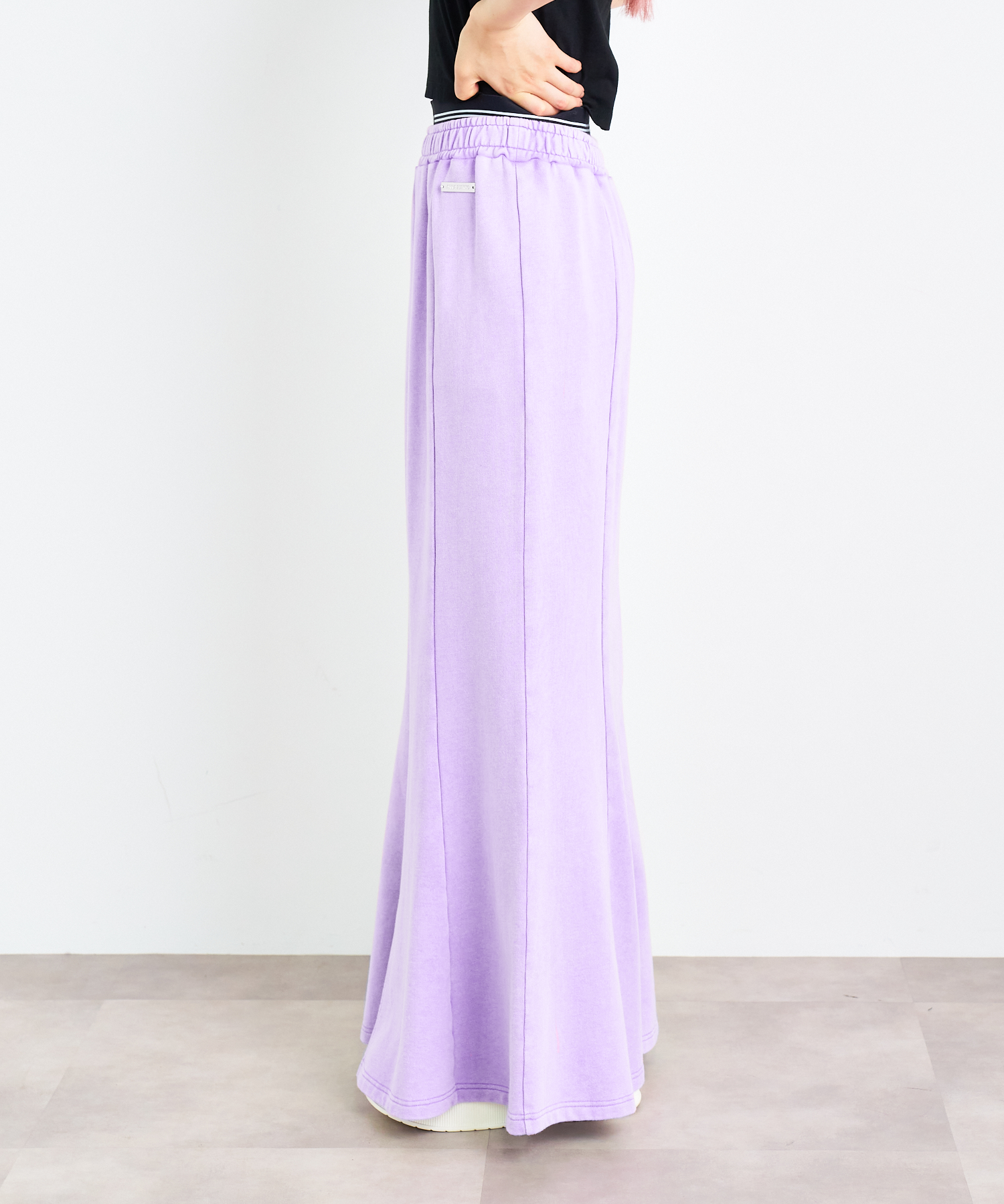 リラックスした雰囲気の中にも女性らしさが引き立つスウェット素材のマーメイドスカート。着古したような細かい色落ちや、加工ならではのアタリ感が表現できるパウダーブリーチ加工を採用し、トレンドのヴィンテージライクに仕上げました。フロントのスリットと切り替えのパネルラインがスタイルアップを叶えてくれます。