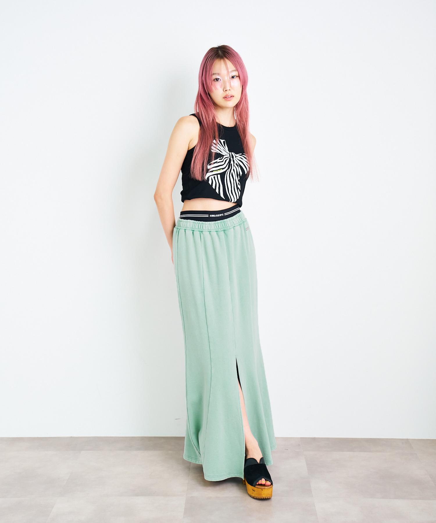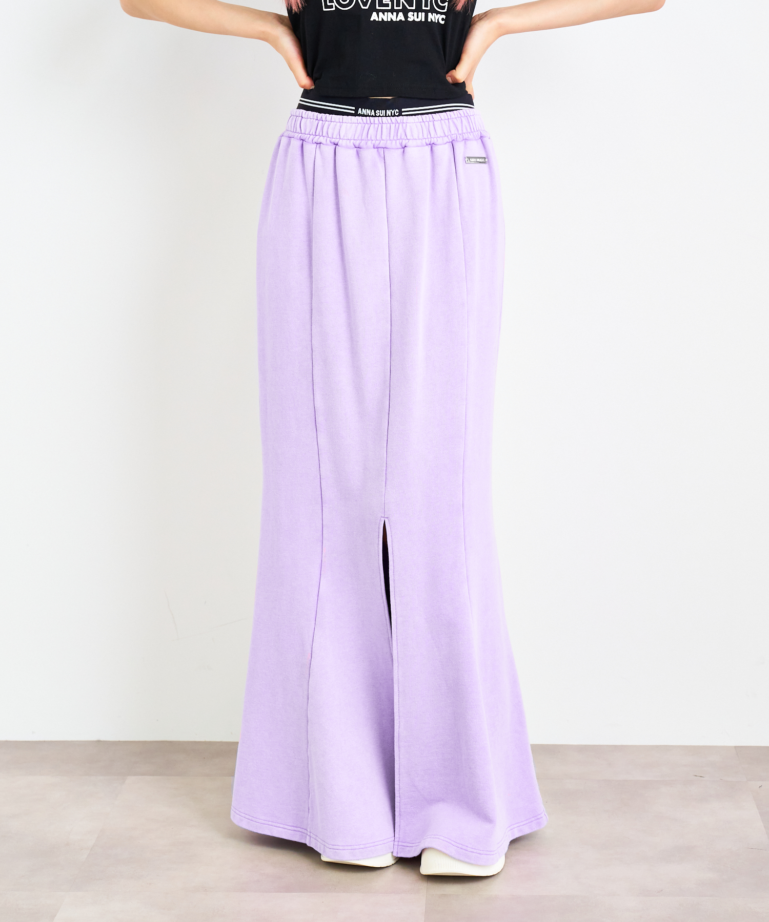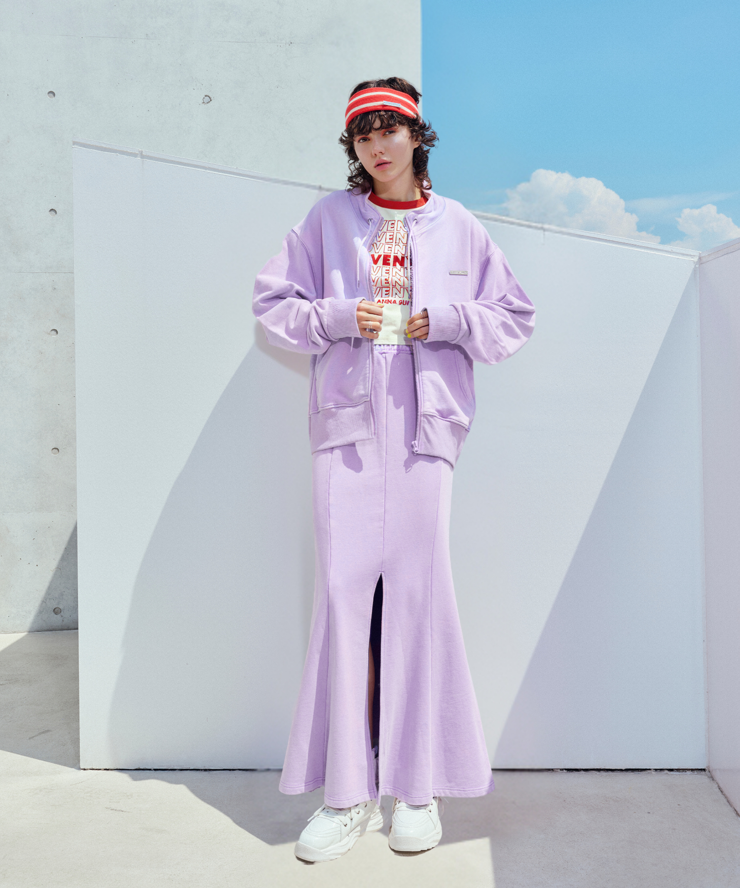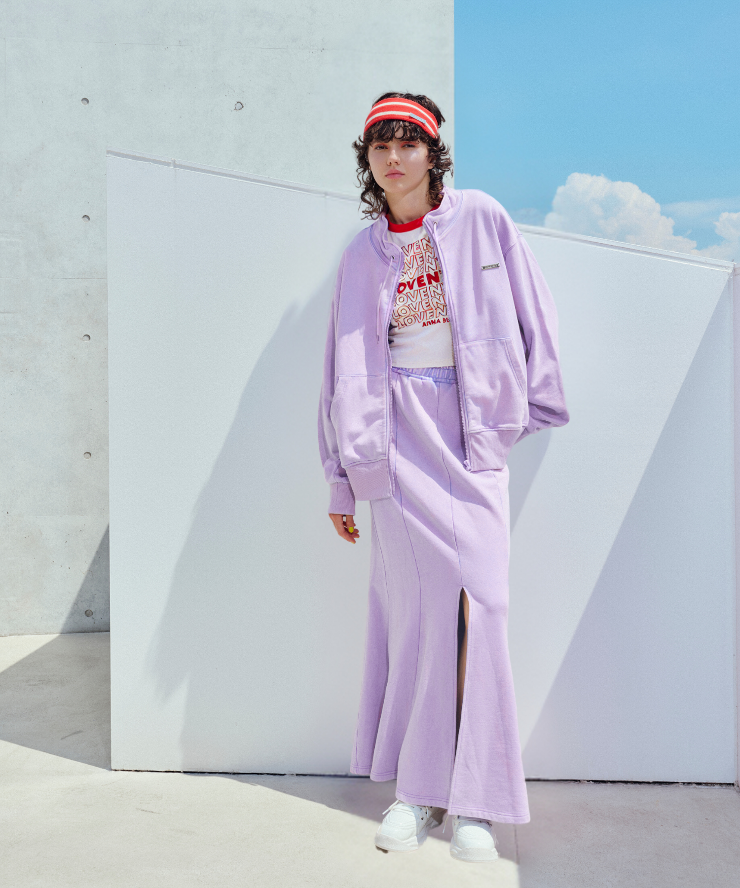 リラックスした雰囲気の中にも女性らしさが引き立つスウェット素材のマーメイドスカート。着古したような細かい色落ちや、加工ならではのアタリ感が表現できるパウダーブリーチ加工を採用し、トレンドのヴィンテージライクに仕上げました。フロントのスリットと切り替えのパネルラインがスタイルアップを叶えてくれます。