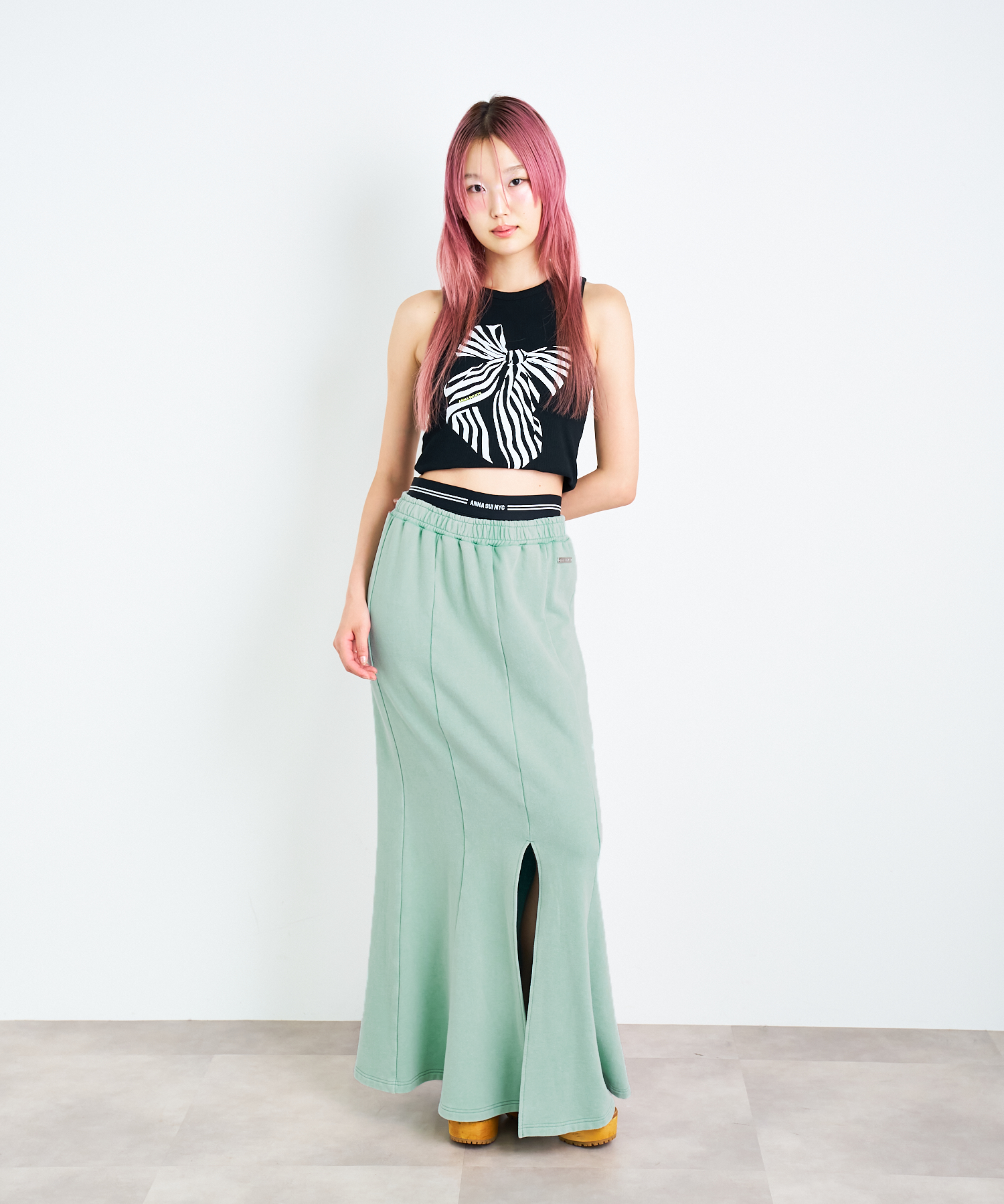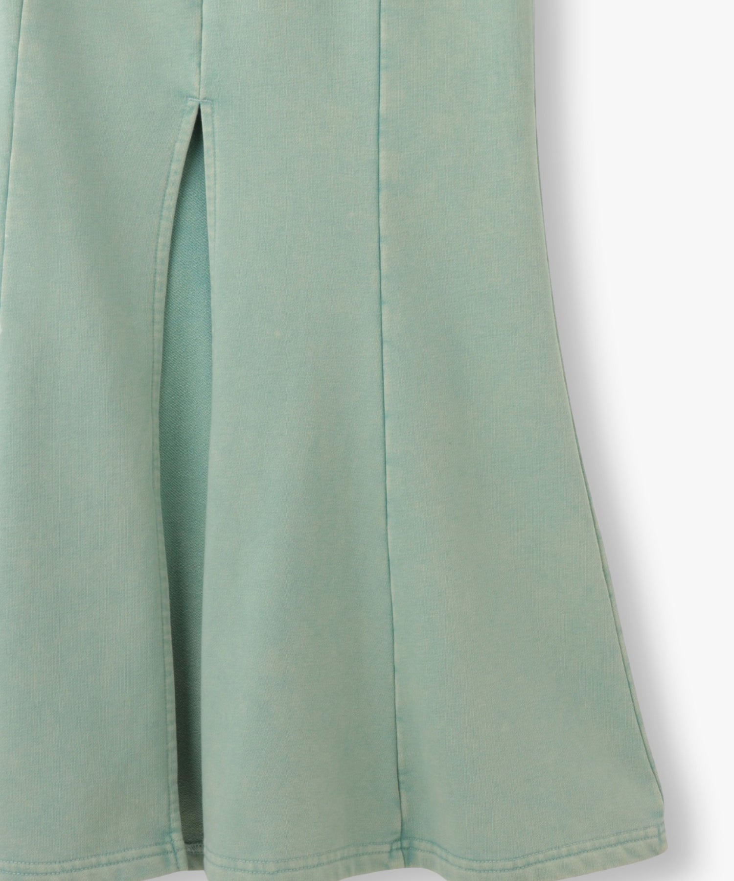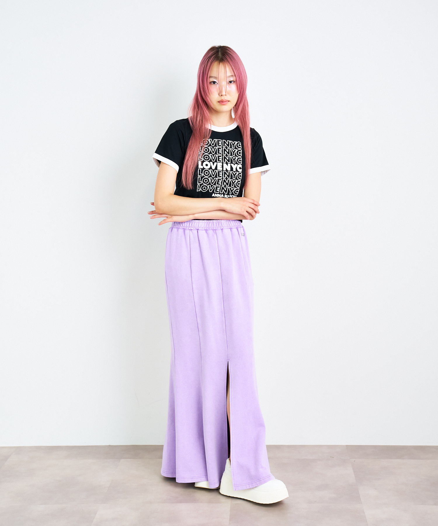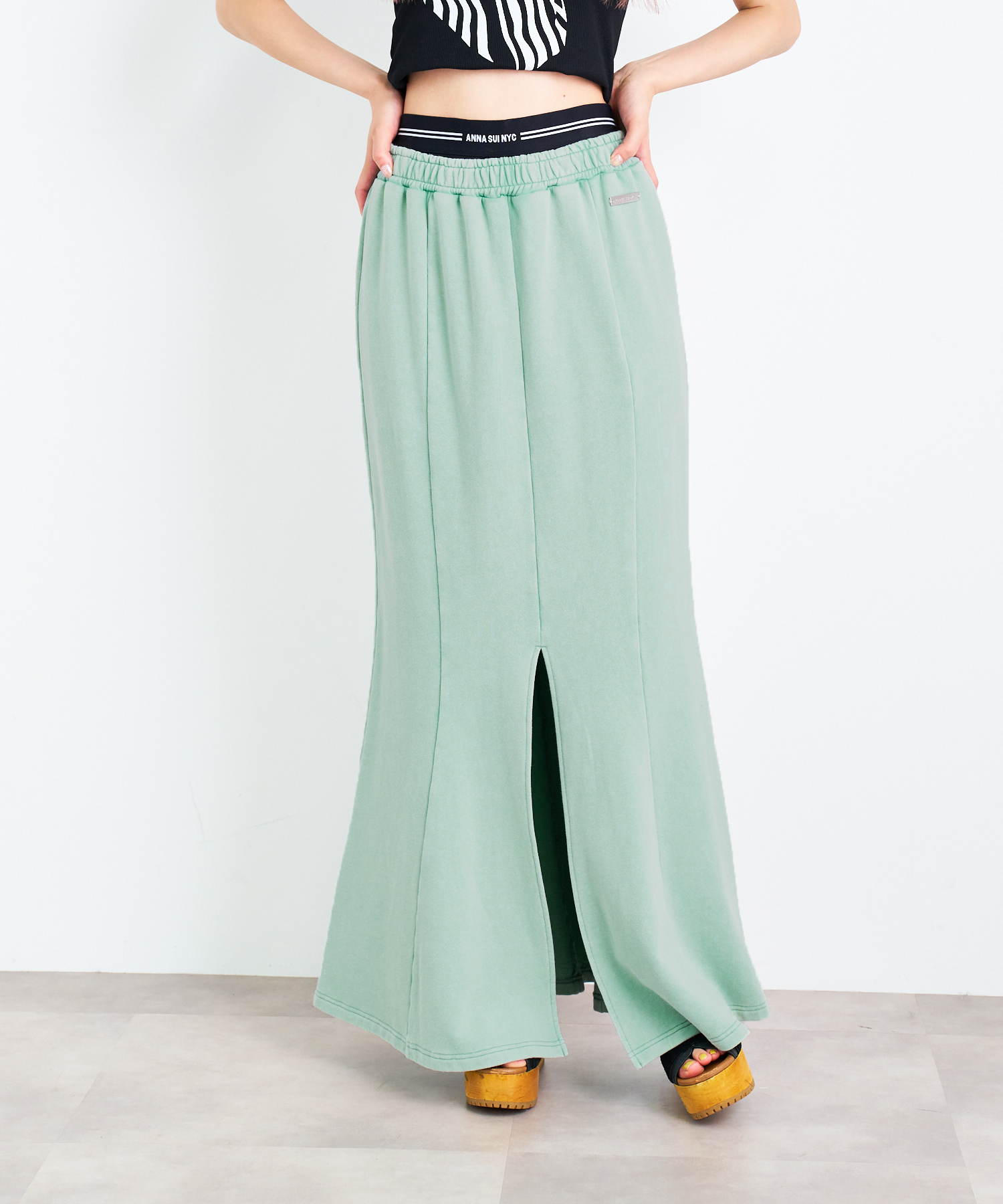 リラックスした雰囲気の中にも女性らしさが引き立つスウェット素材のマーメイドスカート。着古したような細かい色落ちや、加工ならではのアタリ感が表現できるパウダーブリーチ加工を採用し、トレンドのヴィンテージライクに仕上げました。フロントのスリットと切り替えのパネルラインがスタイルアップを叶えてくれます。