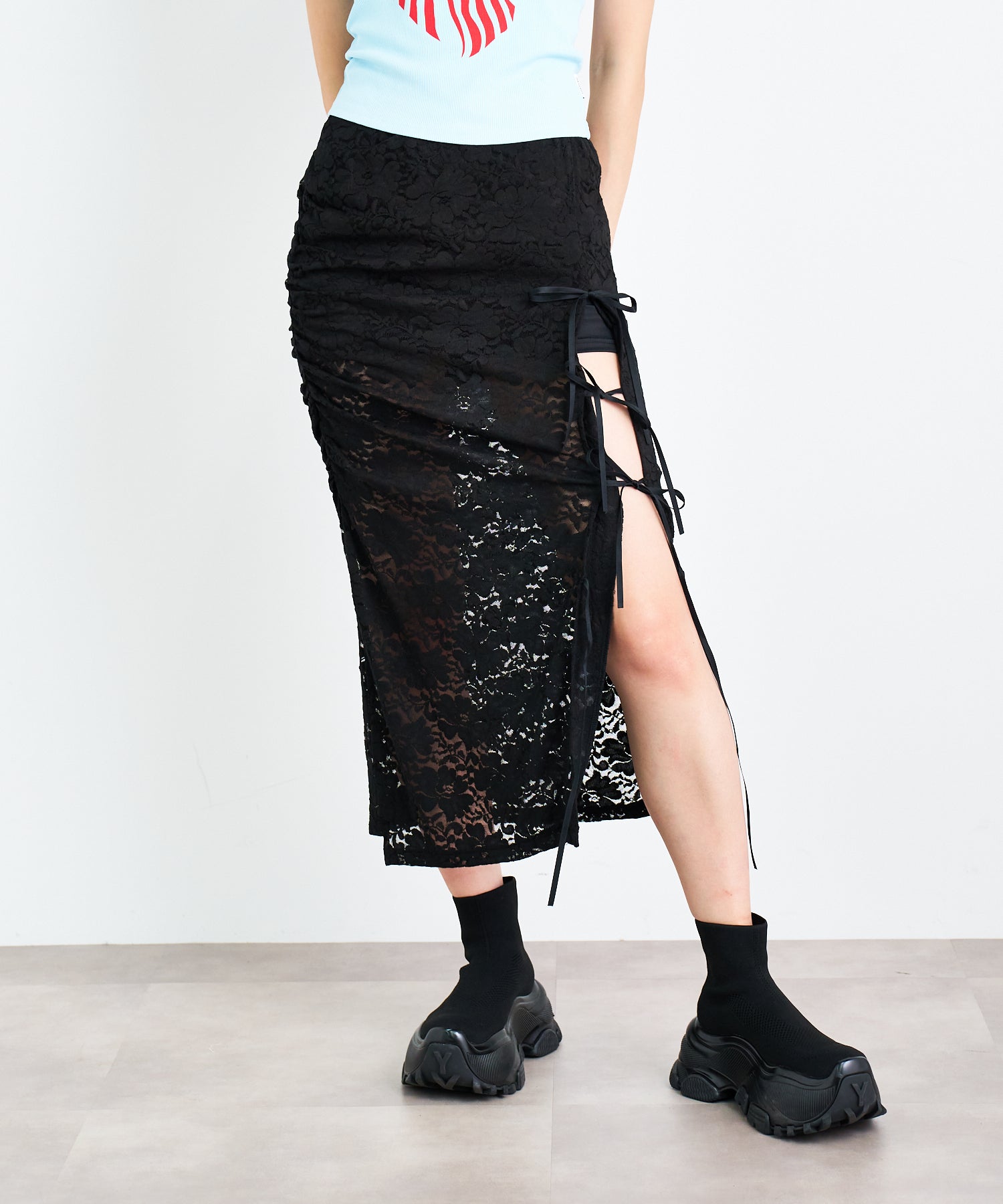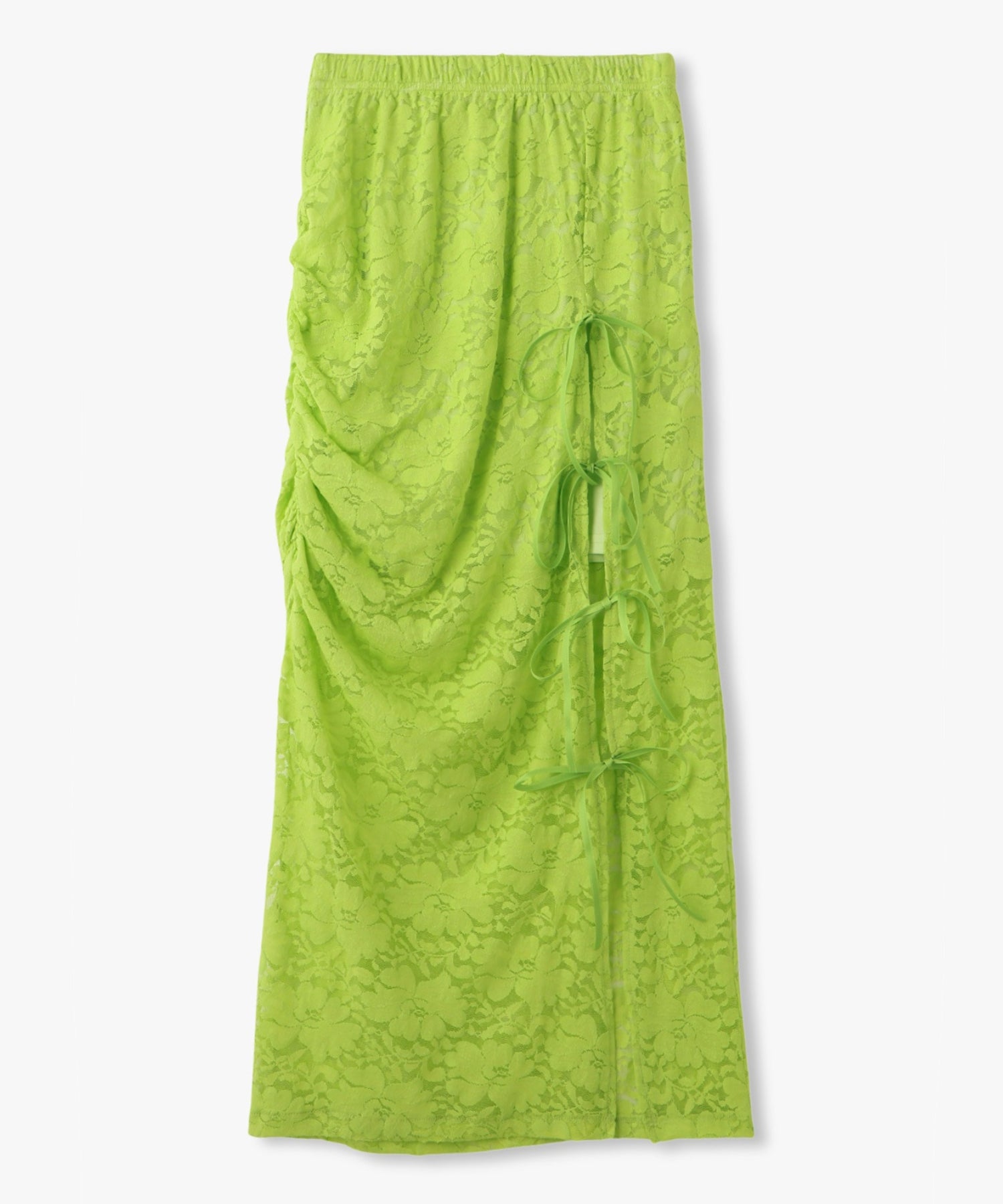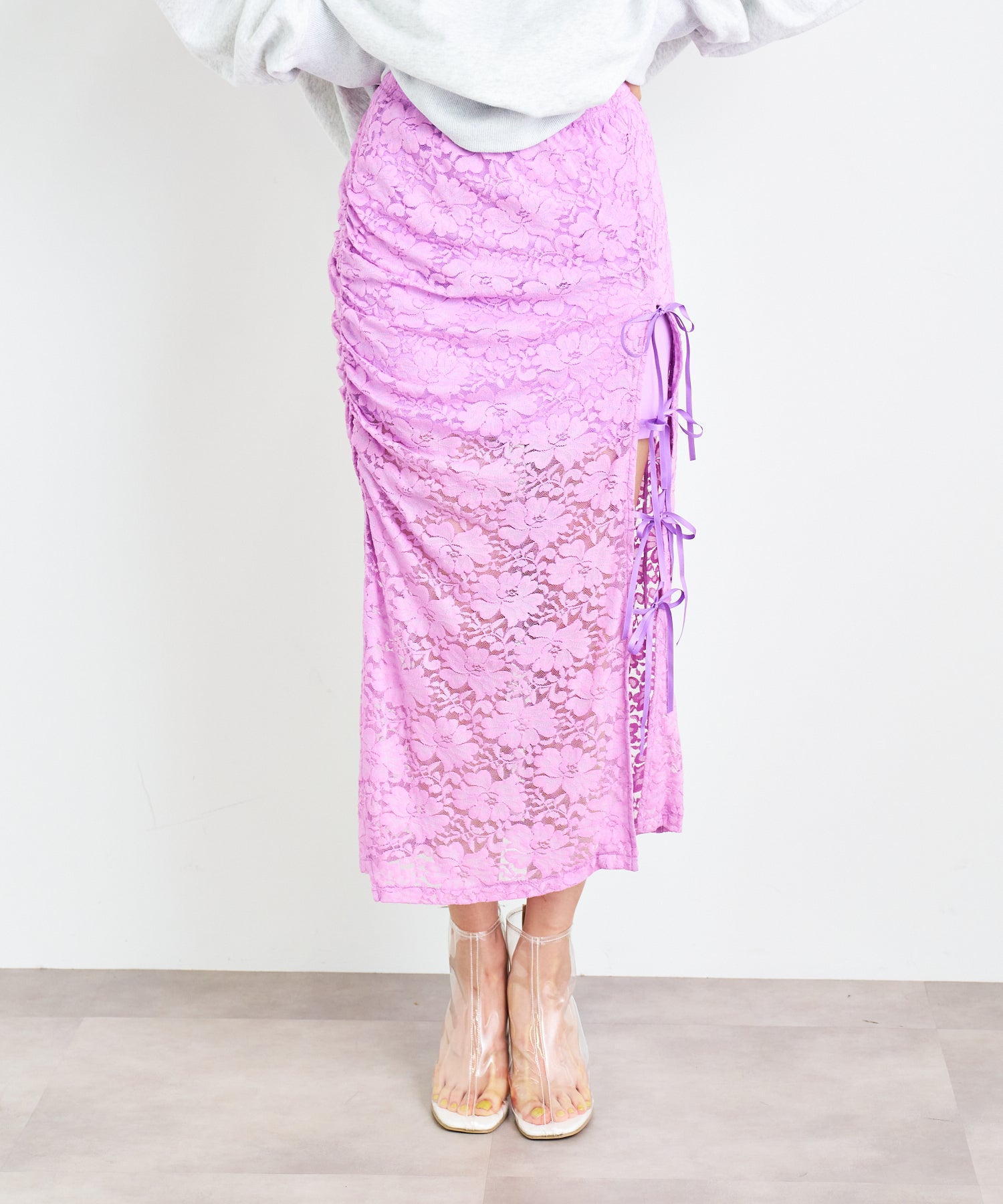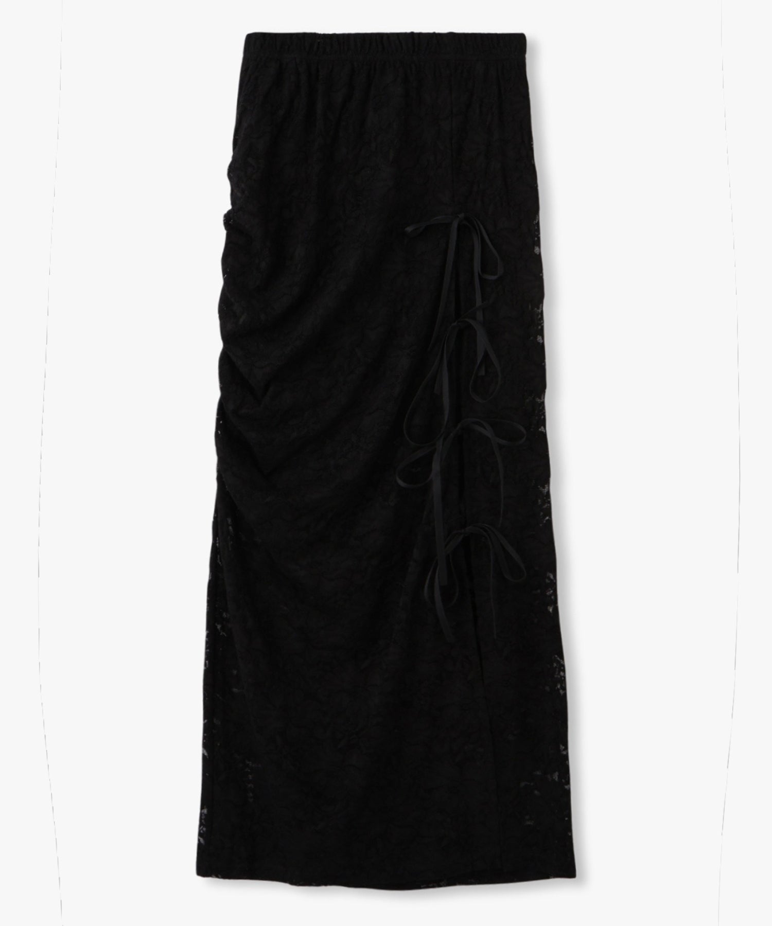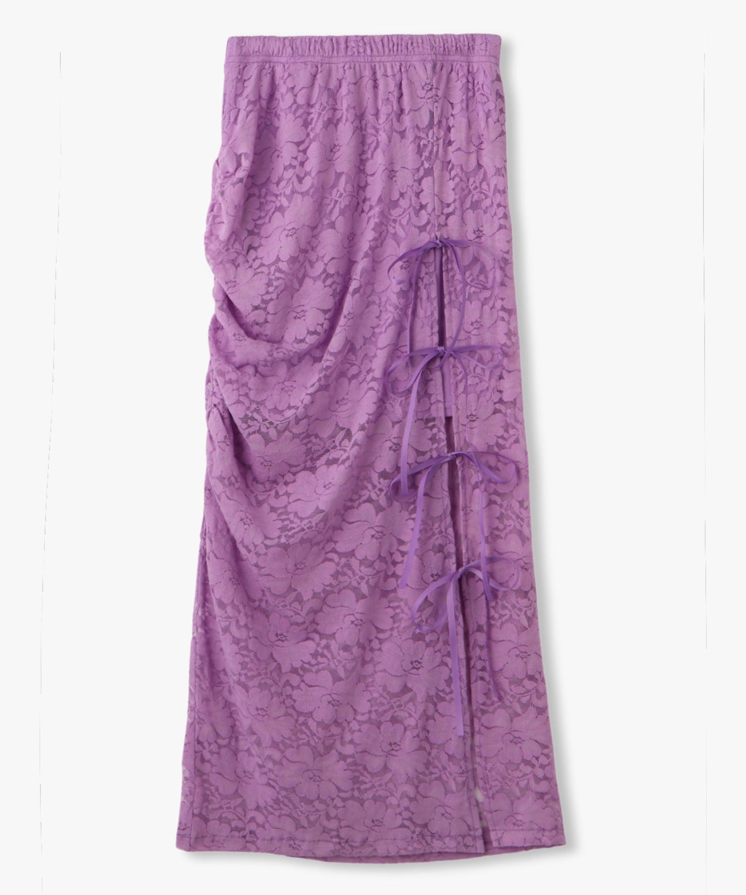 華やかなフラワーモチーフのストレッチレーススカート。片側のみにシャーリングを施したアシンメトリーなデザインが、立体的で流れるようなシルエットを作り出します。左側の大きなスリットと、布端にあしらわれた4段のリボンがアクセントに。裏地はミニ丈になっていて、レースの繊細な透け感を楽しむことができます。