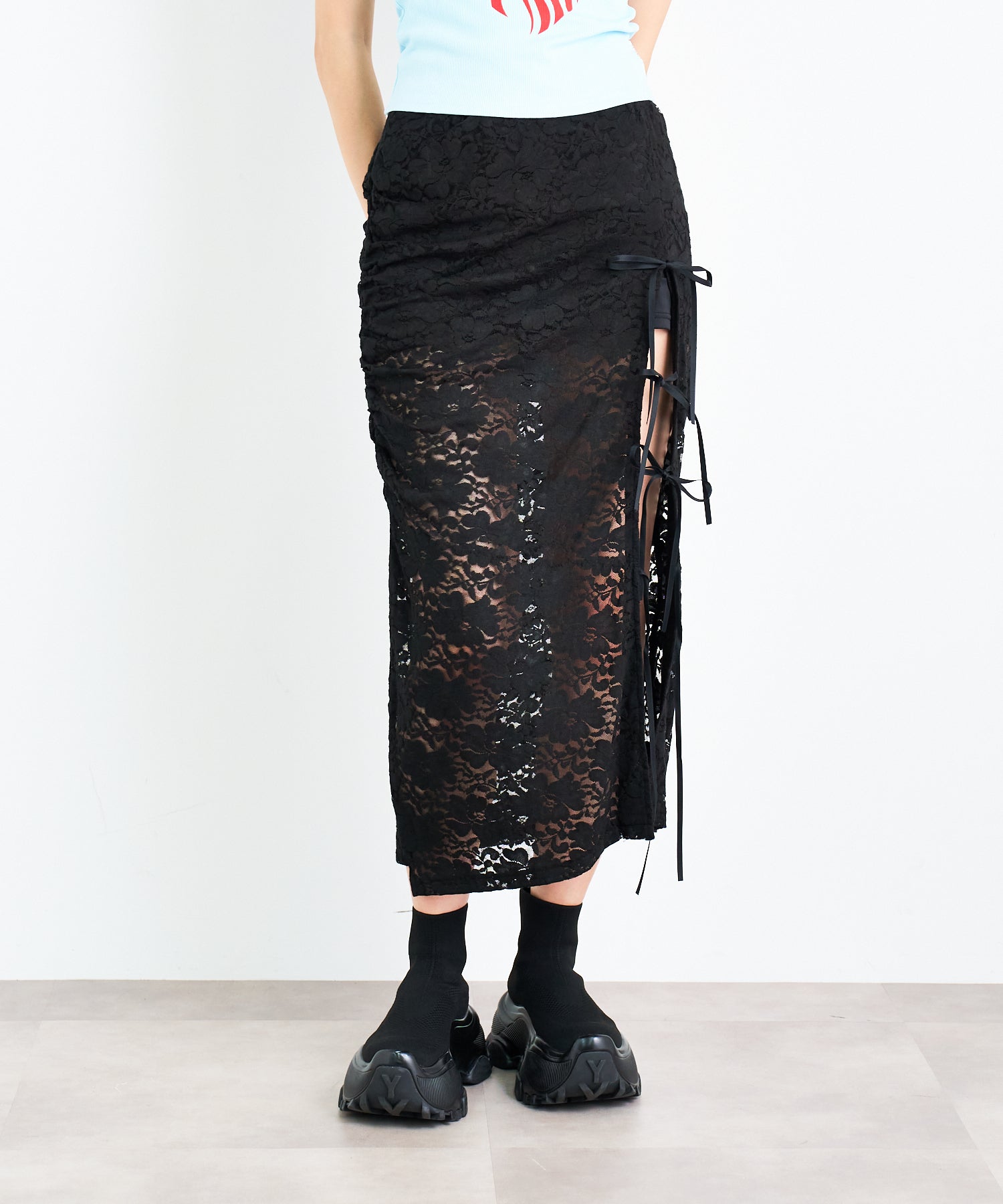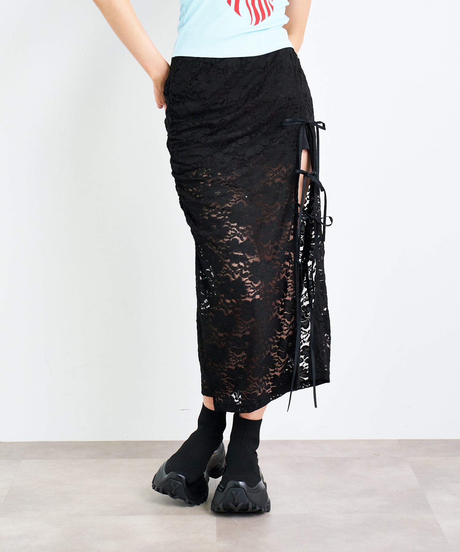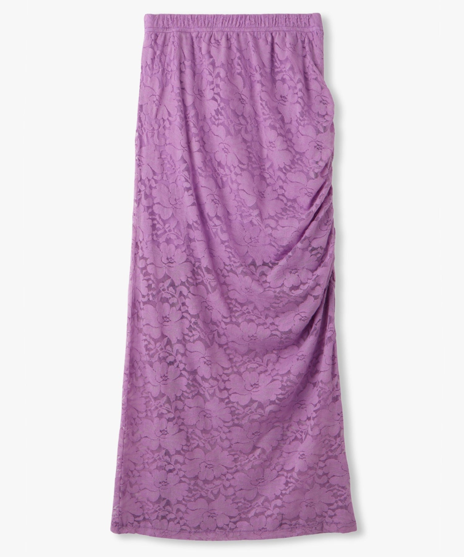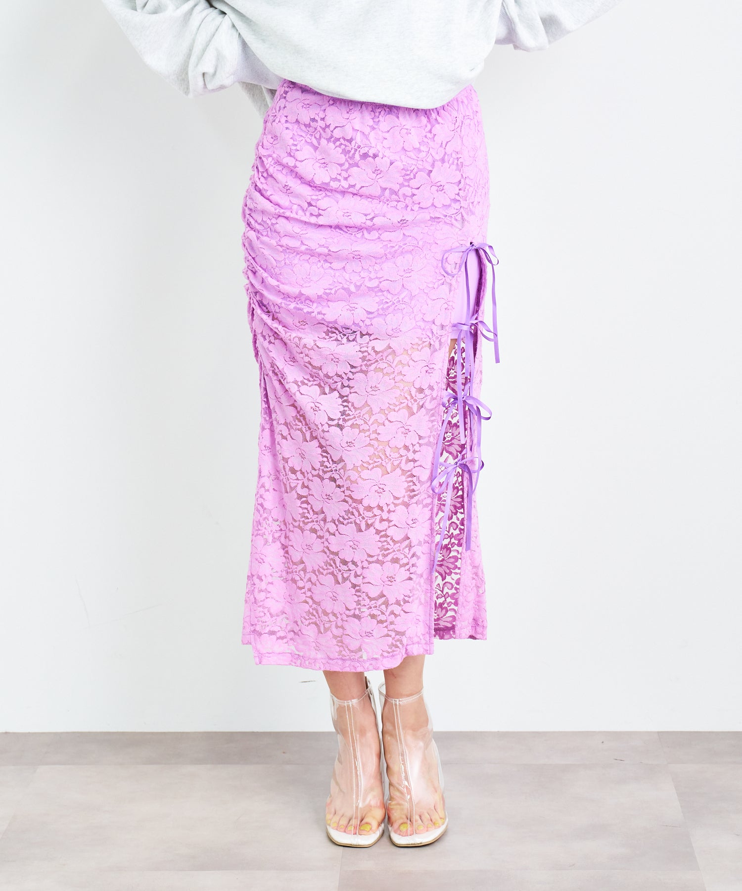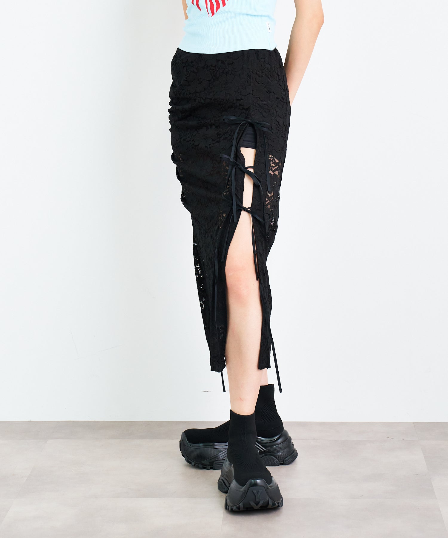 華やかなフラワーモチーフのストレッチレーススカート。片側のみにシャーリングを施したアシンメトリーなデザインが、立体的で流れるようなシルエットを作り出します。左側の大きなスリットと、布端にあしらわれた4段のリボンがアクセントに。裏地はミニ丈になっていて、レースの繊細な透け感を楽しむことができます。