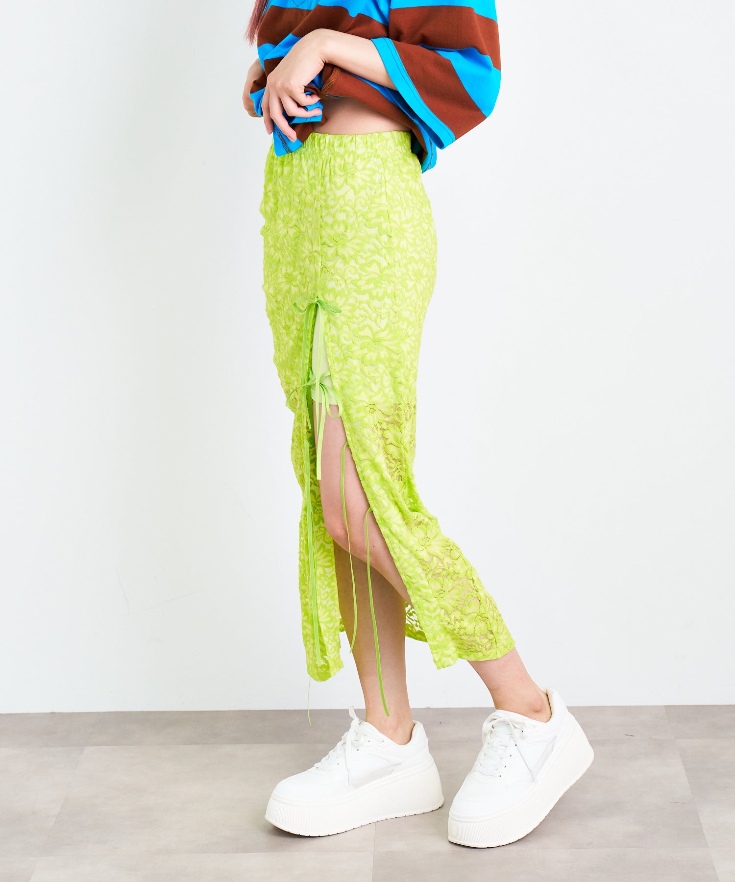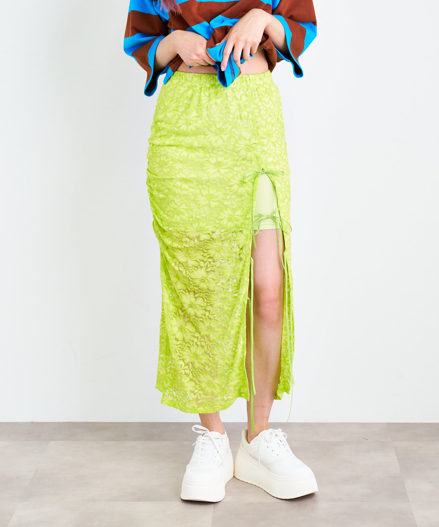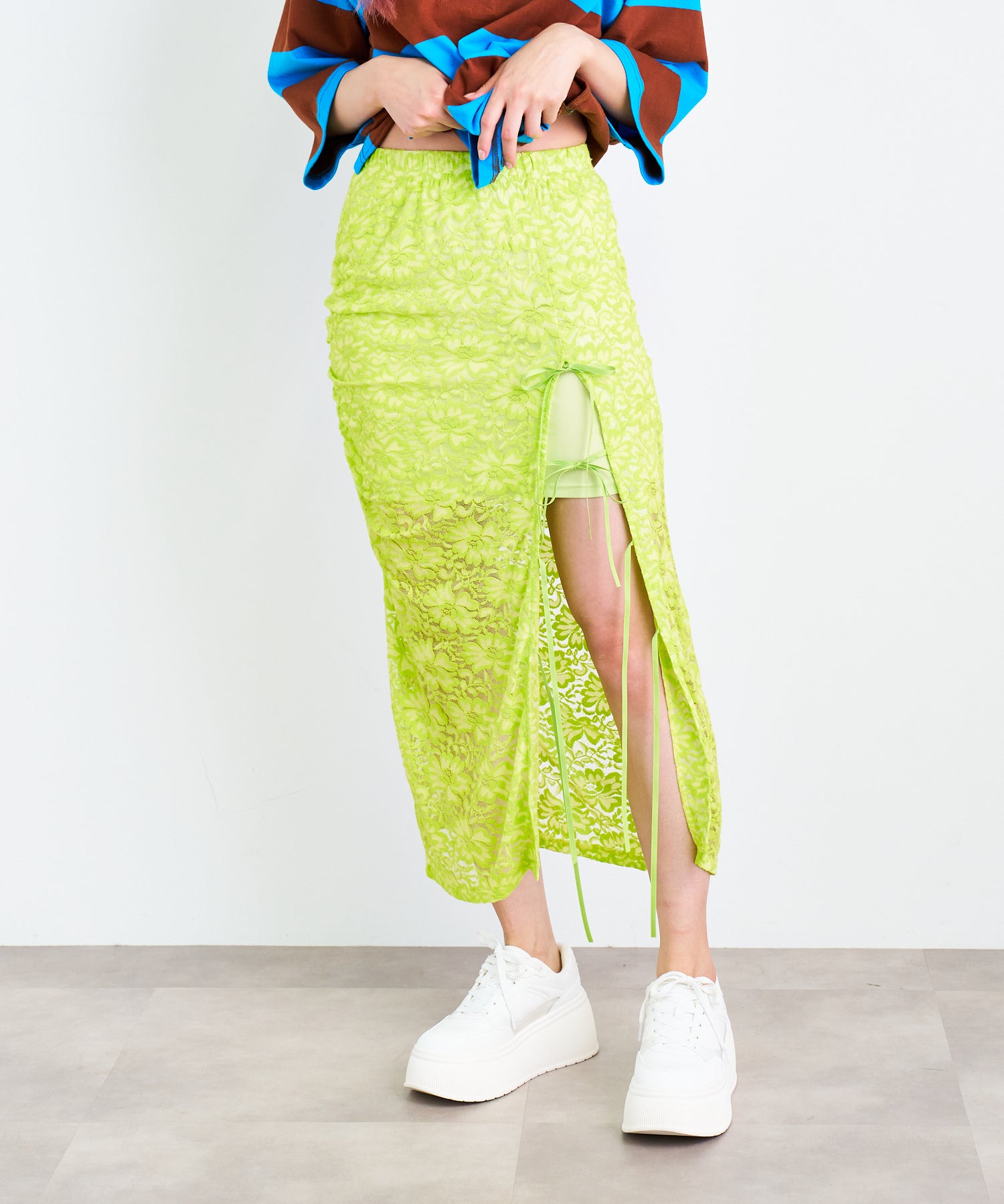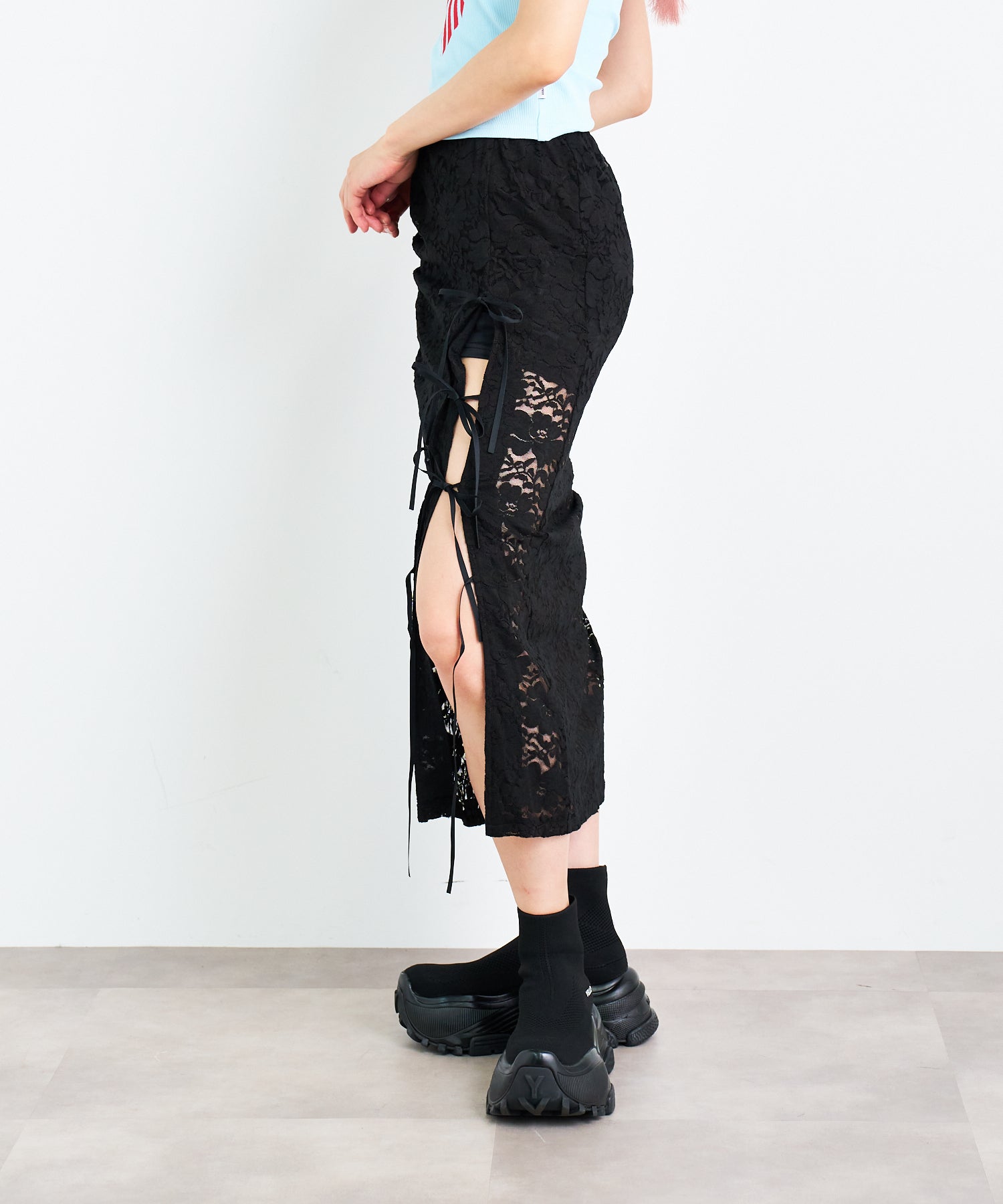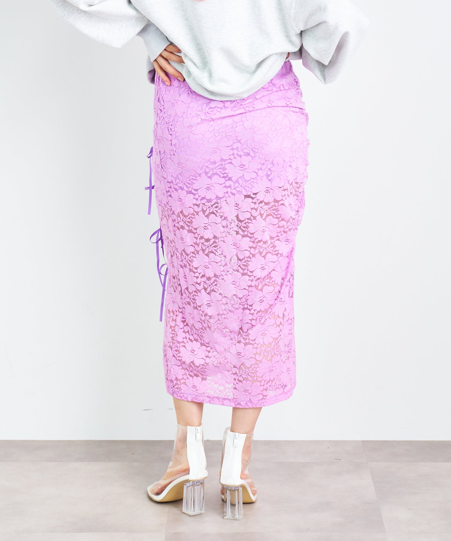 華やかなフラワーモチーフのストレッチレーススカート。片側のみにシャーリングを施したアシンメトリーなデザインが、立体的で流れるようなシルエットを作り出します。左側の大きなスリットと、布端にあしらわれた4段のリボンがアクセントに。裏地はミニ丈になっていて、レースの繊細な透け感を楽しむことができます。