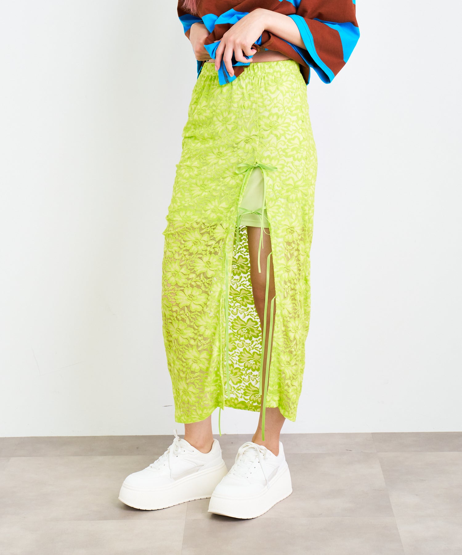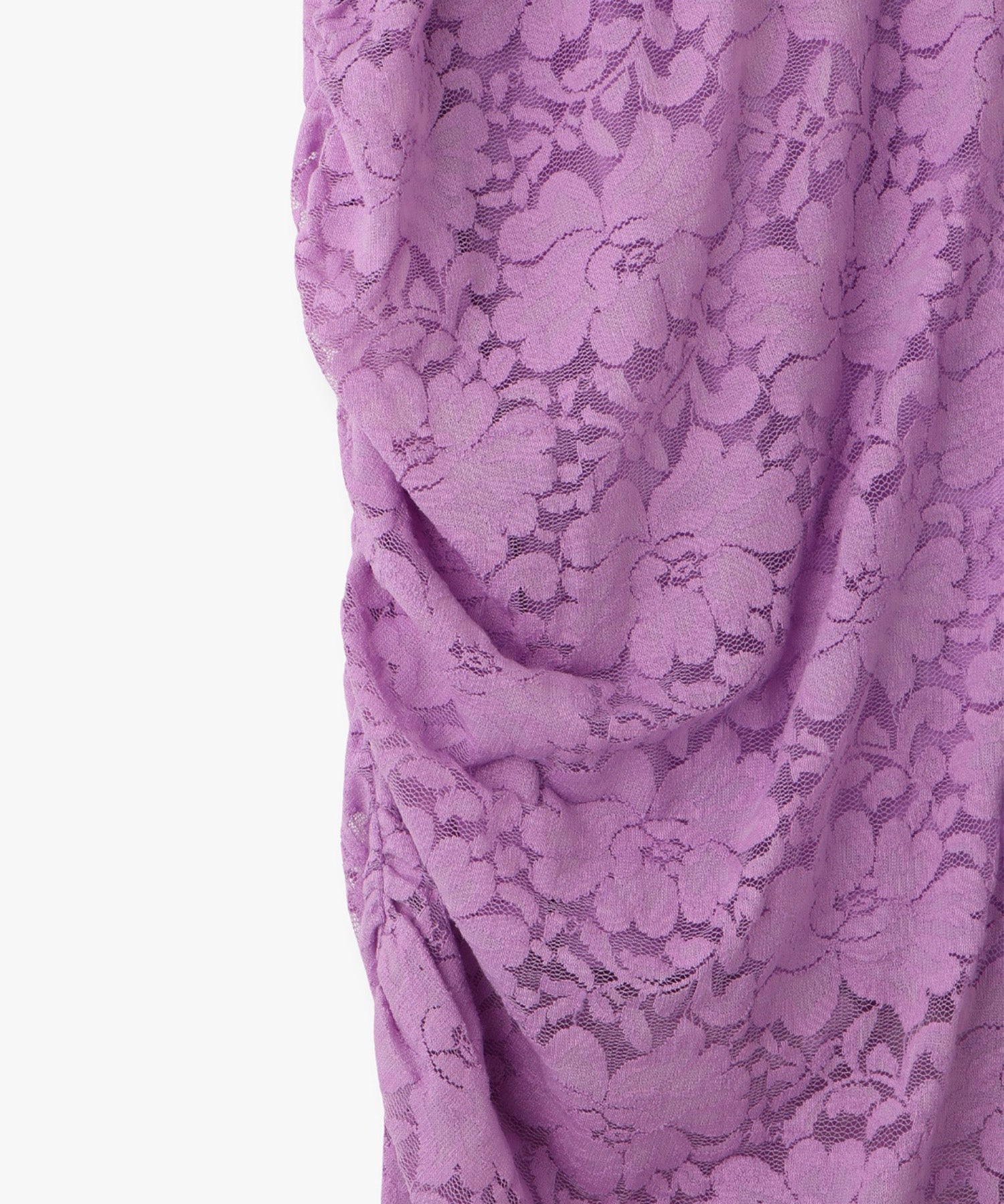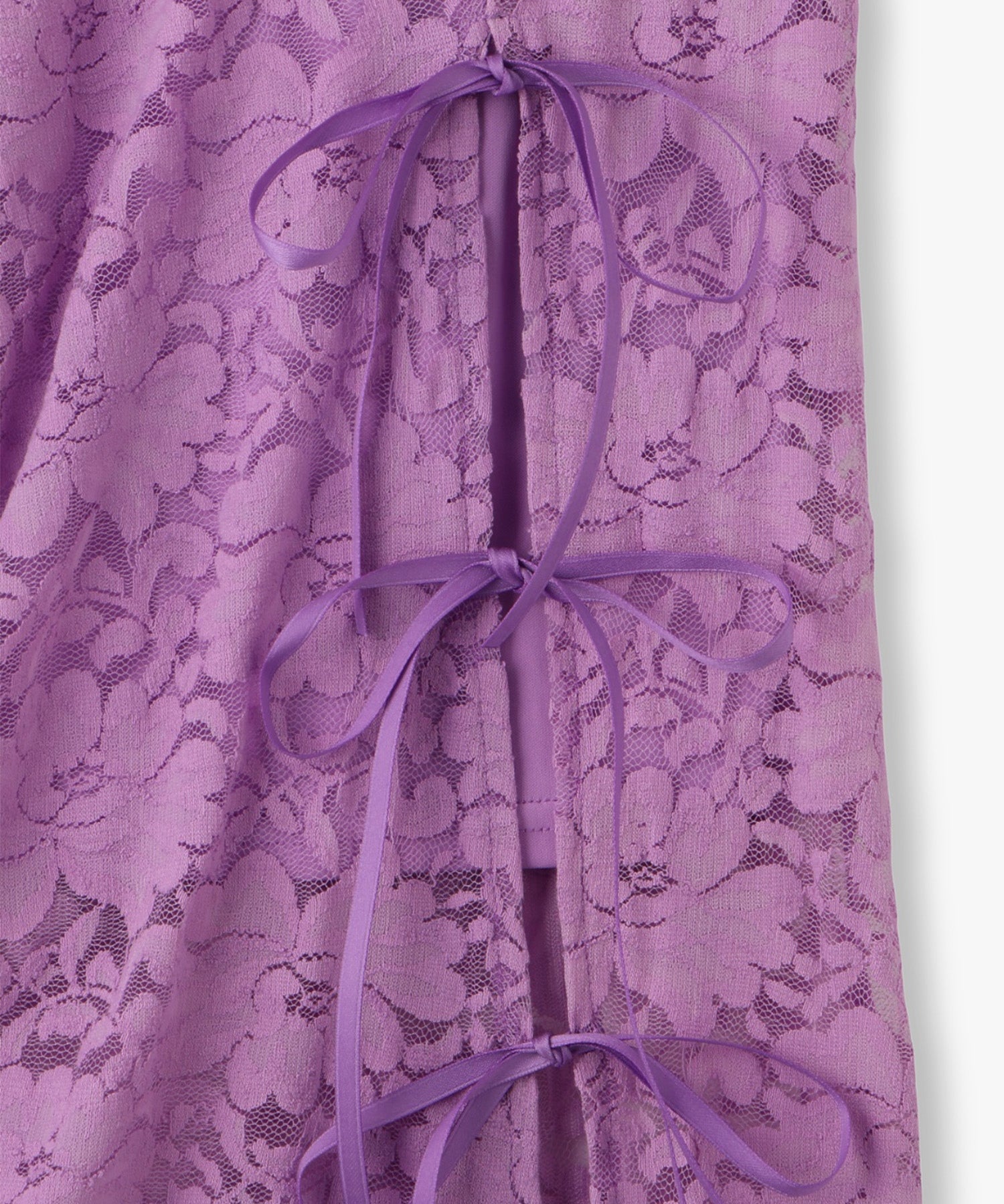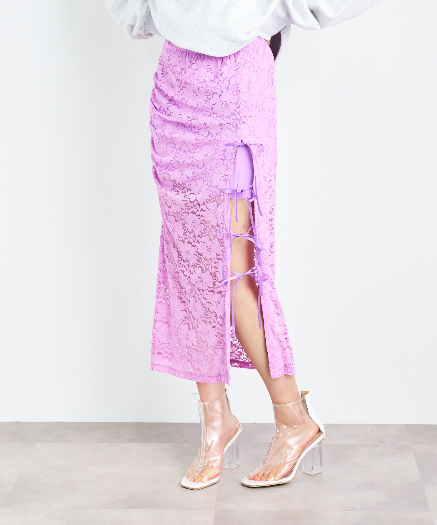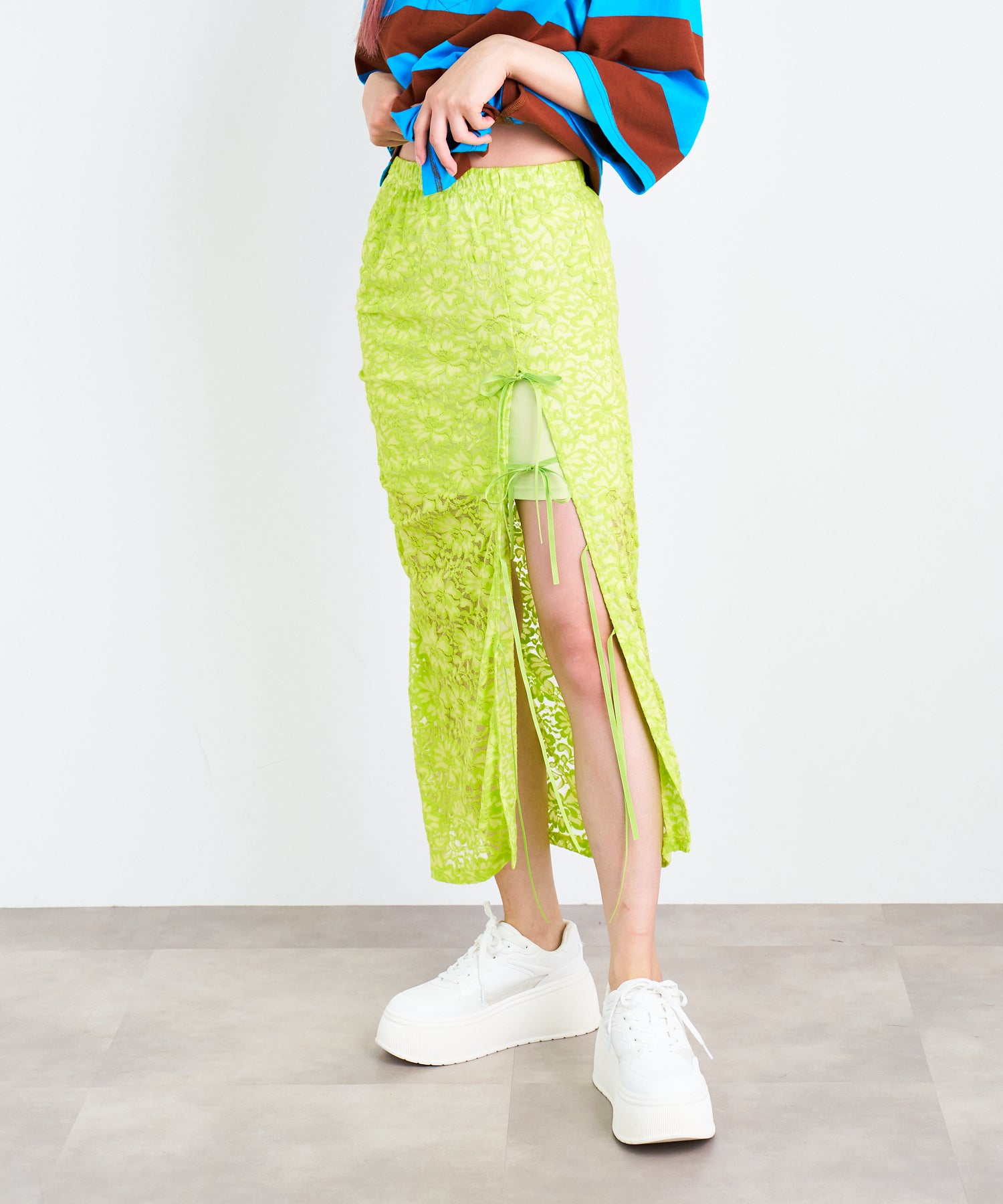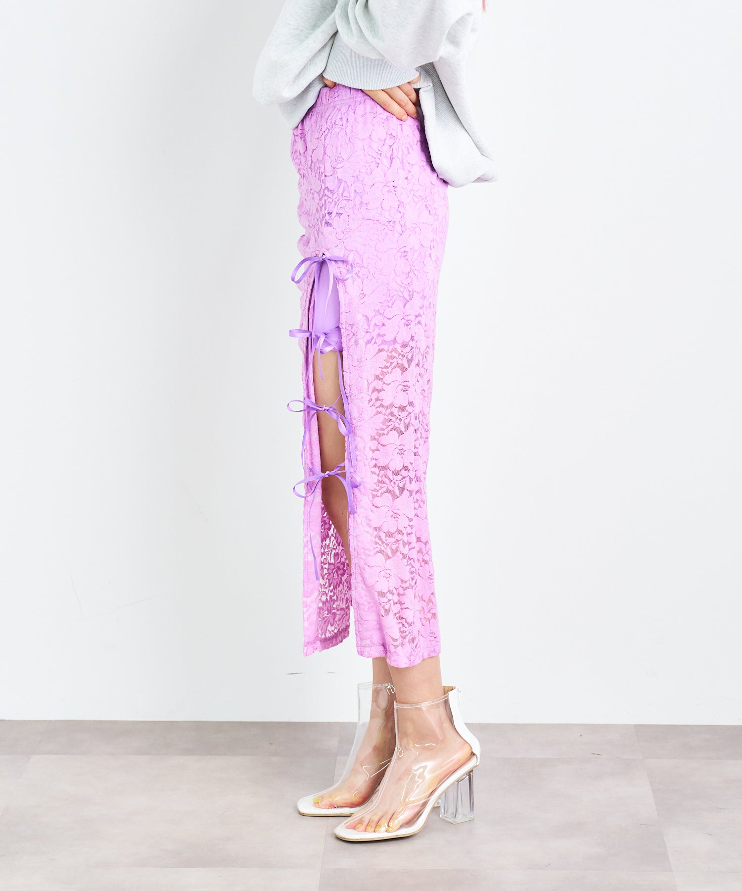 華やかなフラワーモチーフのストレッチレーススカート。片側のみにシャーリングを施したアシンメトリーなデザインが、立体的で流れるようなシルエットを作り出します。左側の大きなスリットと、布端にあしらわれた4段のリボンがアクセントに。裏地はミニ丈になっていて、レースの繊細な透け感を楽しむことができます。