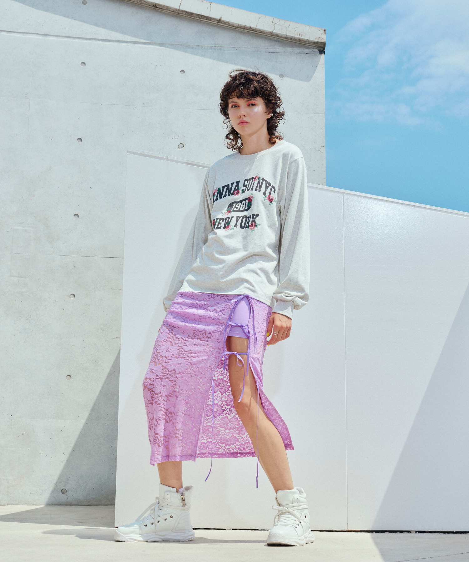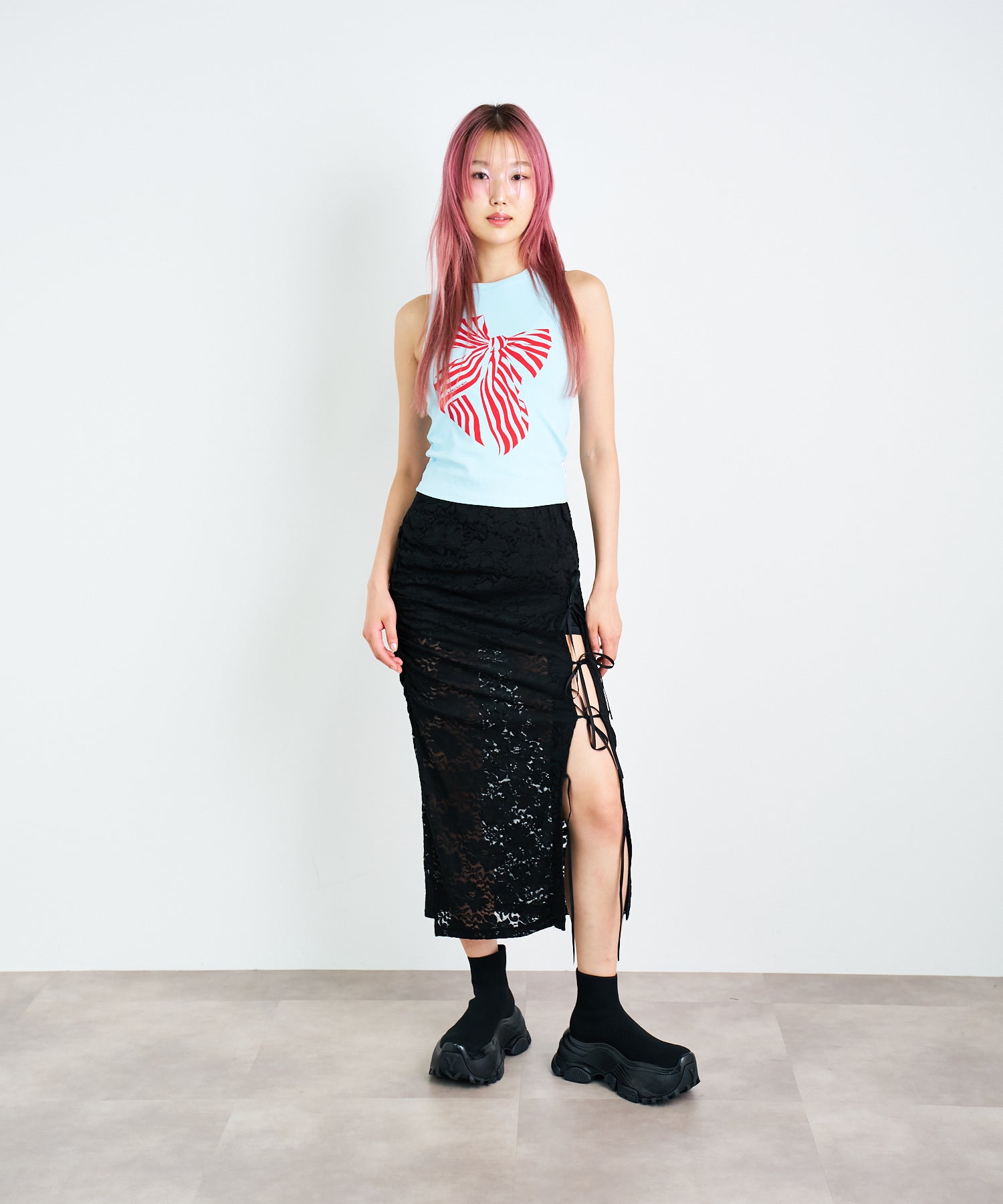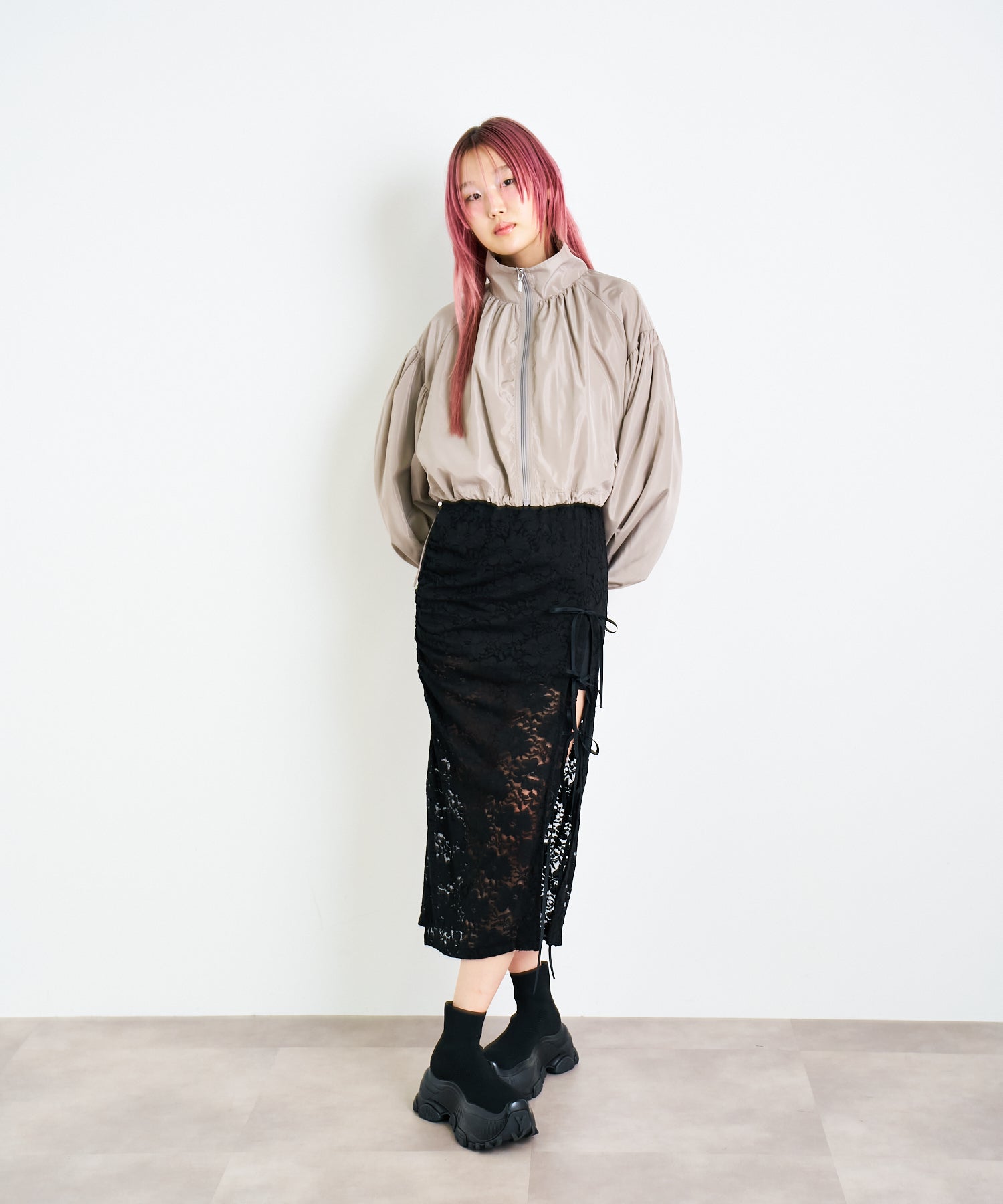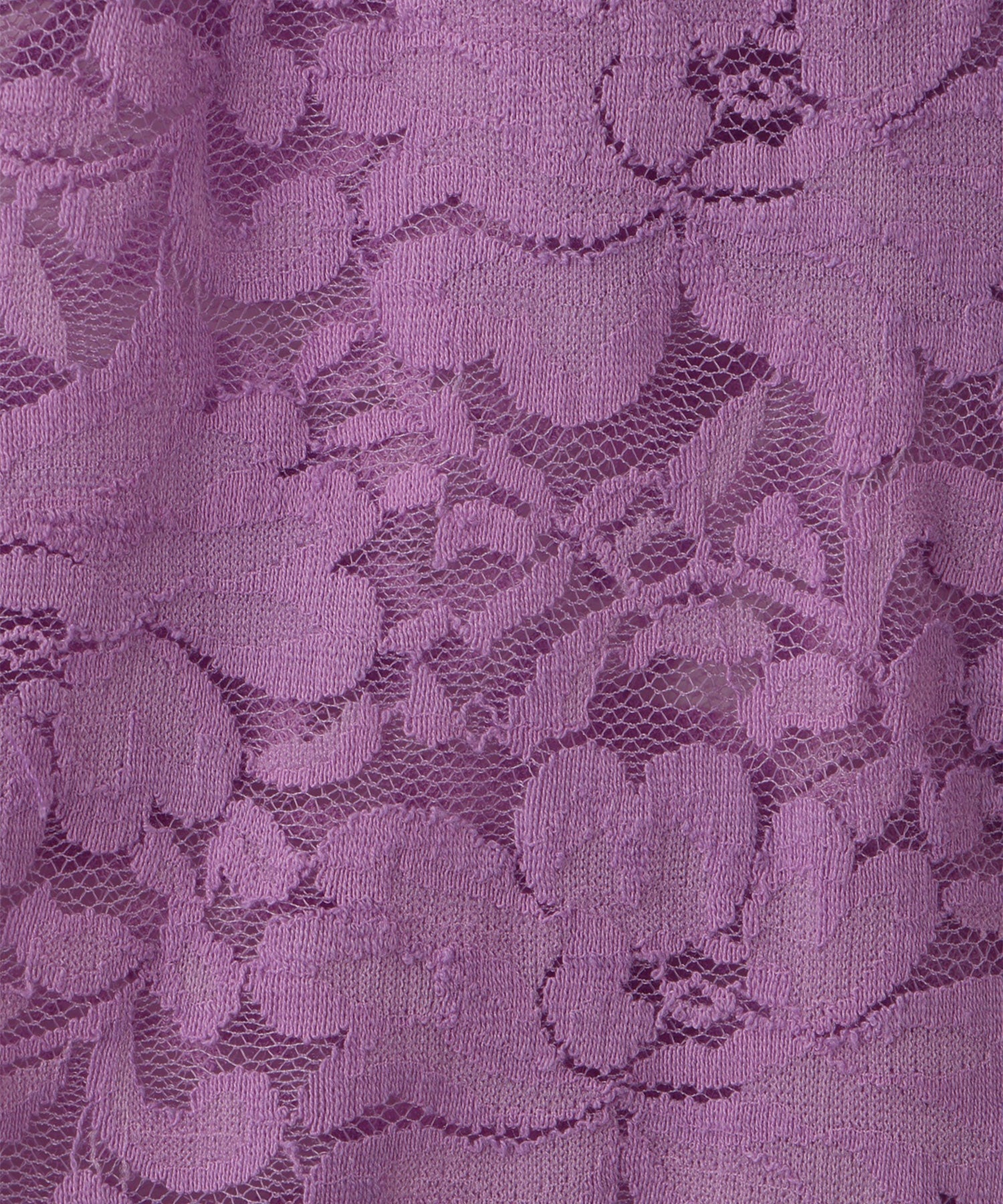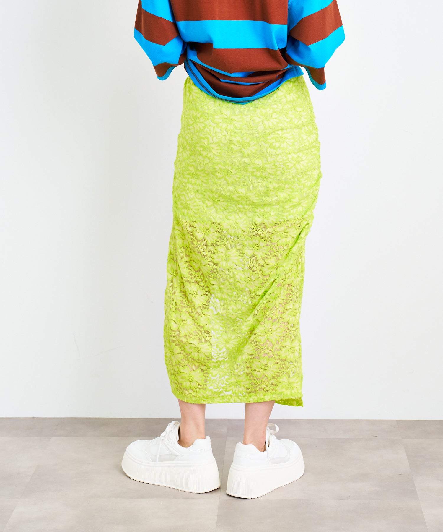 華やかなフラワーモチーフのストレッチレーススカート。片側のみにシャーリングを施したアシンメトリーなデザインが、立体的で流れるようなシルエットを作り出します。左側の大きなスリットと、布端にあしらわれた4段のリボンがアクセントに。裏地はミニ丈になっていて、レースの繊細な透け感を楽しむことができます。