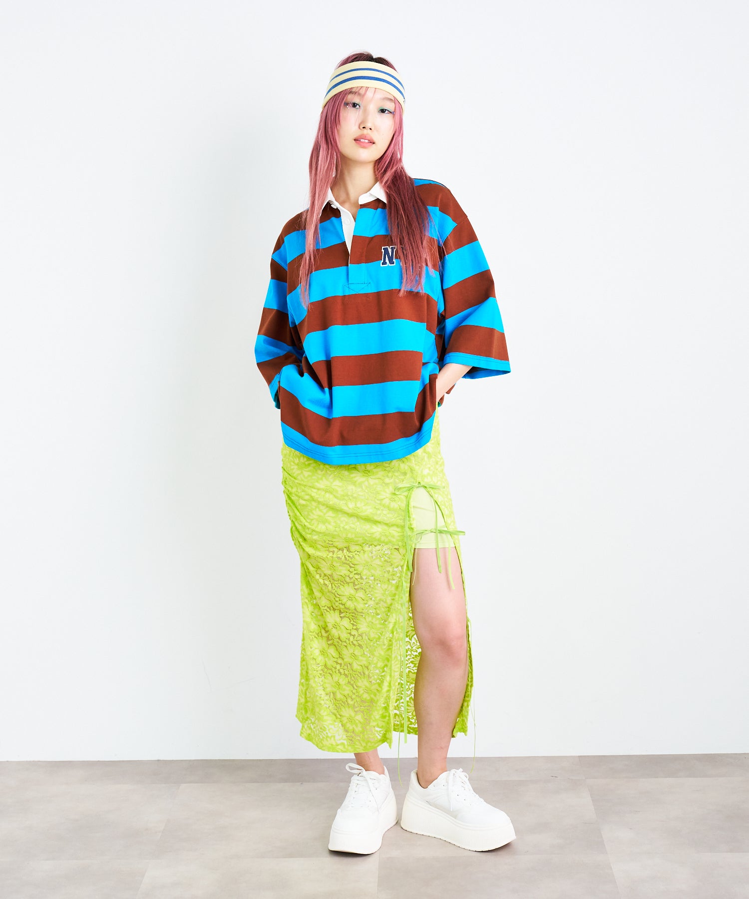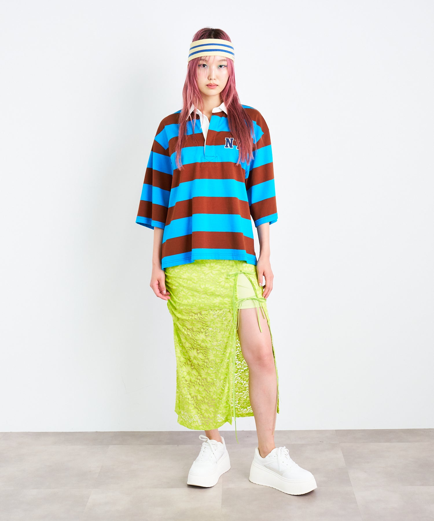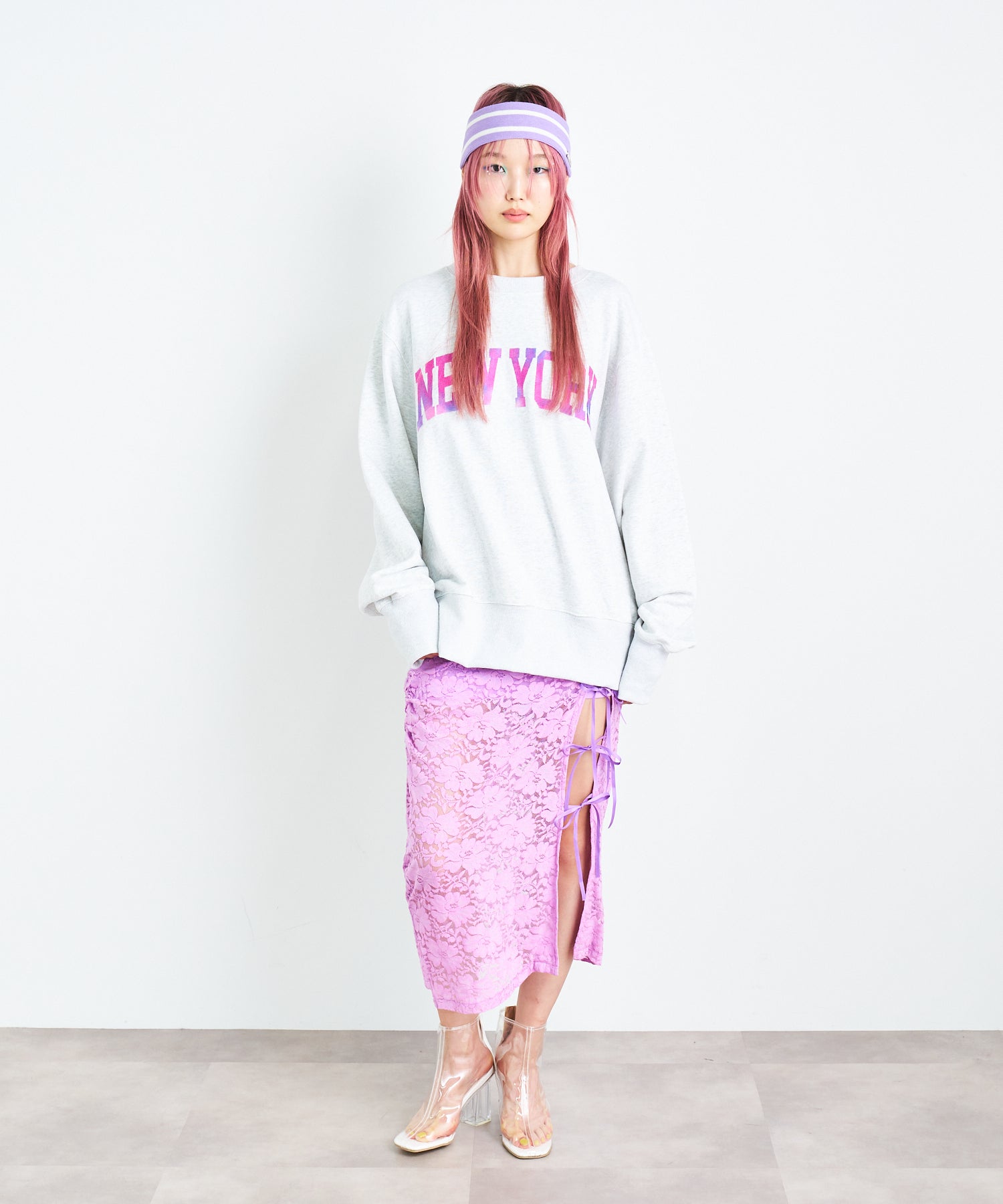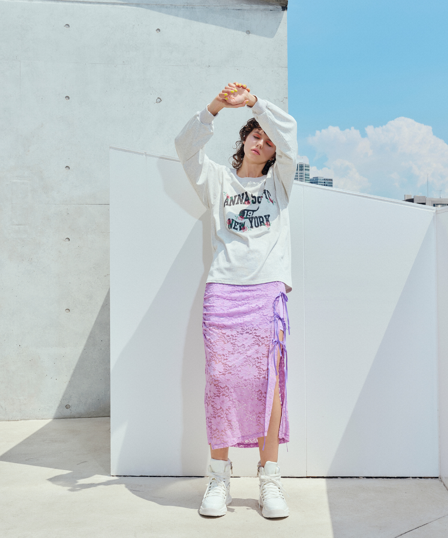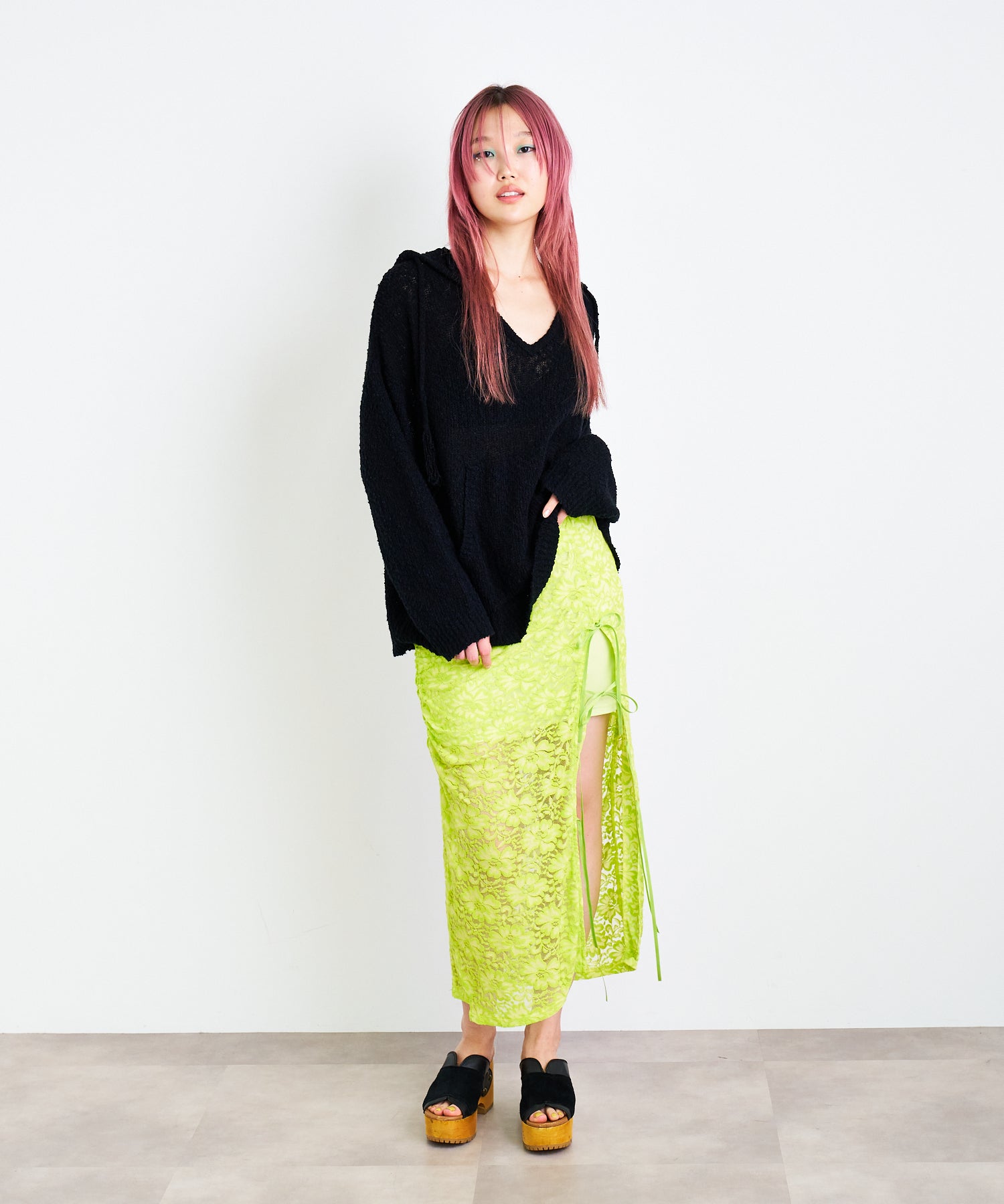華やかなフラワーモチーフのストレッチレーススカート。片側のみにシャーリングを施したアシンメトリーなデザインが、立体的で流れるようなシルエットを作り出します。左側の大きなスリットと、布端にあしらわれた4段のリボンがアクセントに。裏地はミニ丈になっていて、レースの繊細な透け感を楽しむことができます。