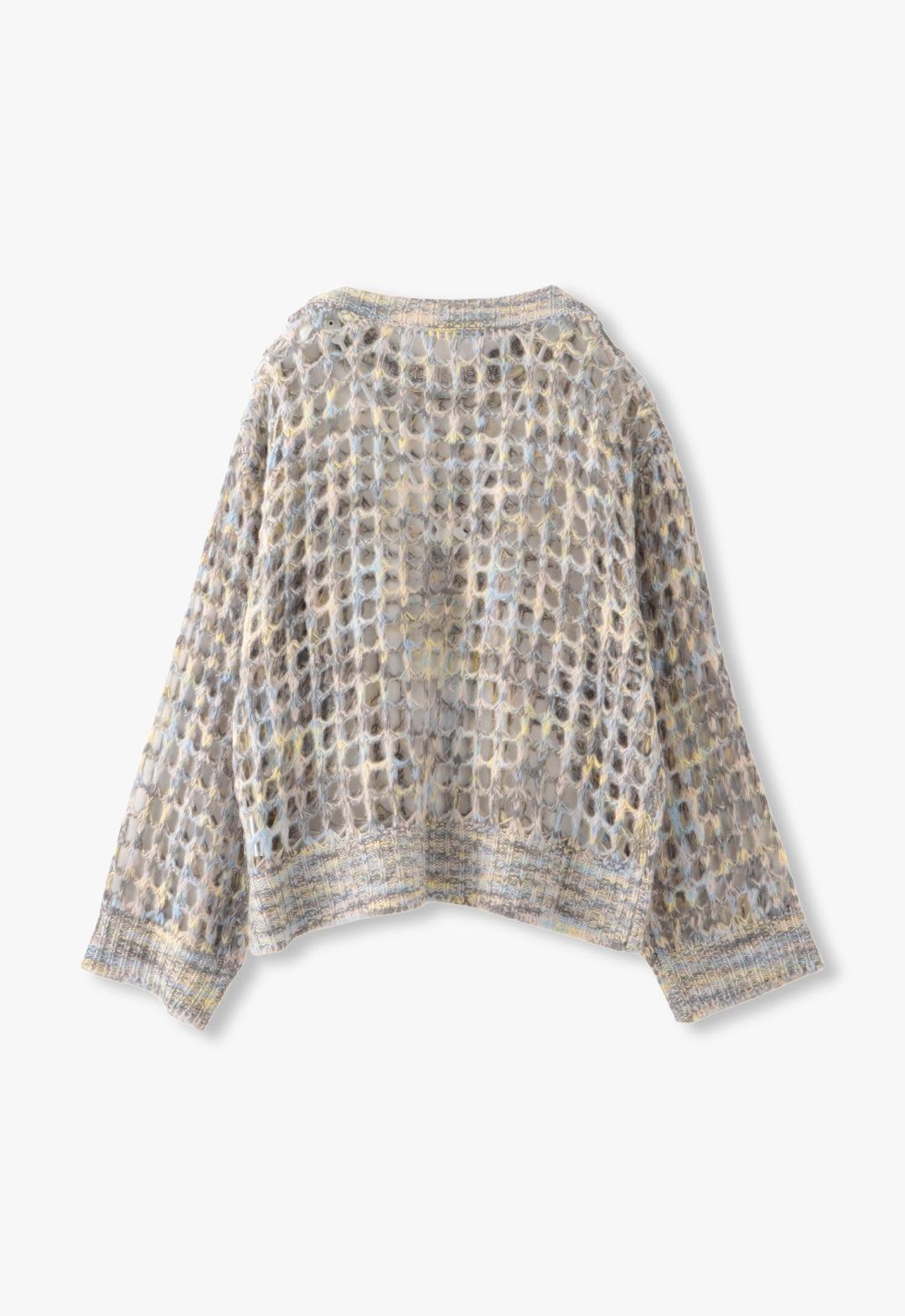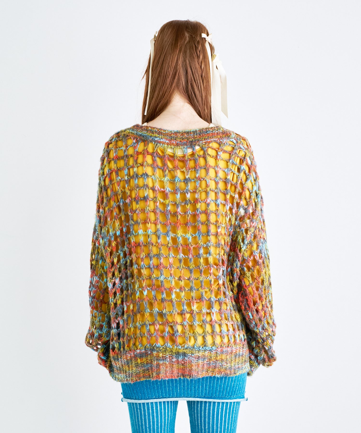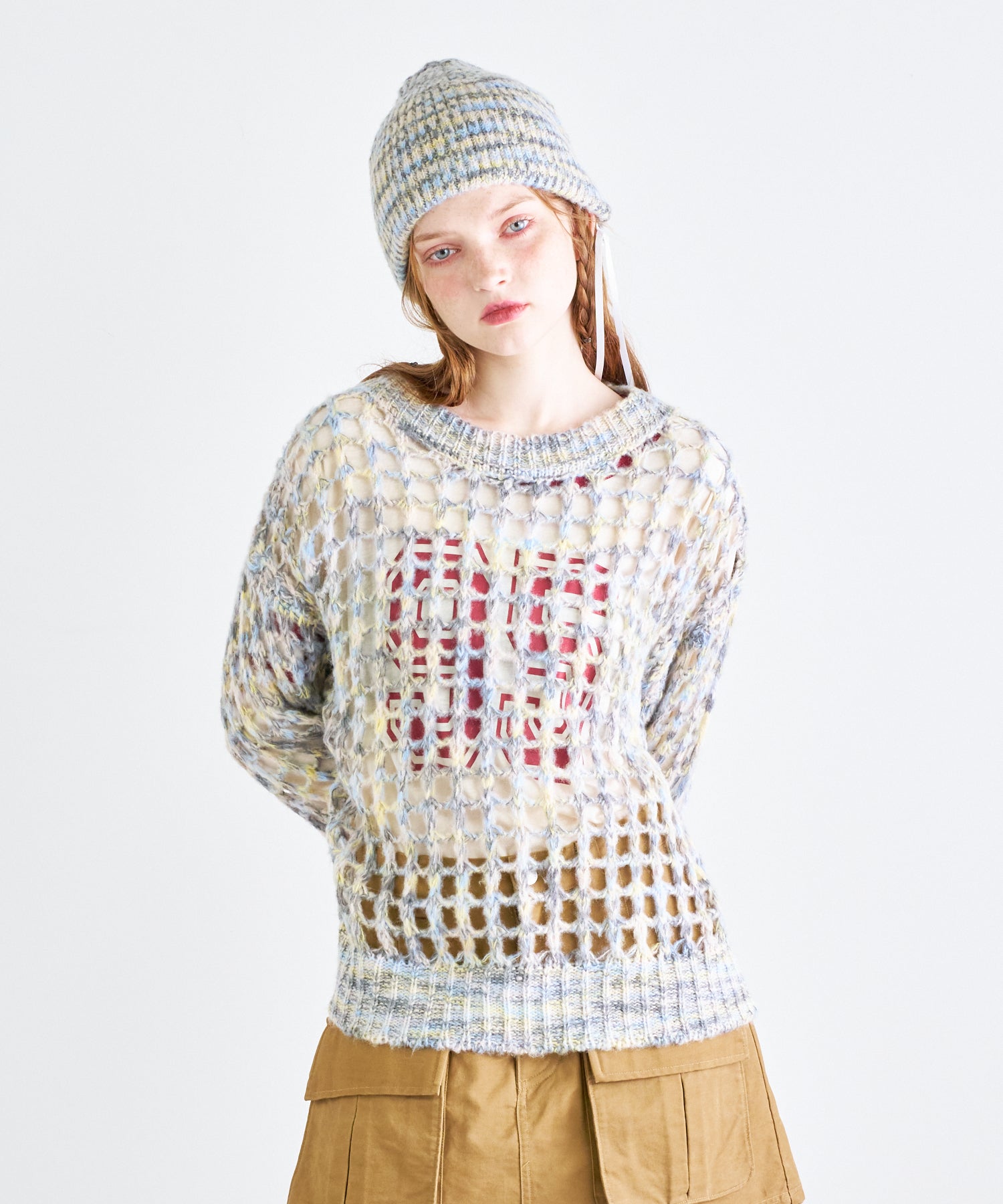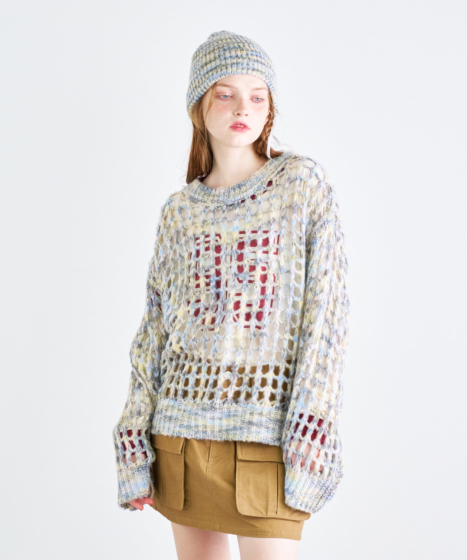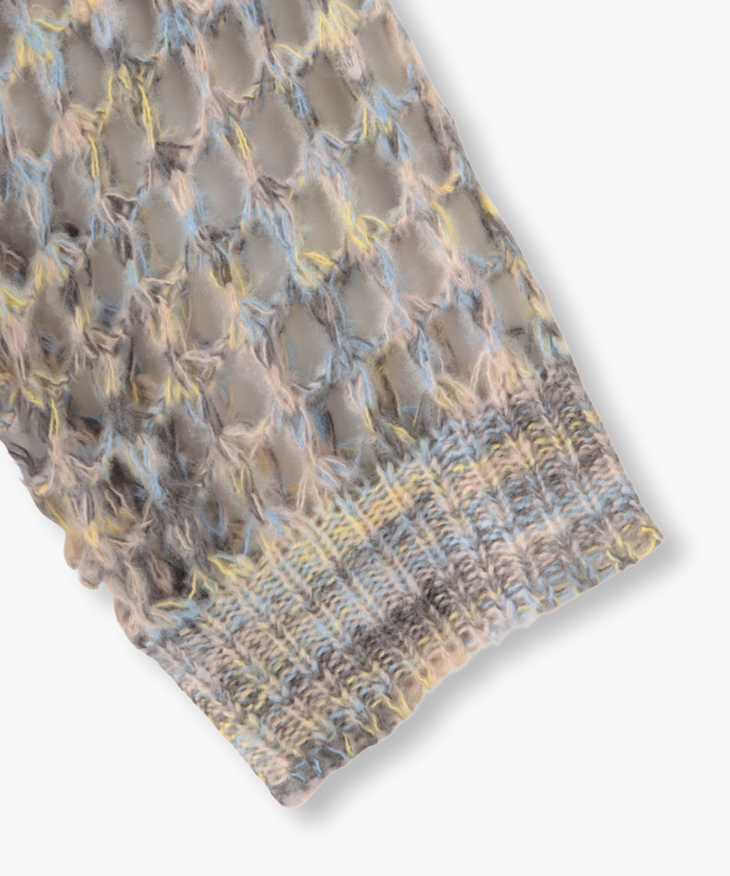 ミックスカラーがポイントの今季一押しアイテム。カラーによって雰囲気が異なるので、自分に合うカラーを見つけていただけます。抜け感のある格子編みが、重くなりがちな秋冬のスタイリングに軽さをプラスしてくれるレイヤードニットです◎