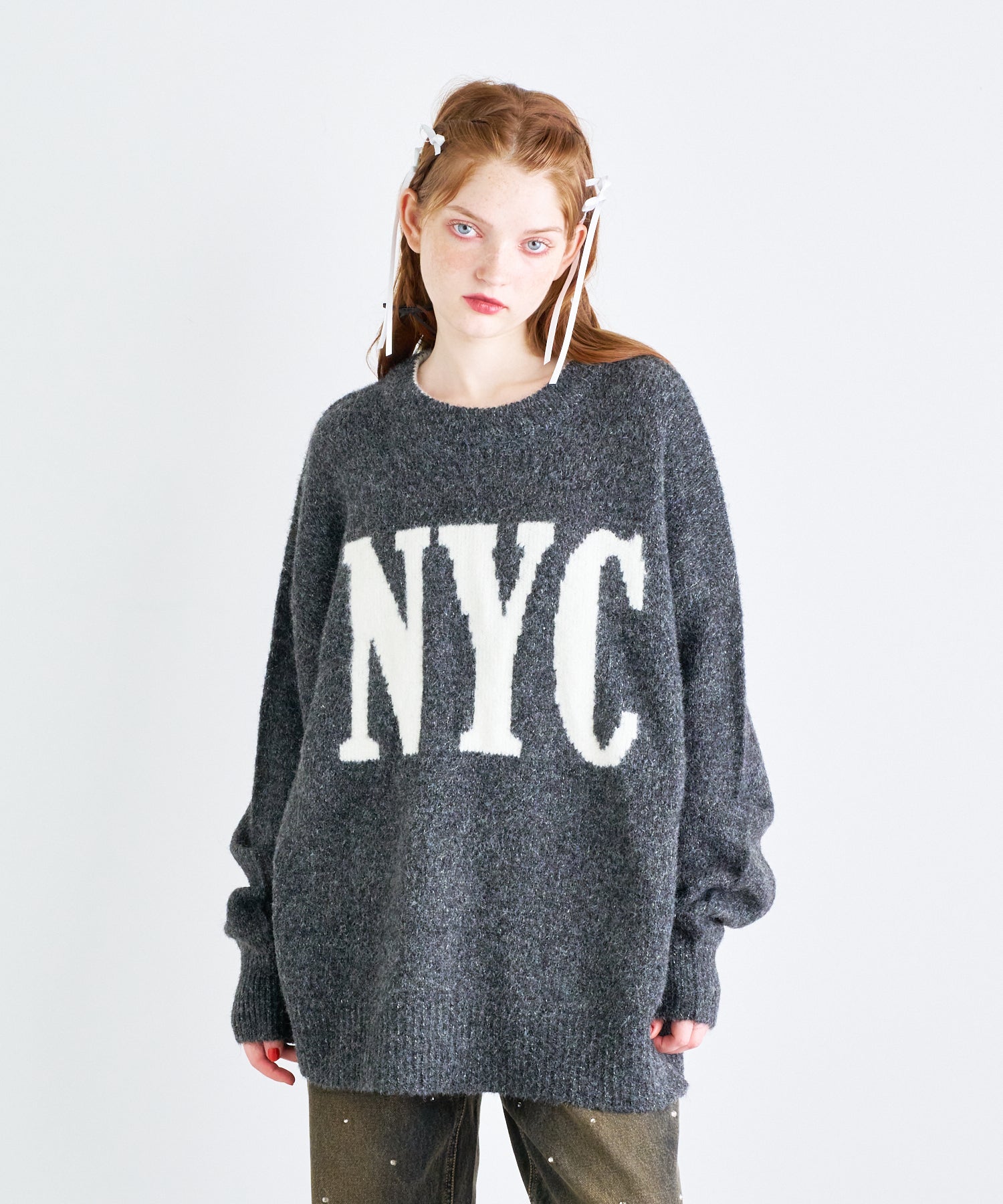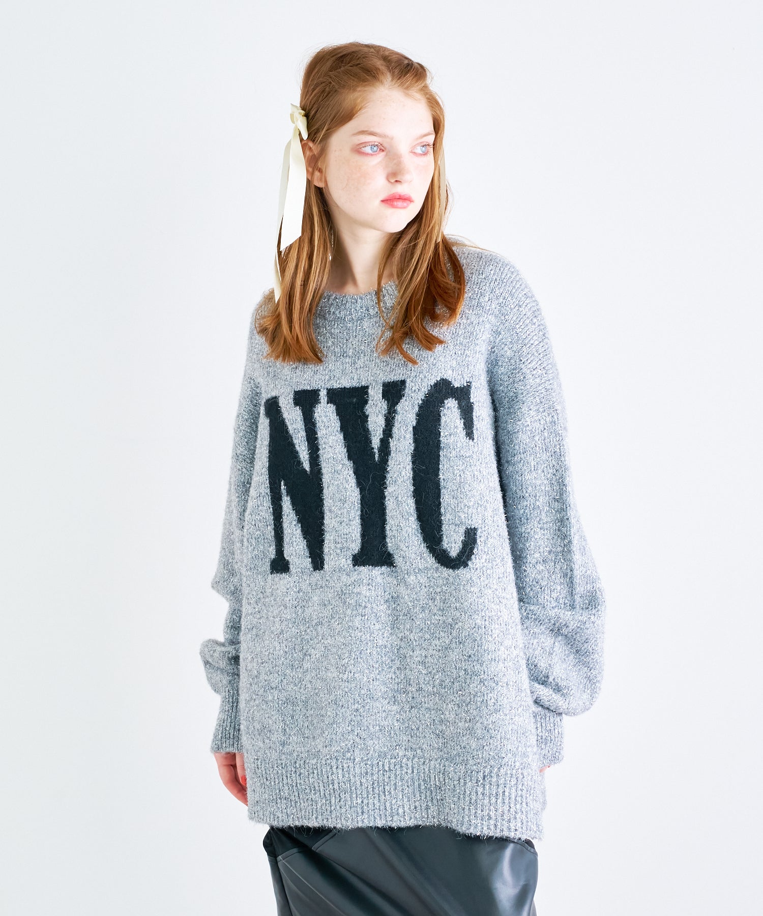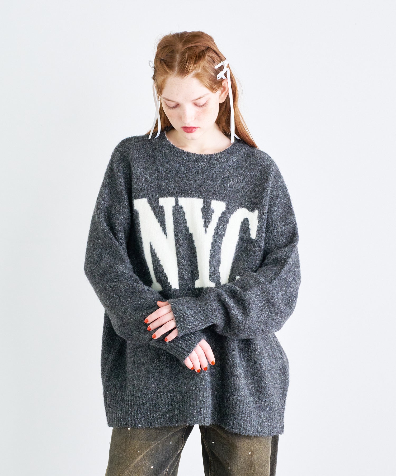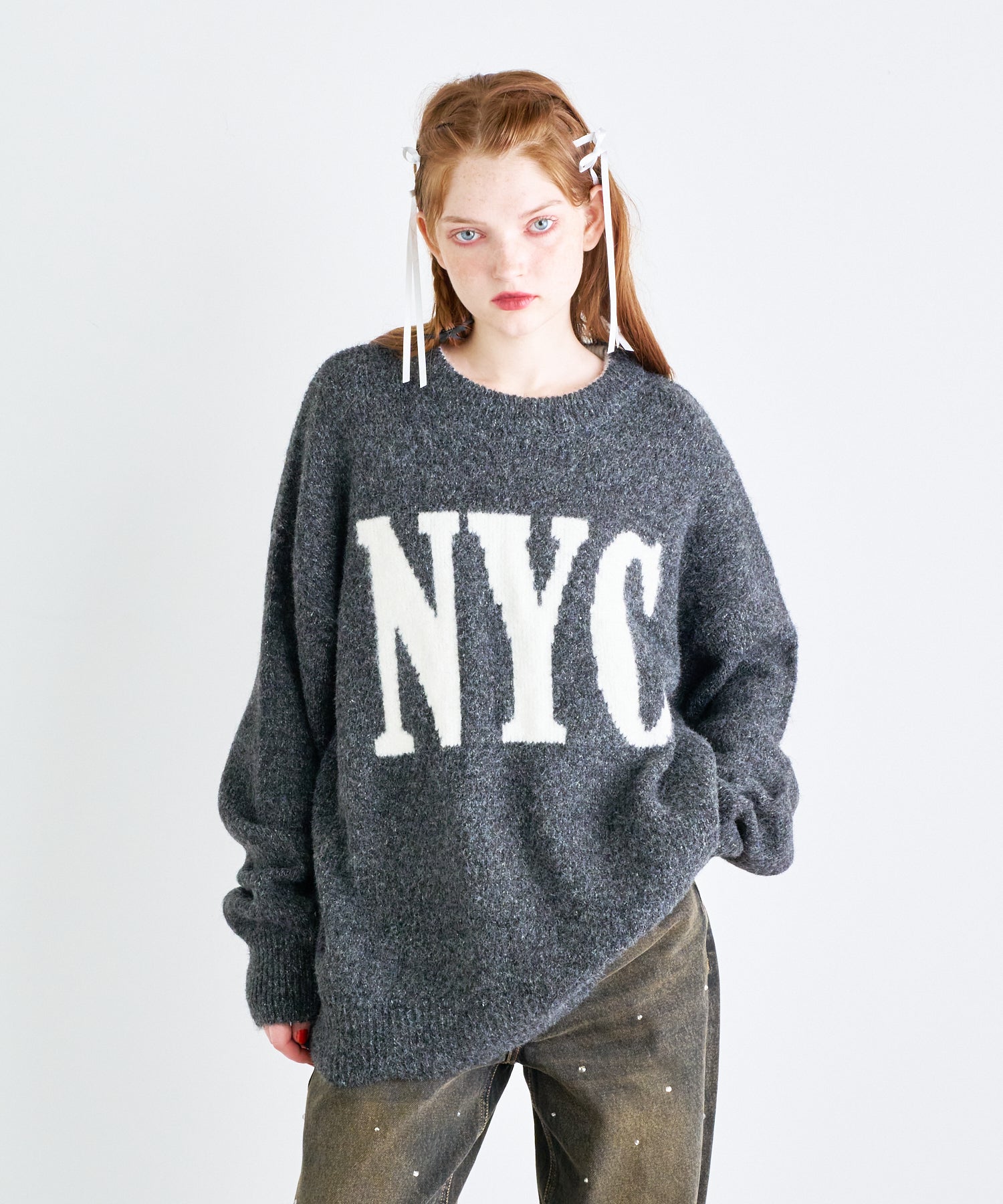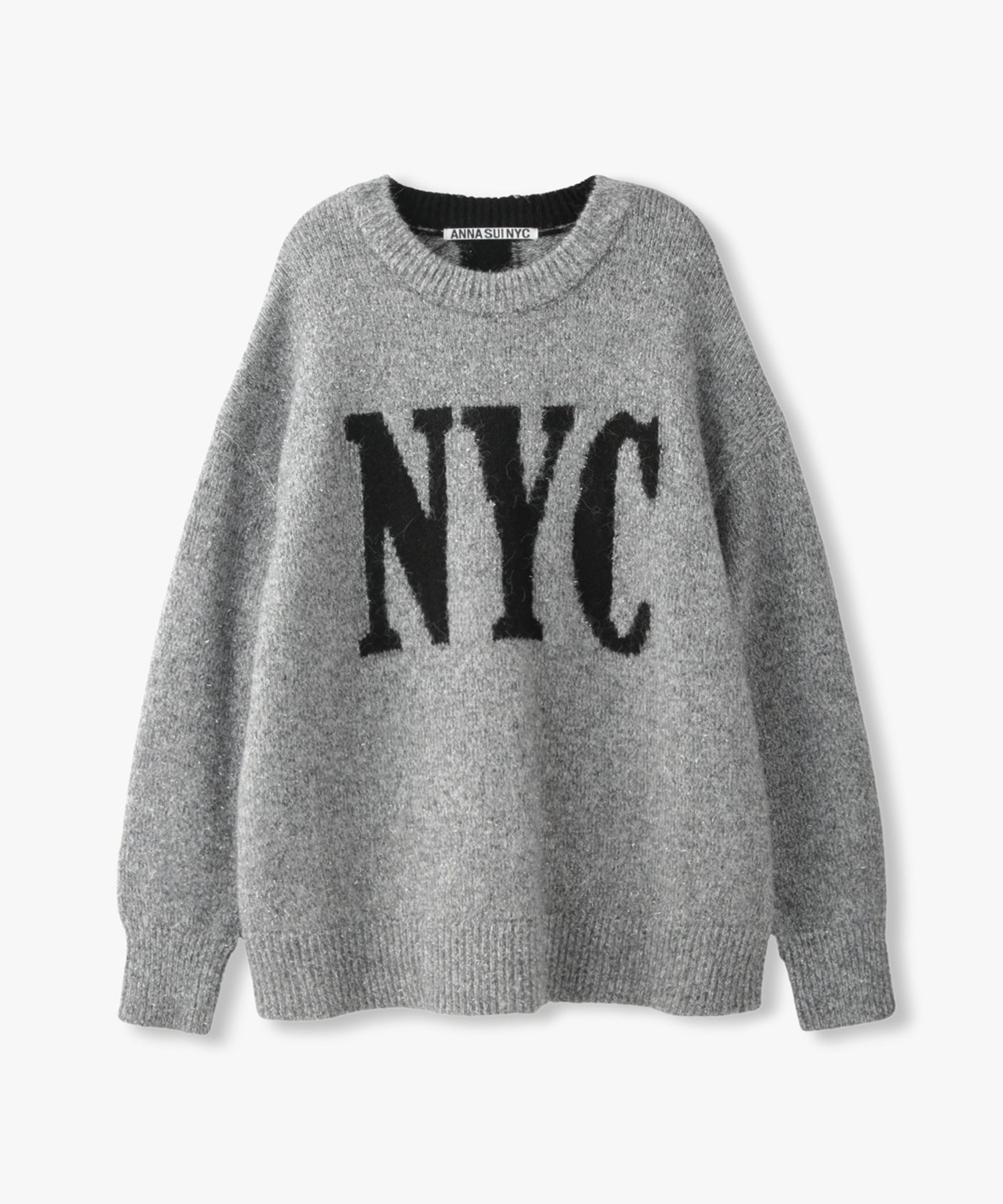 ラメがキラキラと輝く糸が全体に使用されたインパクトのあるニットプルオーバー。大きなNYCロゴは、インターシャジャガードと呼ばれる手間と時間がかかる贅沢な手法を使いました。コーディネートの主役として、デイリースタイルを盛り上げてくれます。