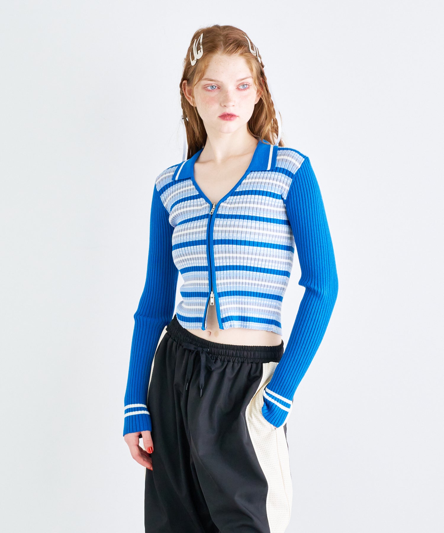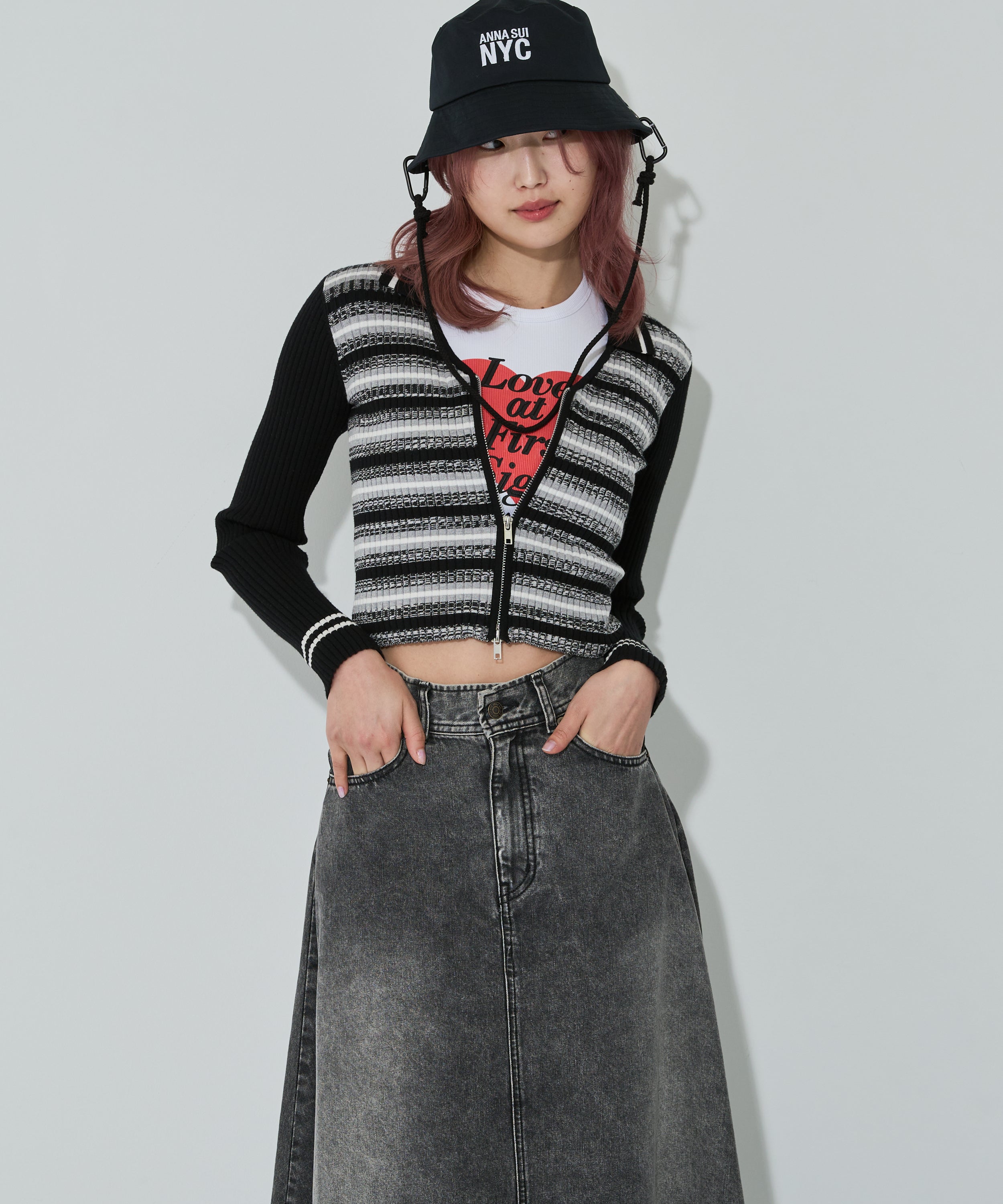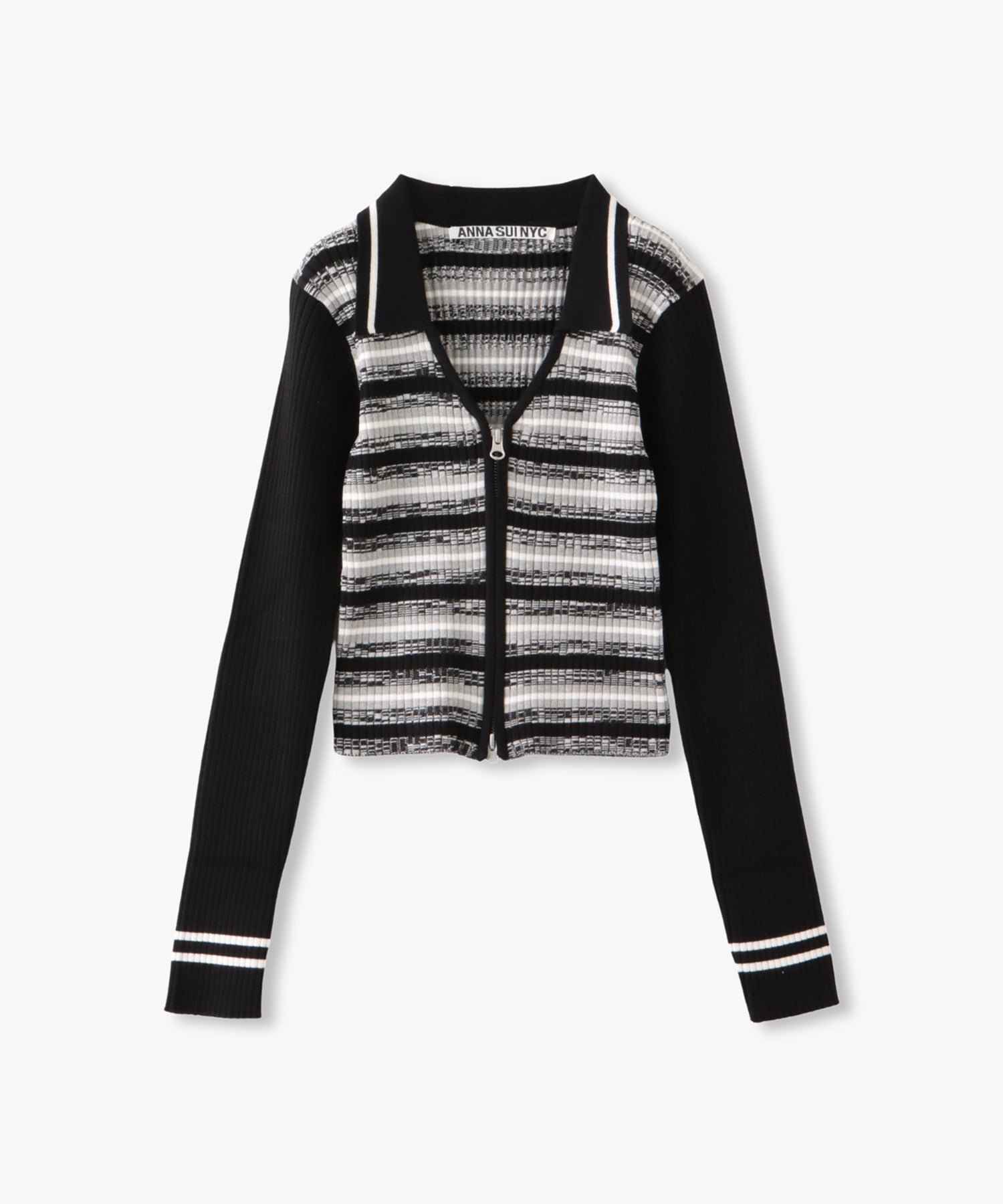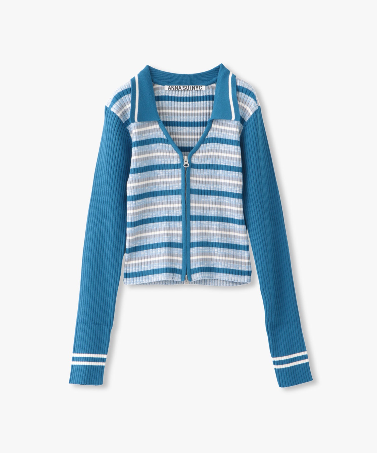 ANNA SUI NYCらしいPOPな配色ボーダーのフロントジップニットカーディガン。Y2Kライクなタイトなサイジングで全体のバランスが取りやすく、ほどよい厚みがこれからの季節に大活躍間違いなしの1枚です◎ファスナーはダブルジップで、スタイリングに合わせて開けたり閉めたり、自由自在に開きのバランスを調節していただけます。