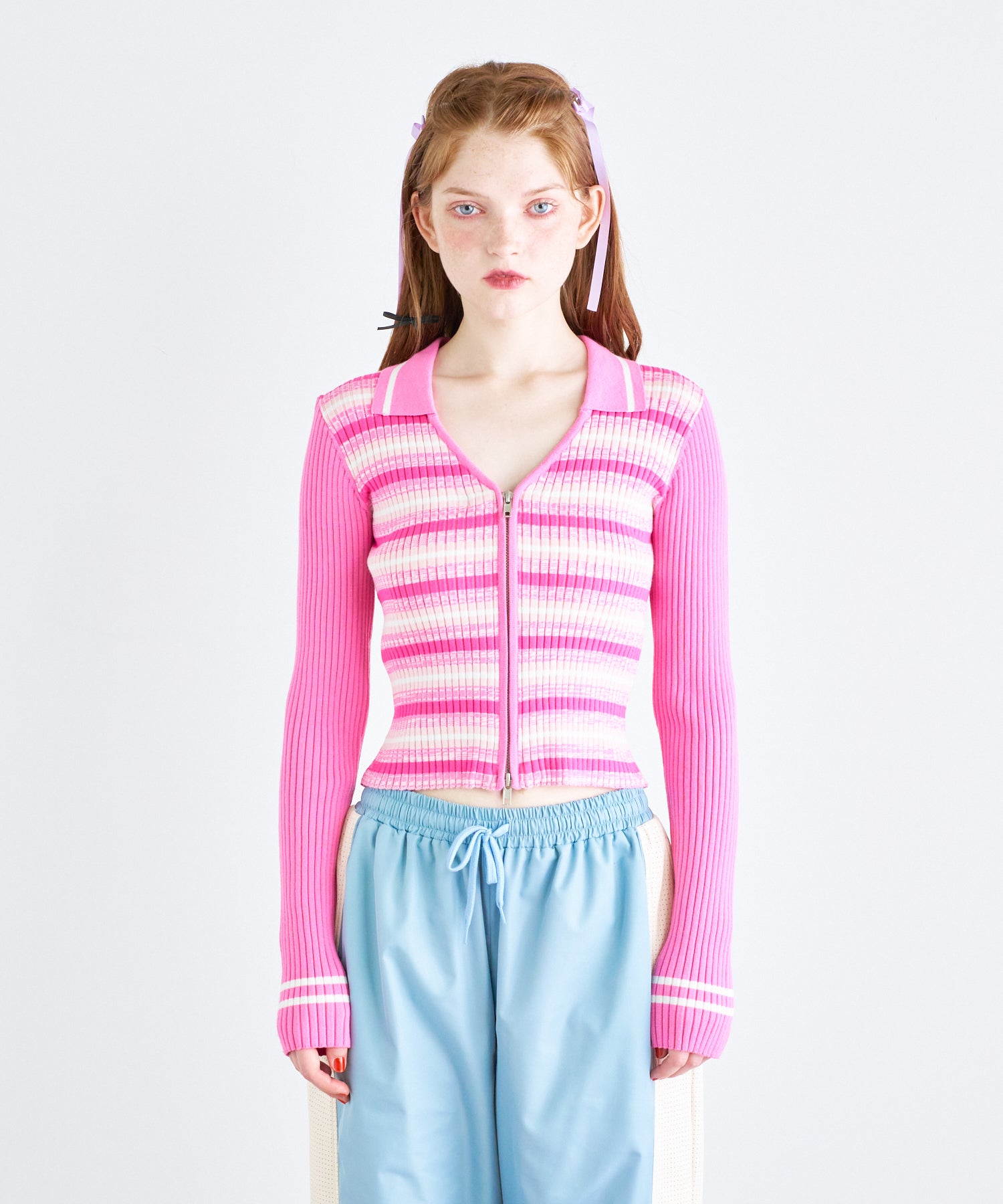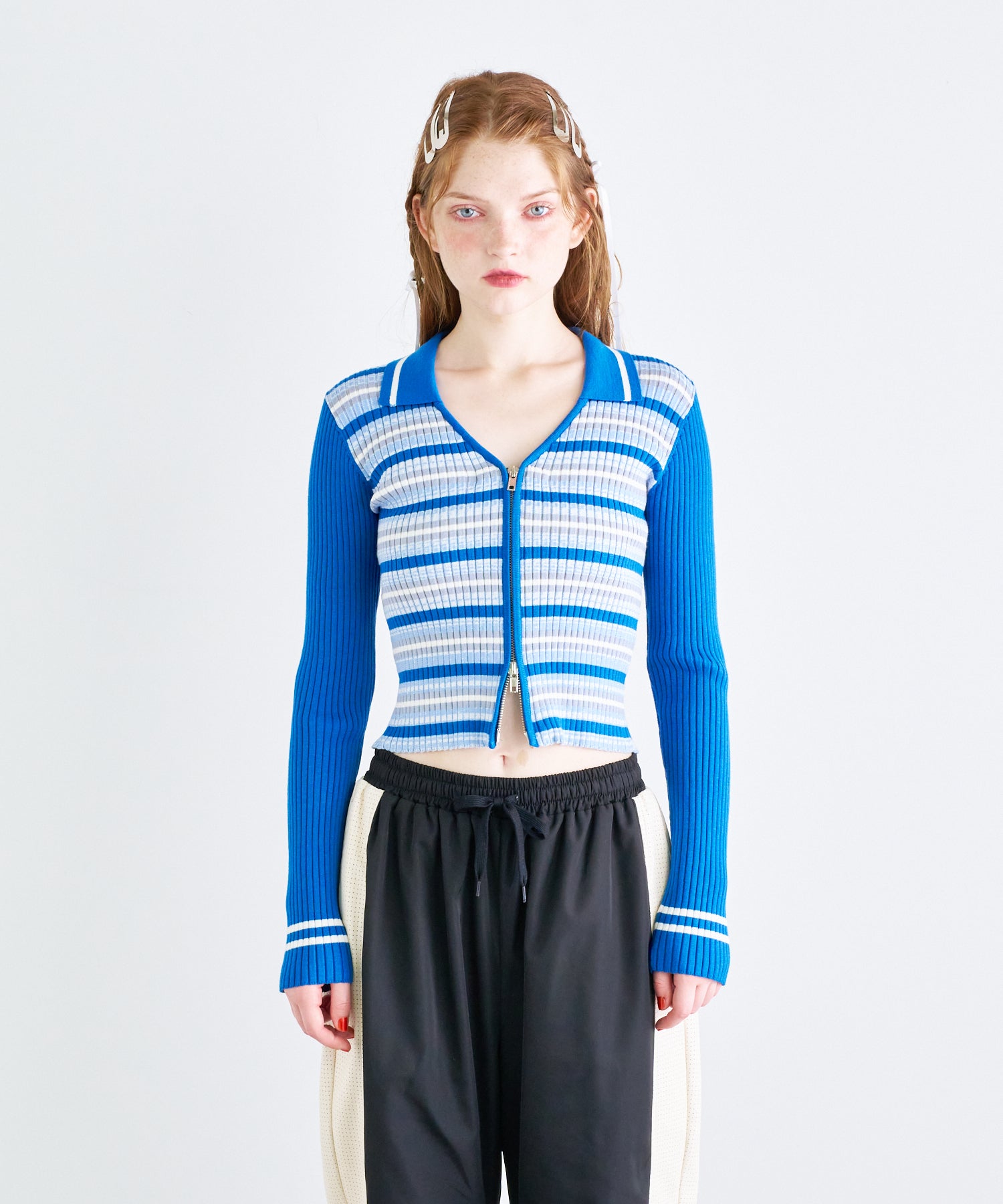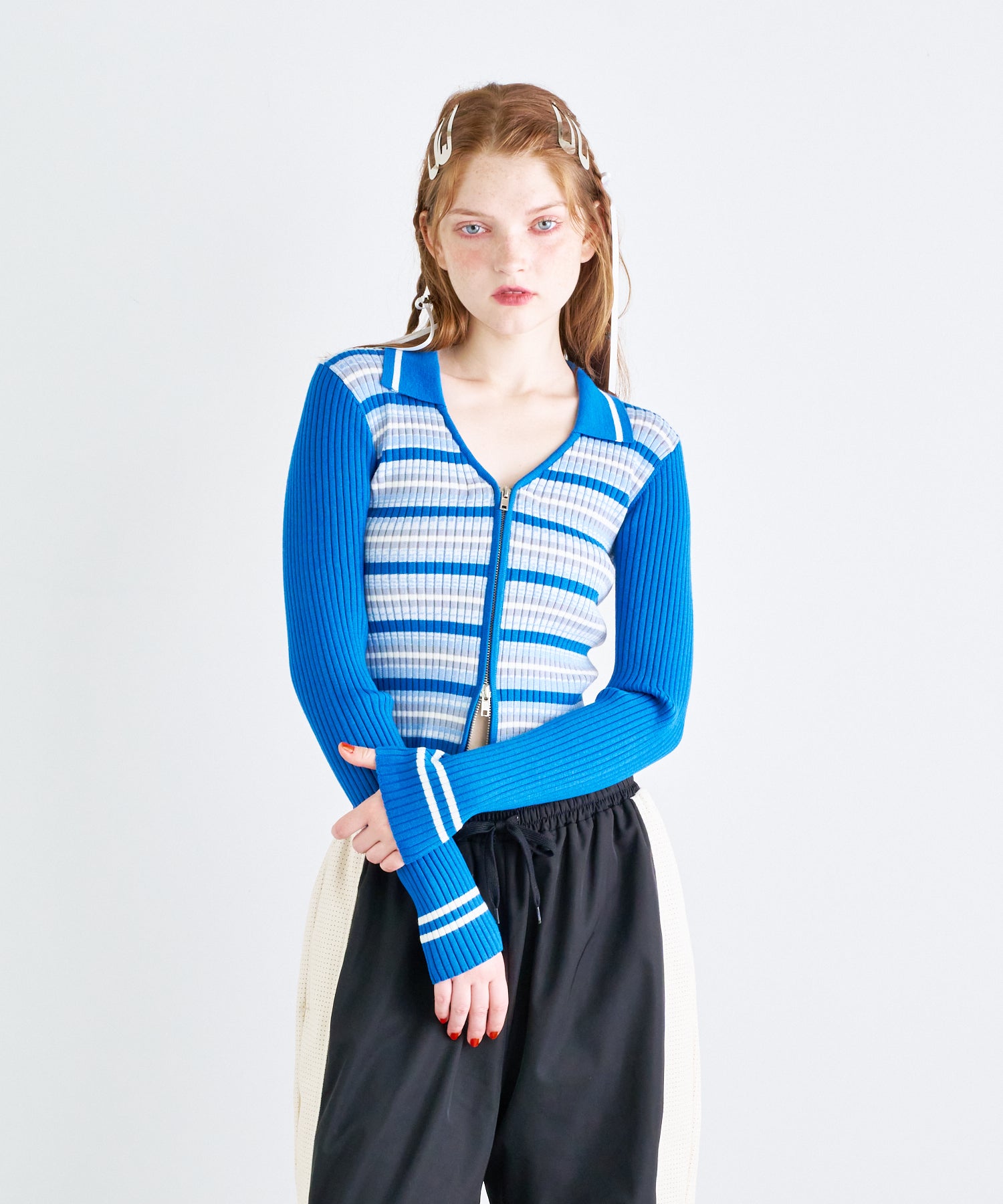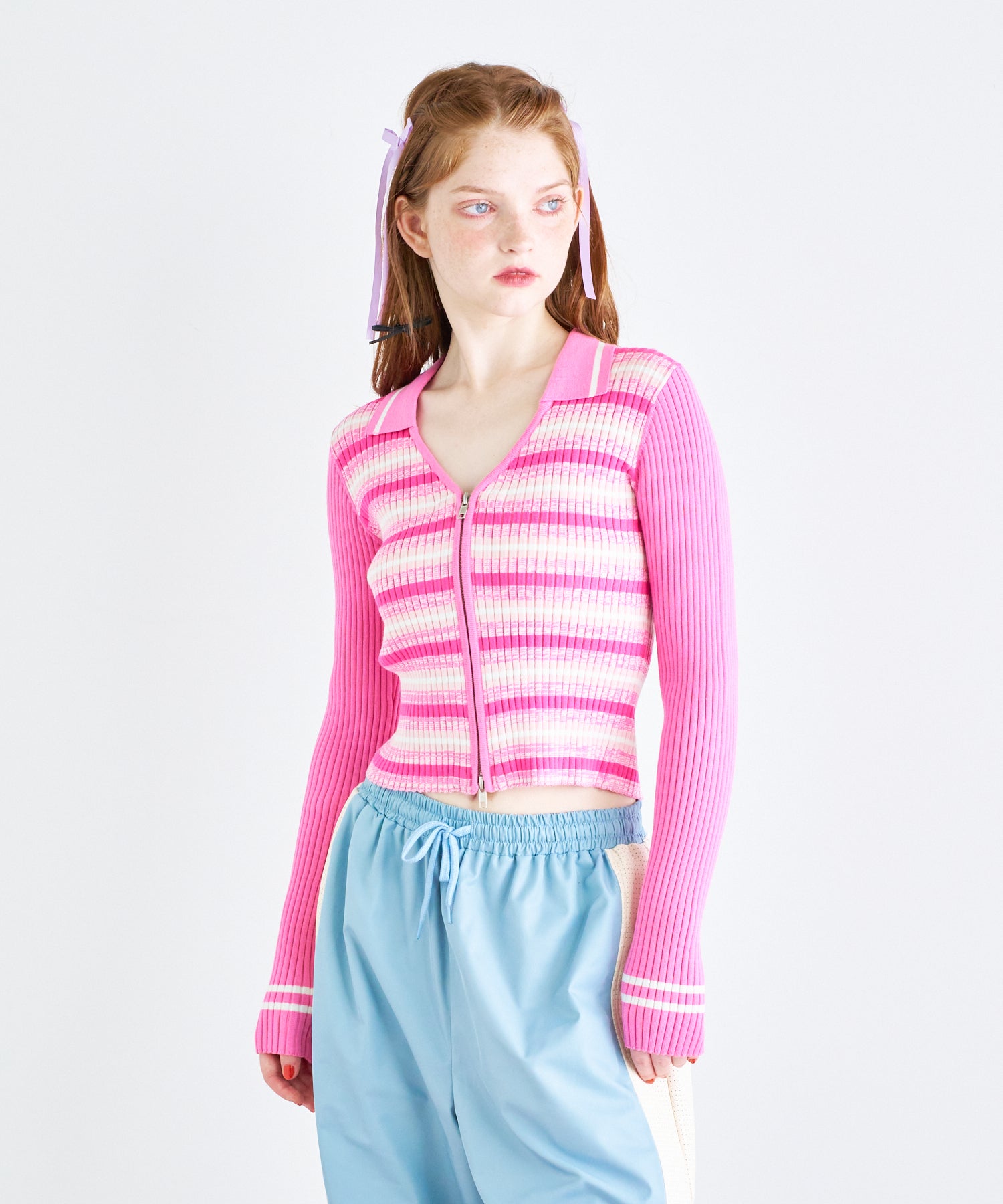 ANNA SUI NYCらしいPOPな配色ボーダーのフロントジップニットカーディガン。Y2Kライクなタイトなサイジングで全体のバランスが取りやすく、ほどよい厚みがこれからの季節に大活躍間違いなしの1枚です◎ファスナーはダブルジップで、スタイリングに合わせて開けたり閉めたり、自由自在に開きのバランスを調節していただけます。