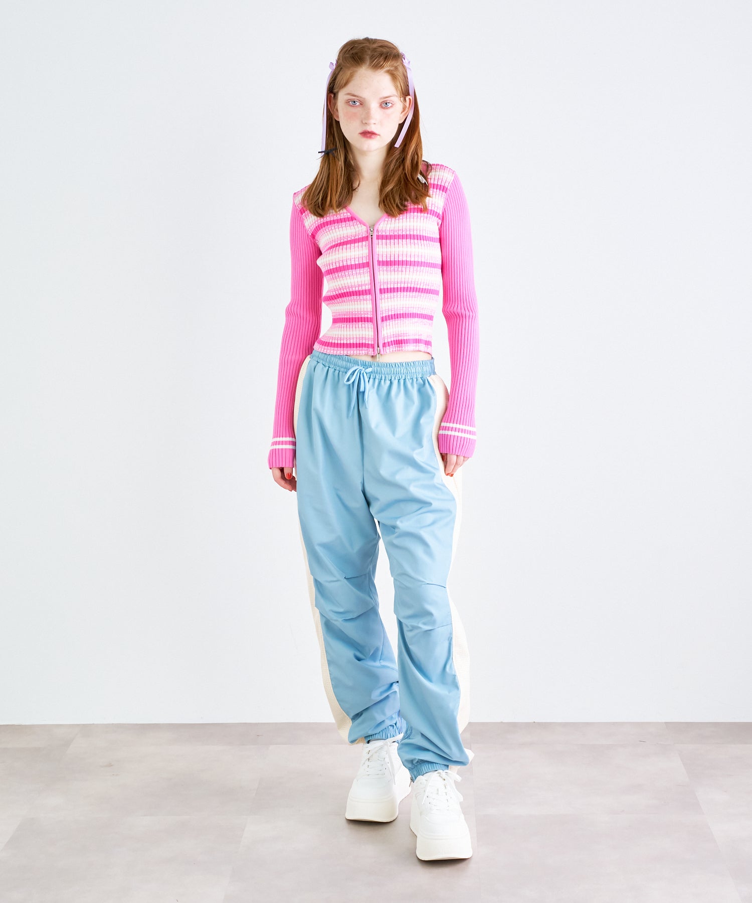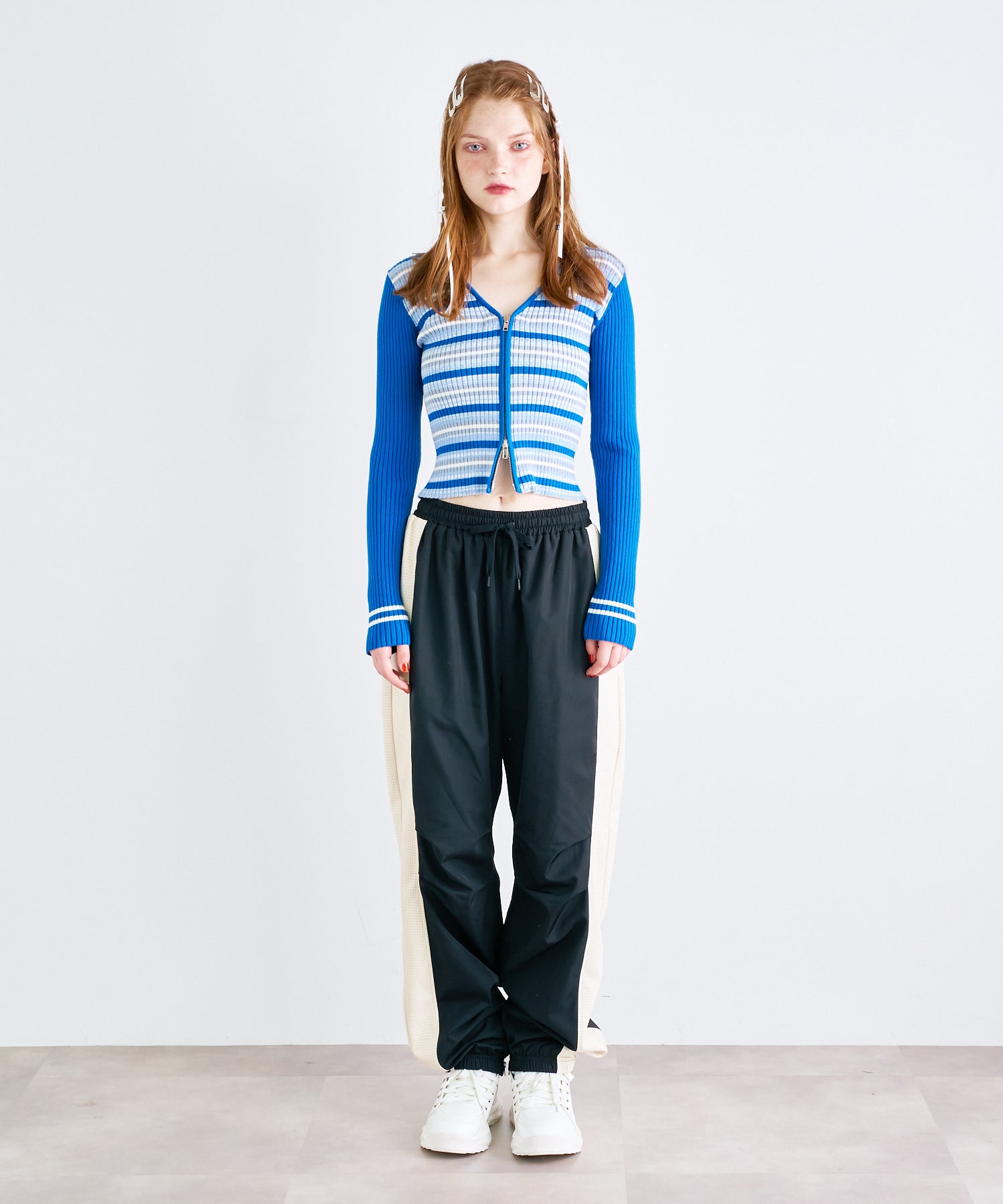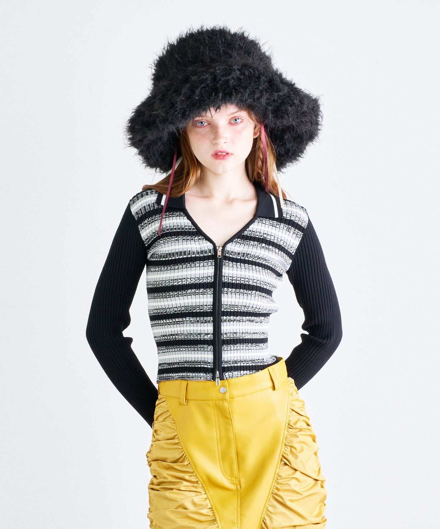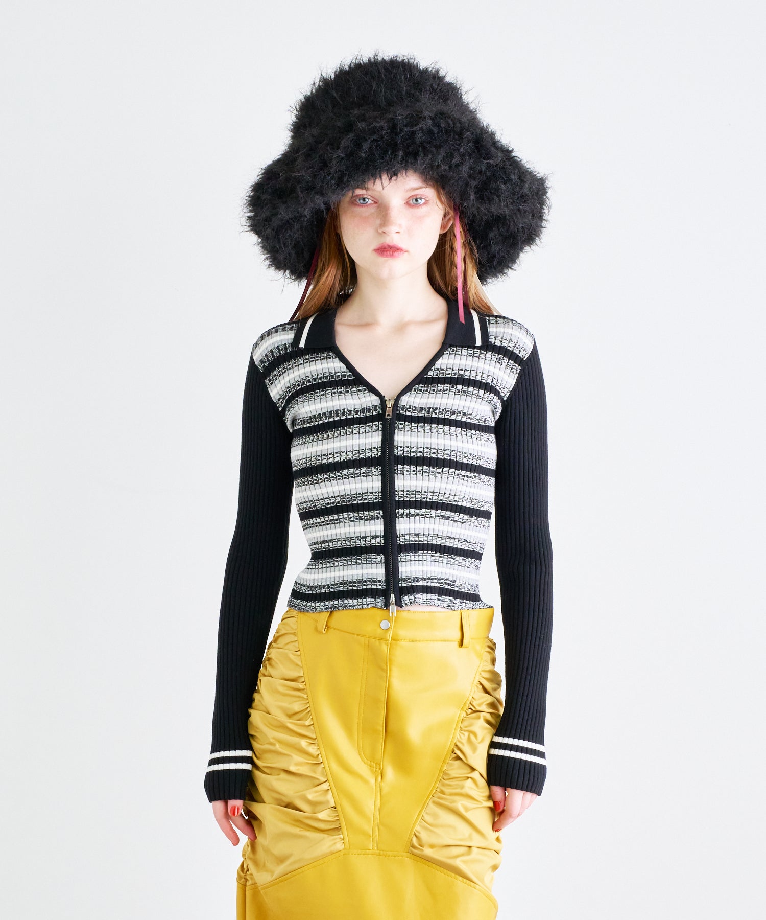 ANNA SUI NYCらしいPOPな配色ボーダーのフロントジップニットカーディガン。Y2Kライクなタイトなサイジングで全体のバランスが取りやすく、ほどよい厚みがこれからの季節に大活躍間違いなしの1枚です◎ファスナーはダブルジップで、スタイリングに合わせて開けたり閉めたり、自由自在に開きのバランスを調節していただけます。