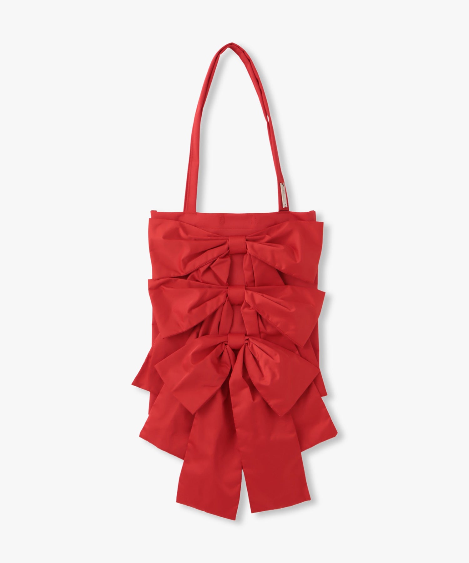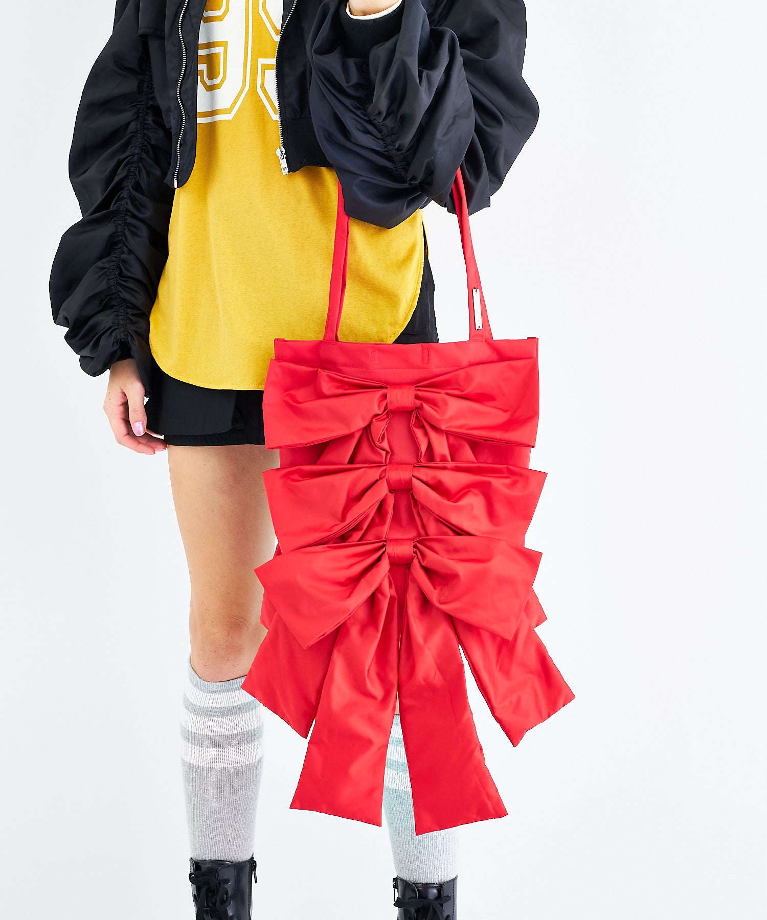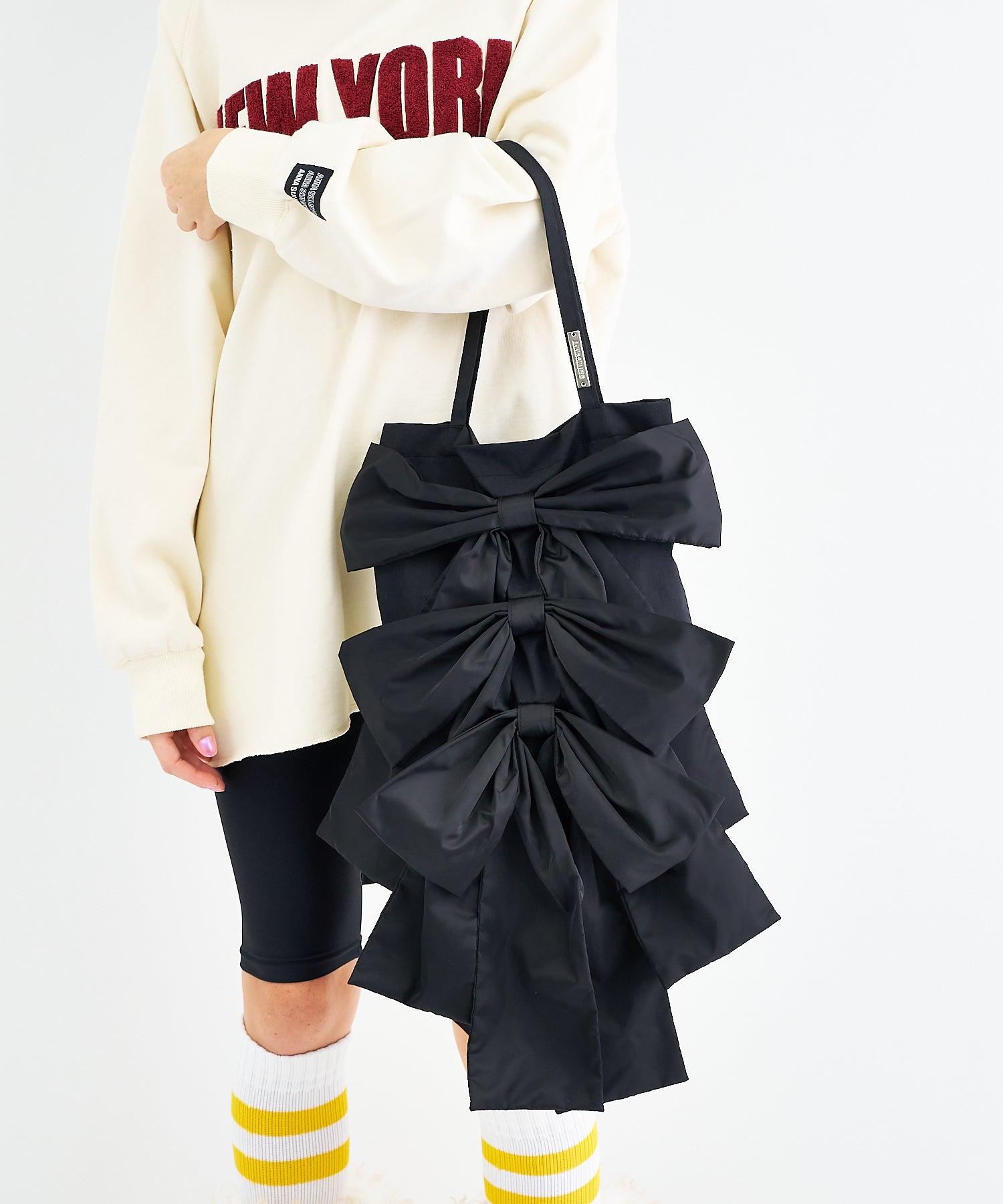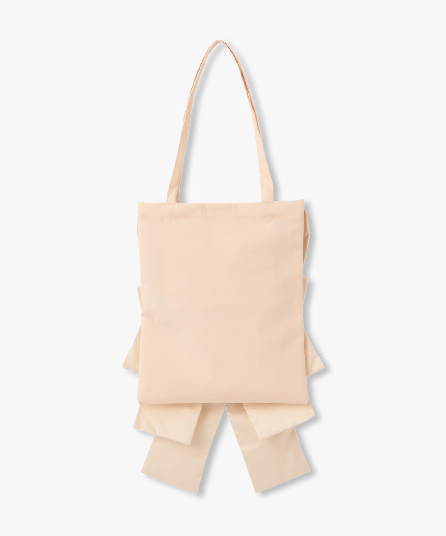 フロントの大きな3つのリボンがインパクト大!なフラットトートバック。ハリ感のある素材を使用し、立体感のあるリボンに仕上げました。A4サイズも収納可能で、サブバックにもおすすめです◎