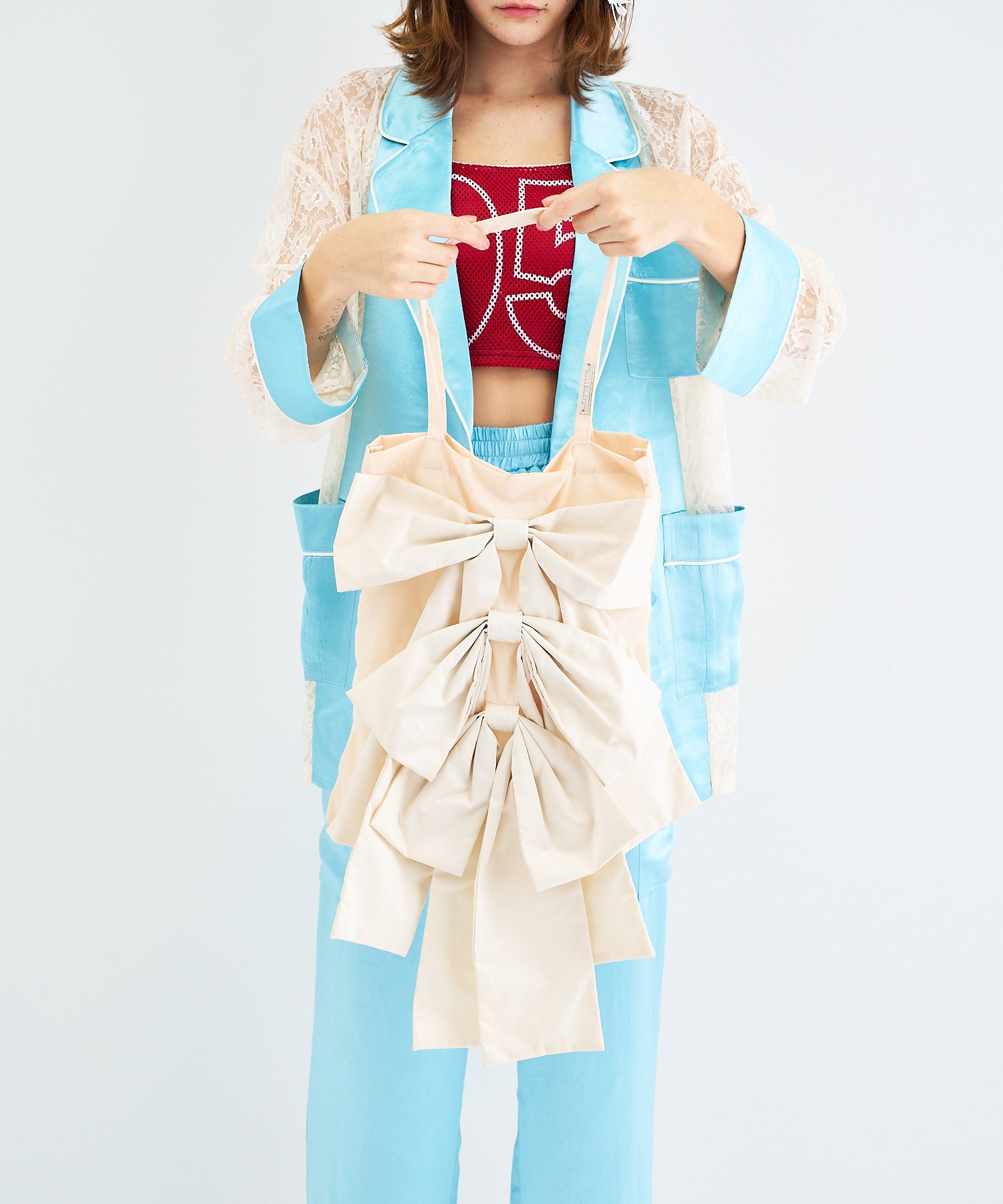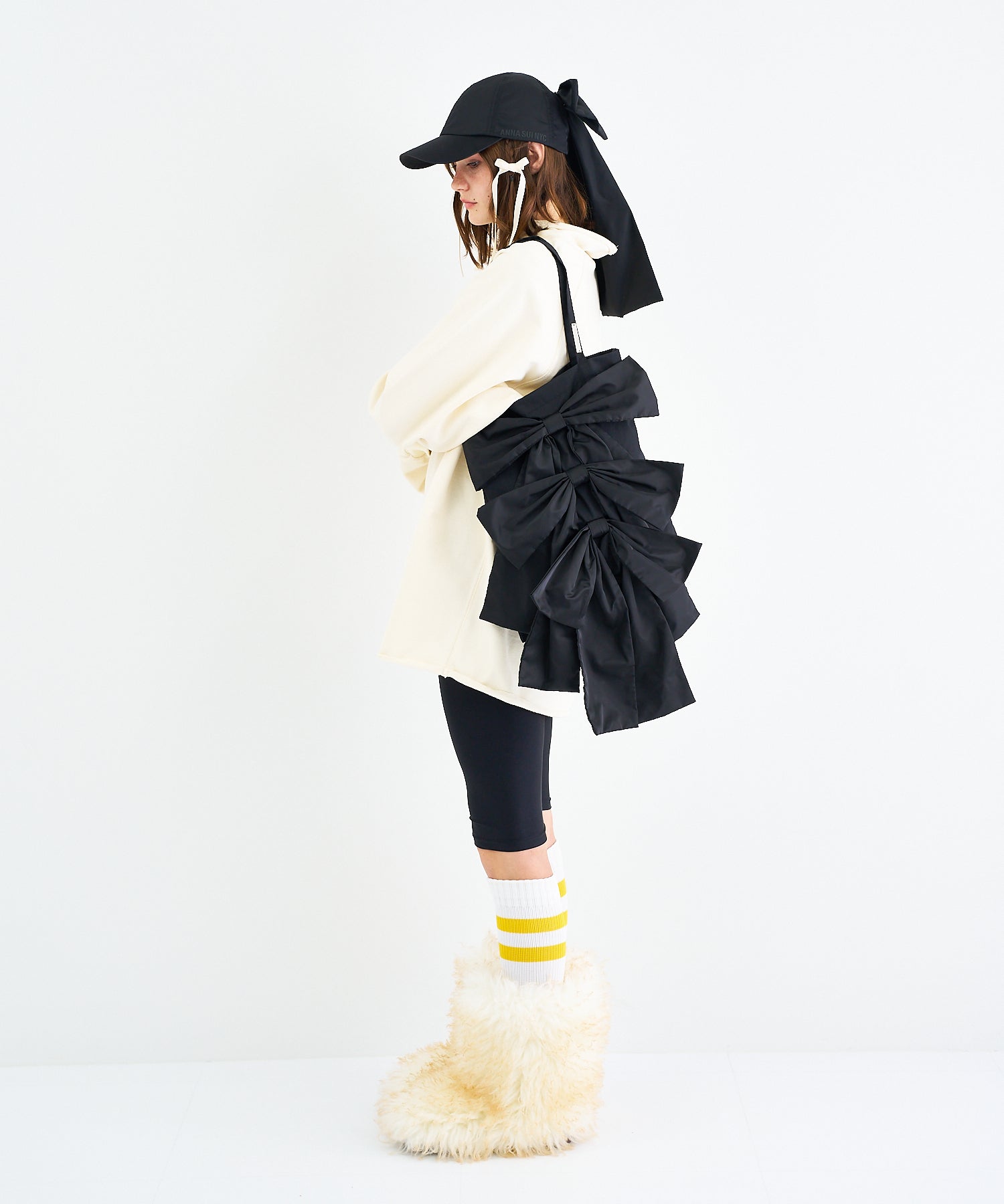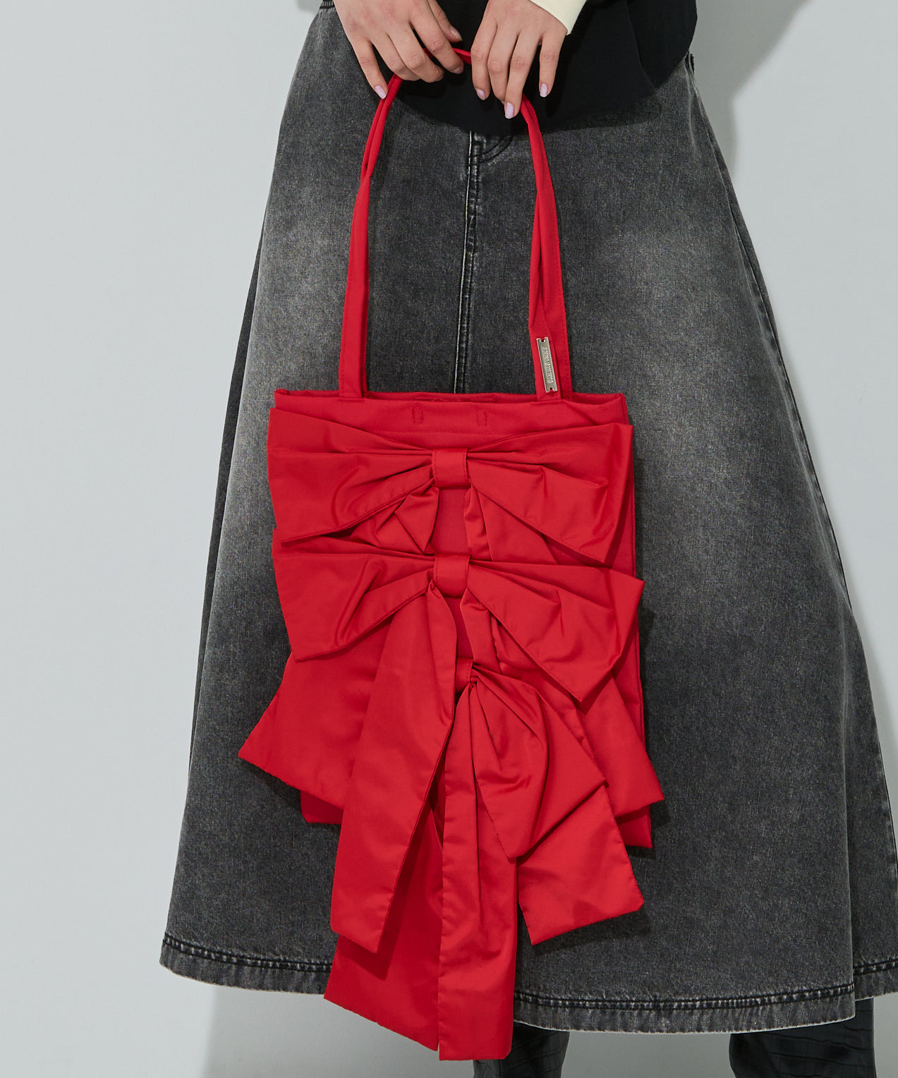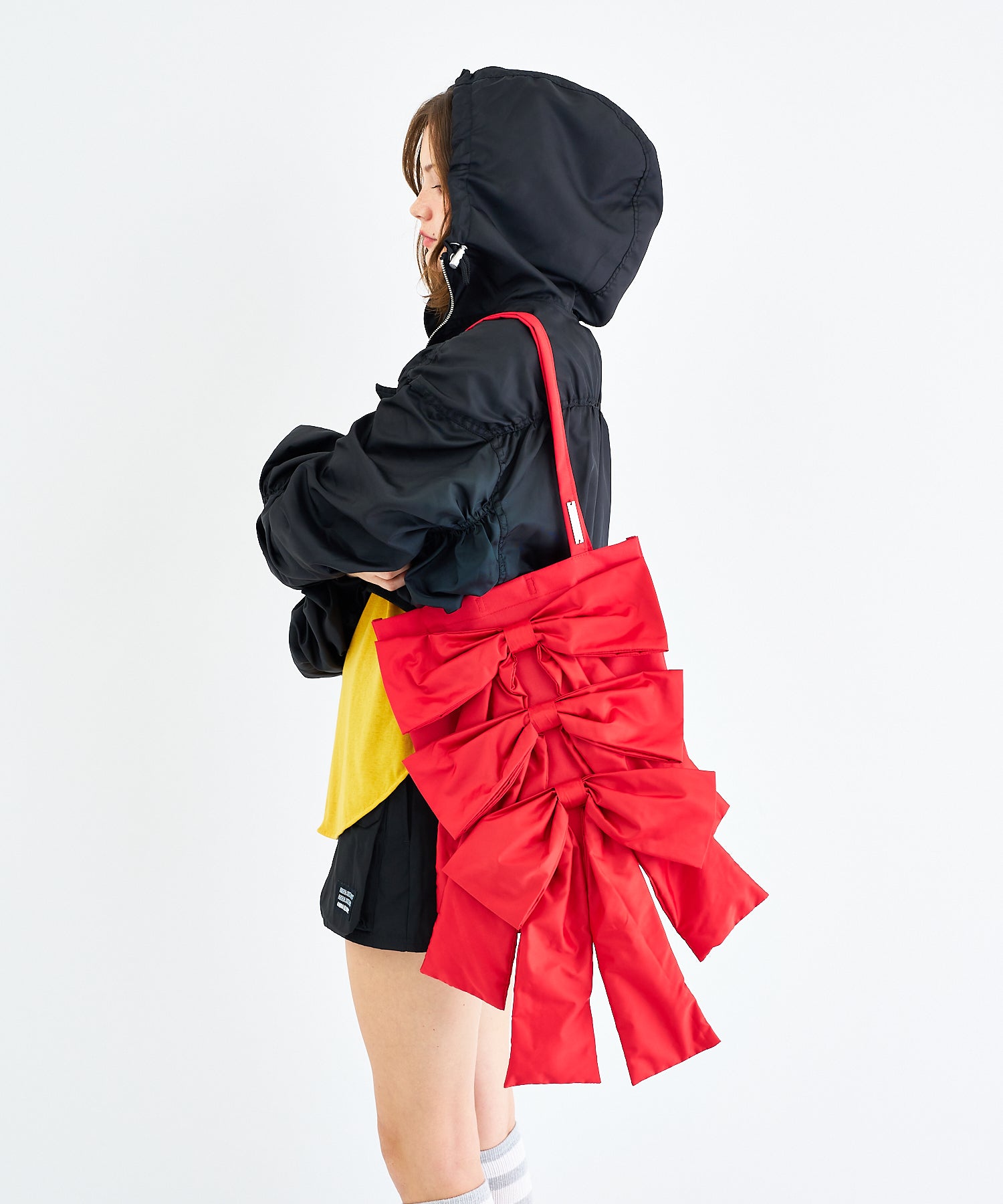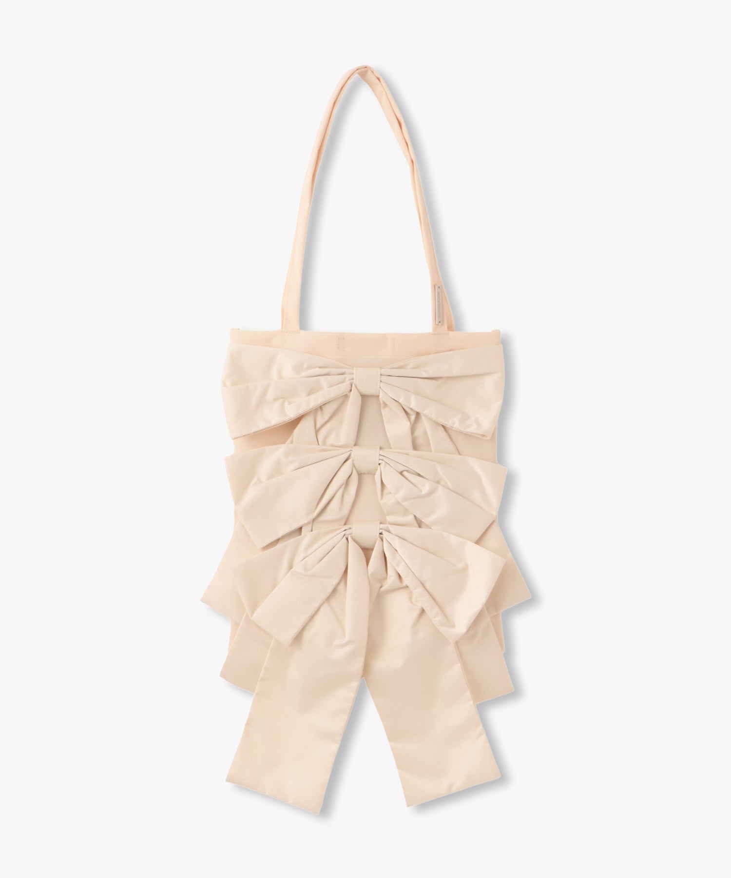 フロントの大きな3つのリボンがインパクト大!なフラットトートバック。ハリ感のある素材を使用し、立体感のあるリボンに仕上げました。A4サイズも収納可能で、サブバックにもおすすめです◎