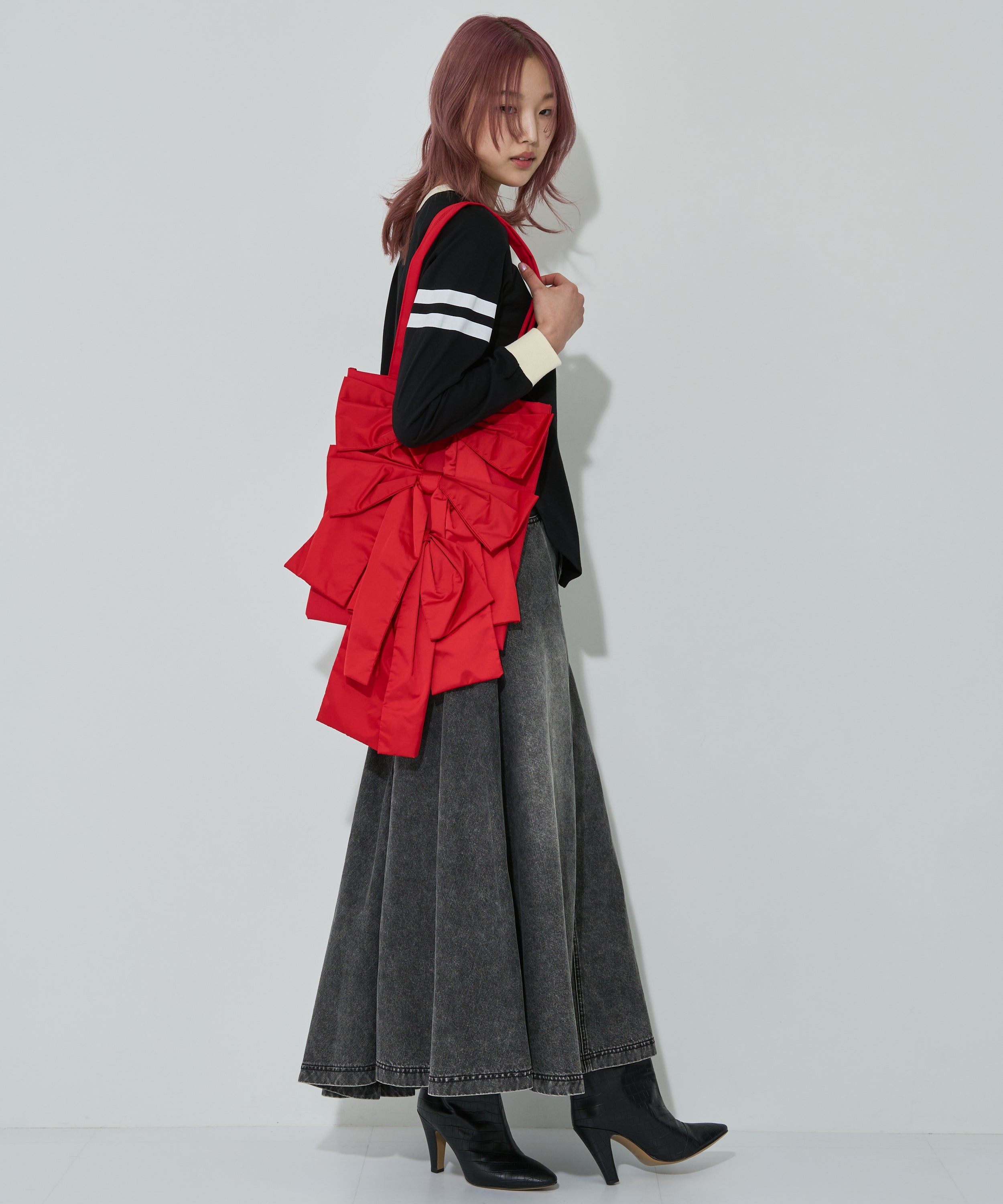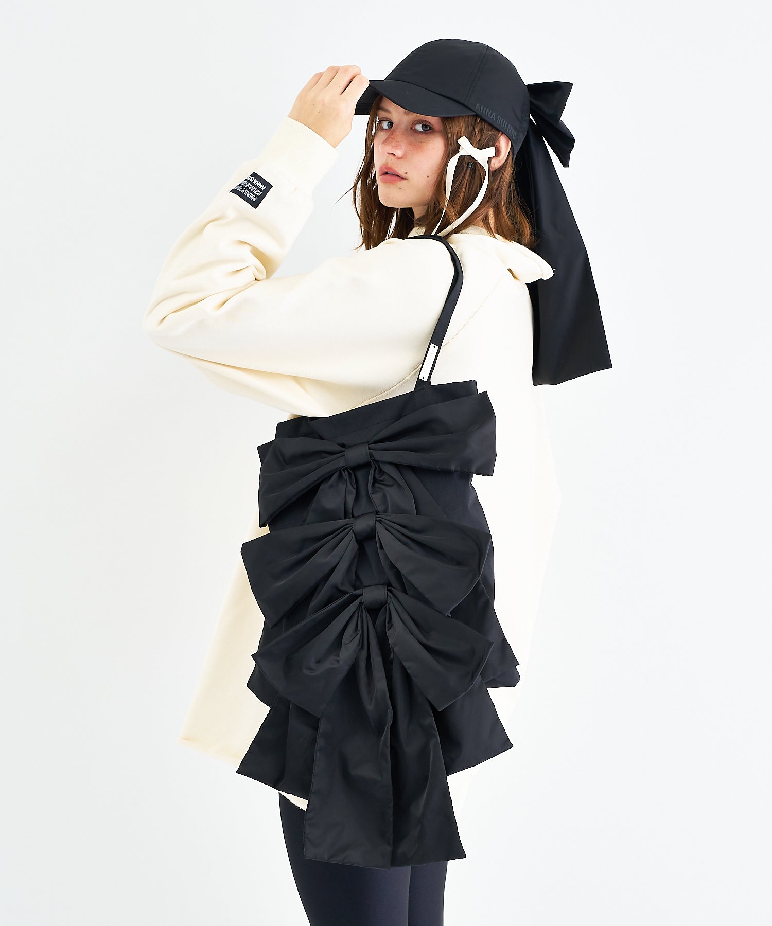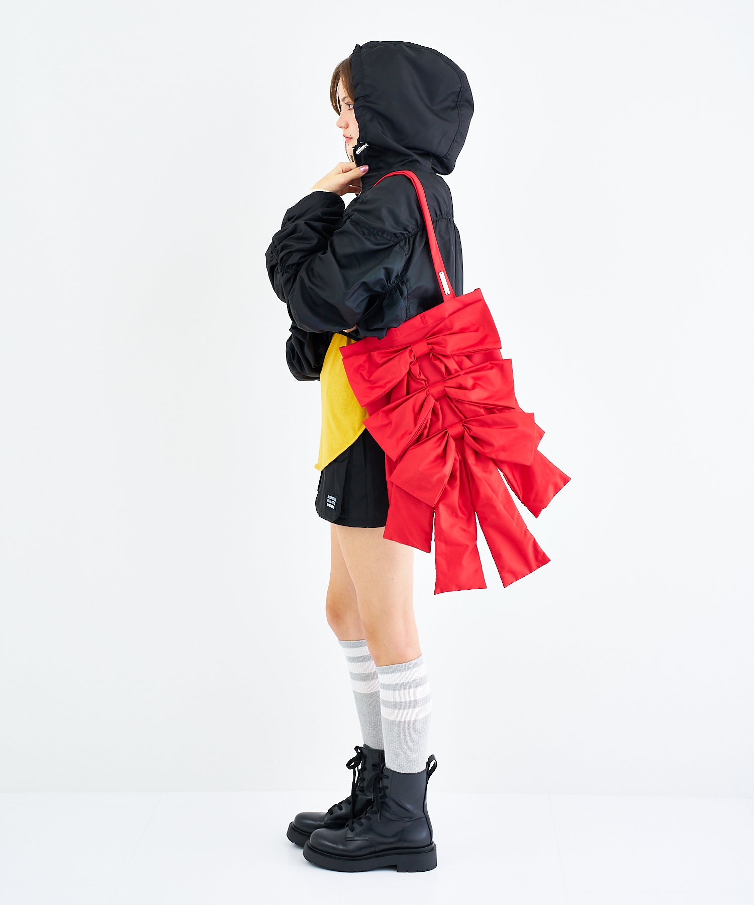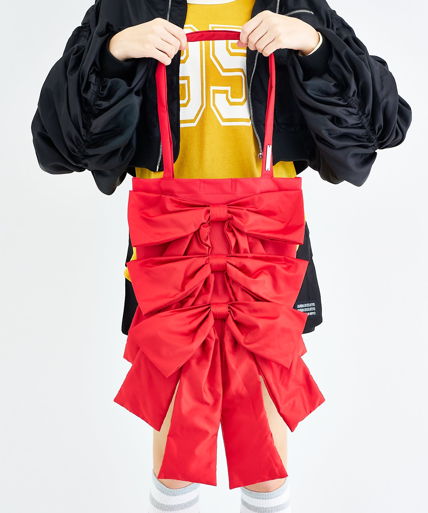 フロントの大きな3つのリボンがインパクト大!なフラットトートバック。ハリ感のある素材を使用し、立体感のあるリボンに仕上げました。A4サイズも収納可能で、サブバックにもおすすめです◎