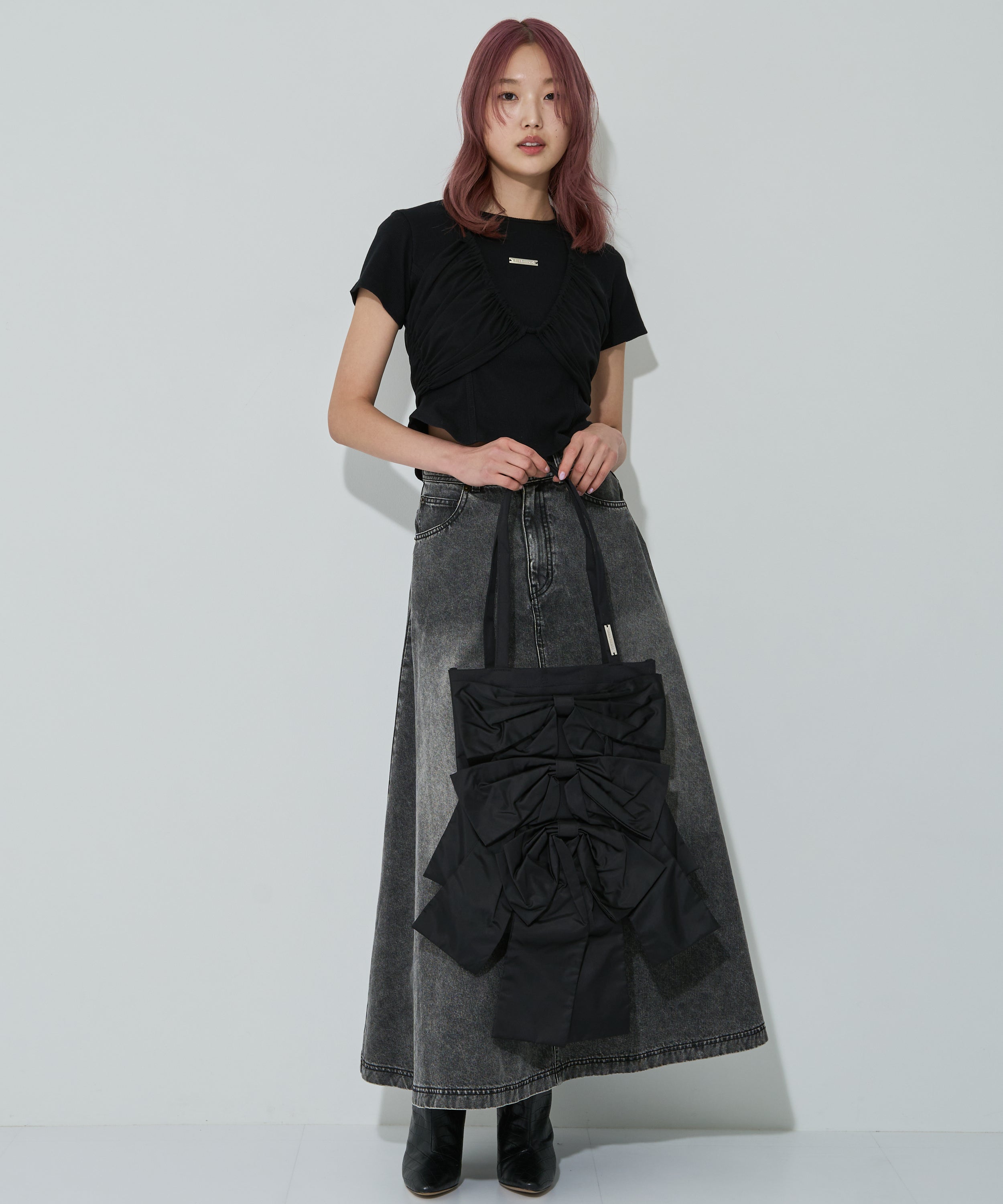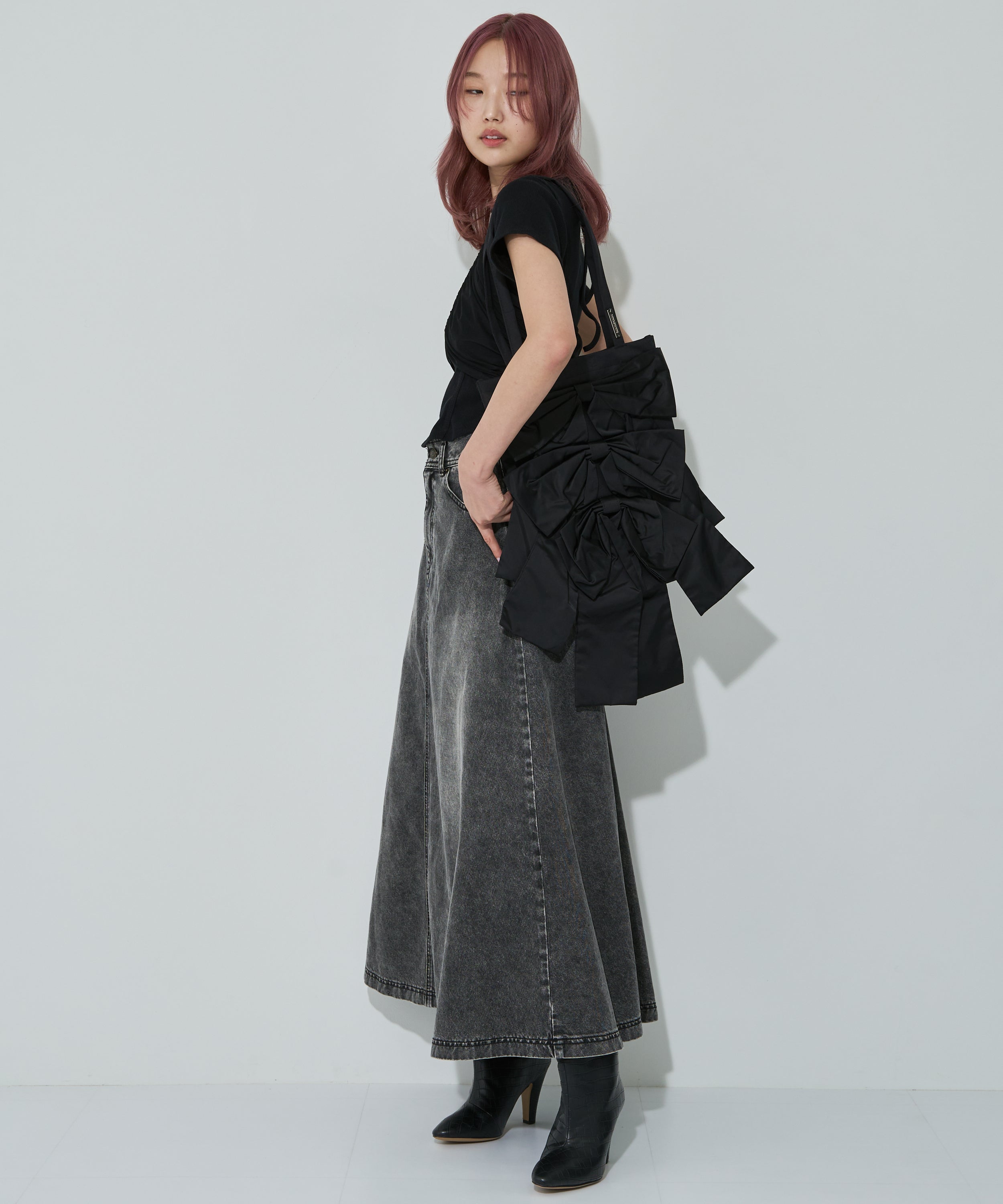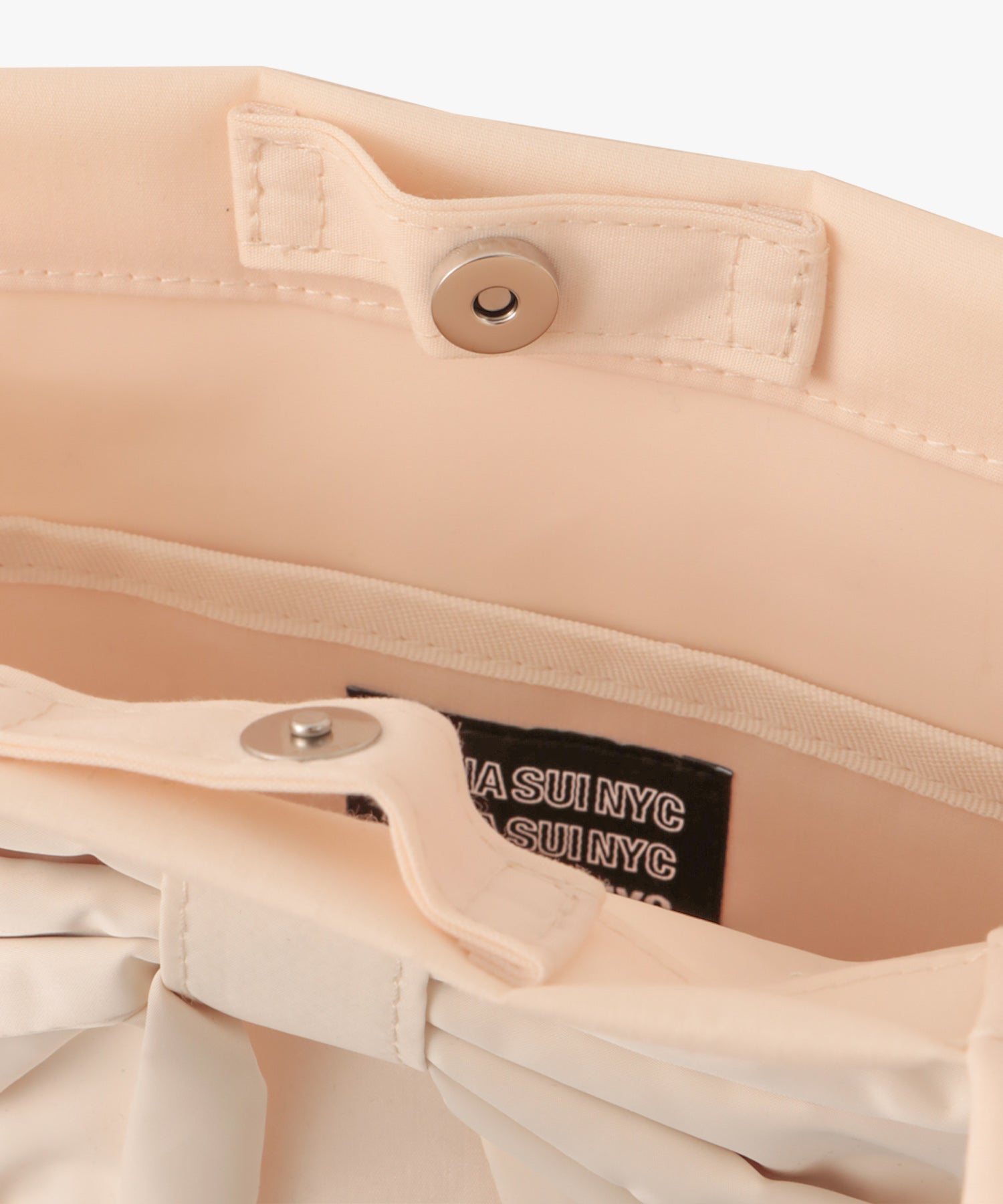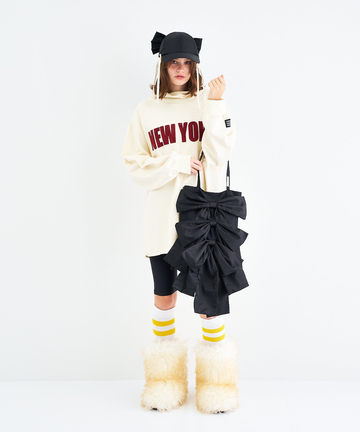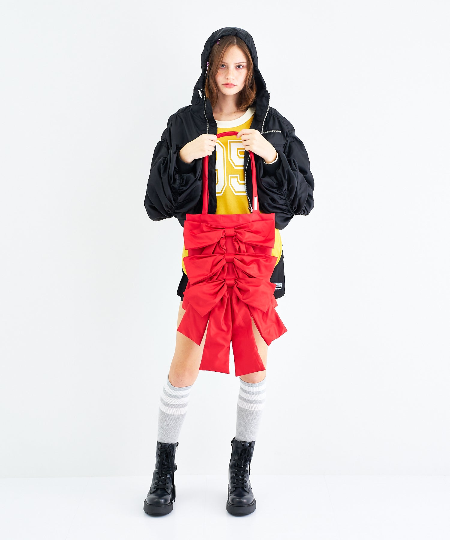 フロントの大きな3つのリボンがインパクト大!なフラットトートバック。ハリ感のある素材を使用し、立体感のあるリボンに仕上げました。A4サイズも収納可能で、サブバックにもおすすめです◎