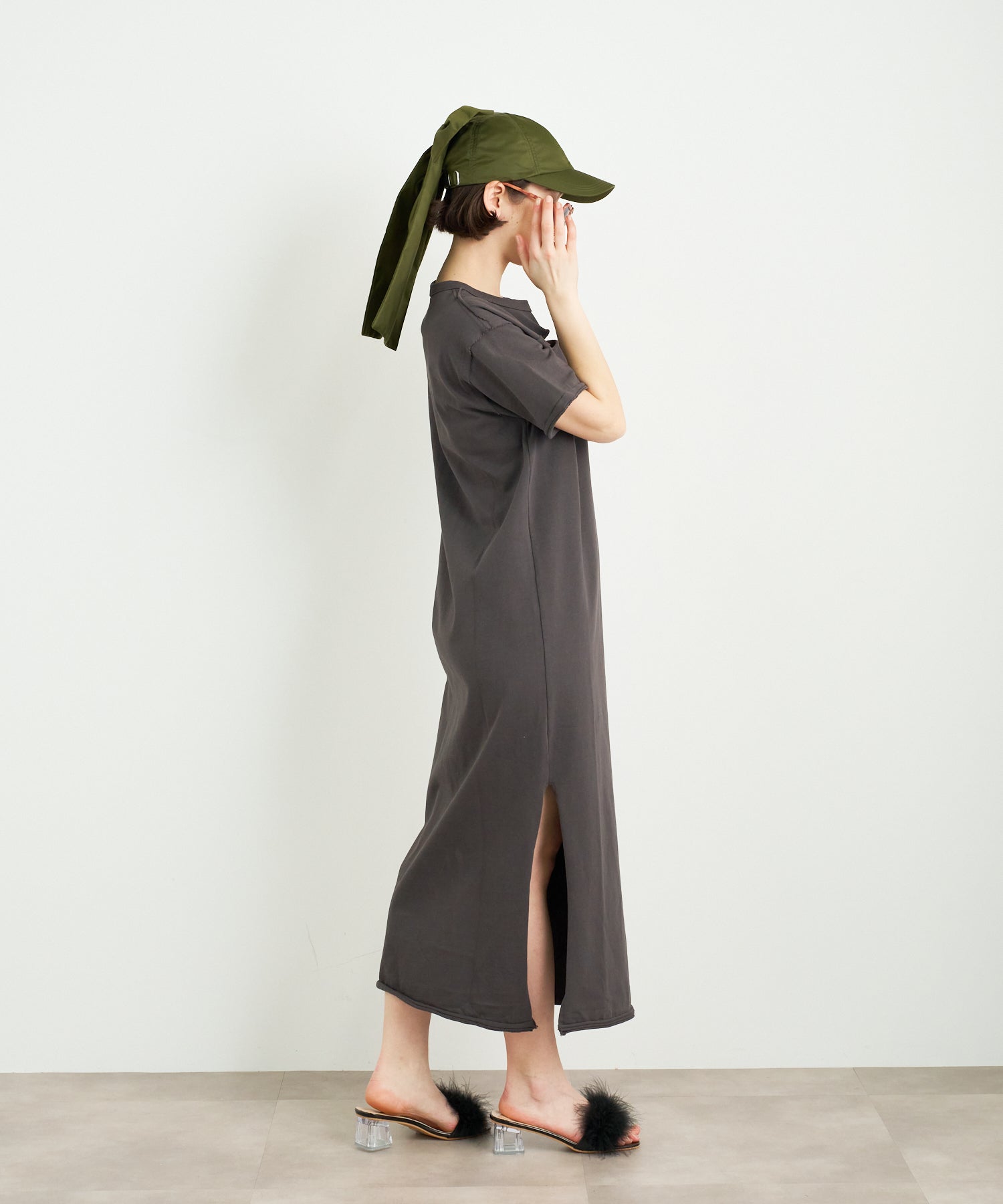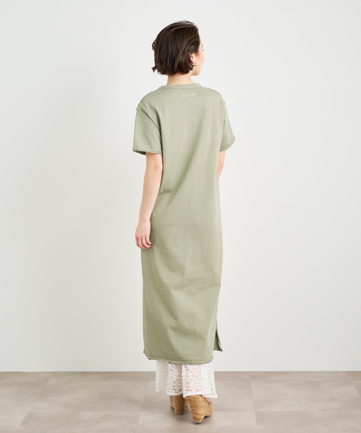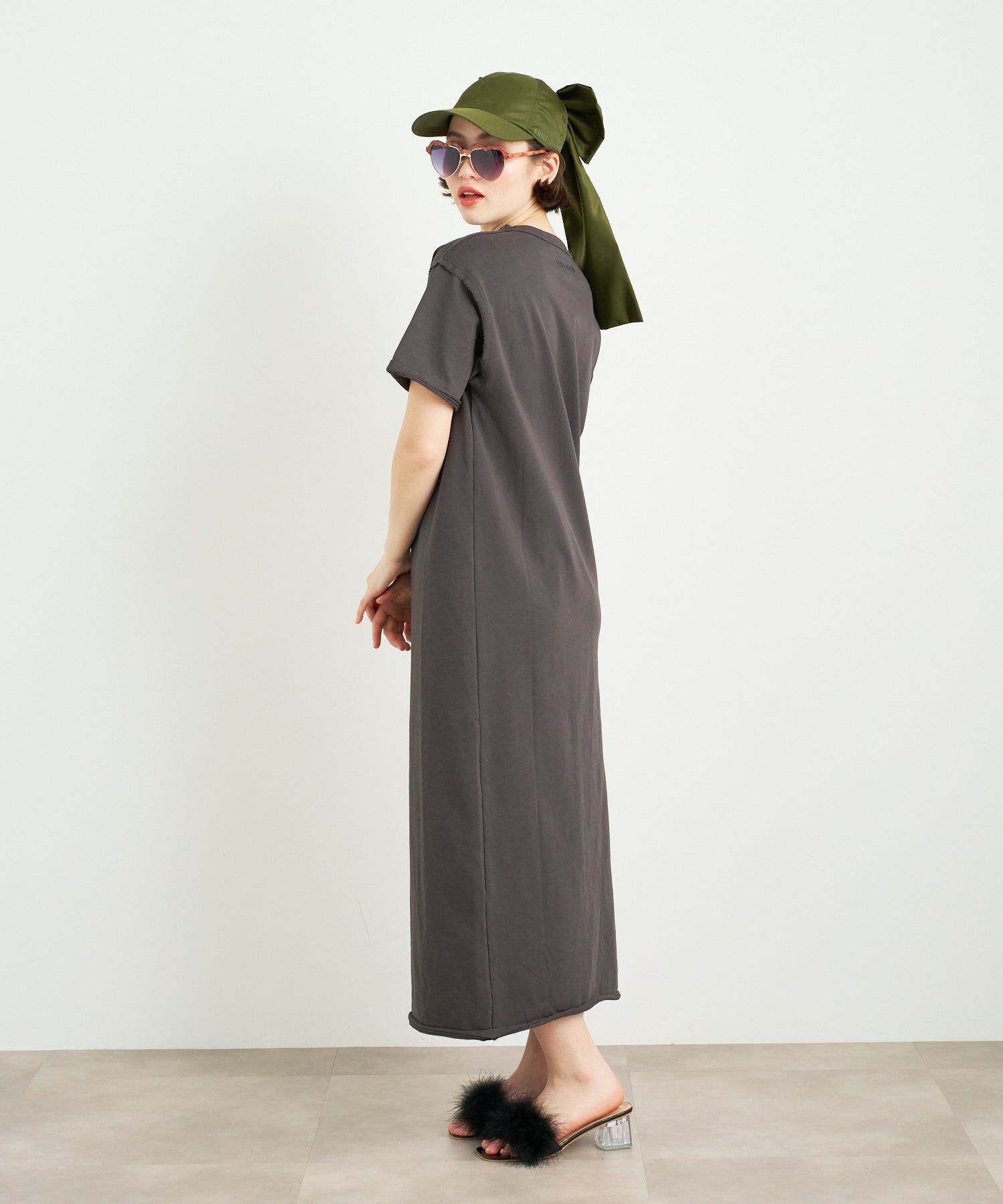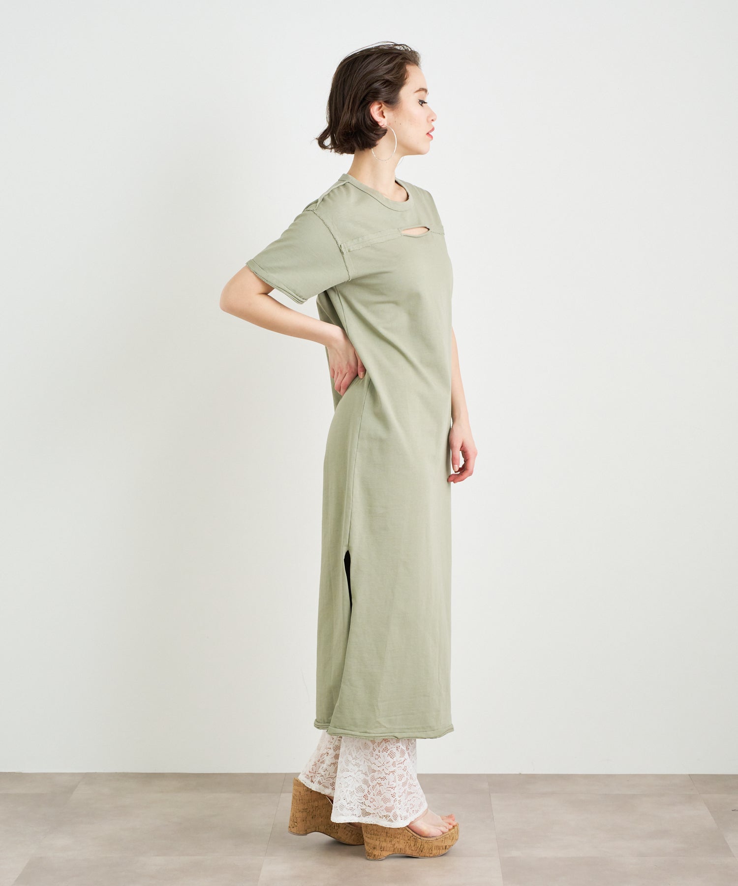 加工感が今っぽいTシャツワンピ。胸元のヘルシーな肌見せやドロップショルダーシルエットが程よい抜け感を演出してくれます◎アイテム自体に表情感がある為、1枚で着ても様になるアイテムです。