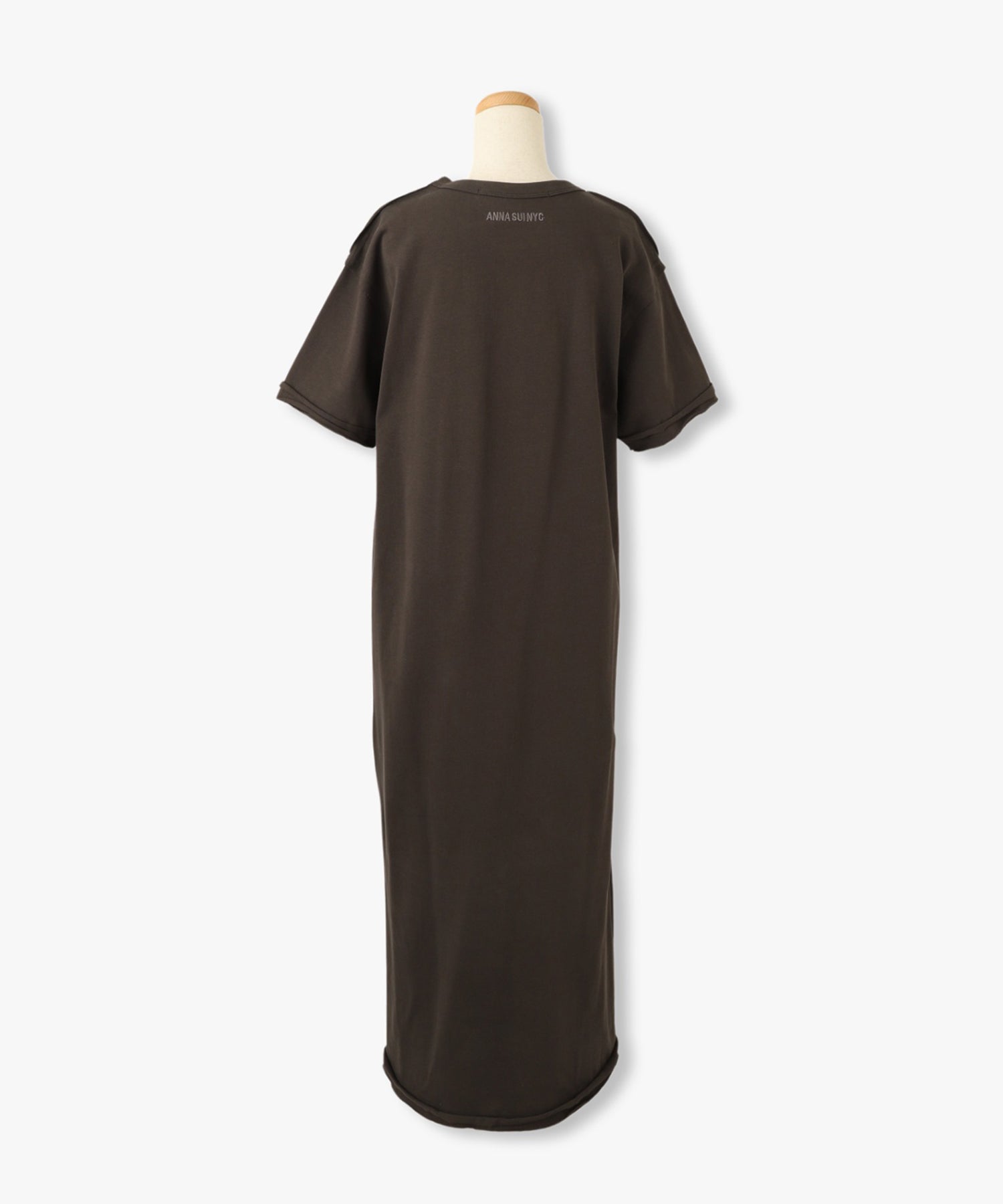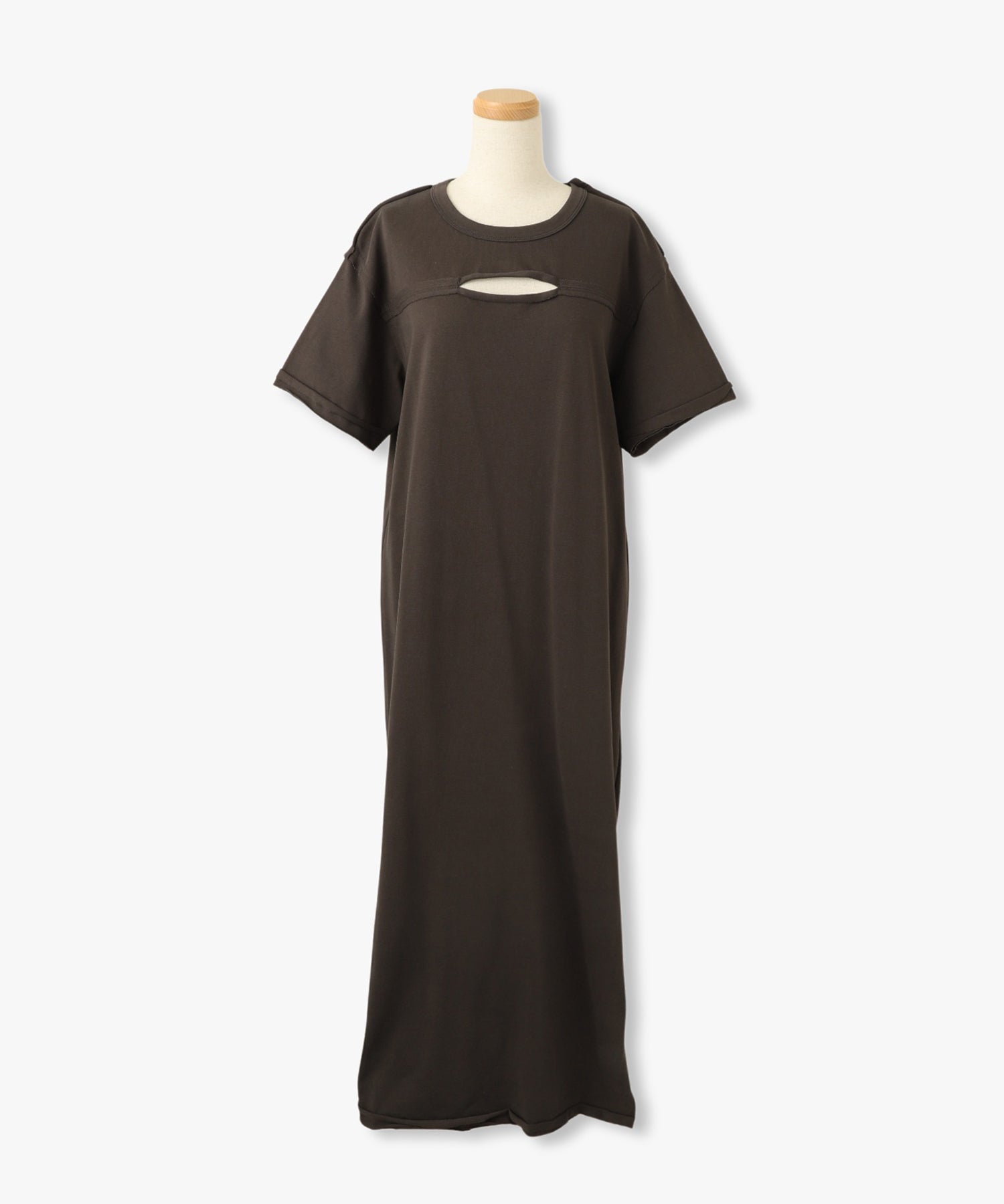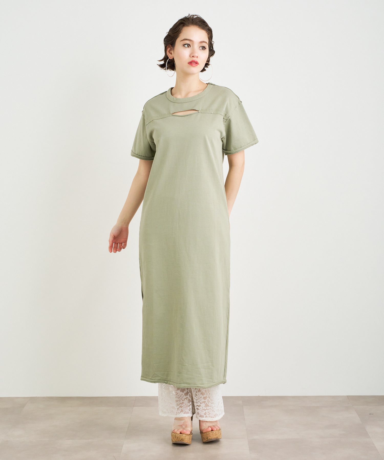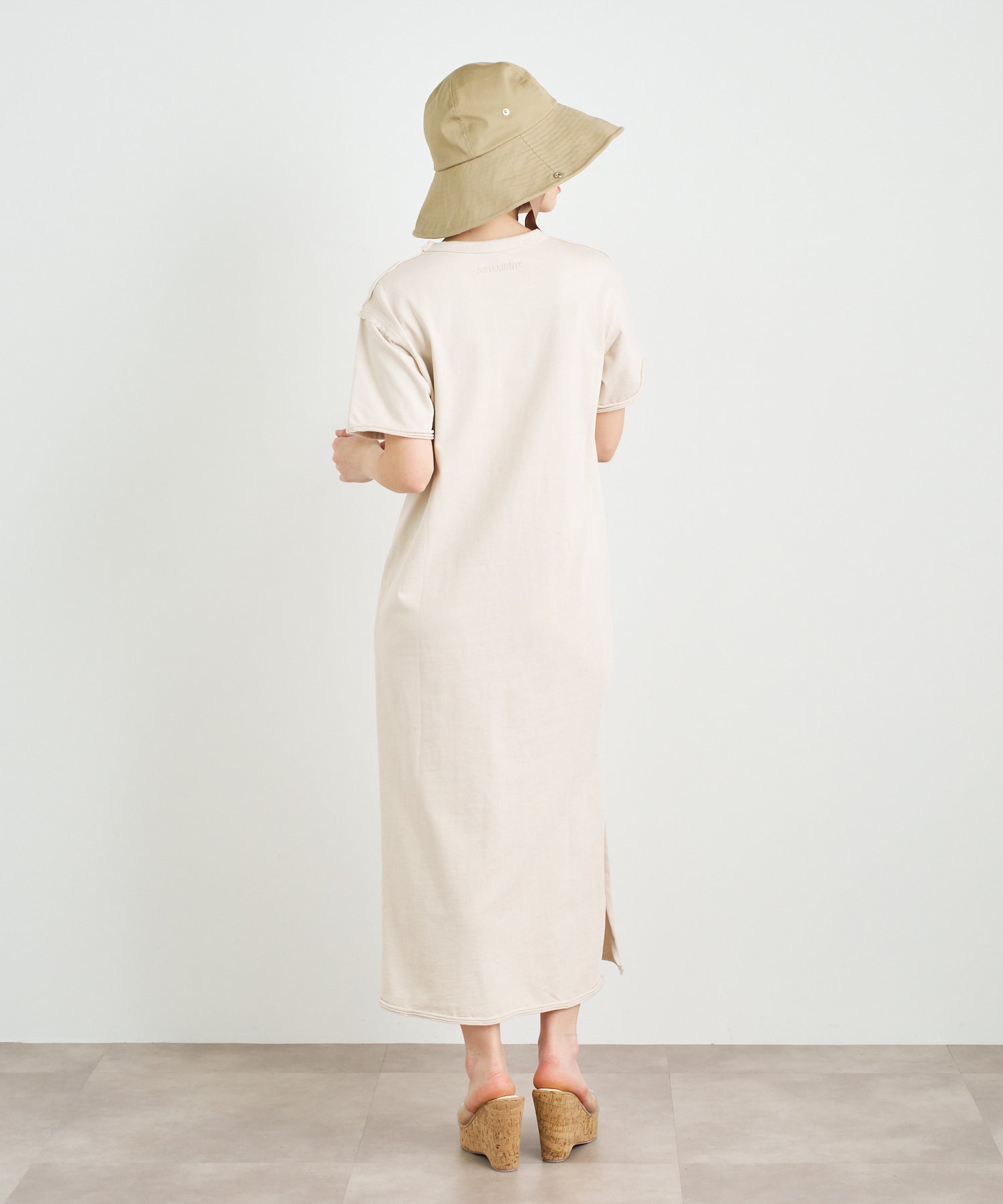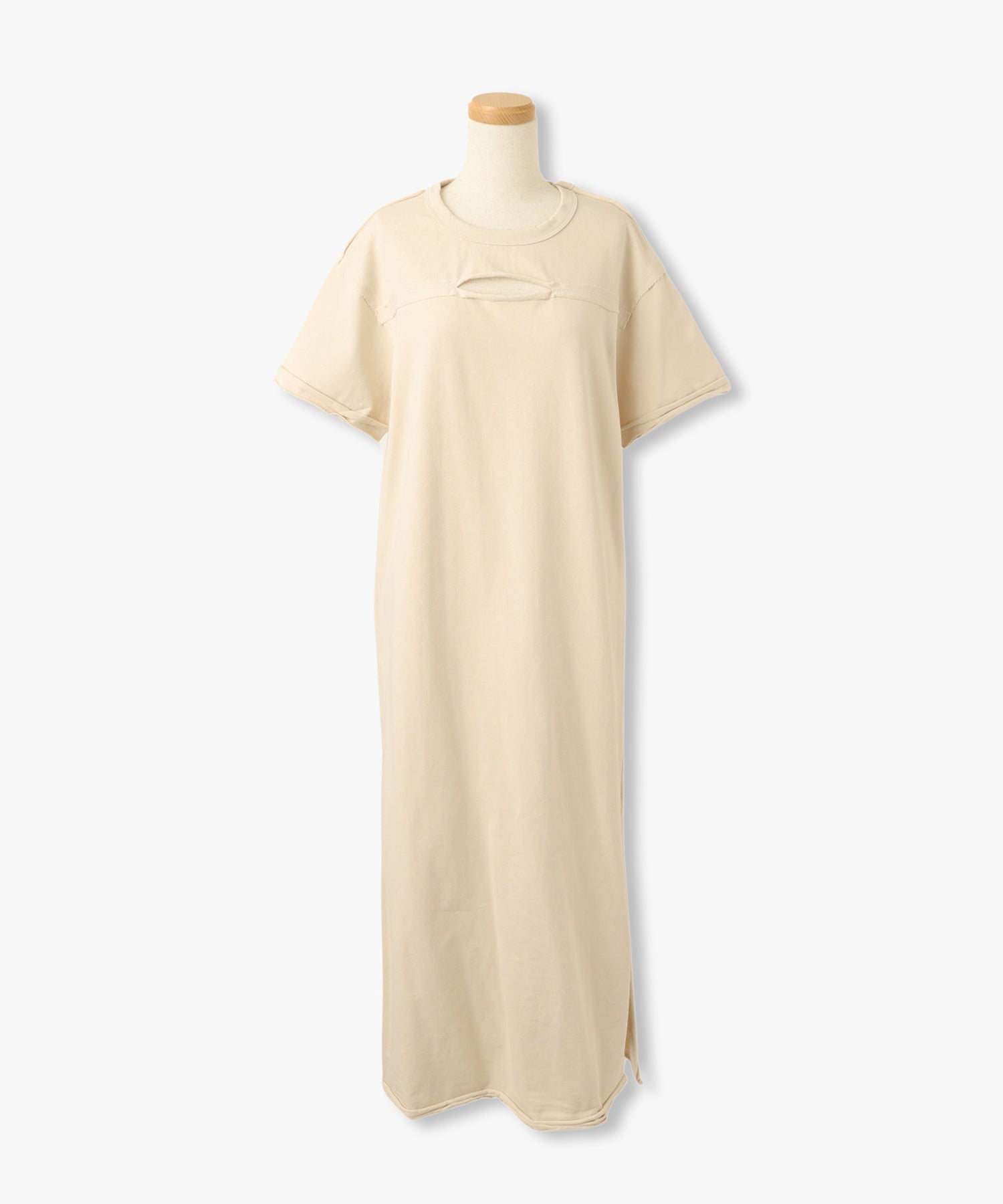 加工感が今っぽいTシャツワンピ。胸元のヘルシーな肌見せやドロップショルダーシルエットが程よい抜け感を演出してくれます◎アイテム自体に表情感がある為、1枚で着ても様になるアイテムです。
