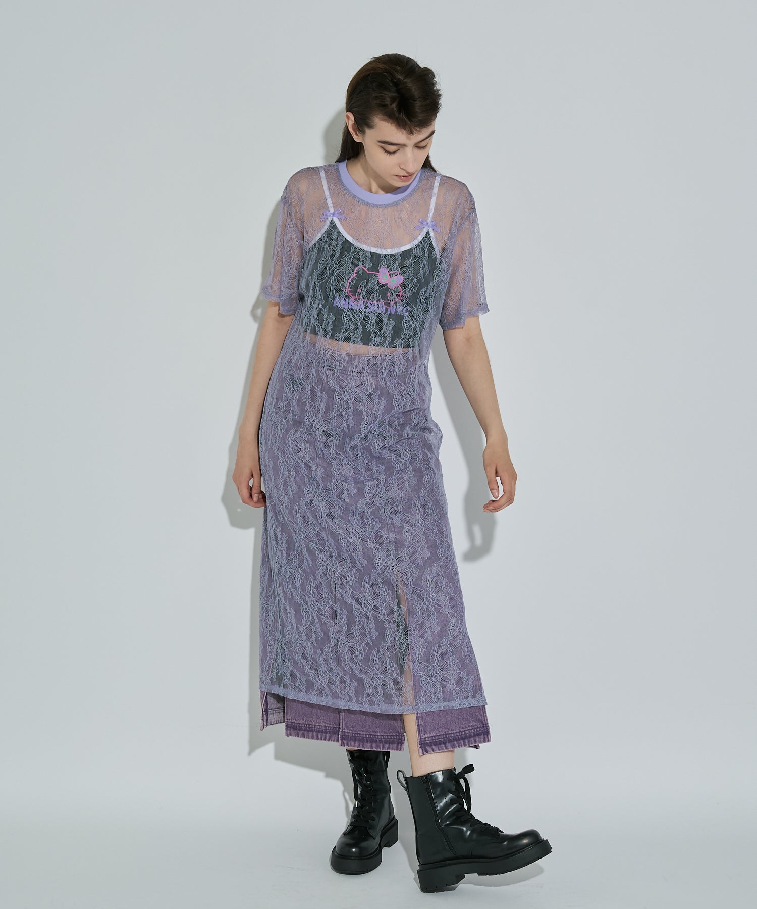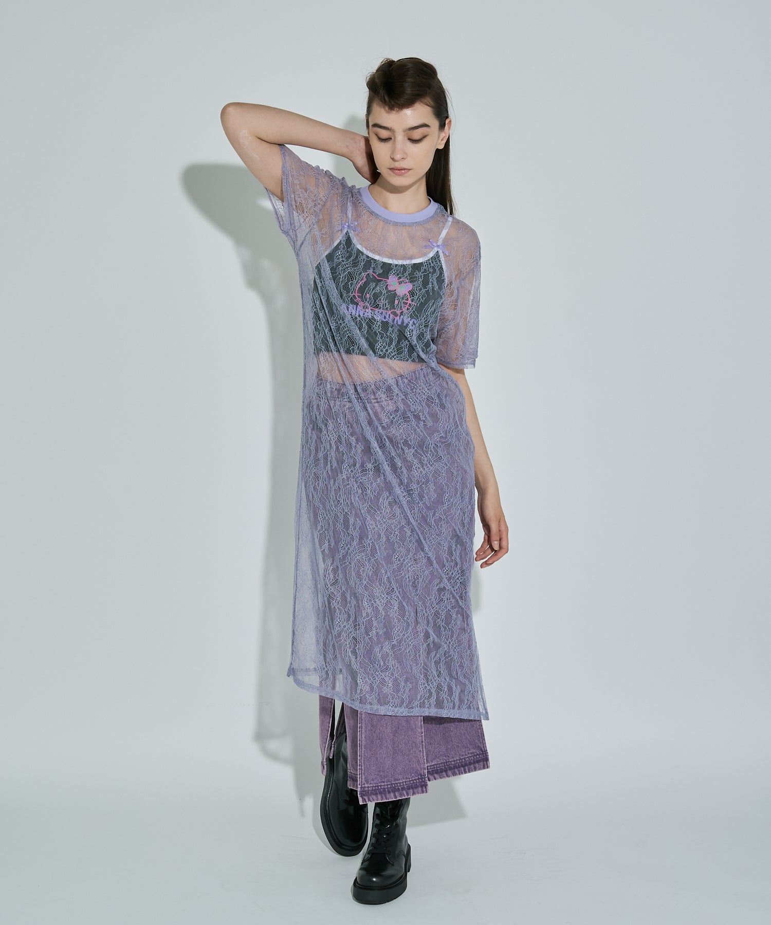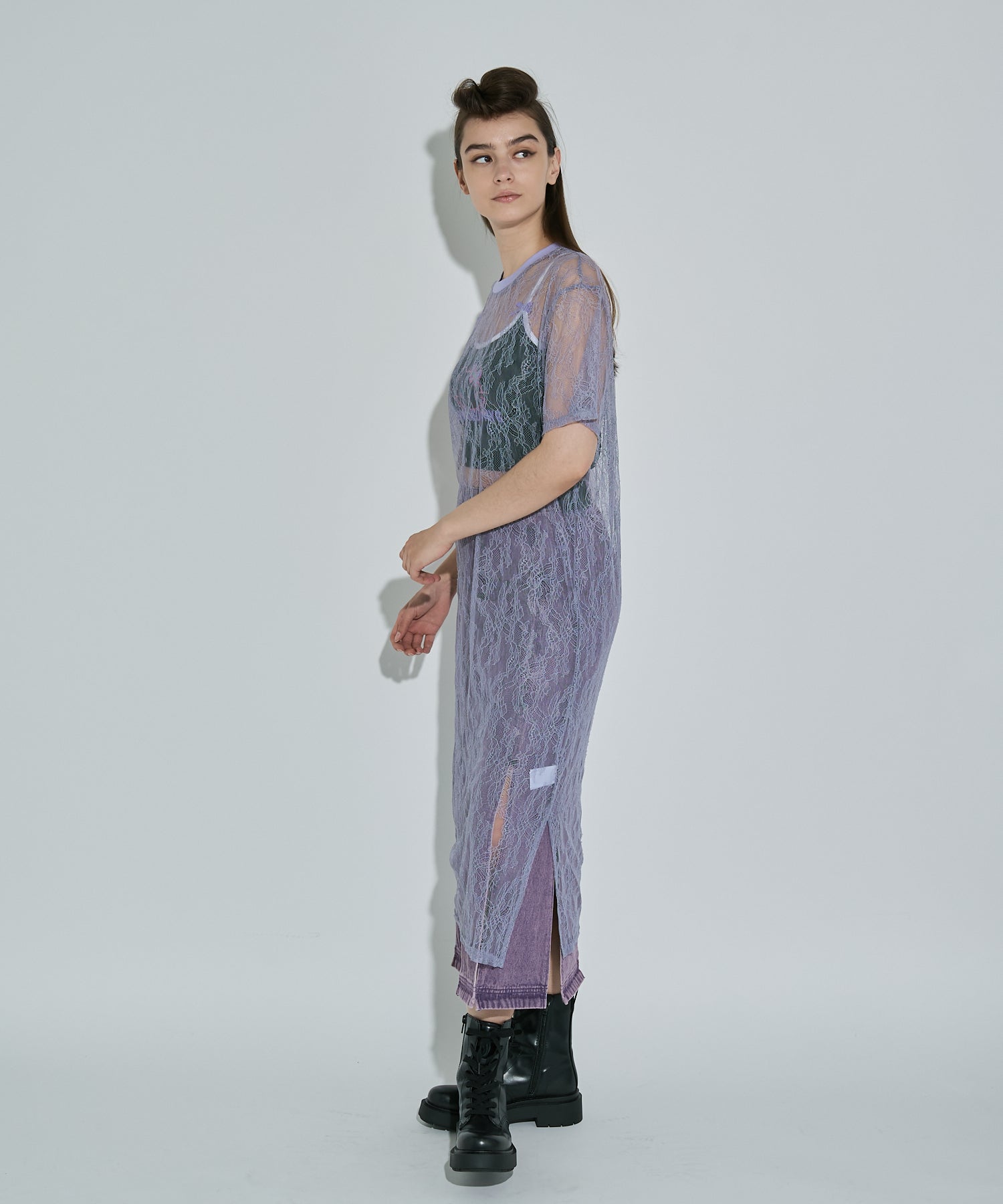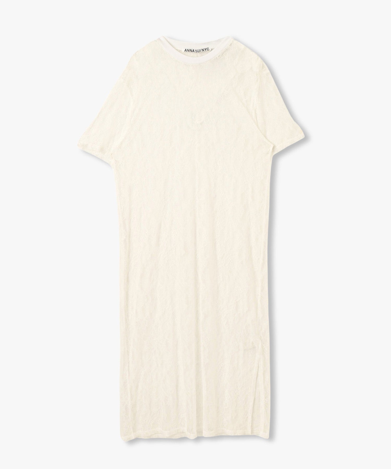 ボタニカル柄の繊細なレースを使用したTシャツ型ロングワンピース。カジュアルなシルエットながらもフェミニンな素材感でさりげなく華やかさをプラスしてくれます。春夏はTシャツの上から、秋冬はニットやスウェットの中に着るなど、レイヤード次第でオールシーズン楽しめるアイテムです◎