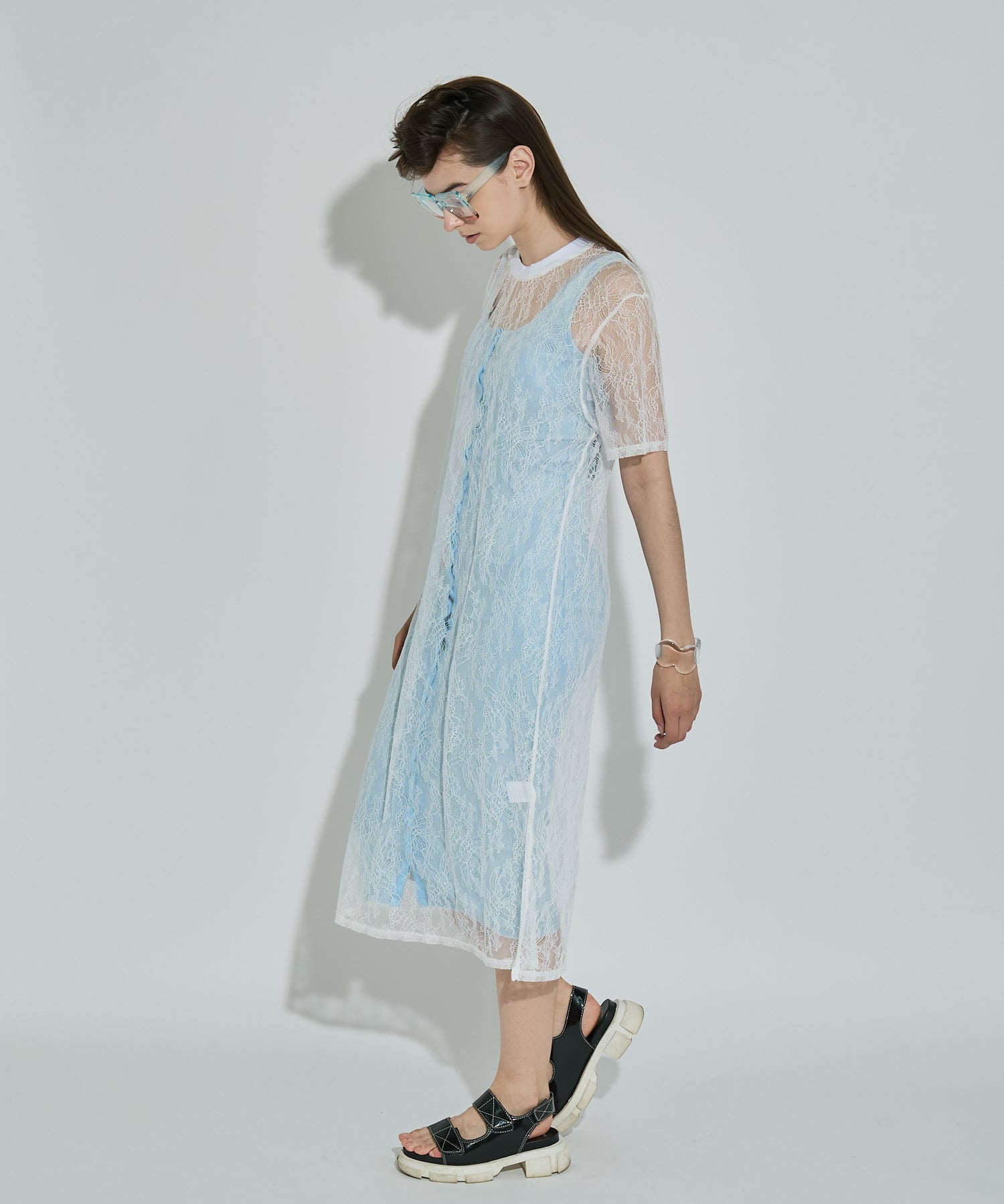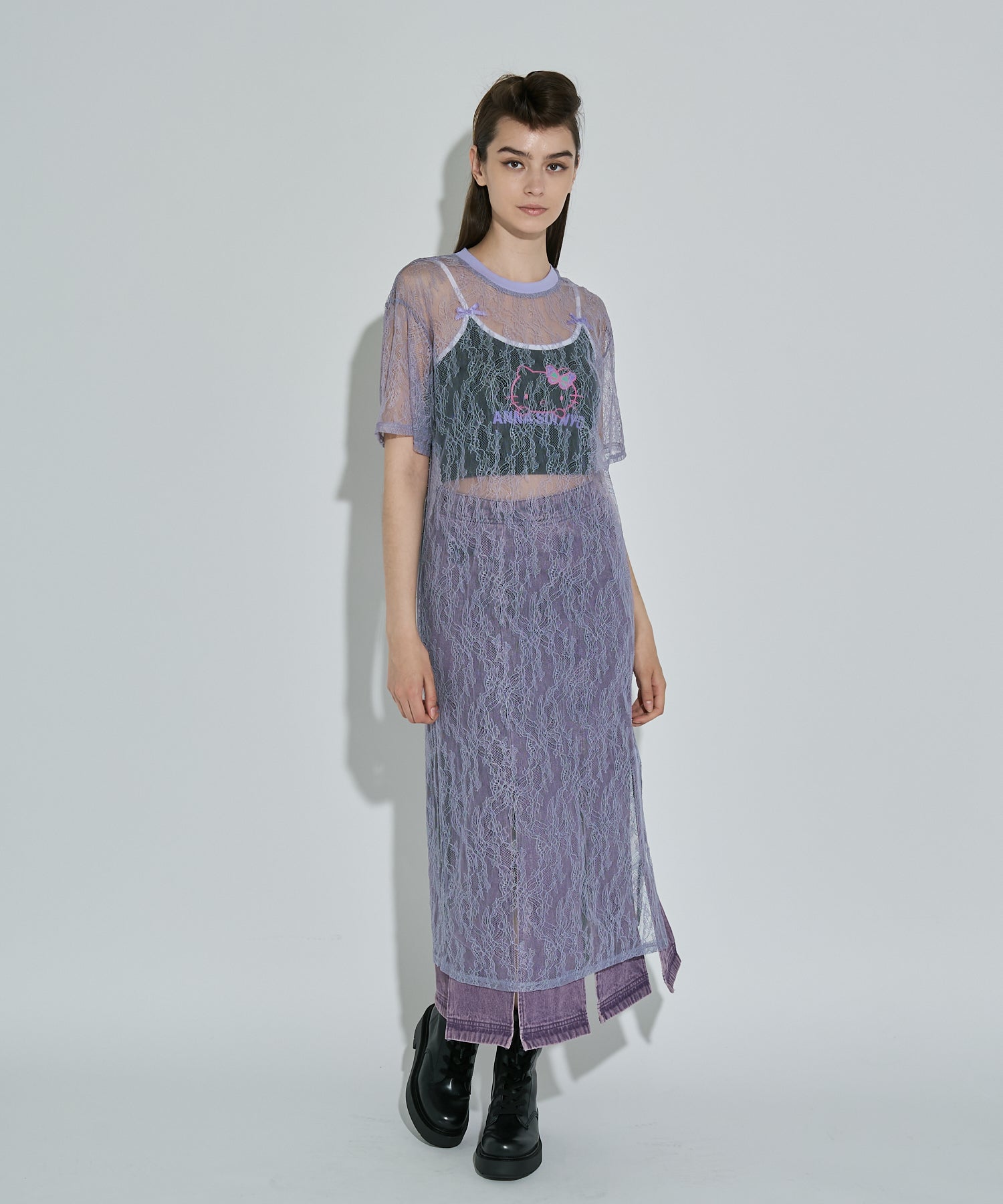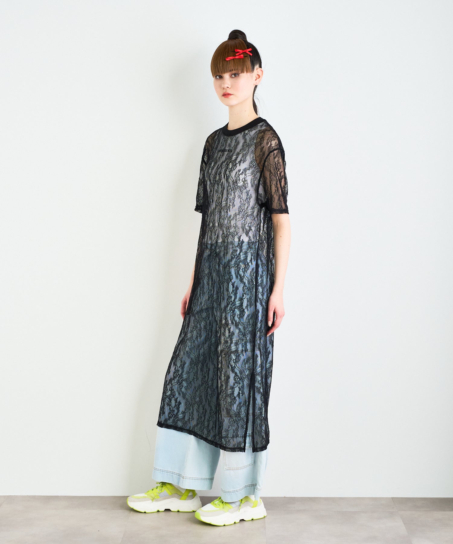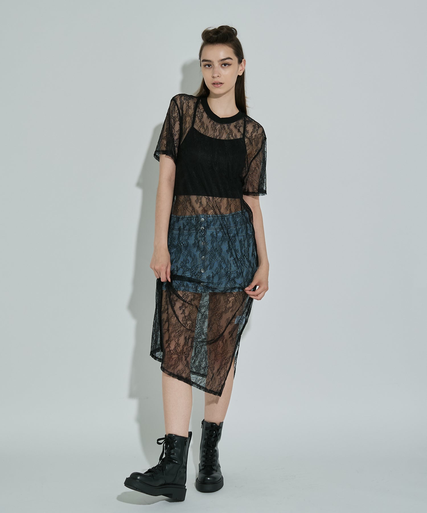 ボタニカル柄の繊細なレースを使用したTシャツ型ロングワンピース。カジュアルなシルエットながらもフェミニンな素材感でさりげなく華やかさをプラスしてくれます。春夏はTシャツの上から、秋冬はニットやスウェットの中に着るなど、レイヤード次第でオールシーズン楽しめるアイテムです◎