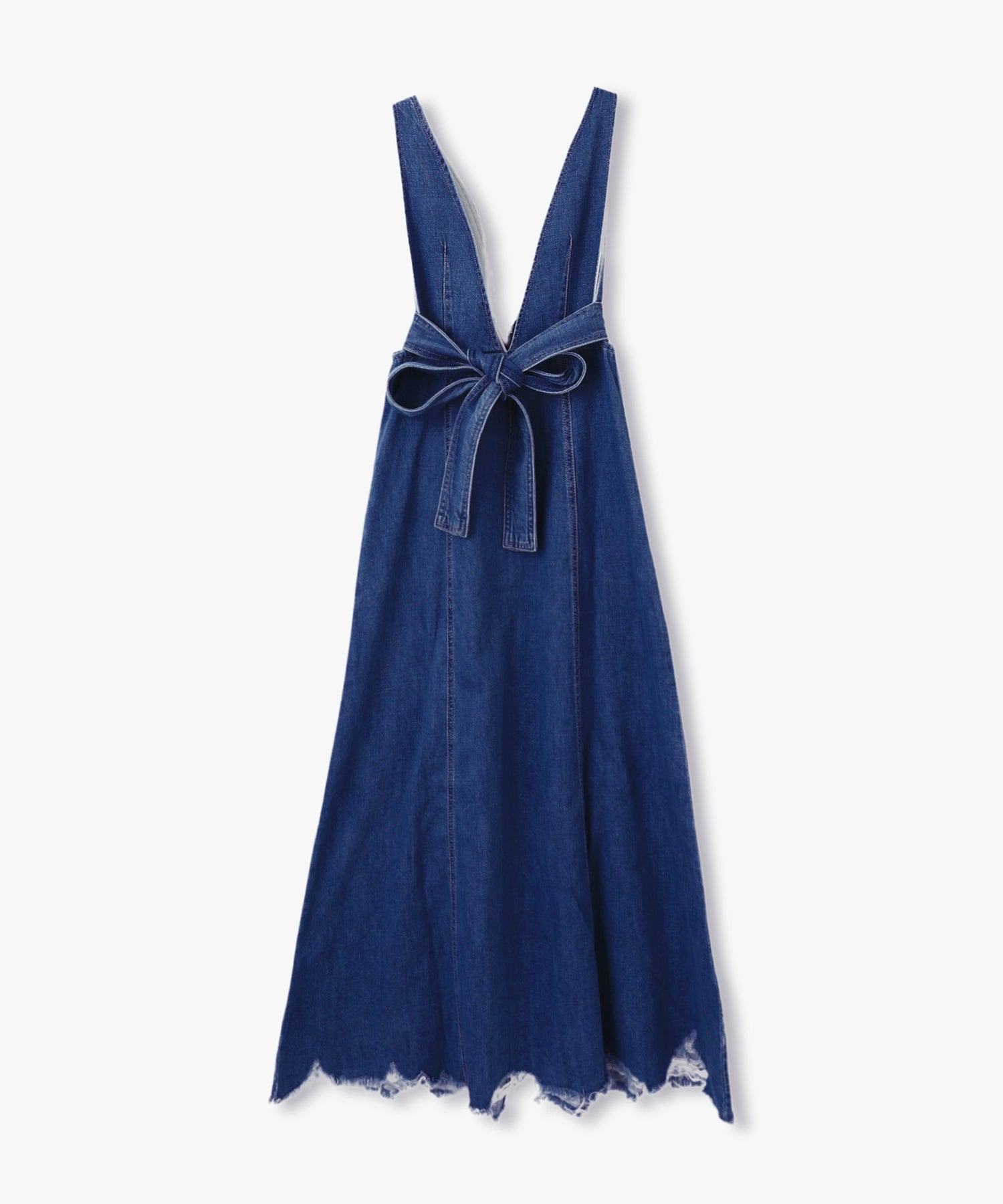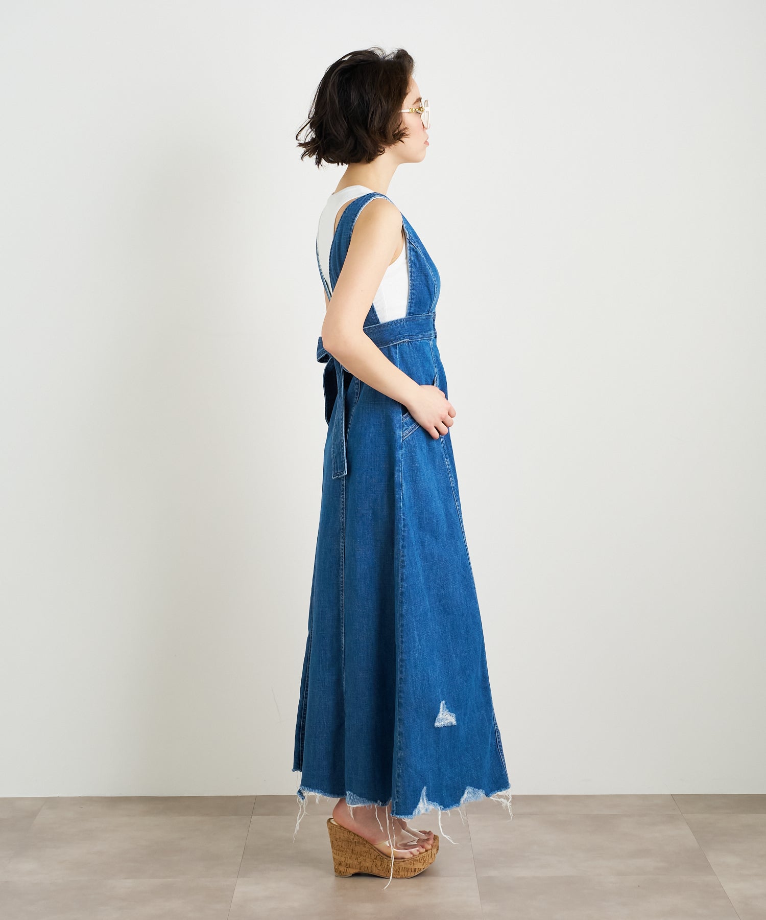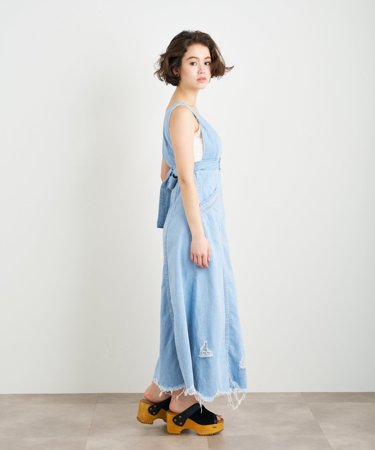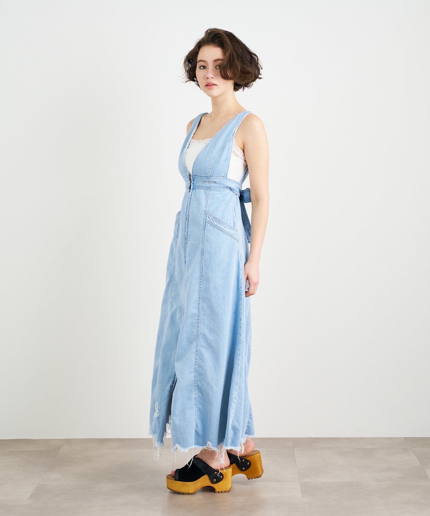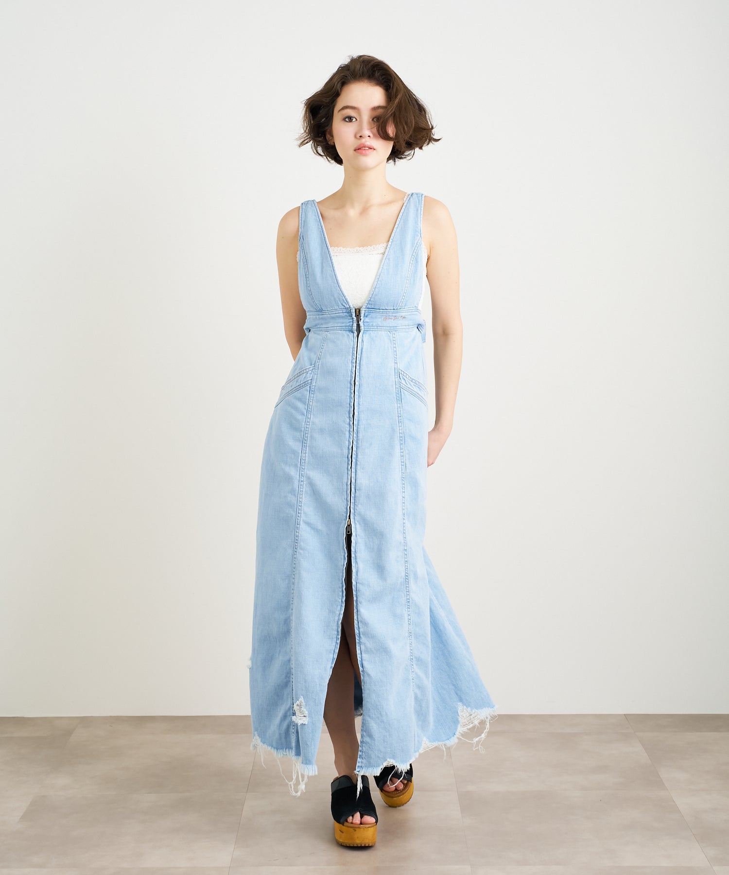 デニムアイテムを大人っぽいイメージにアップデートしたロングドレス。裾にはダメージ加工が施されており、大きく広がる裾は華やかな印象に!ウエストのリボンが揺れる姿は可愛らしい雰囲気を出します。フロントのZIPを開けて羽織って着るスタイリングもオススメ。