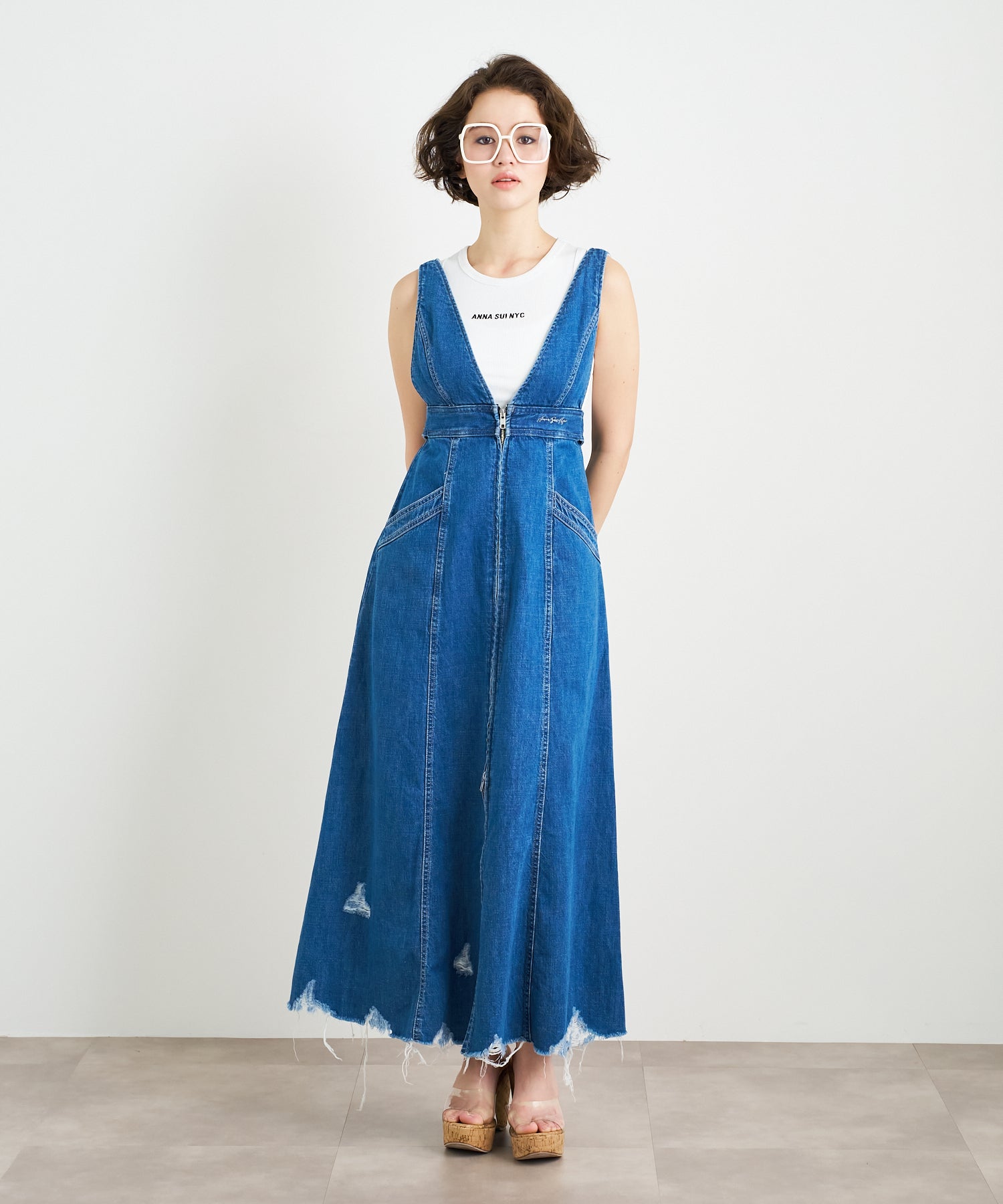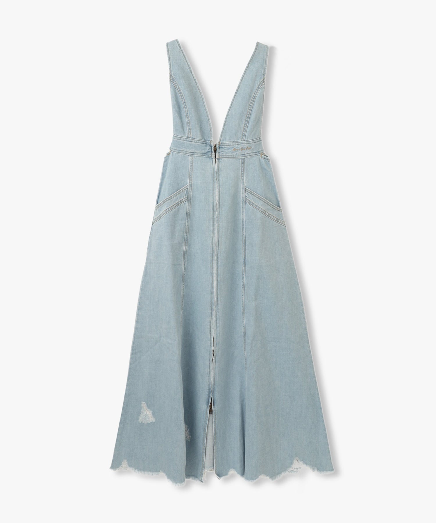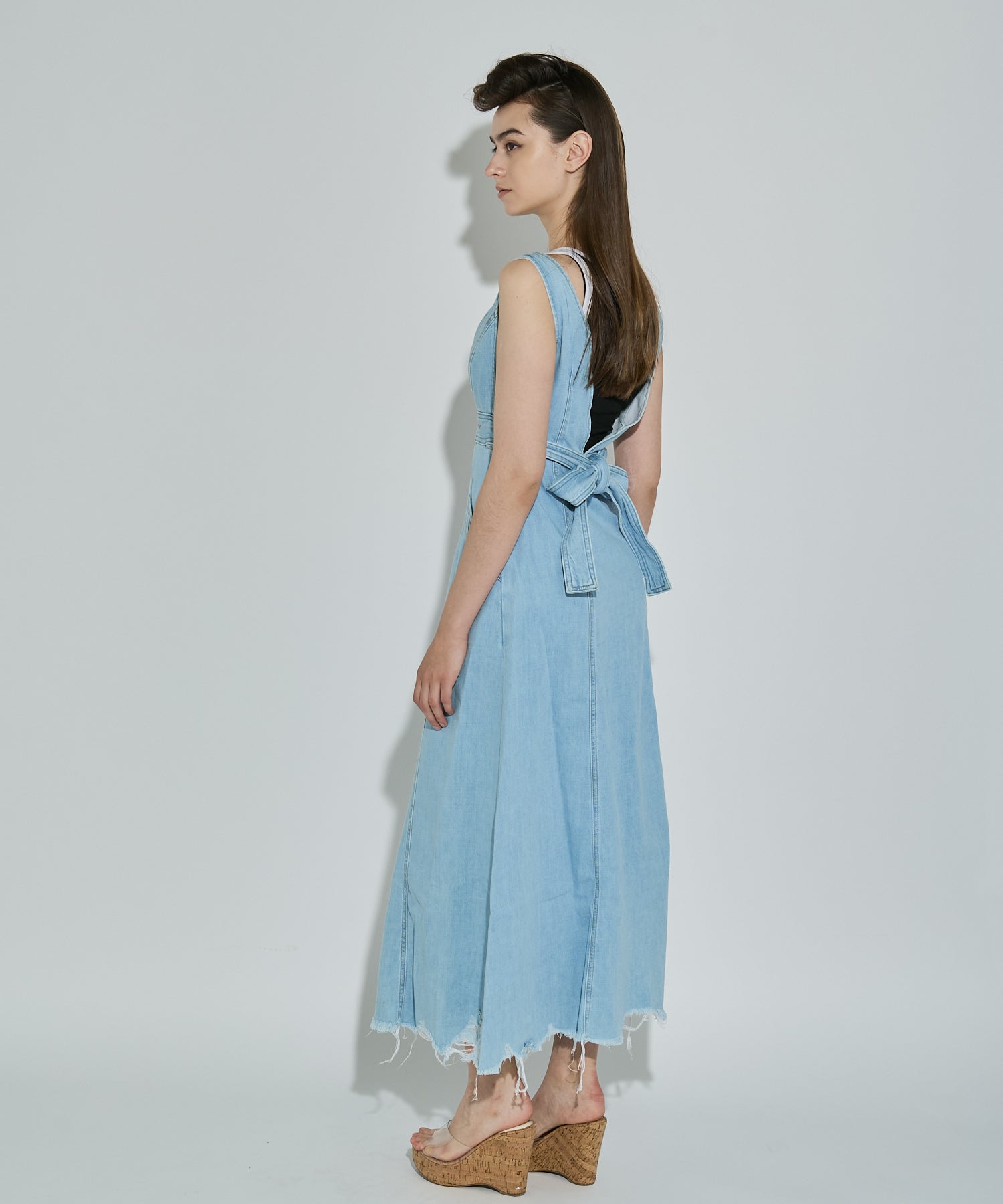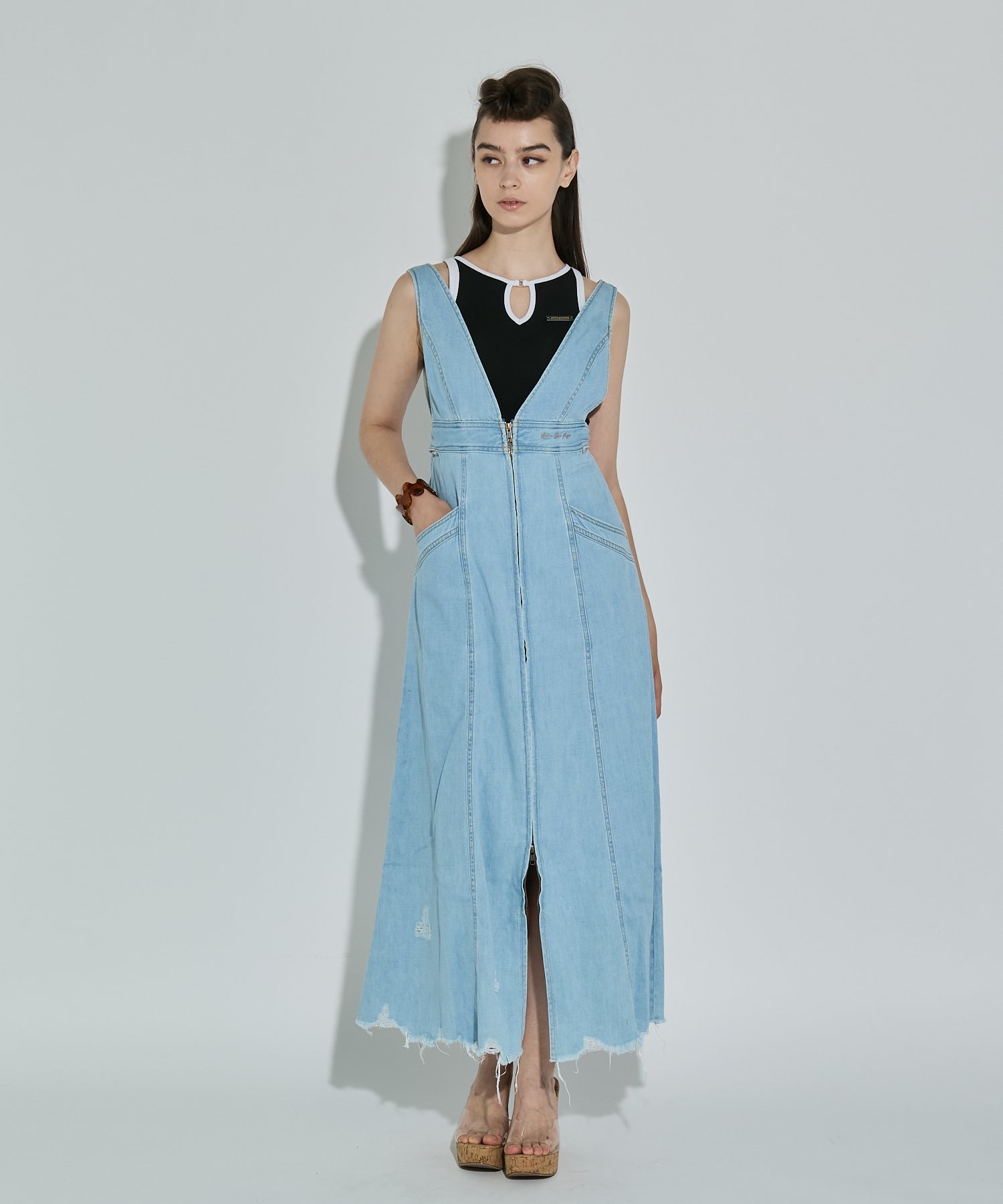 デニムアイテムを大人っぽいイメージにアップデートしたロングドレス。裾にはダメージ加工が施されており、大きく広がる裾は華やかな印象に!ウエストのリボンが揺れる姿は可愛らしい雰囲気を出します。フロントのZIPを開けて羽織って着るスタイリングもオススメ。