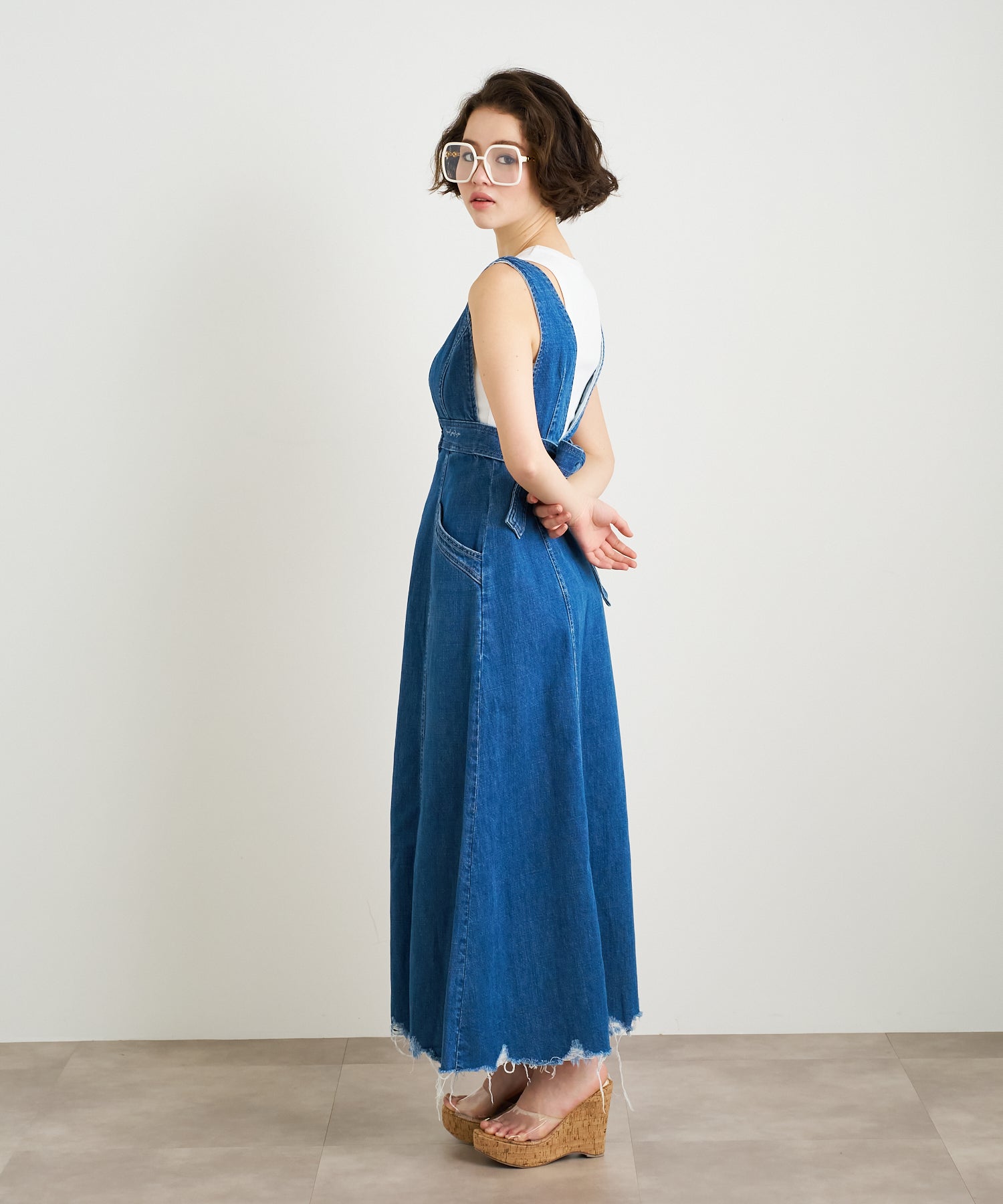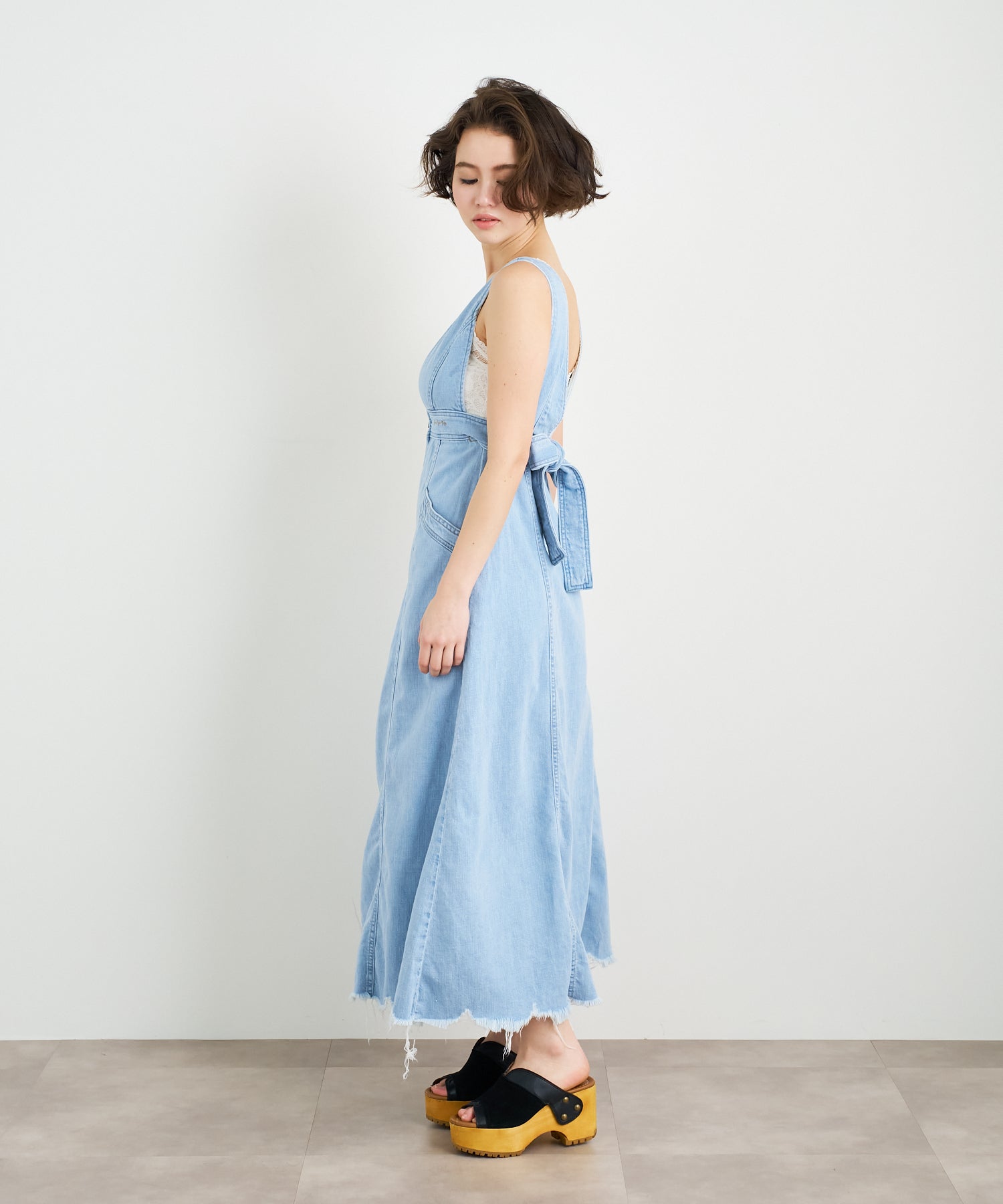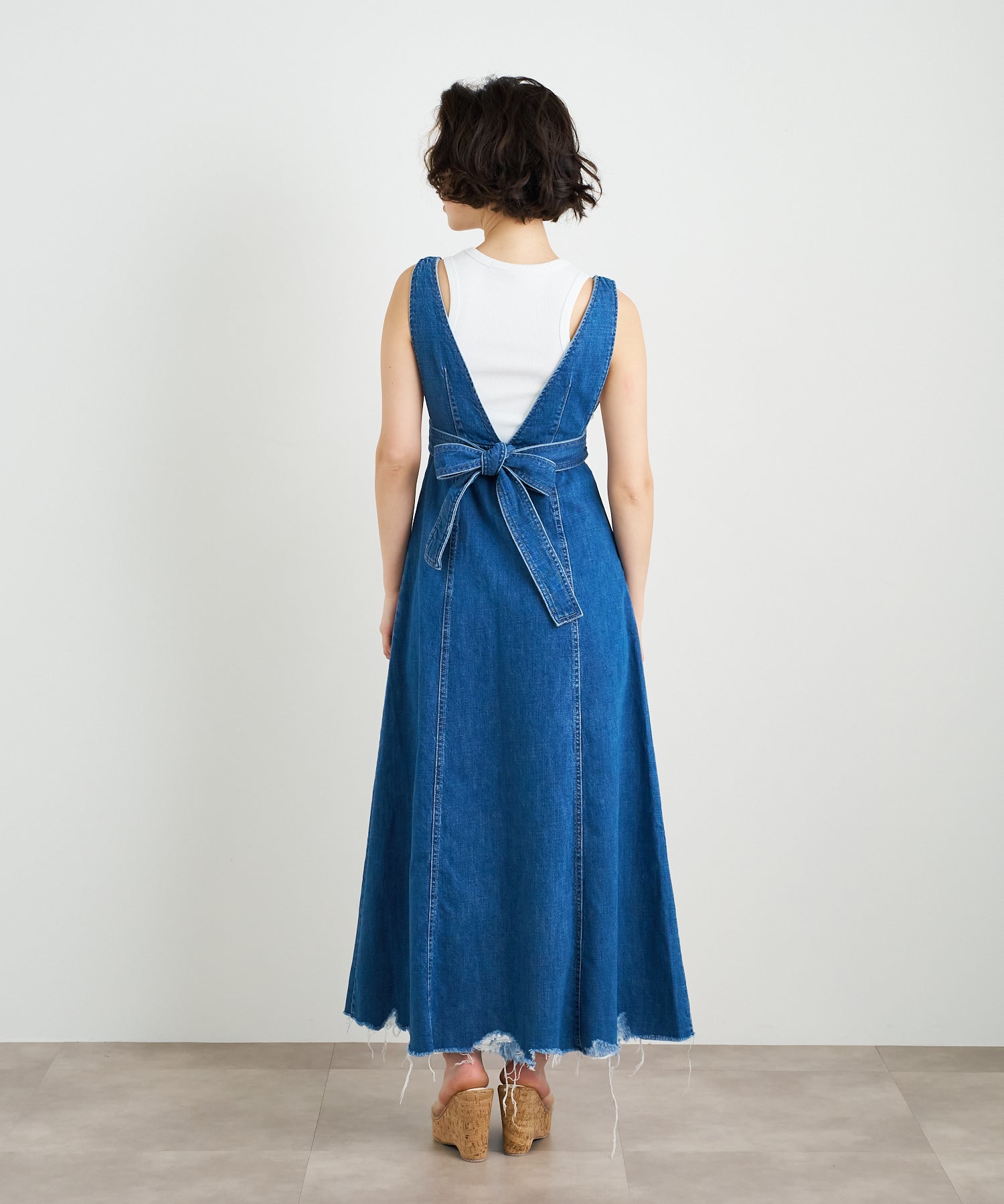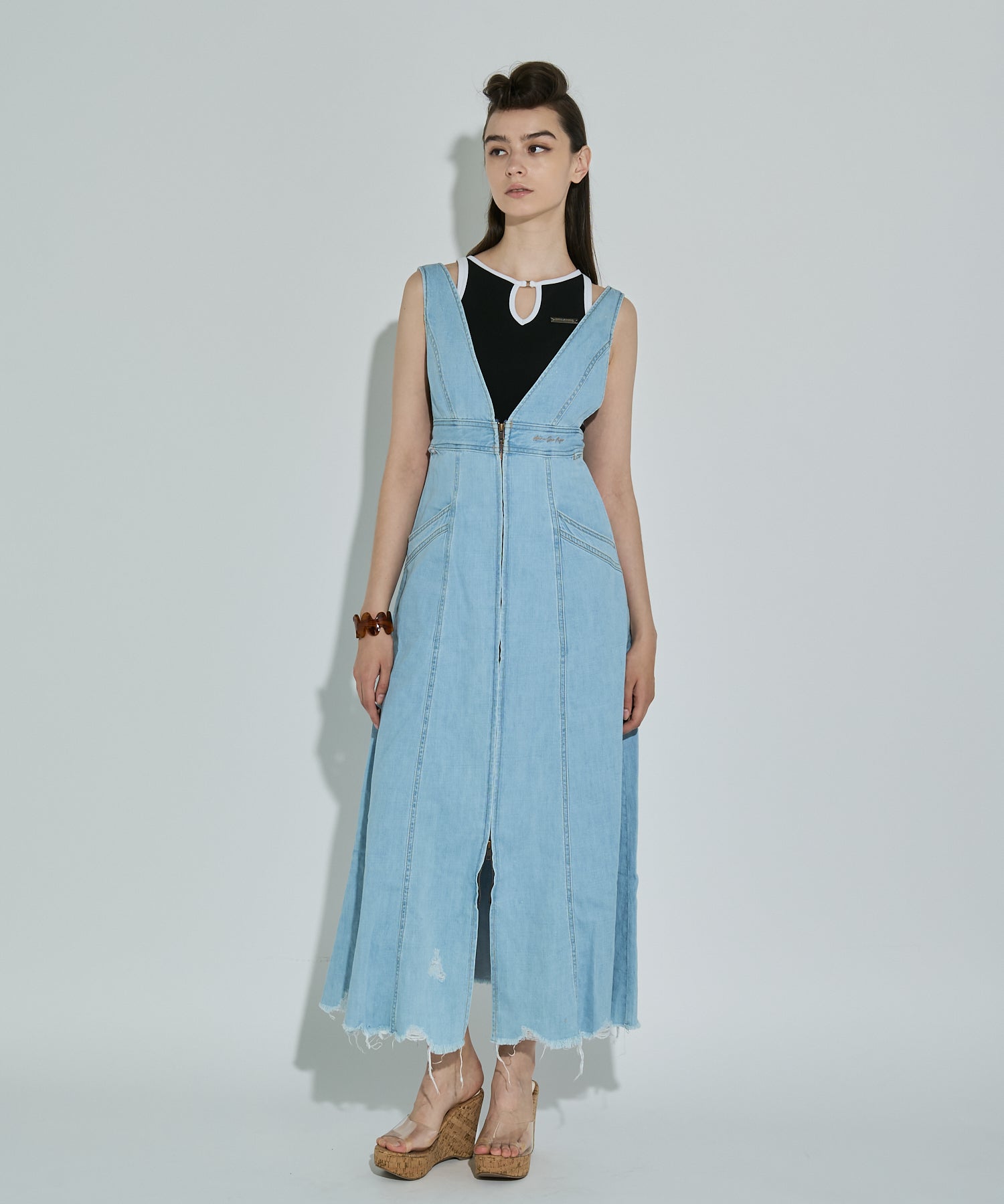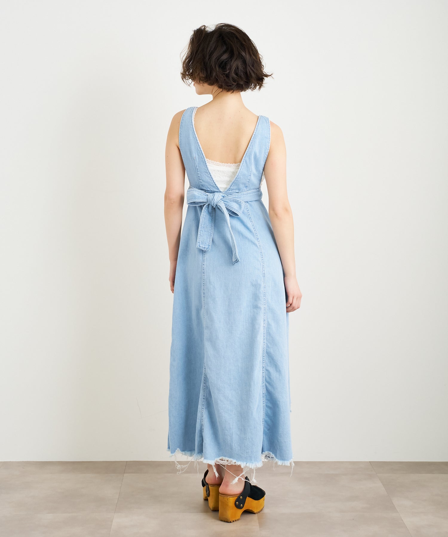 デニムアイテムを大人っぽいイメージにアップデートしたロングドレス。裾にはダメージ加工が施されており、大きく広がる裾は華やかな印象に!ウエストのリボンが揺れる姿は可愛らしい雰囲気を出します。フロントのZIPを開けて羽織って着るスタイリングもオススメ。