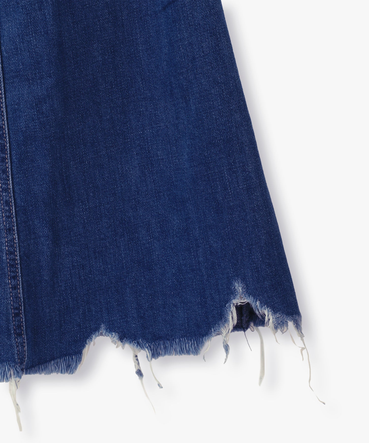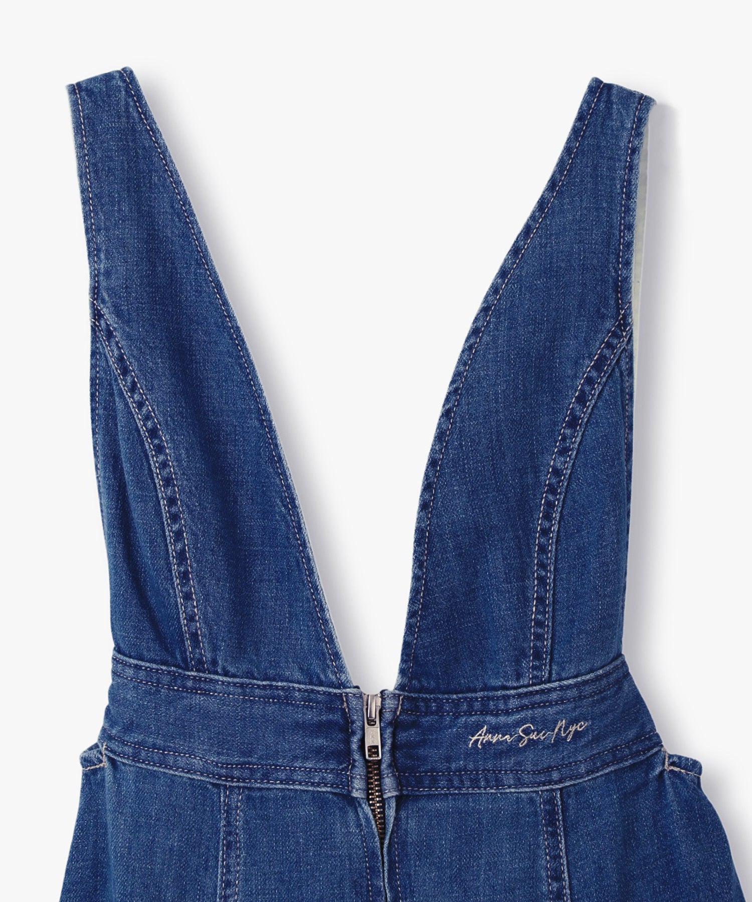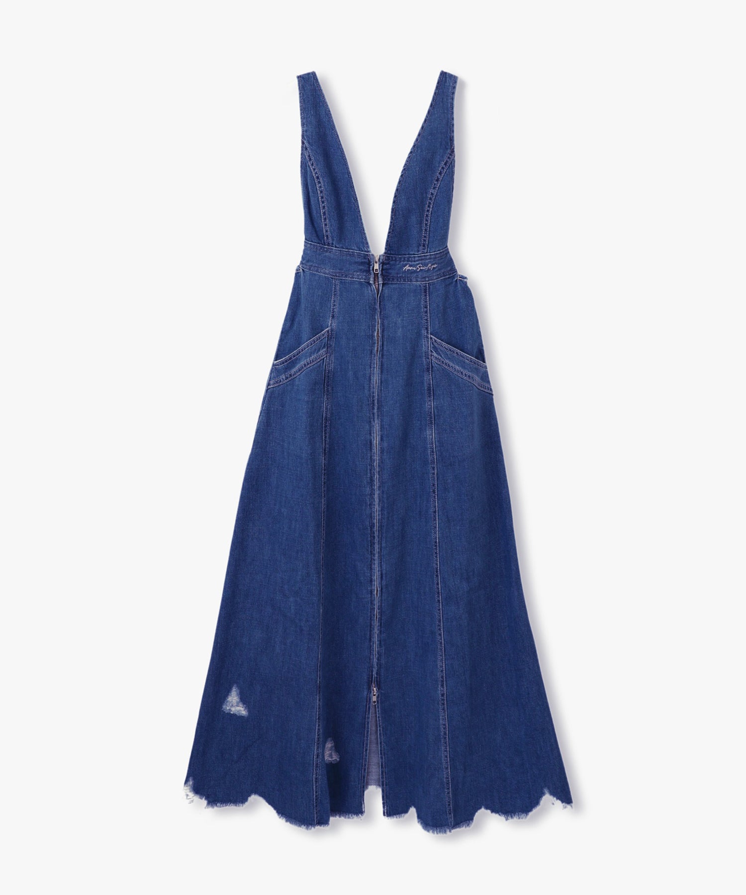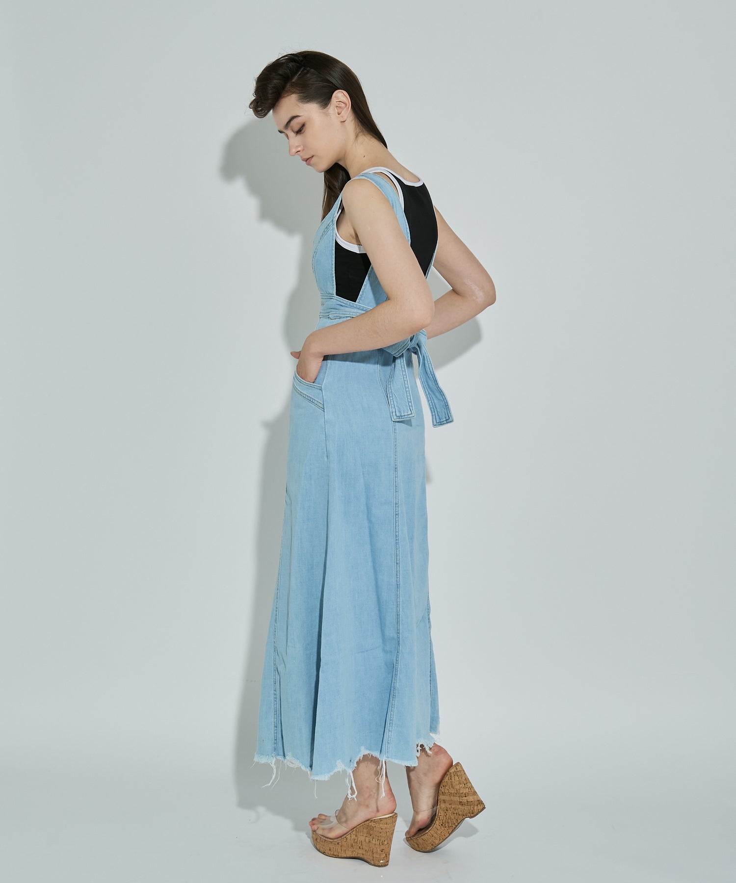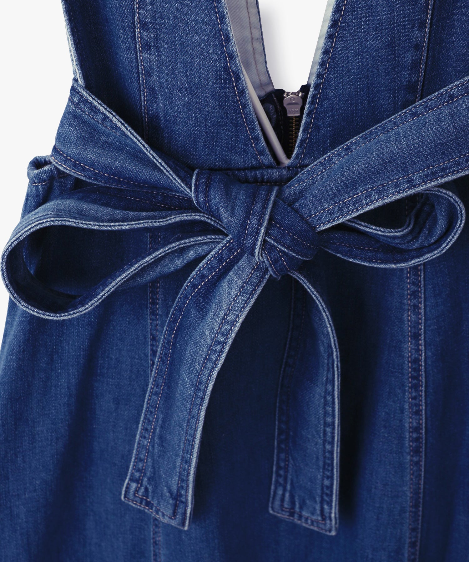 デニムアイテムを大人っぽいイメージにアップデートしたロングドレス。裾にはダメージ加工が施されており、大きく広がる裾は華やかな印象に!ウエストのリボンが揺れる姿は可愛らしい雰囲気を出します。フロントのZIPを開けて羽織って着るスタイリングもオススメ。