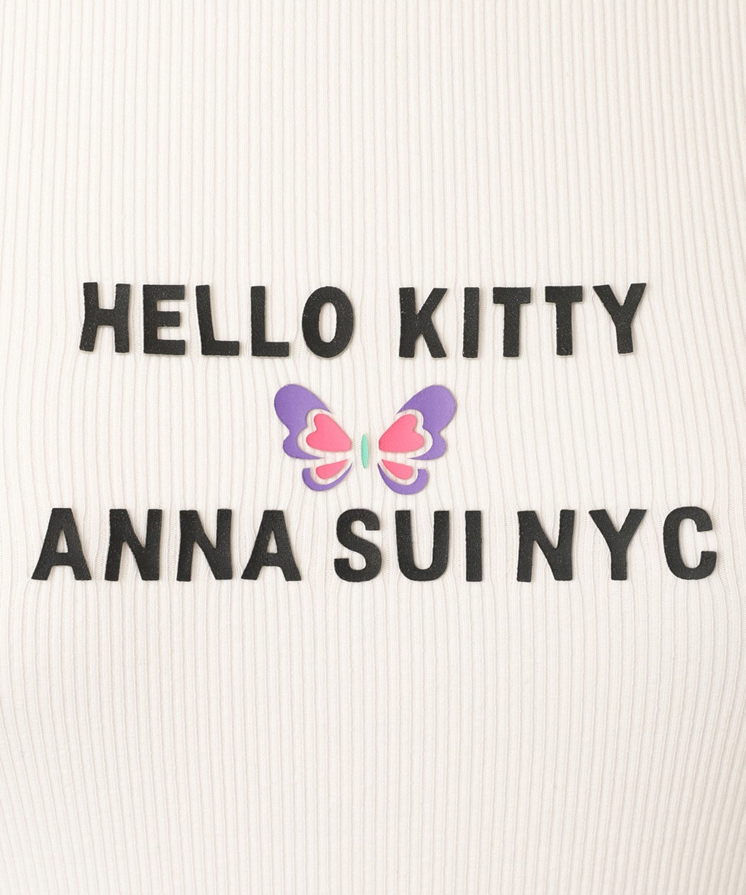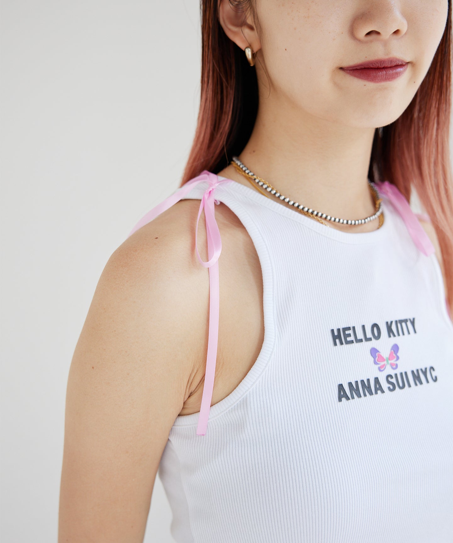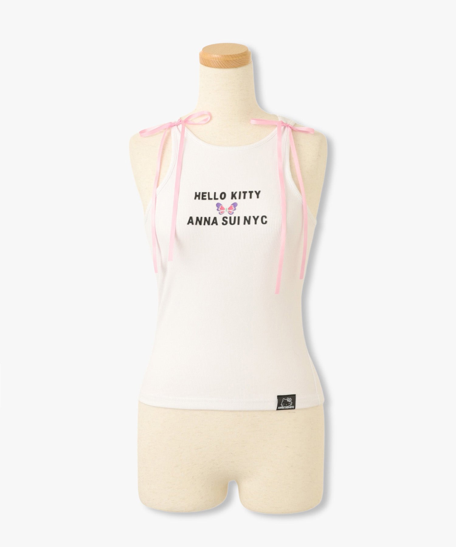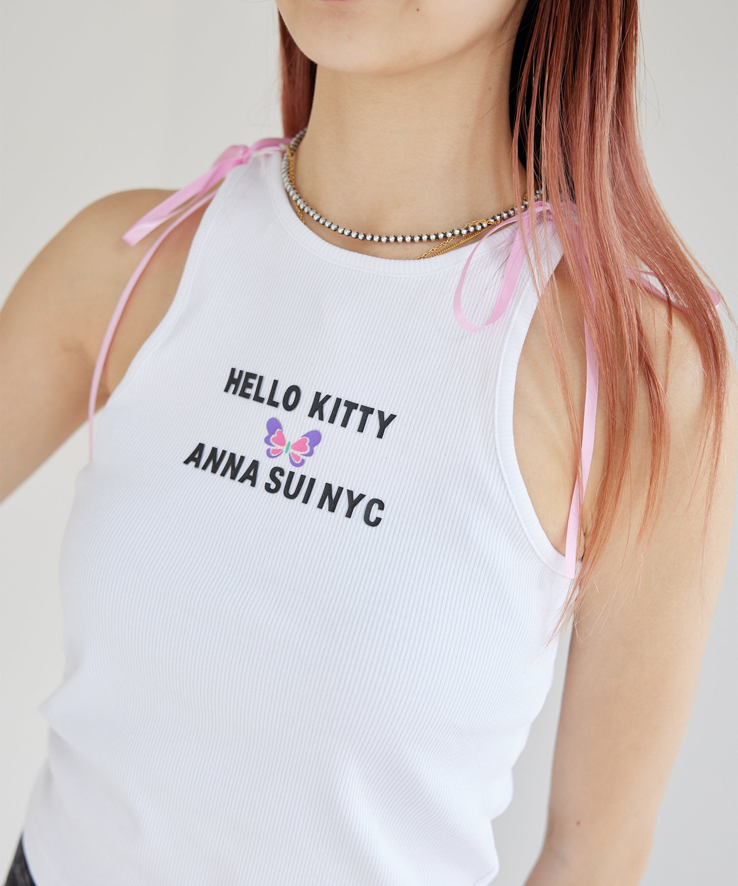50周年を迎えたハローキティとのスペシャルコラボレーション!ANNA SUI NYCとしては初となるコンテンツとのコラボレーションになります。 両肩に付いているサテンリボンがKawaiiアメスリタンクトップ。 存在感大の胸元の3Dシリコンプリントは、HELLO KITTY x ANNA SUI NYCスペシャルコラボオリジナルのロゴになっております。 サテンリボンは取り外し可能になっているので、シンプルに着こなしたい日にも着用したい一枚です。