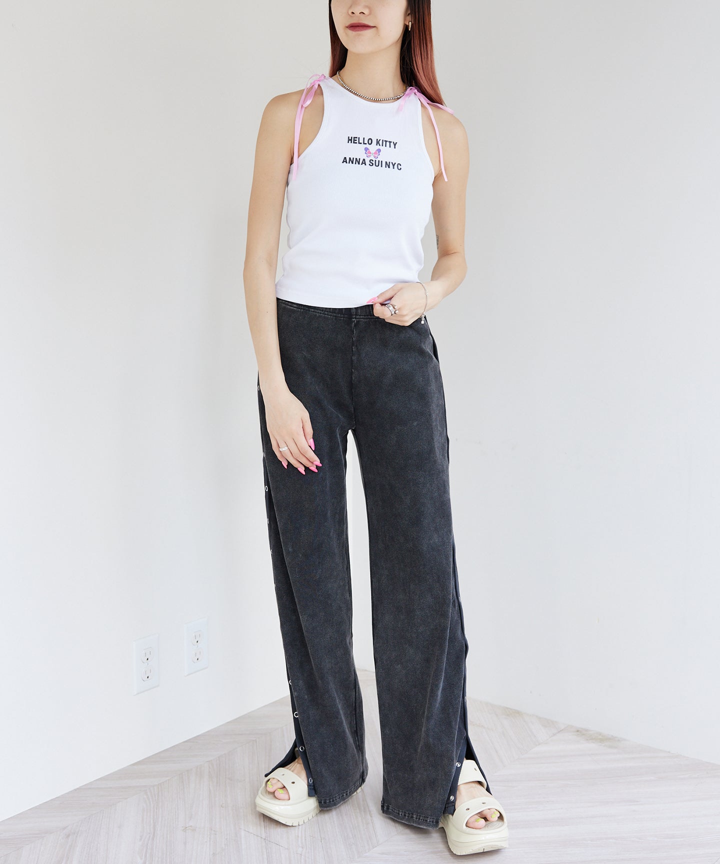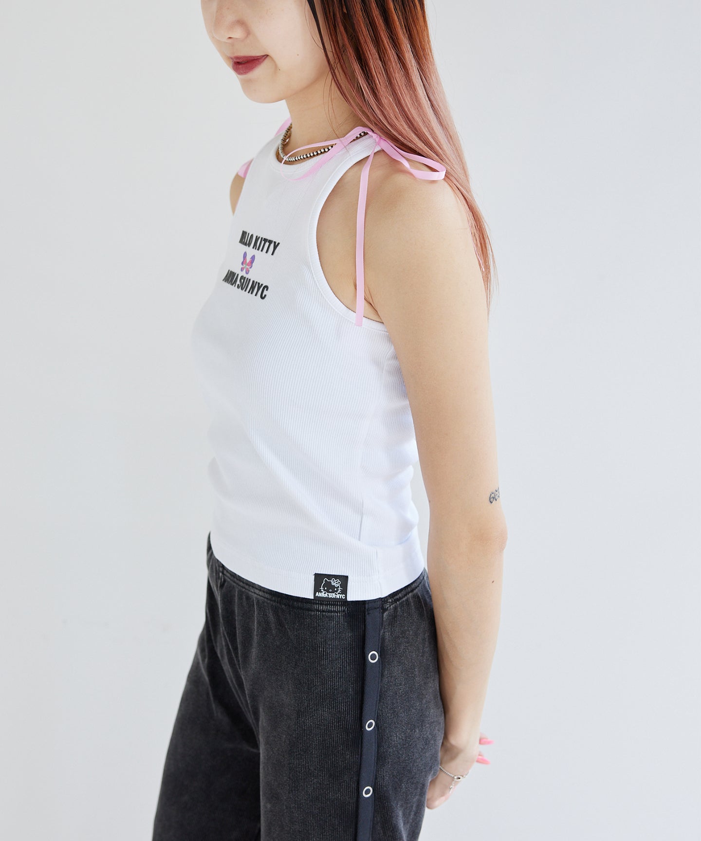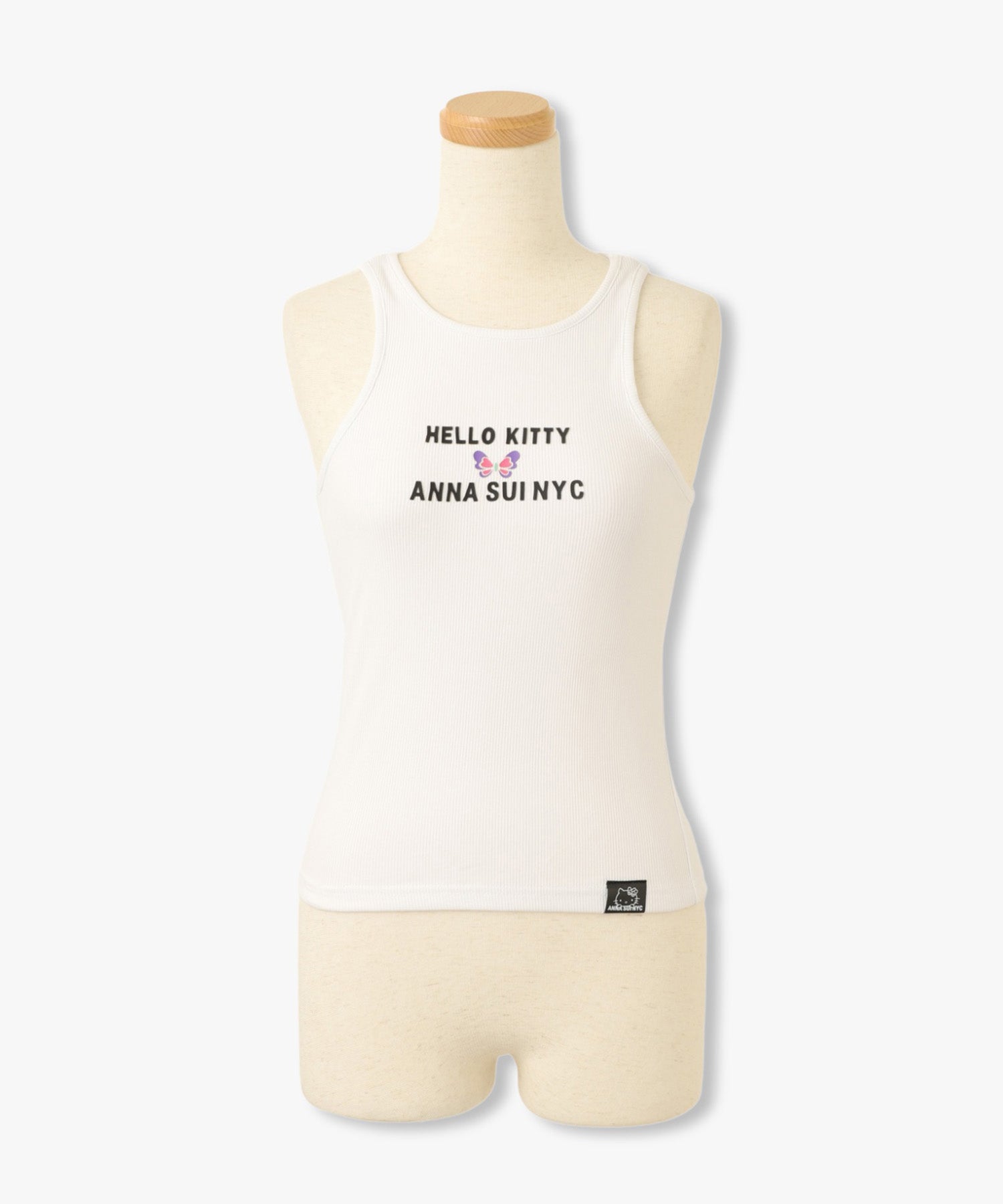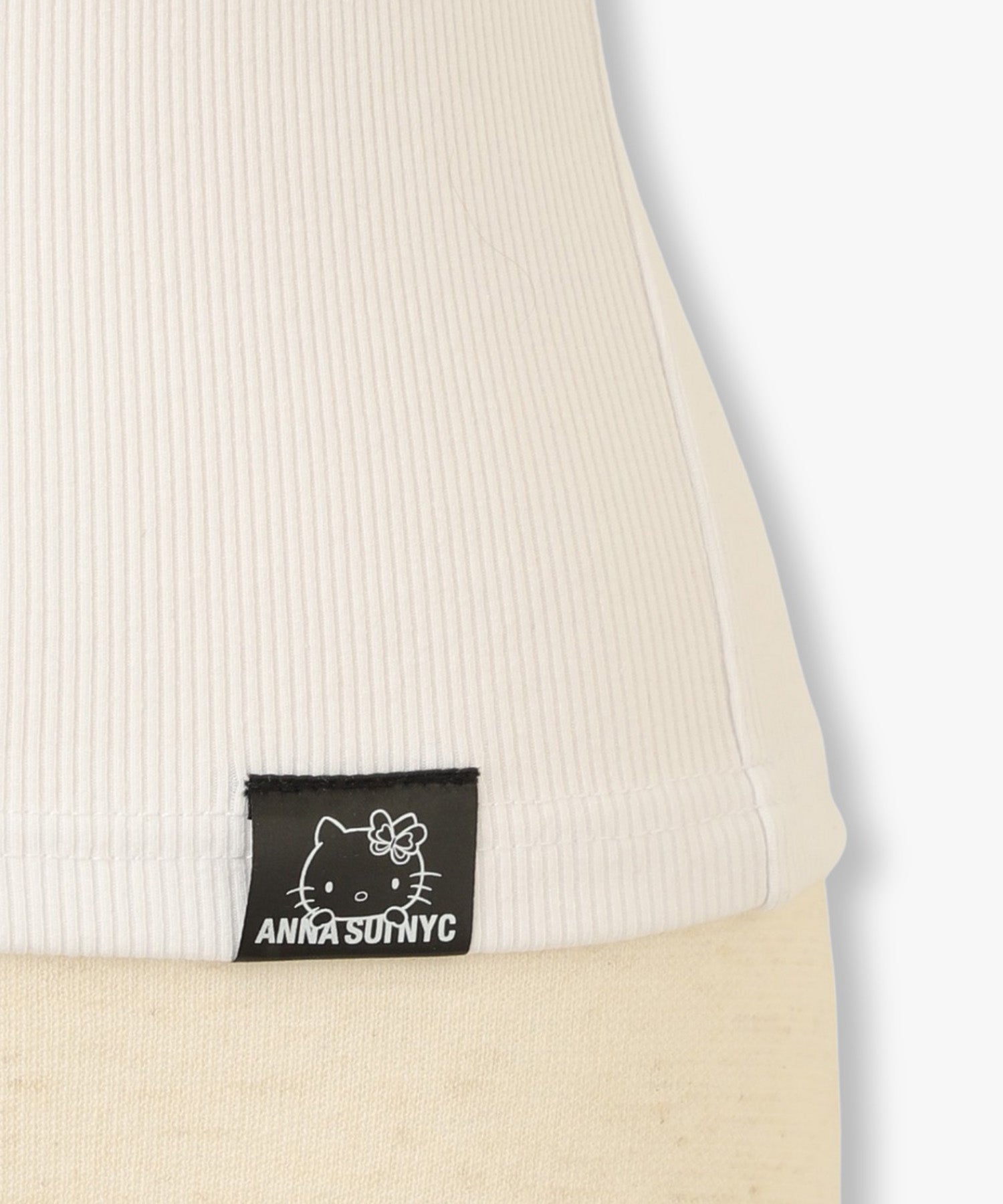 50周年を迎えたハローキティとのスペシャルコラボレーション!ANNA SUI NYCとしては初となるコンテンツとのコラボレーションになります。 両肩に付いているサテンリボンがKawaiiアメスリタンクトップ。 存在感大の胸元の3Dシリコンプリントは、HELLO KITTY x ANNA SUI NYCスペシャルコラボオリジナルのロゴになっております。 サテンリボンは取り外し可能になっているので、シンプルに着こなしたい日にも着用したい一枚です。