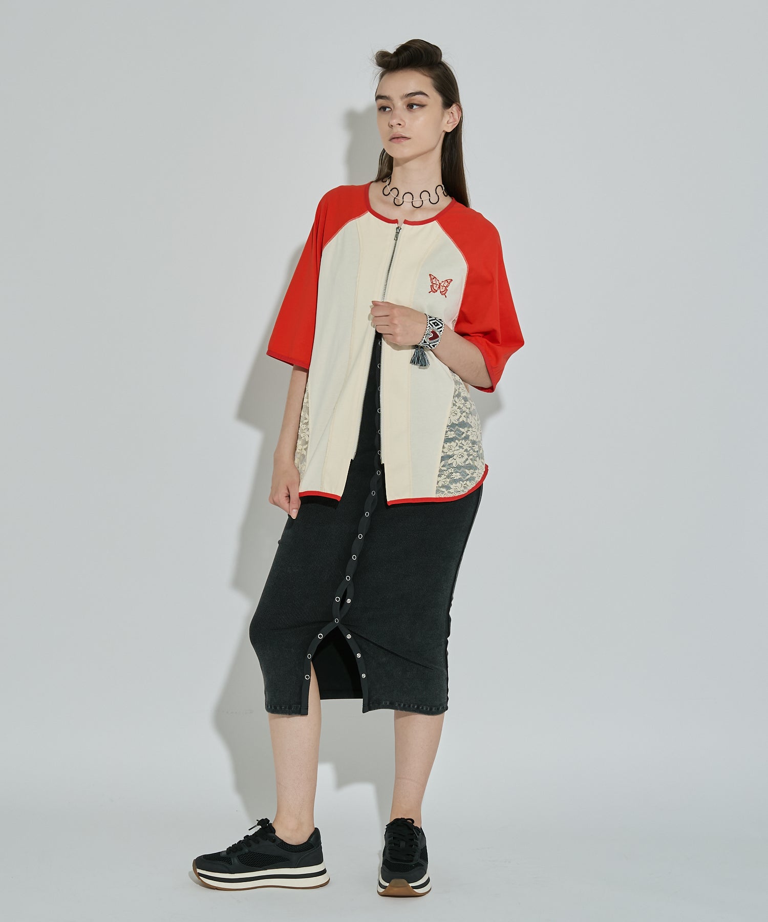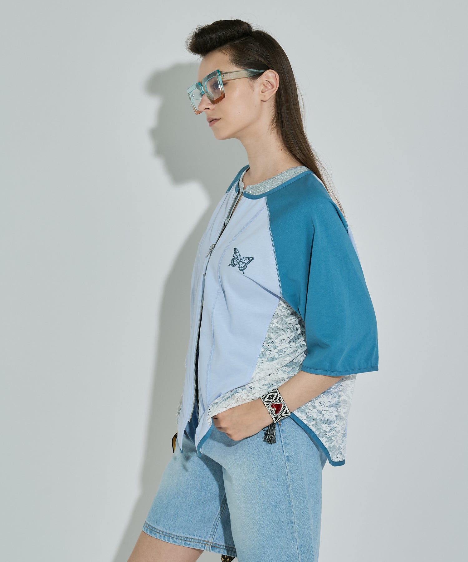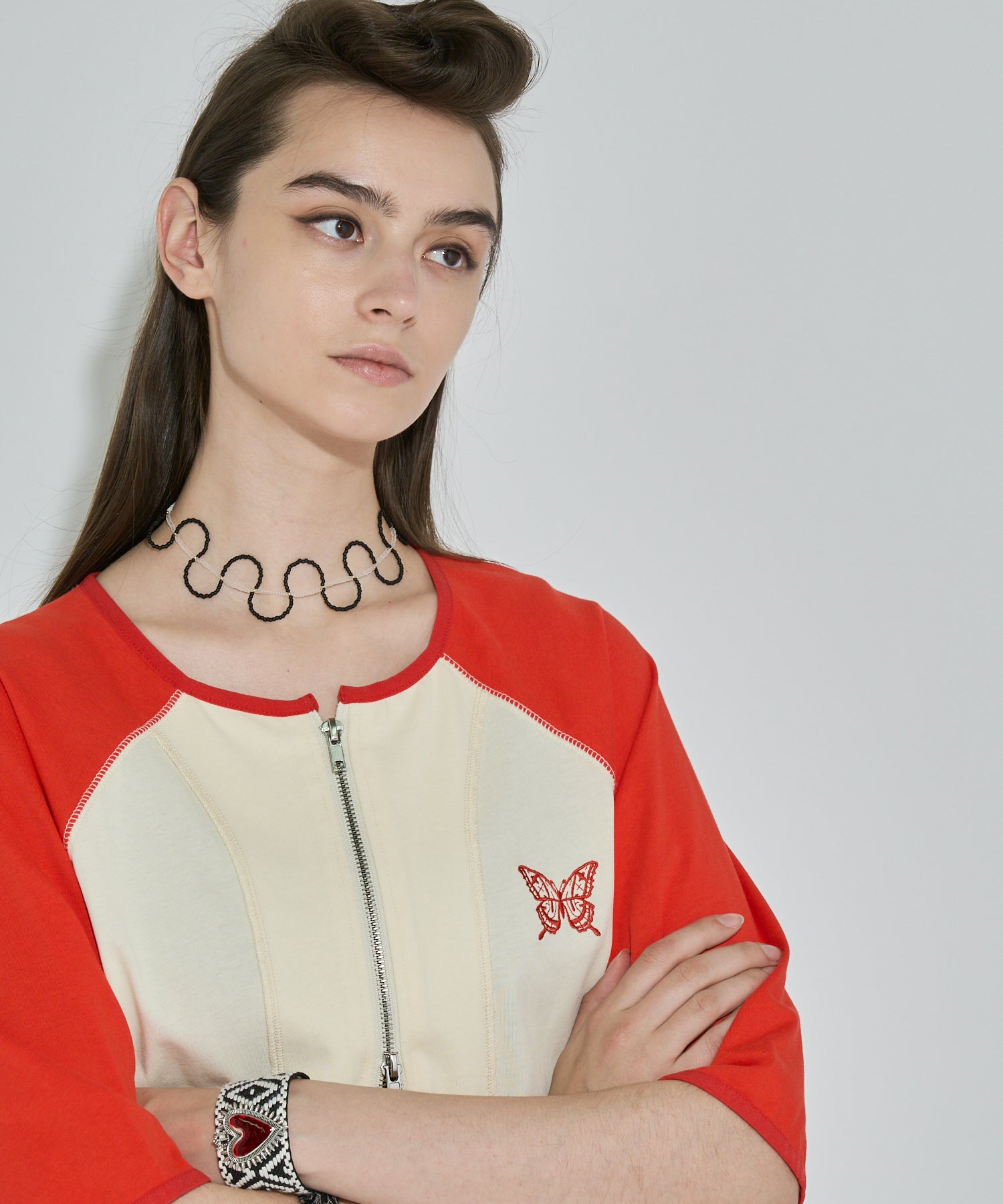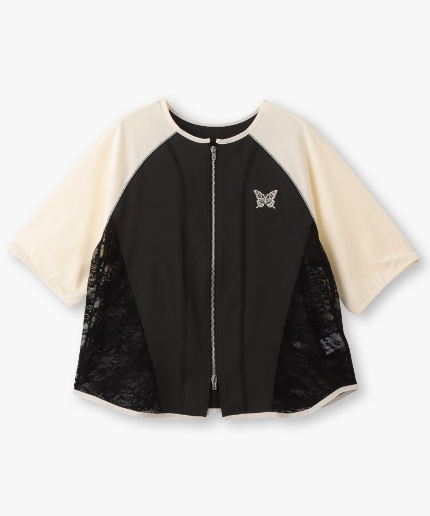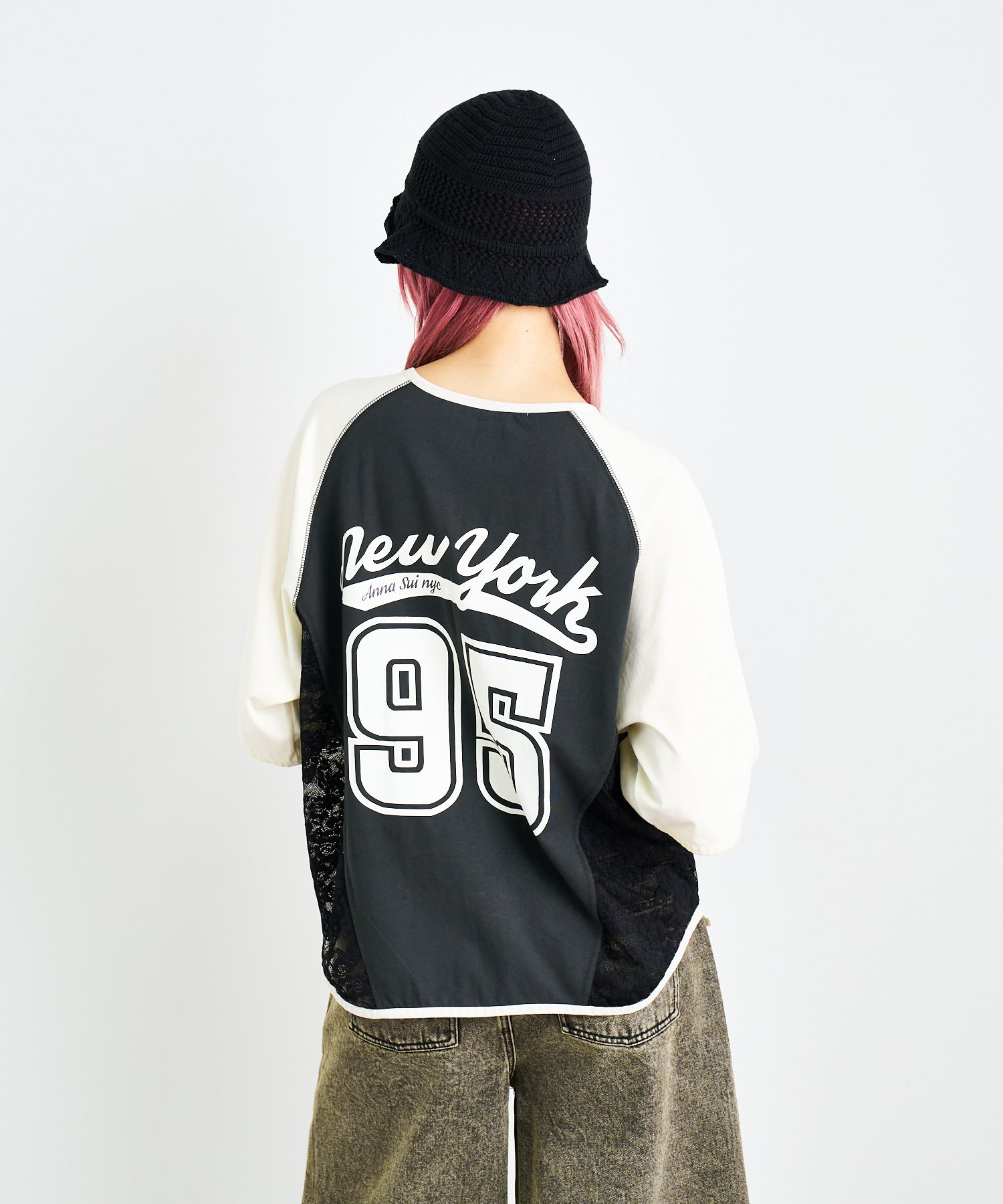 1950〜60年代のファスナータイプのベースボールシャツから着想を得たどこかレトロなムード漂う一着。レースの切り替えや、ファスナーの見返しをあえて表に出したディテールが、ヴィンテージライクなルーツに現代的なスパイスを効かせています。 前後2WAYで着用できるデザインとダブルジップ仕様で、着こなしのアレンジが自在で、気軽に印象を変えることも可能。スポーツとフェミニン、2つの要素が交差するANNA SUI NYCらしいMIXテイストのデザインカットソーです。