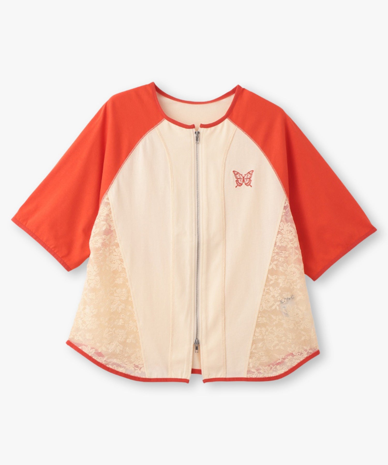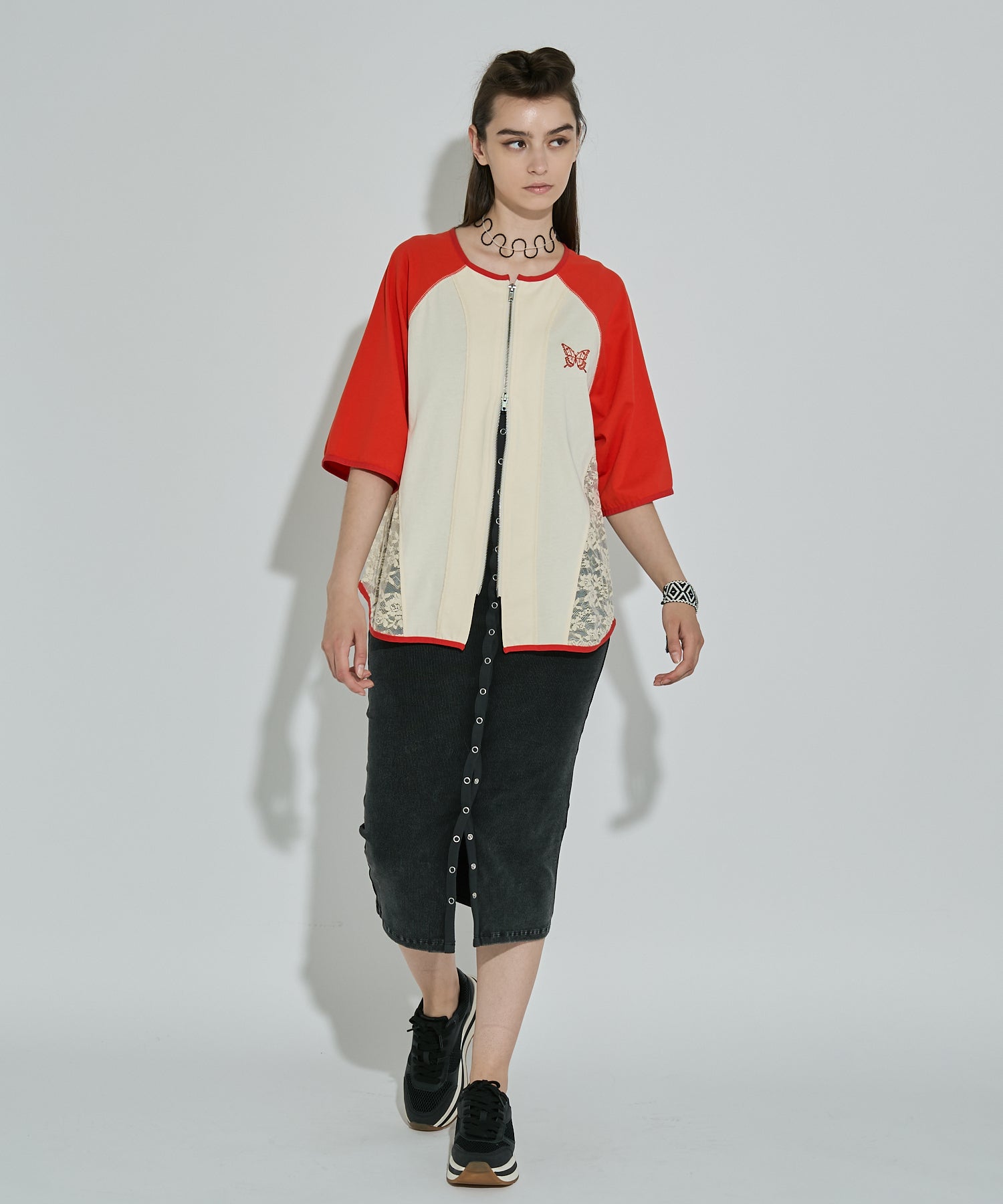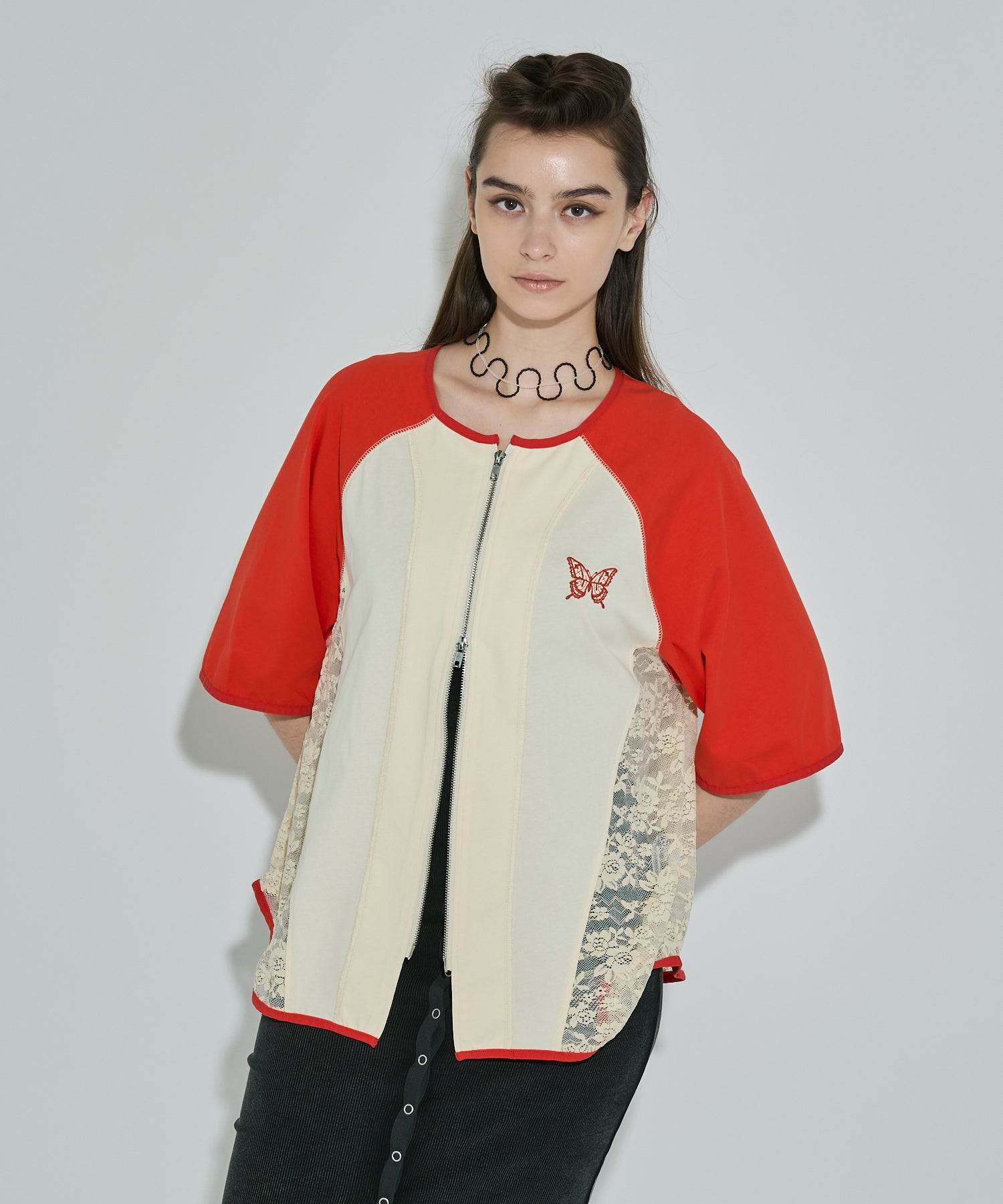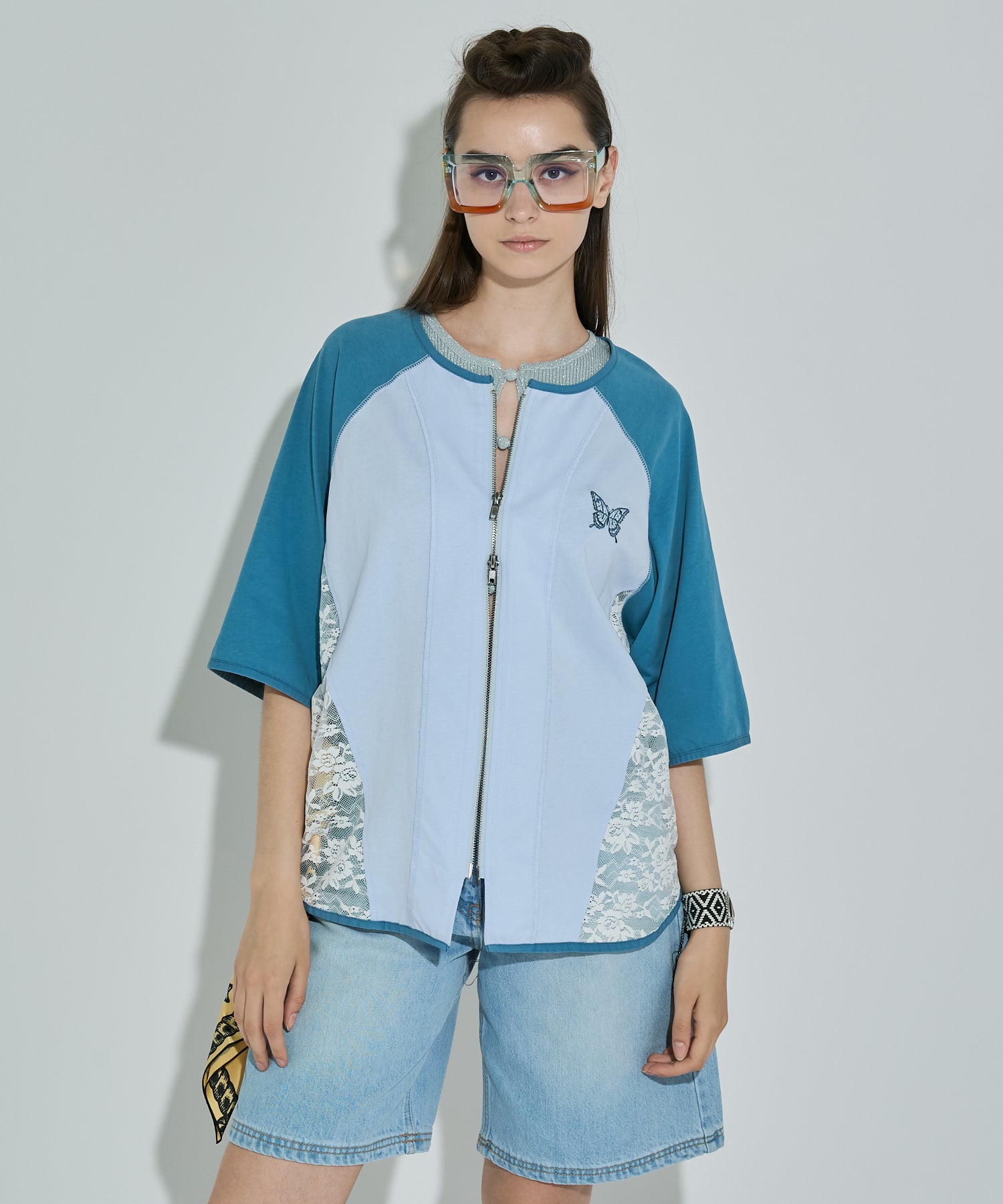 ダブルジップ&前後2WAY仕様で、着こなしの幅がぐっと広がるジップトップス。さらっと羽織ってスポーティに、1枚で着てモードに、前後を逆にしてバックプリントを主役に…と気分やスタイリングで自在にアレンジ可能。程よく肌が透けるレースの切り替えが、メンズライクなフォルムにほんのりフェミニンなニュアンスを添えてくれるので、パンツにもスカートにもバランスよくハマります。