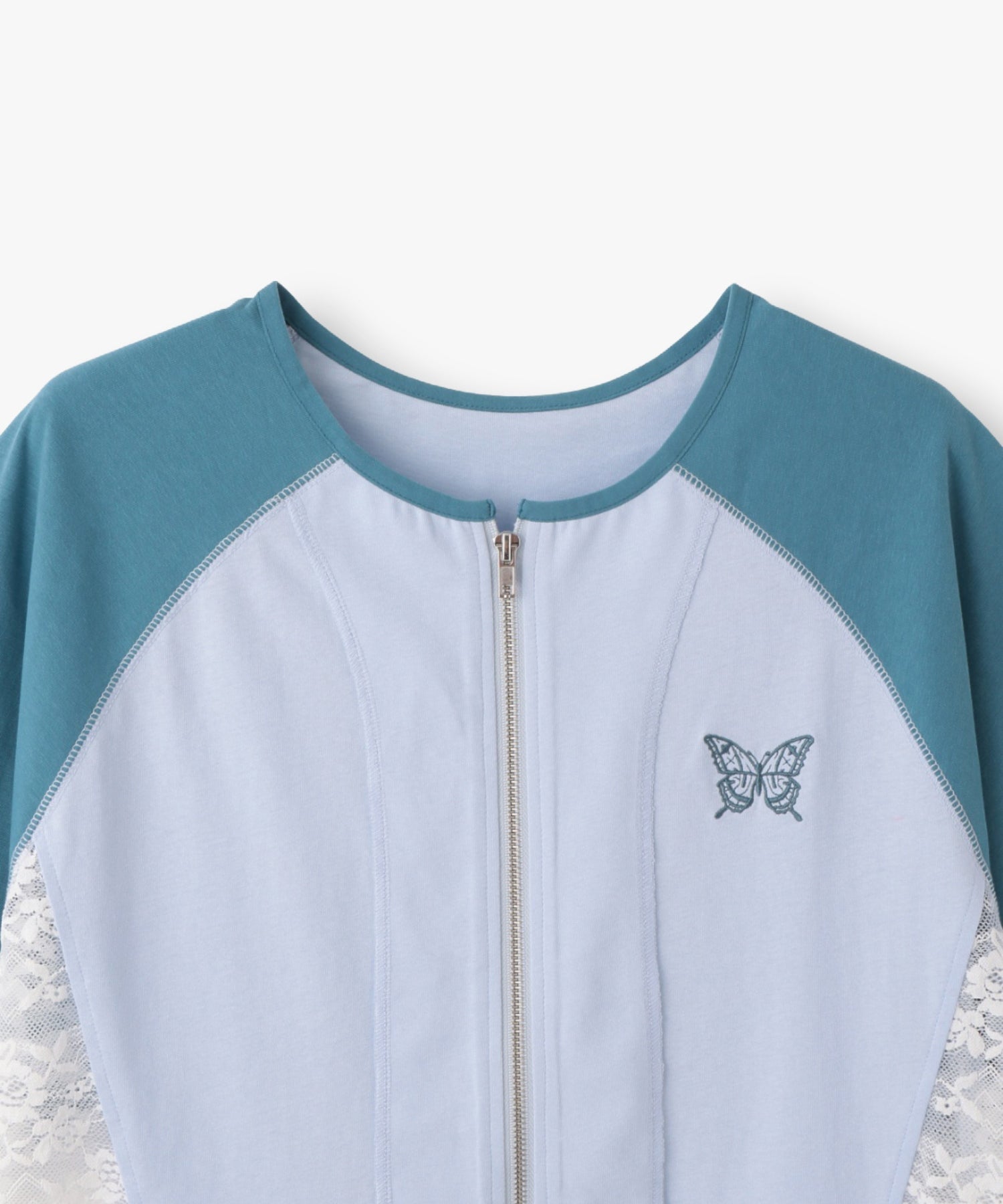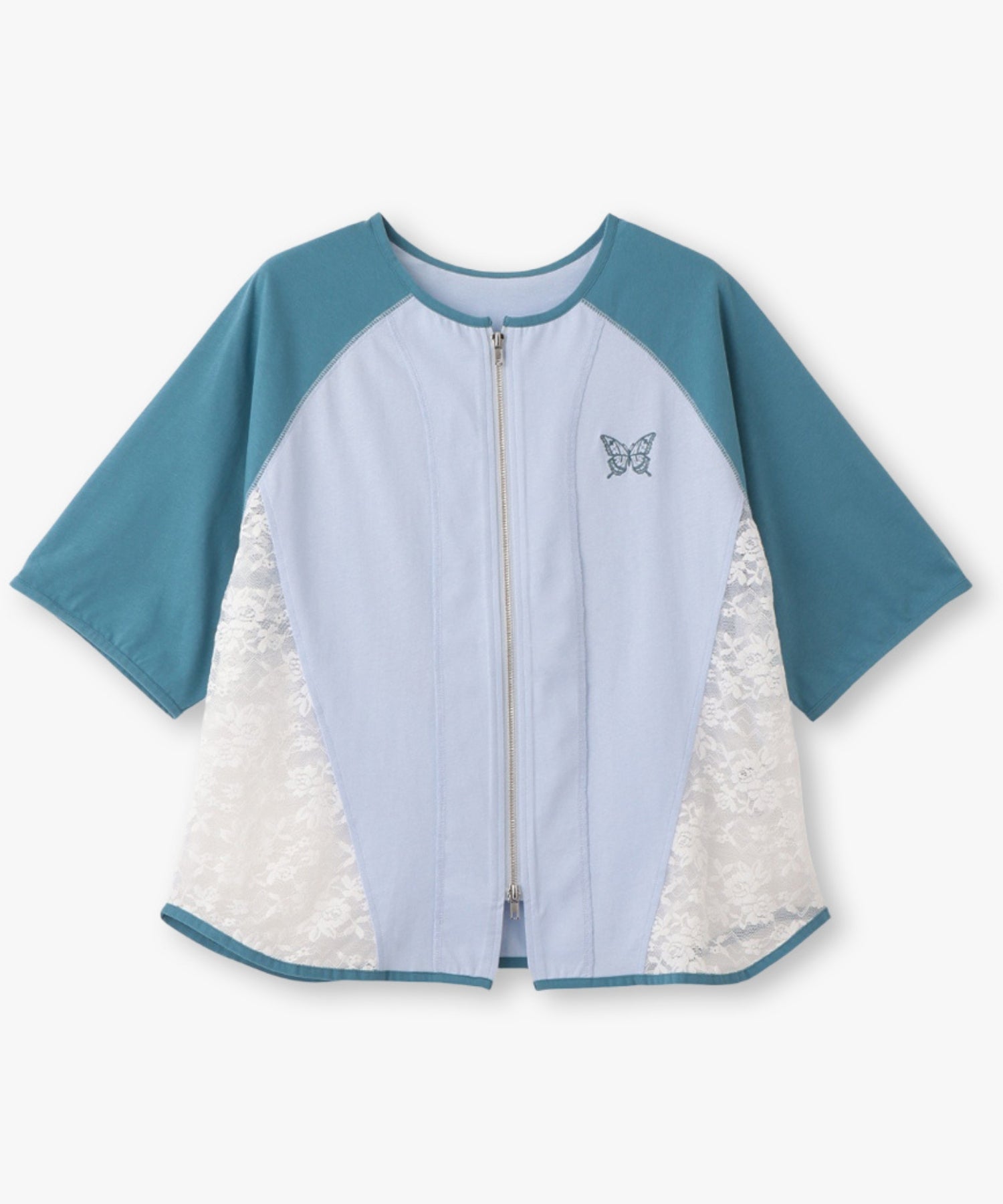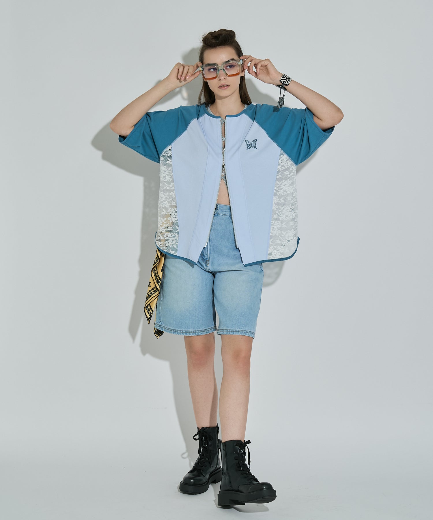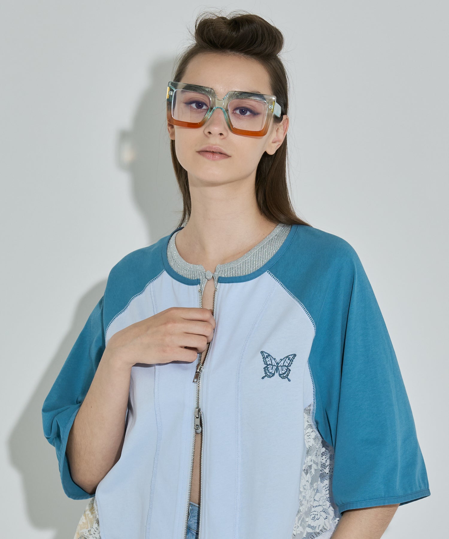 ダブルジップ&前後2WAY仕様で、着こなしの幅がぐっと広がるジップトップス。さらっと羽織ってスポーティに、1枚で着てモードに、前後を逆にしてバックプリントを主役に…と気分やスタイリングで自在にアレンジ可能。程よく肌が透けるレースの切り替えが、メンズライクなフォルムにほんのりフェミニンなニュアンスを添えてくれるので、パンツにもスカートにもバランスよくハマります。