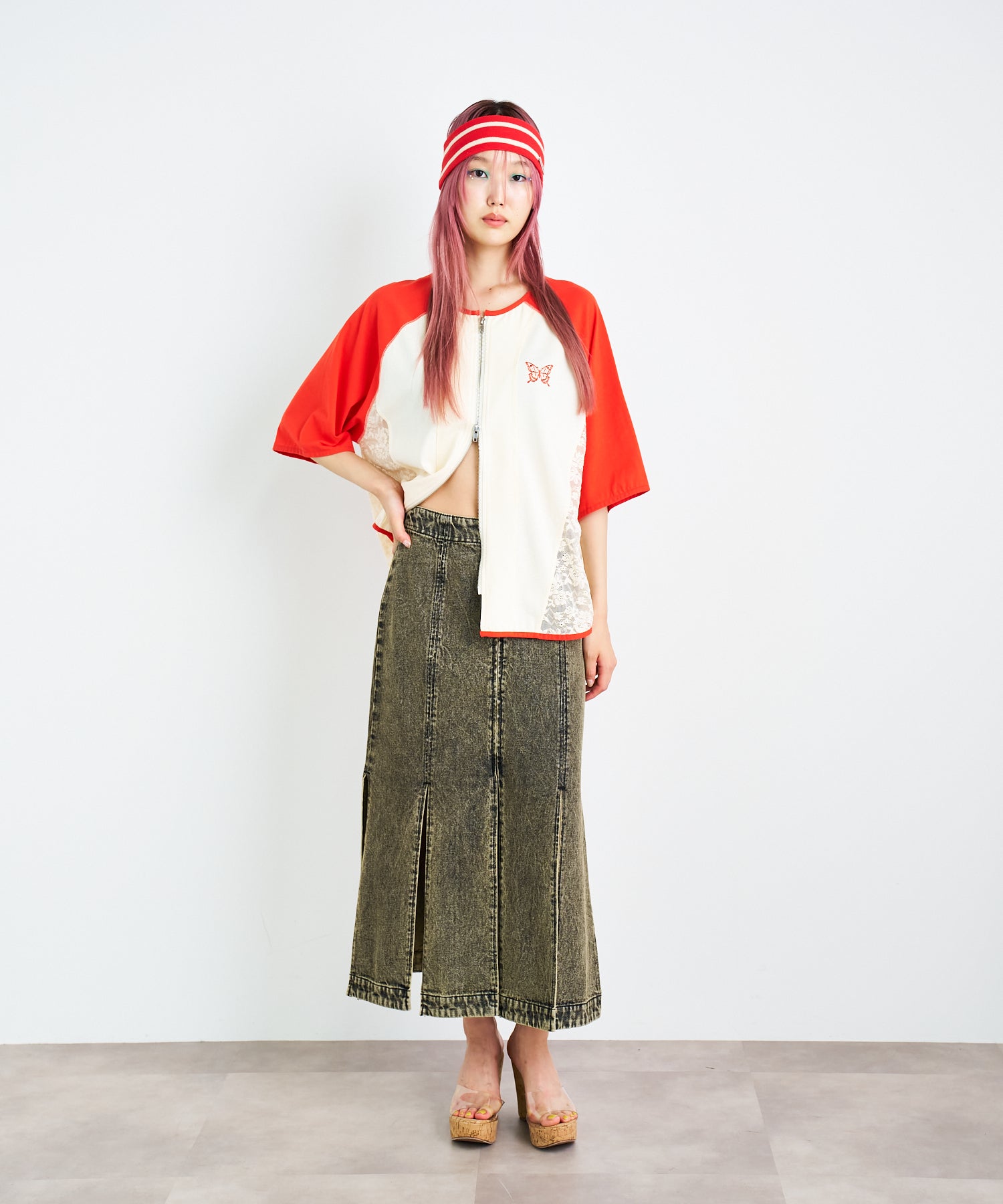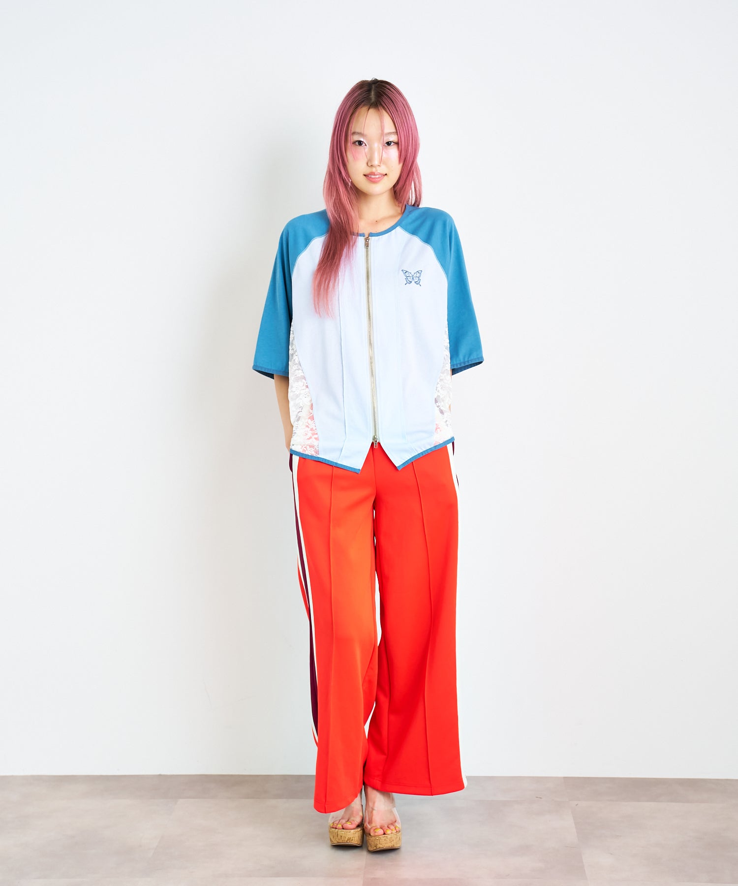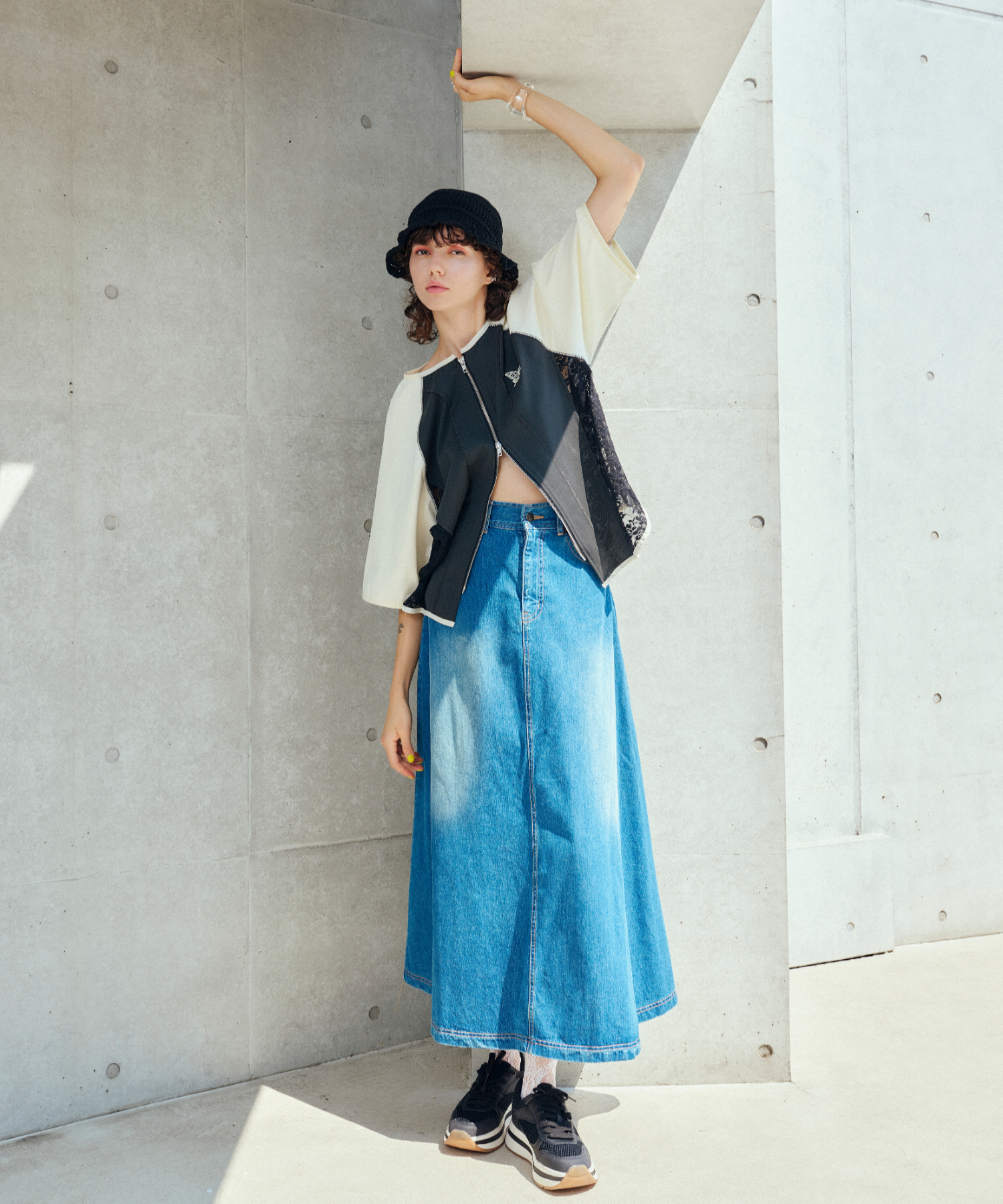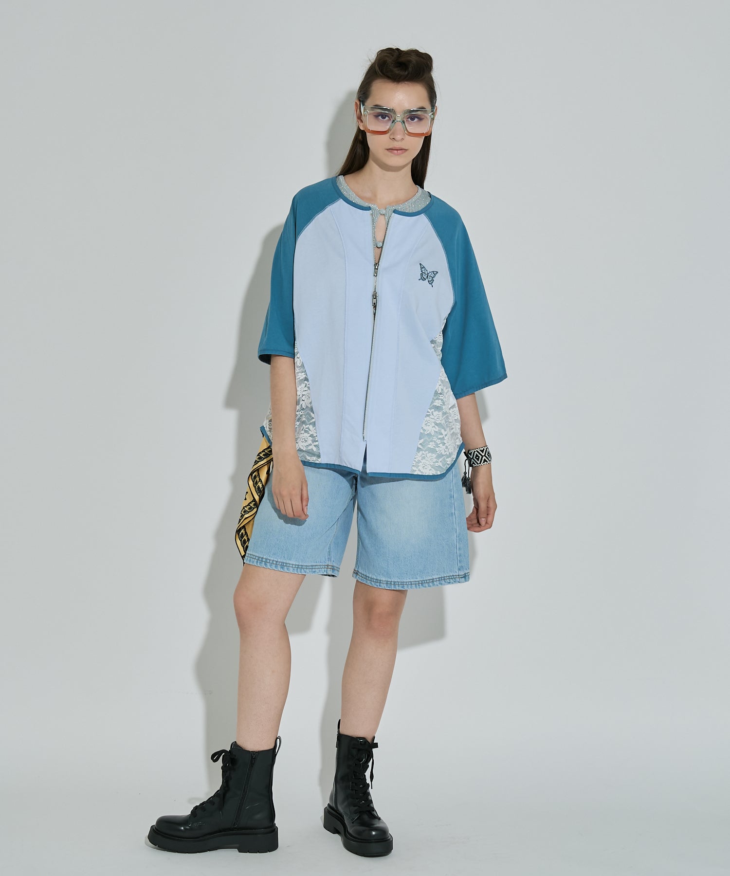 ダブルジップ&前後2WAY仕様で、着こなしの幅がぐっと広がるジップトップス。さらっと羽織ってスポーティに、1枚で着てモードに、前後を逆にしてバックプリントを主役に…と気分やスタイリングで自在にアレンジ可能。程よく肌が透けるレースの切り替えが、メンズライクなフォルムにほんのりフェミニンなニュアンスを添えてくれるので、パンツにもスカートにもバランスよくハマります。